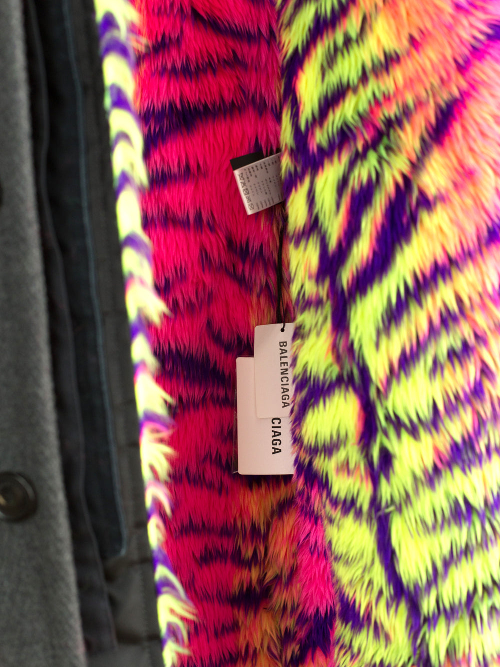 Here, the adaptability and resourcefulness of humanity comes to the fore, with stacked trompe l’oeil fronts referencing the look of regular people layering whatever garments are available to protect themselves from bitter cold. The look is sociological and multifaceted. Juxtaposed next to the manmade, graffiti-covered snowy “mountain,” it could be seen as a similar sort of collage, or a piece of armor…or a statement about extreme changes in climate. Contrasted against the sleek, technological, 3D modeled and moulded tailoring shown at the start of the show, the layered looks are seen as a comment on the waste that the fashion industry produces, or an alternative way to cut those architectural “Balenciaga” volumes. In the end, looking at the jacket, one really feels that reality can be stranger than fiction, and the biting irony that an assemblage of the most quotidian garments could become and redefine glamour and extravagance.