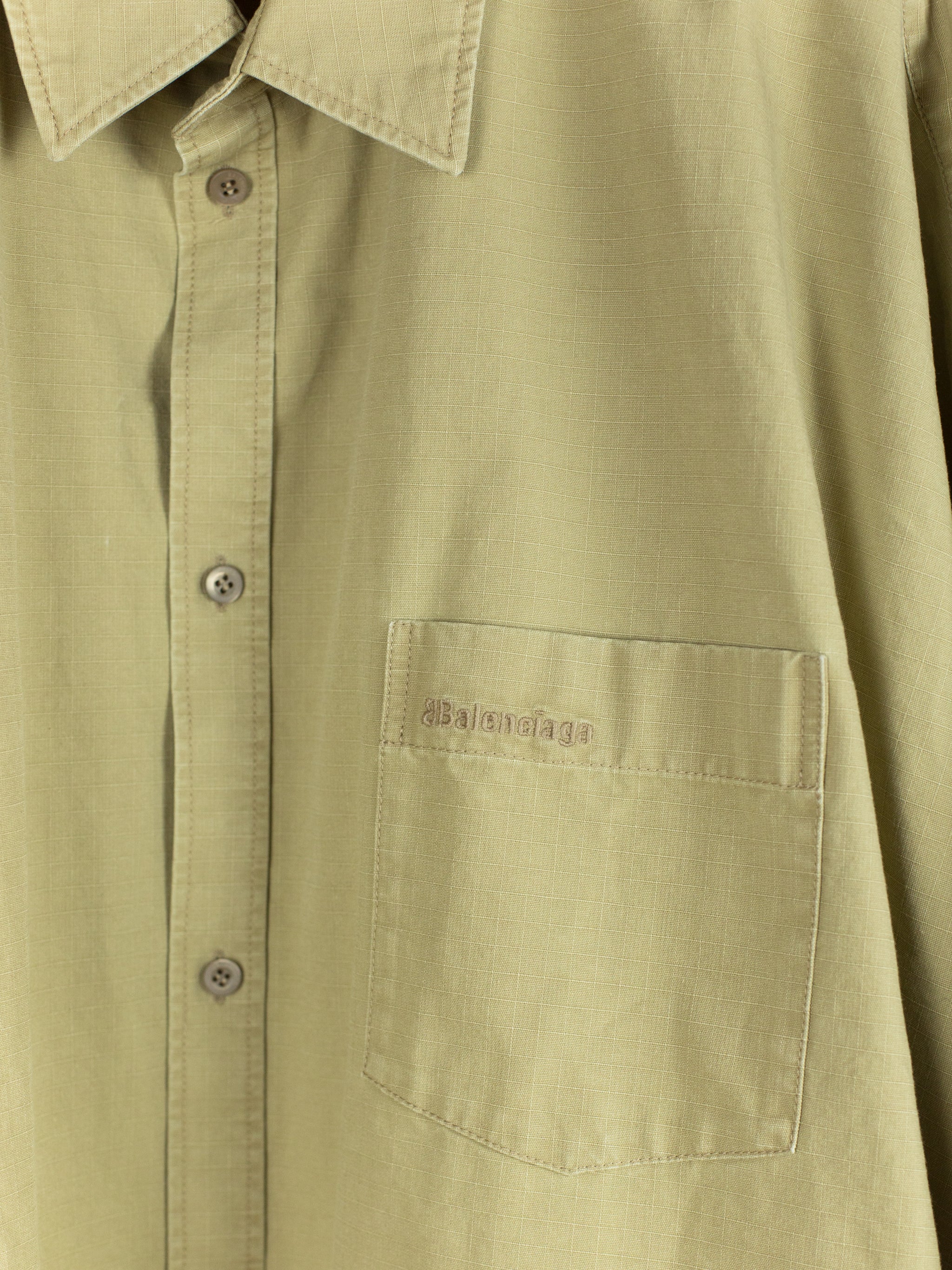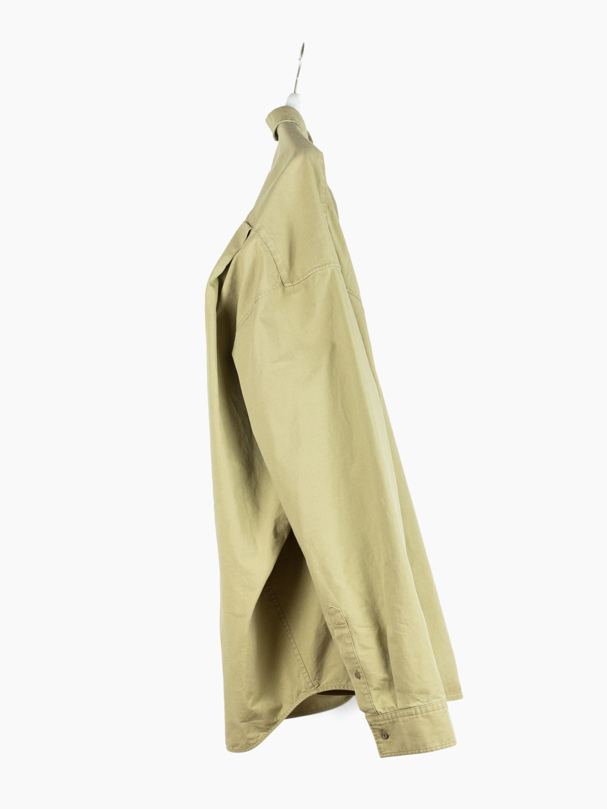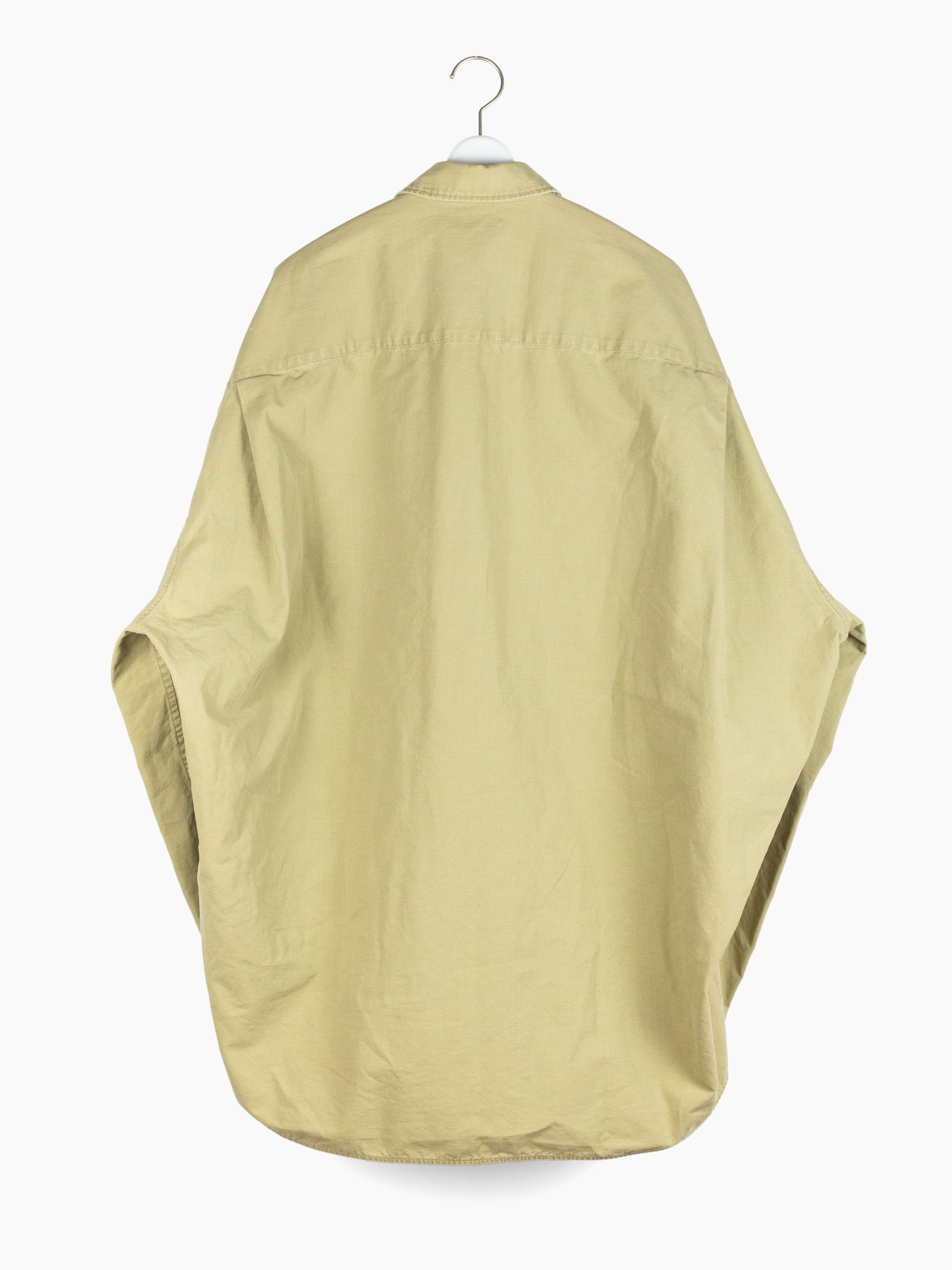 Signature Balenciaga 'Cocoon' back shirt, with two dramatic yoke darts and a V-shaped bodice panel construction that creates a 3D sculptural scooped back silhouette. Done in a utilitarian khaki ripstop cotton, this shirt blends couture shaping with quotidian workwear, perfectly demonstrative of Demna's anthropological approach to fashion.
