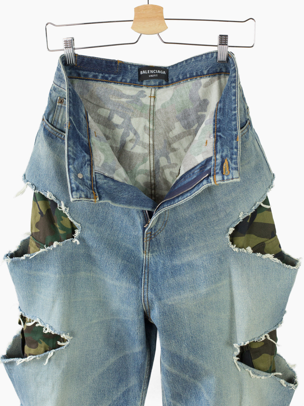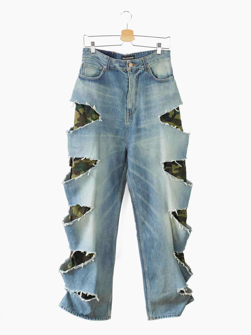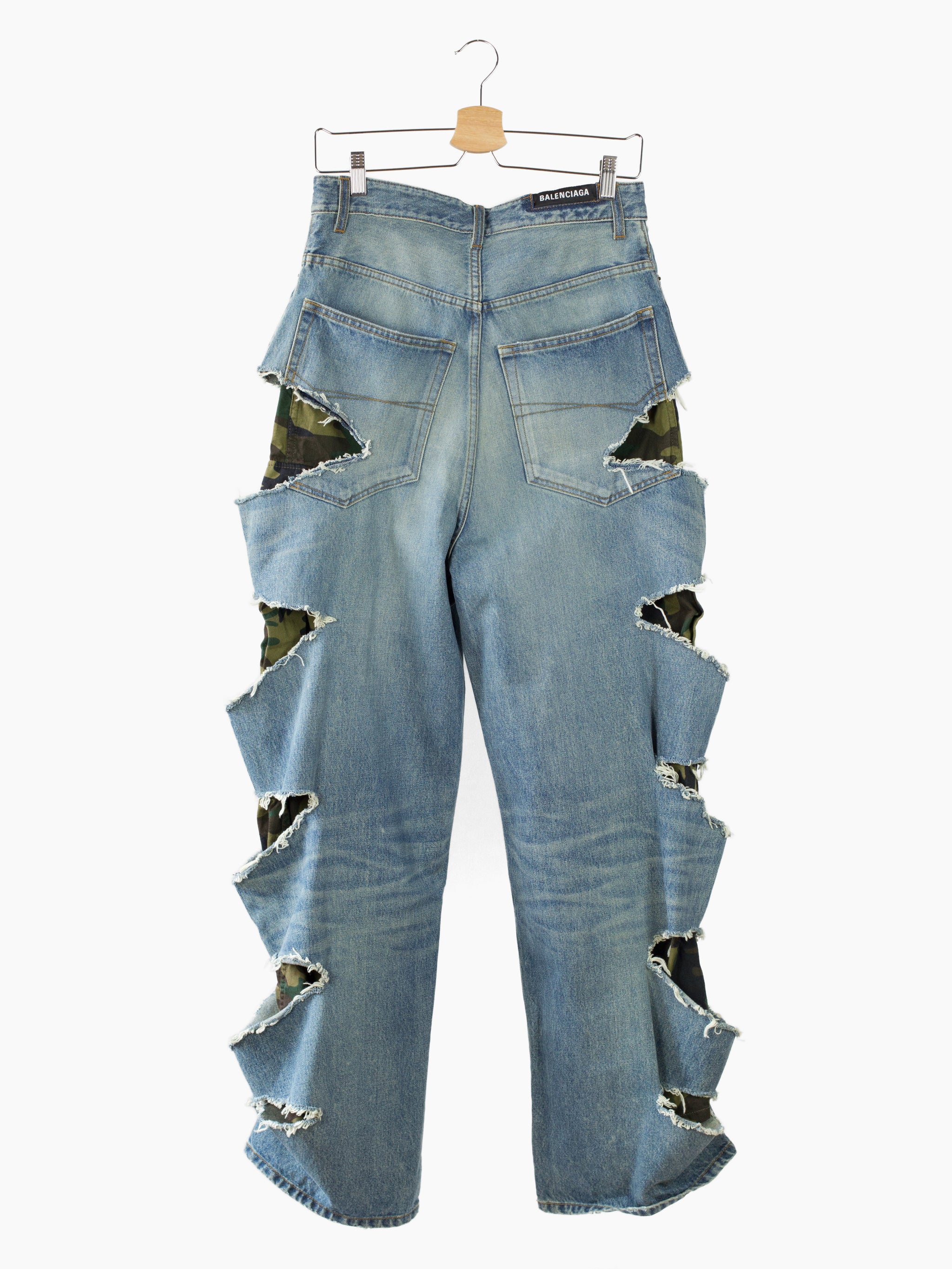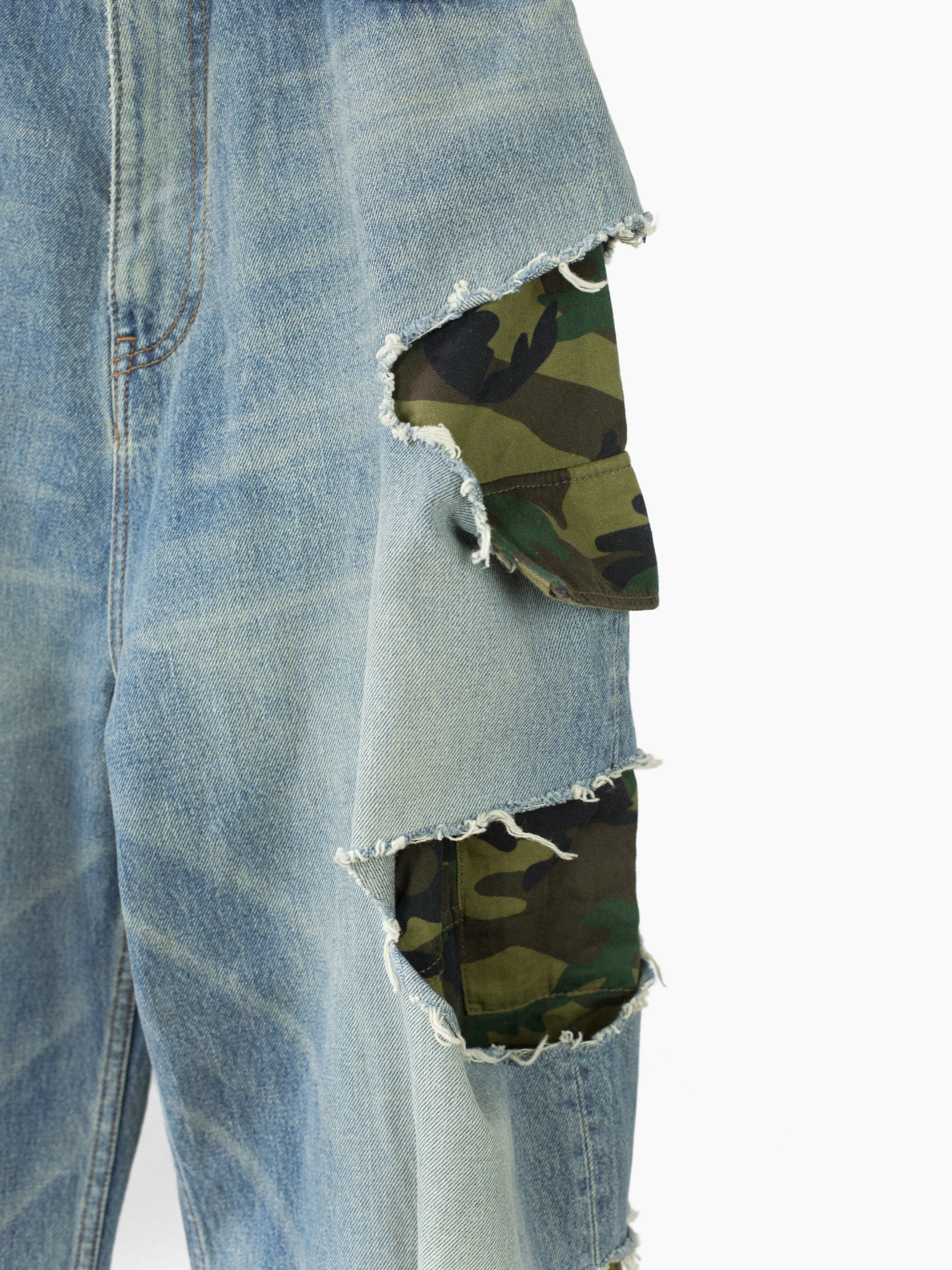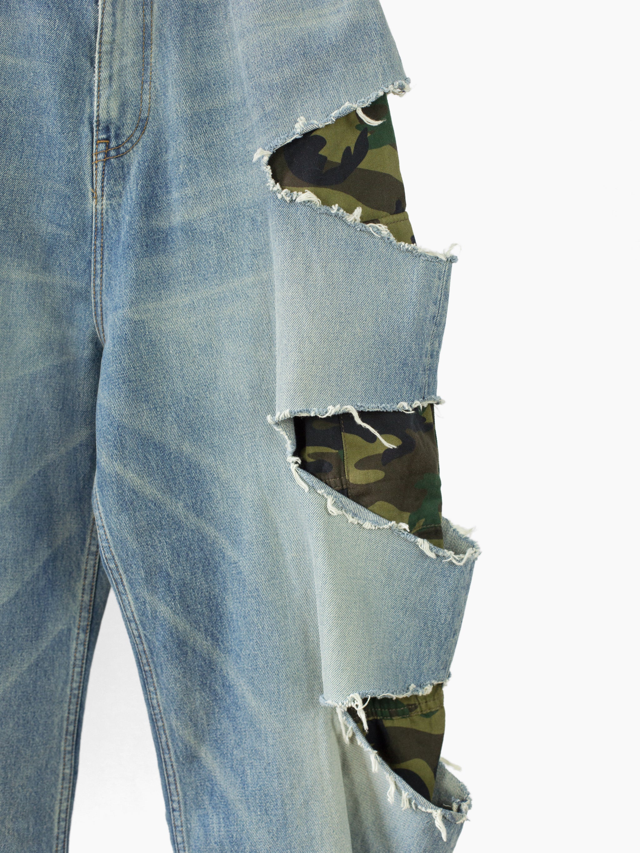 Signature Balenciaga destroyed baggy denim with full length, fully constructed camo cargo pant inner layer in soft cotton twill. Outer jean is cut from Japanese denim with an artfully executed muddy wash with rich beige/blue tones mimicking a lovingly worn in look. Graphic side slashes frame dark woodland-ish camouflage, creating contrast and depth.