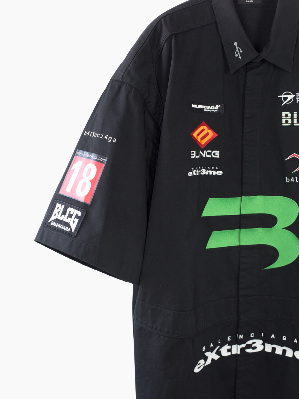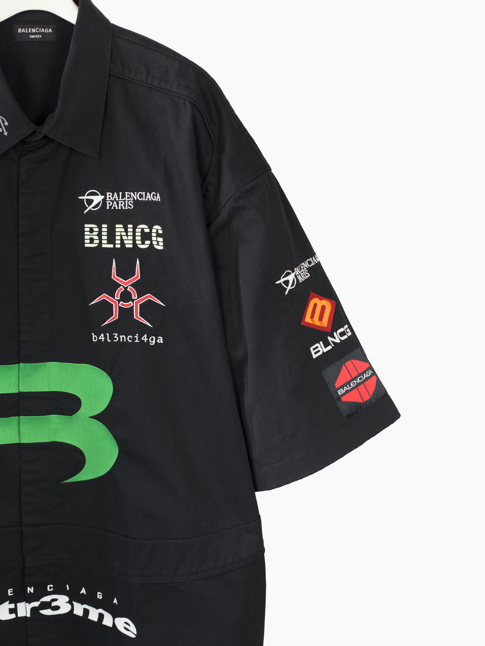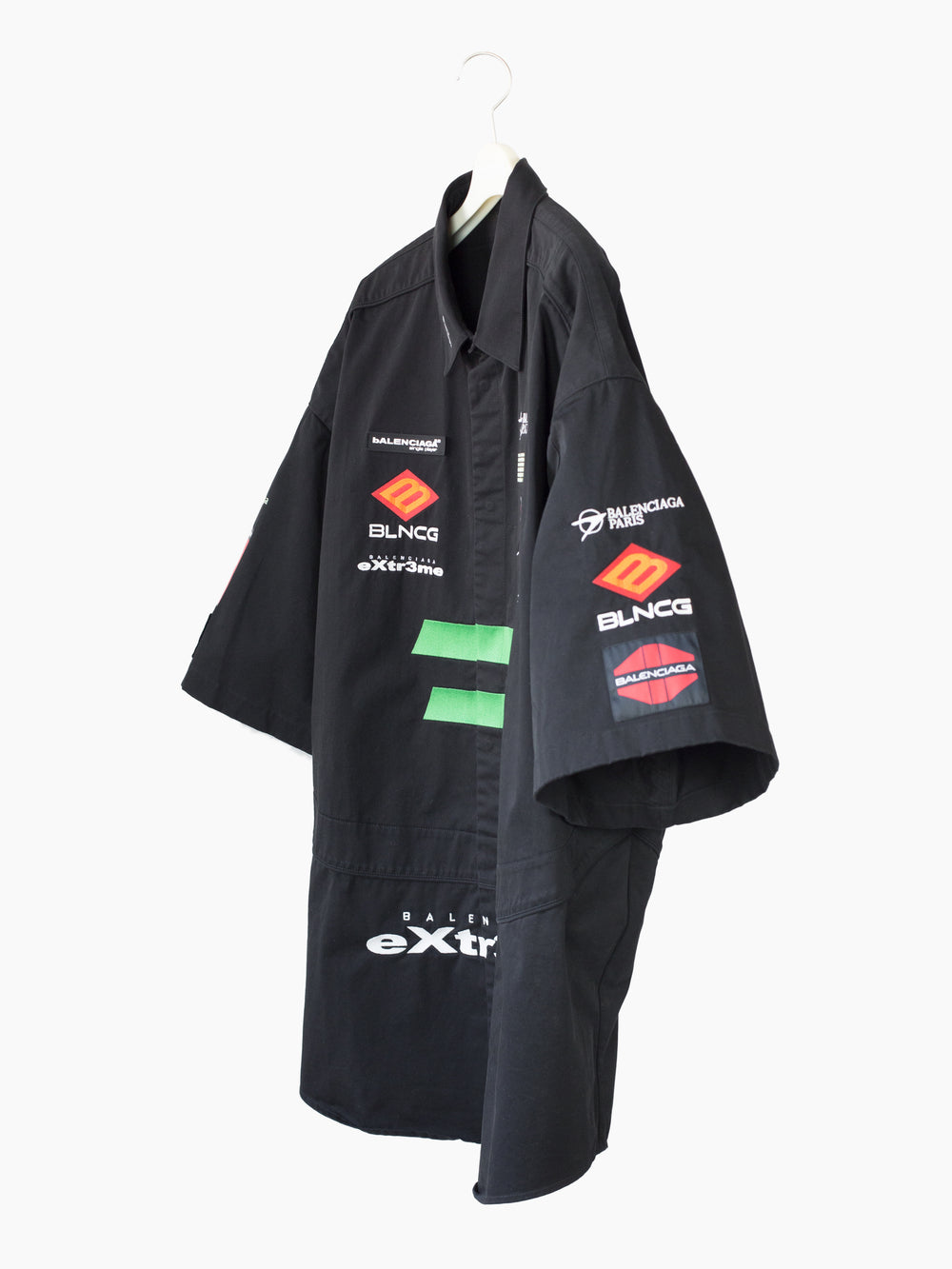 Black cotton twill short sleeve shirt jacket from Balenciaga AW21, which centered around clothing for an imagined digital universe. This 'Gamer' shirt is decorated with 'Balenciaga' recreations of professional gamer sponsor logos, in multiple fabrication styles. They're embroidered, vinyl printed, sewn, or even rendered in rubberized glow-in-the-dark appliques to create varying visual textures, depth, and complexity. The shirt itself features piped 'track' panelling around the shoulders, sleeves, and waist to give the shirt silhouette structure and a substantial 'jacket'-like appearance.
