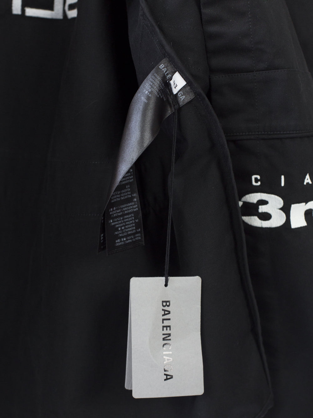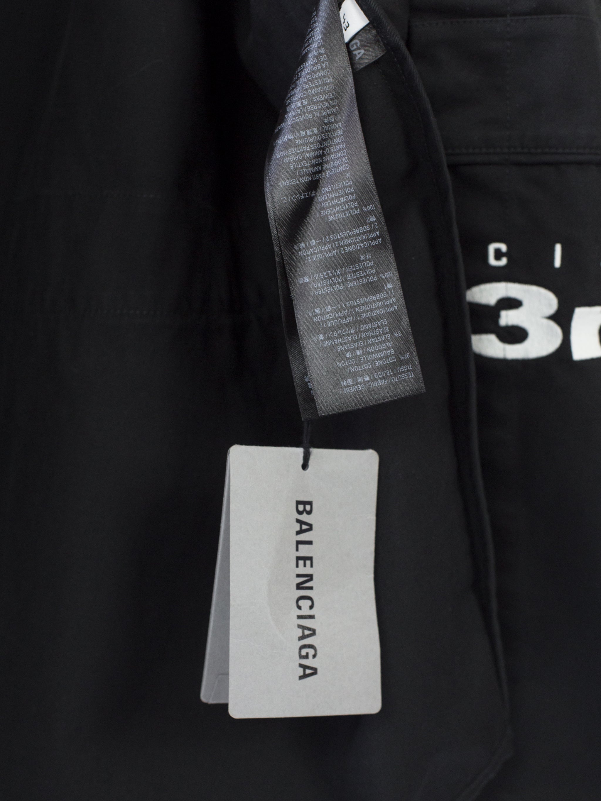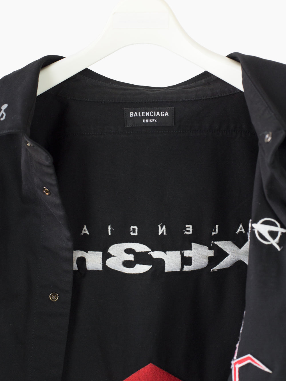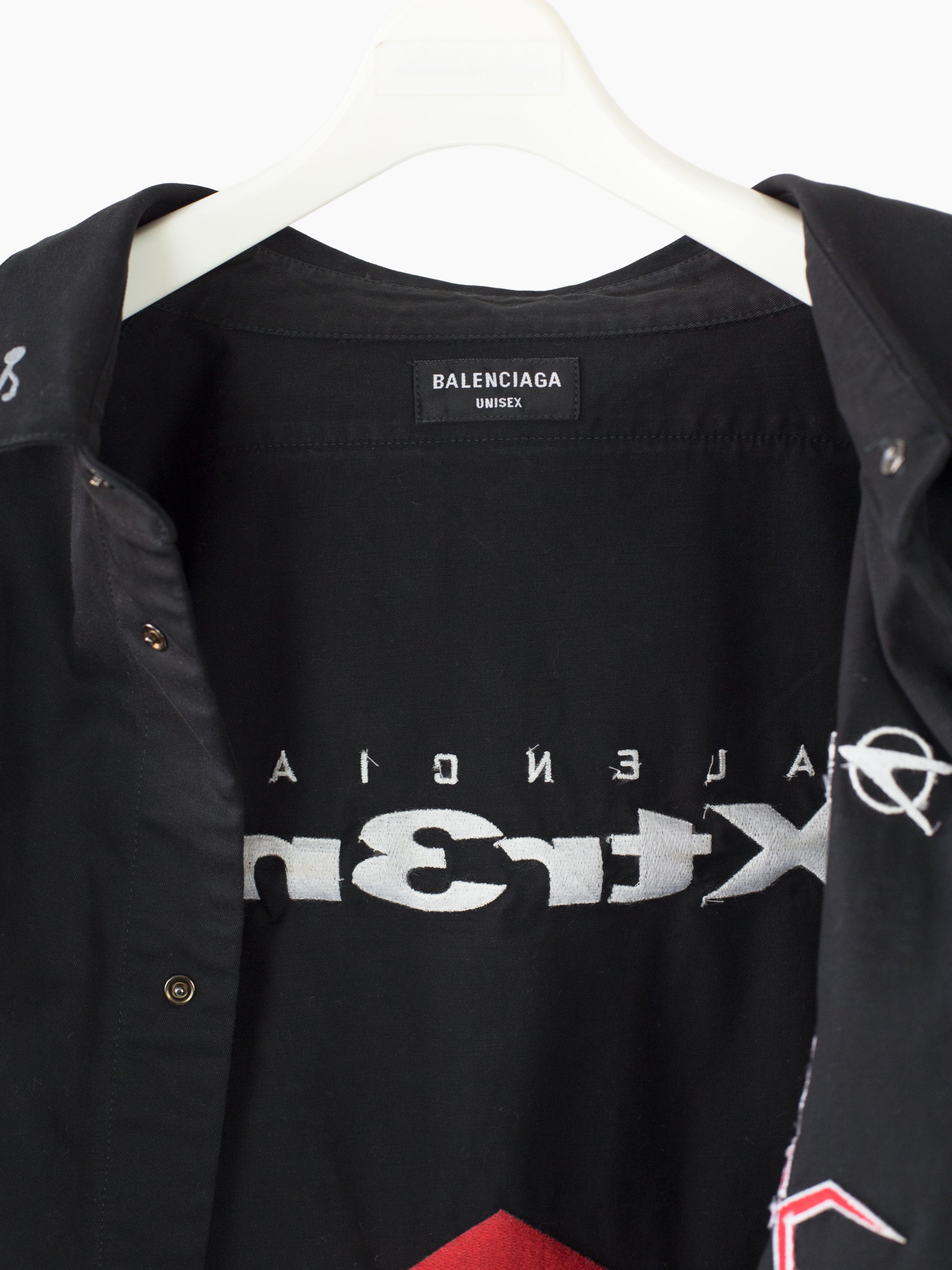 Black cotton twill short sleeve shirt jacket from Balenciaga AW21, which centered around clothing for an imagined digital universe. This 'Gamer' shirt is decorated with 'Balenciaga' recreations of professional gamer sponsor logos, in multiple fabrication styles. They're embroidered, vinyl printed, sewn, or even rendered in rubberized glow-in-the-dark appliques to create varying visual textures, depth, and complexity. The shirt itself features piped 'track' panelling around the shoulders, sleeves, and waist to give the shirt silhouette structure and a substantial 'jacket'-like appearance.