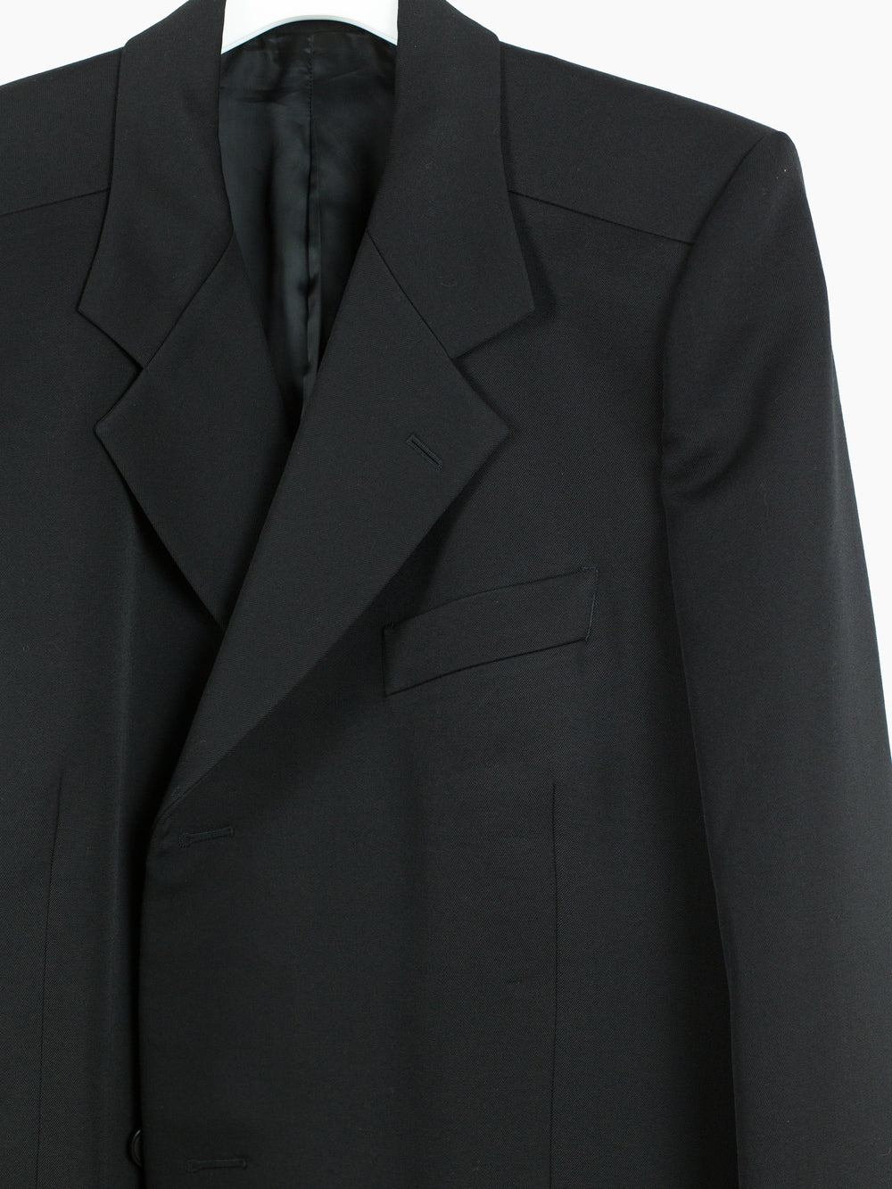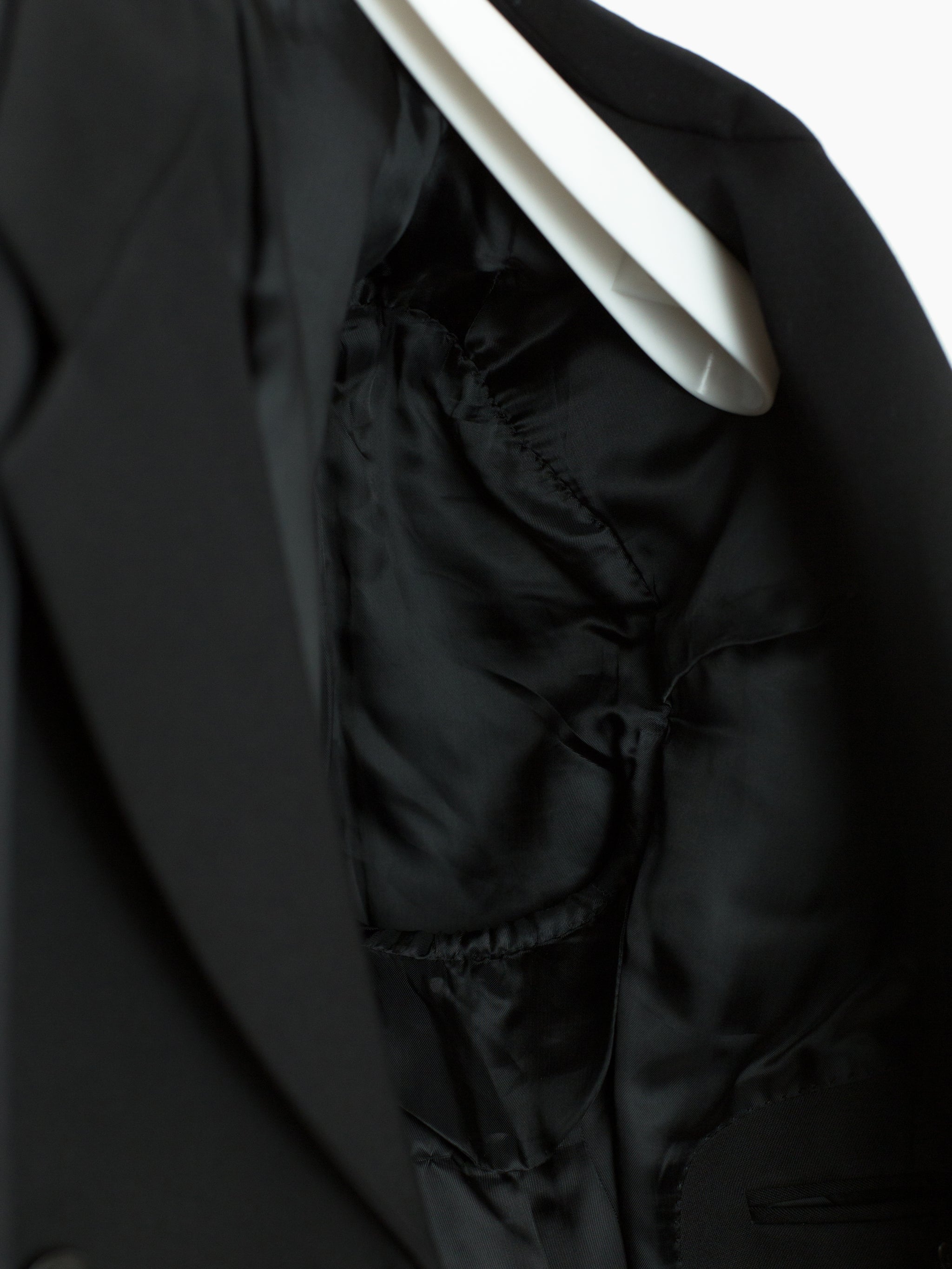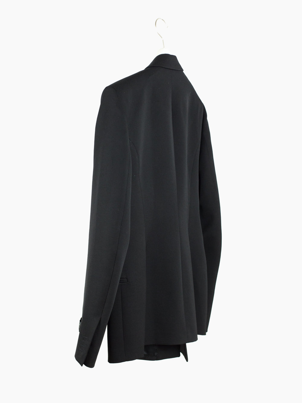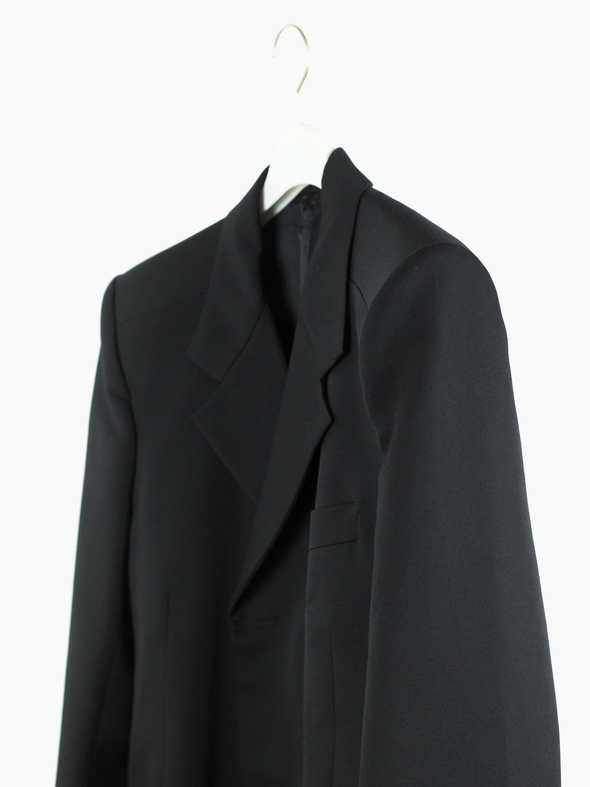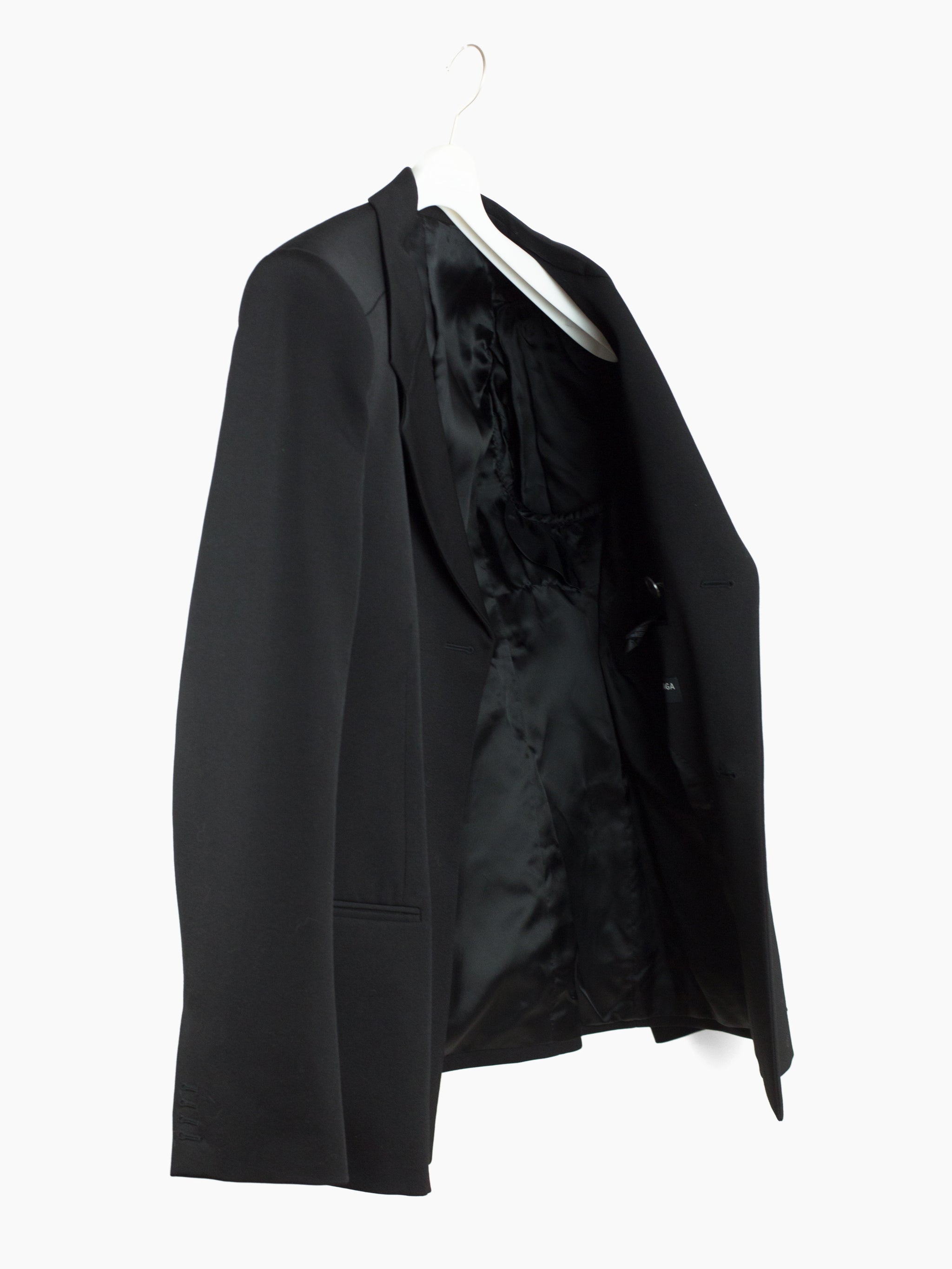 Here, in the shrunken double breasted suit jacket, the armholes are forcibly shifted forward, with most of the padding sitting along the front, sculpting a pulled in, almost hunched shape. A slight pagoda curve upwards at the shoulders frames the slim sleeves that inevitably show the wearer’s shoulder cap. The body is aggressively anatomically shaped, with a nipped waist and multiple darts creating an hourglass shape around the hips, a shape expounded upon at length in future seasons (AW17 Horse Riding Jacket, AW18 3D Moulded Hourglass Jackets).