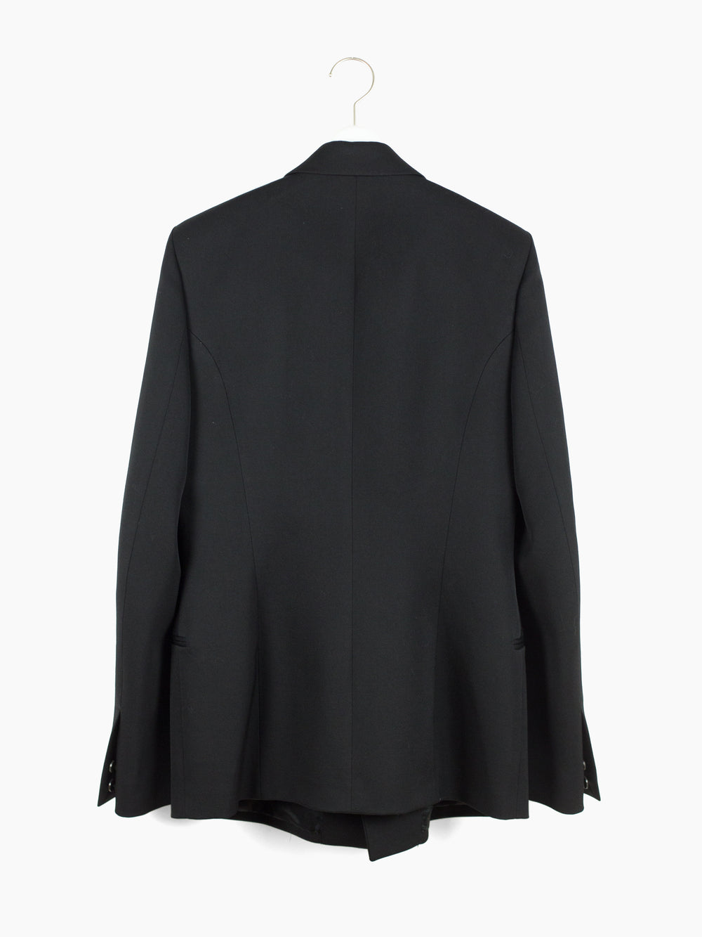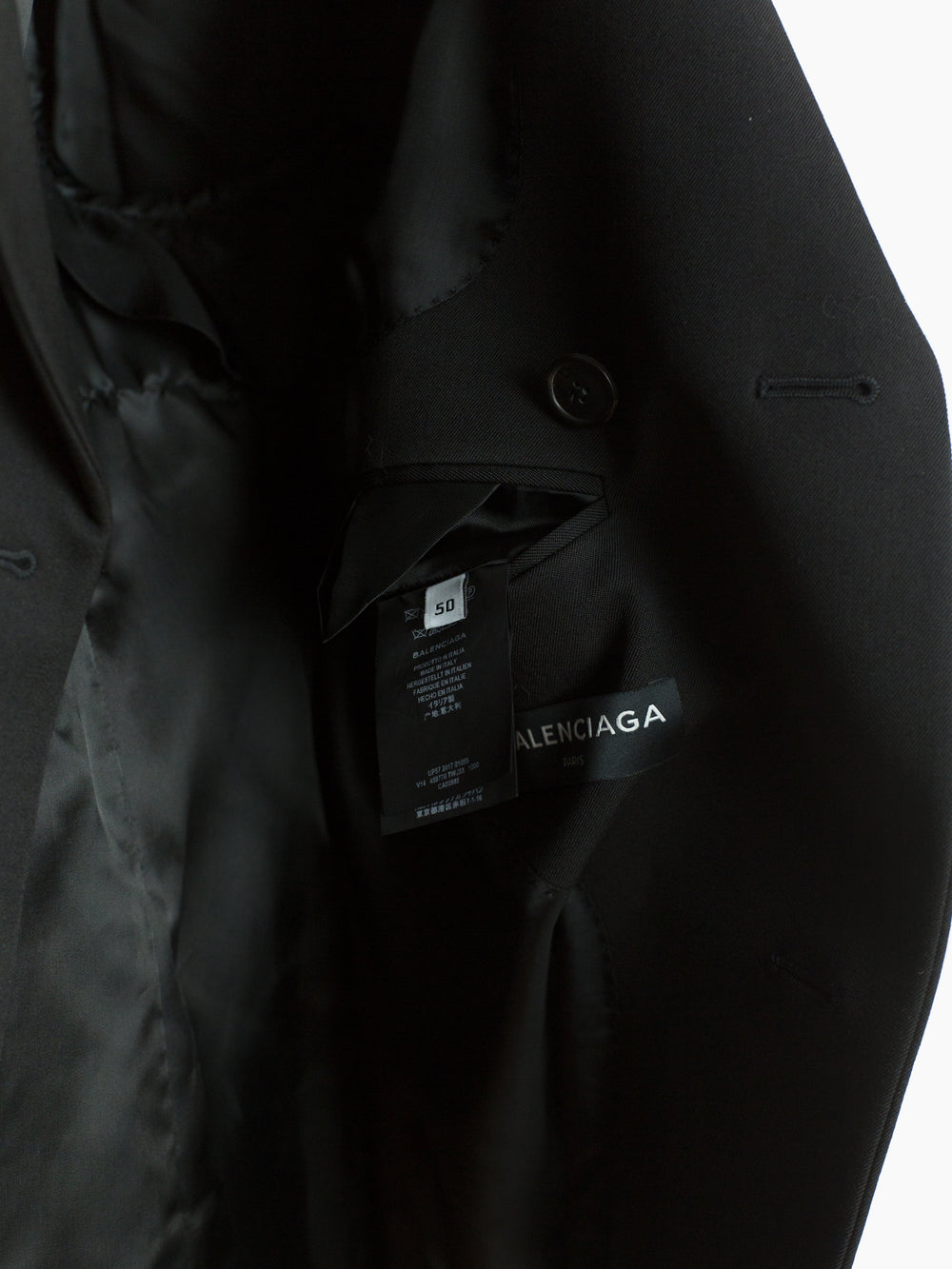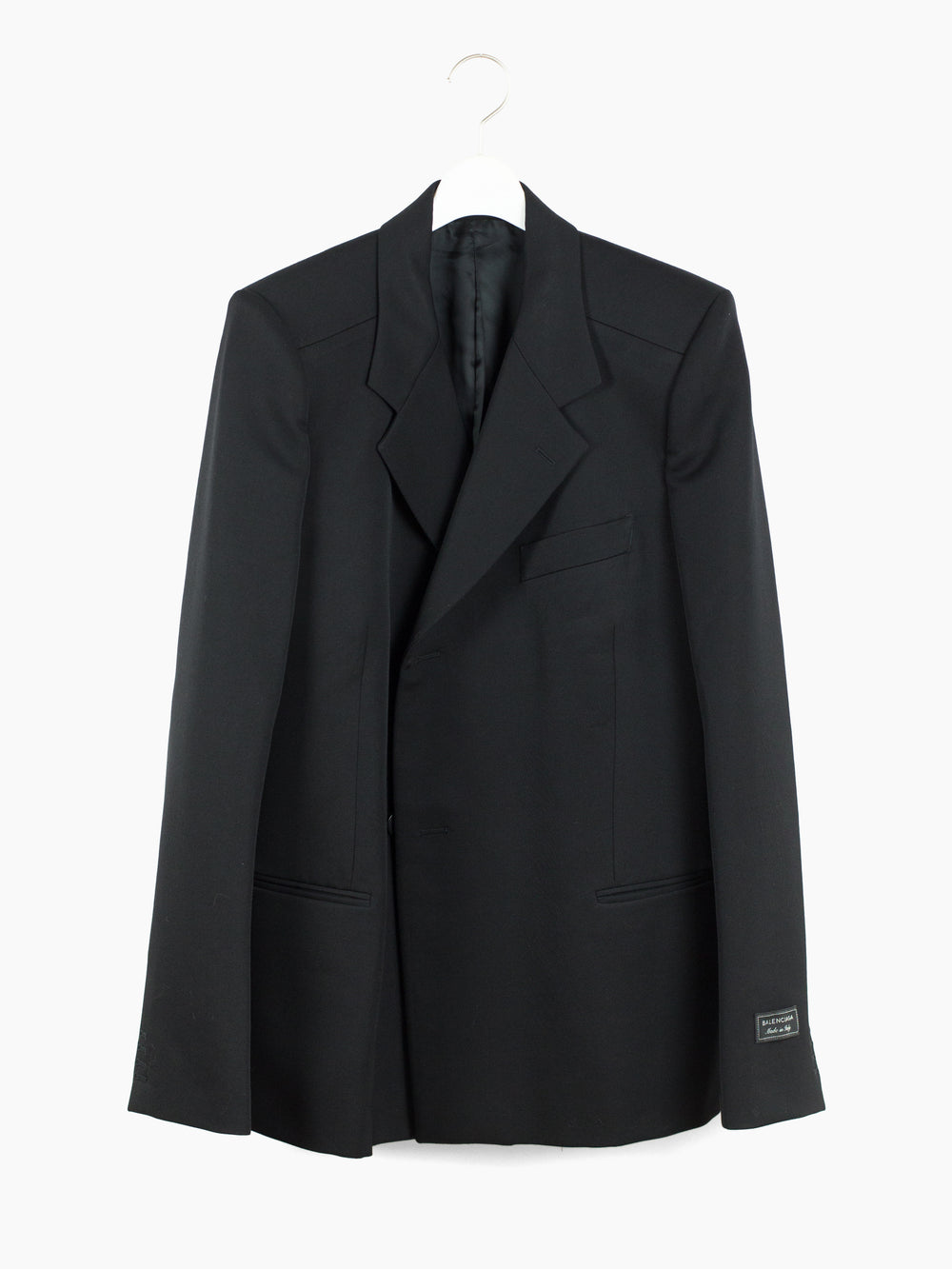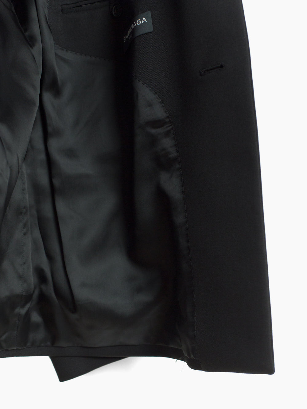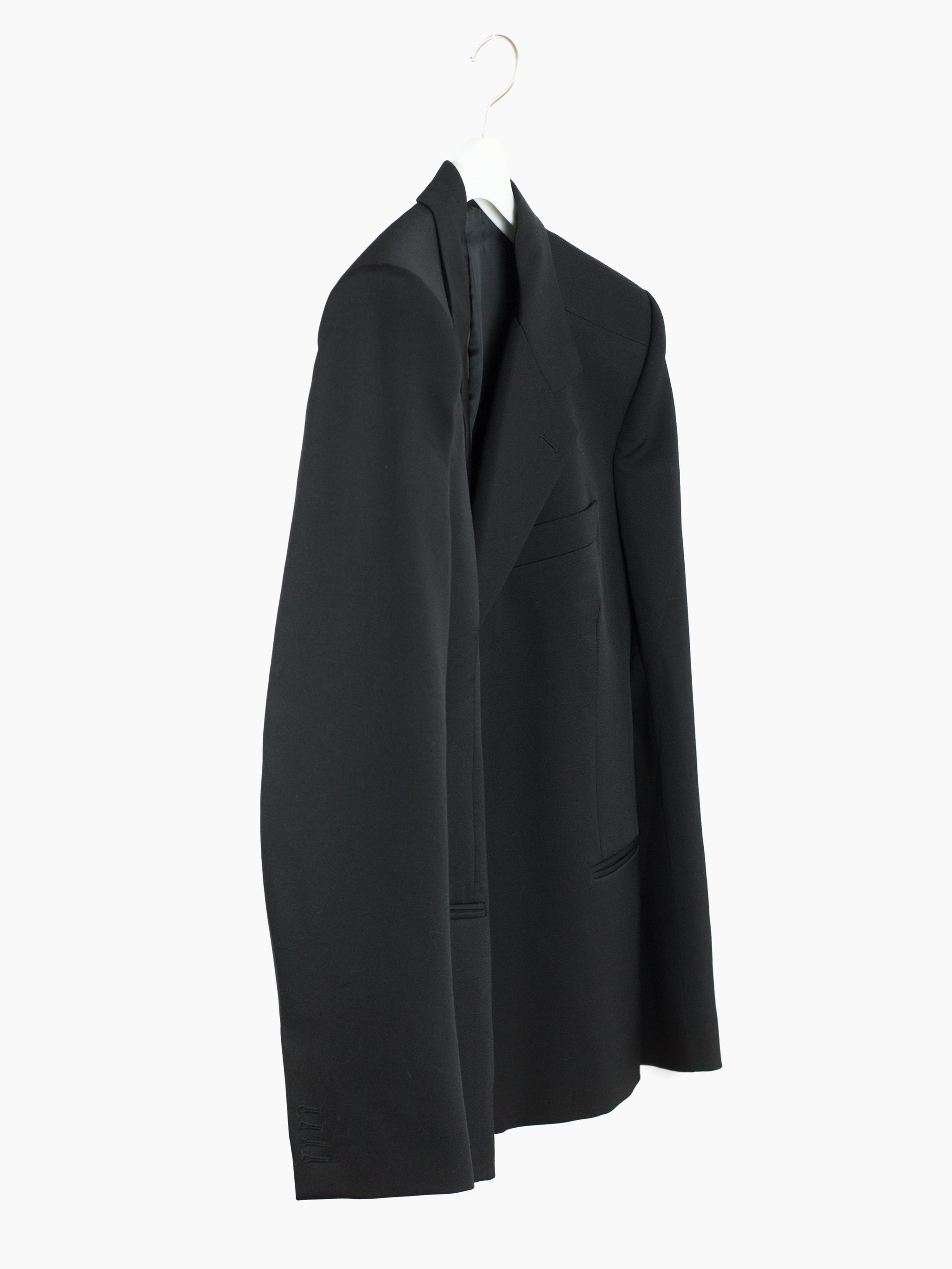 Here, in the shrunken double breasted suit jacket, the armholes are forcibly shifted forward, with most of the padding sitting along the front, sculpting a pulled in, almost hunched shape. A slight pagoda curve upwards at the shoulders frames the slim sleeves that inevitably show the wearer’s shoulder cap. The body is aggressively anatomically shaped, with a nipped waist and multiple darts creating an hourglass shape around the hips, a shape expounded upon at length in future seasons (AW17 Horse Riding Jacket, AW18 3D Moulded Hourglass Jackets).