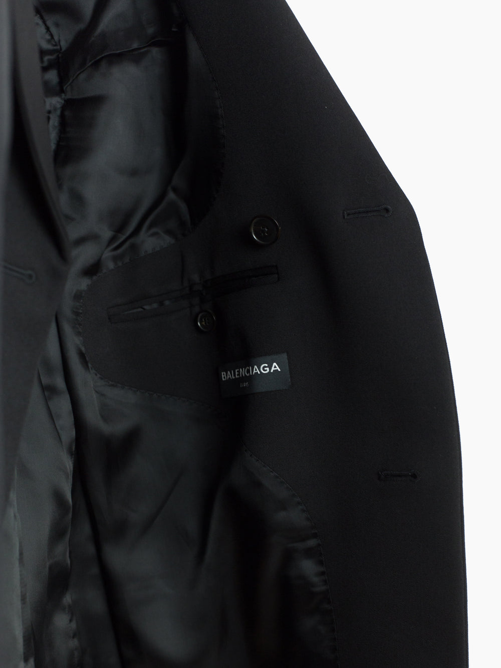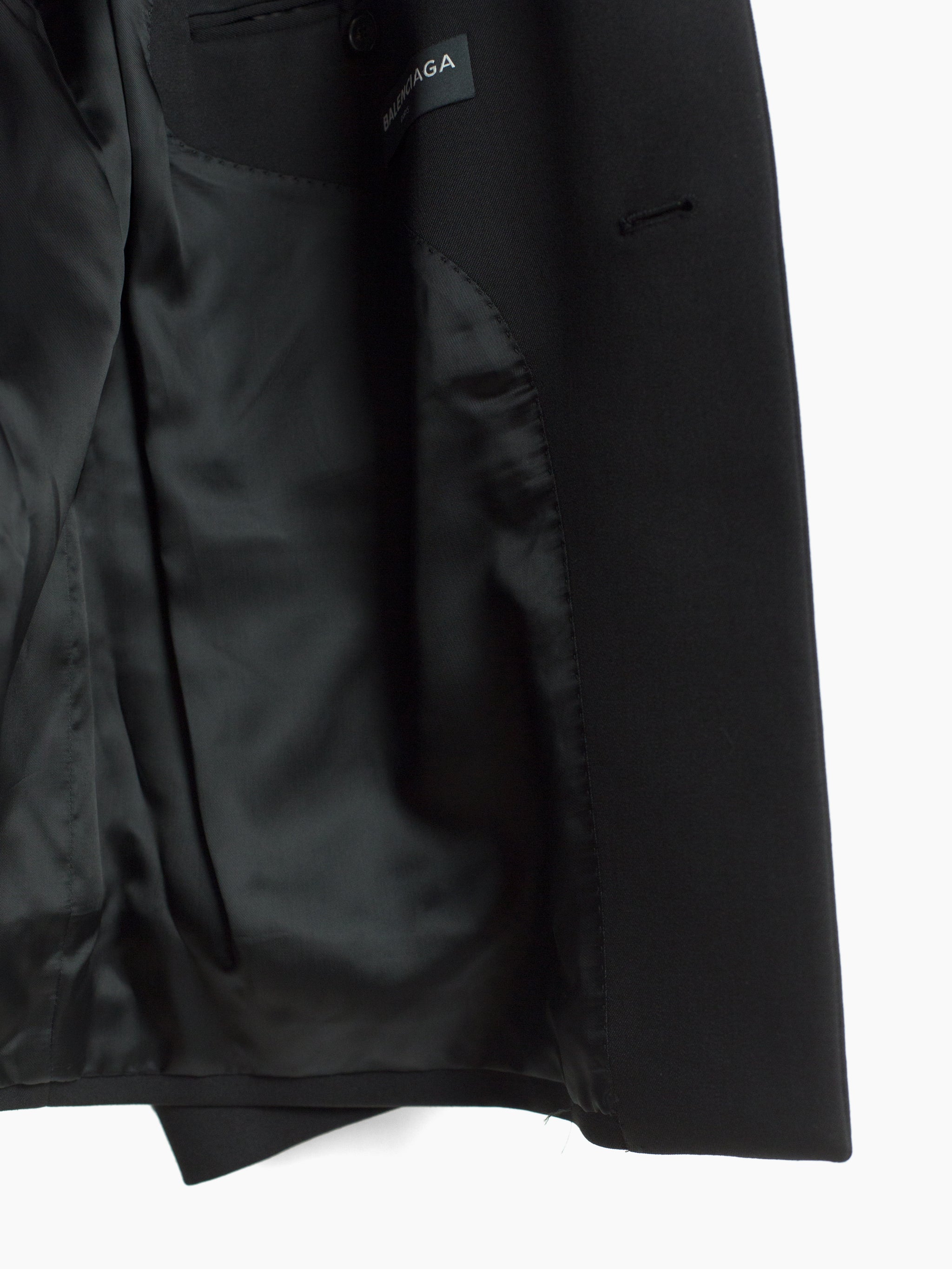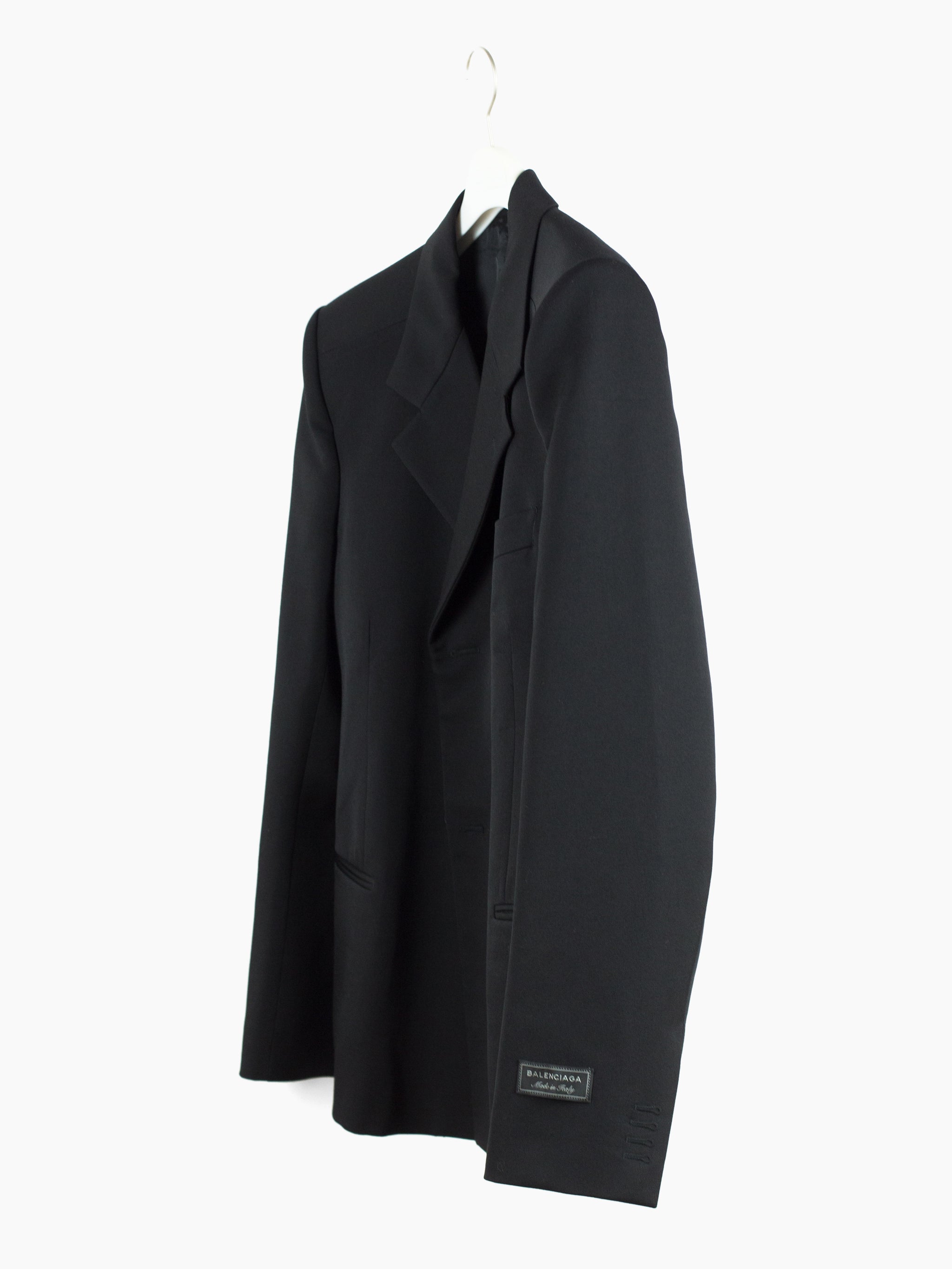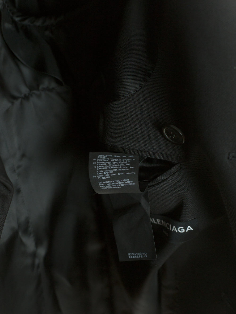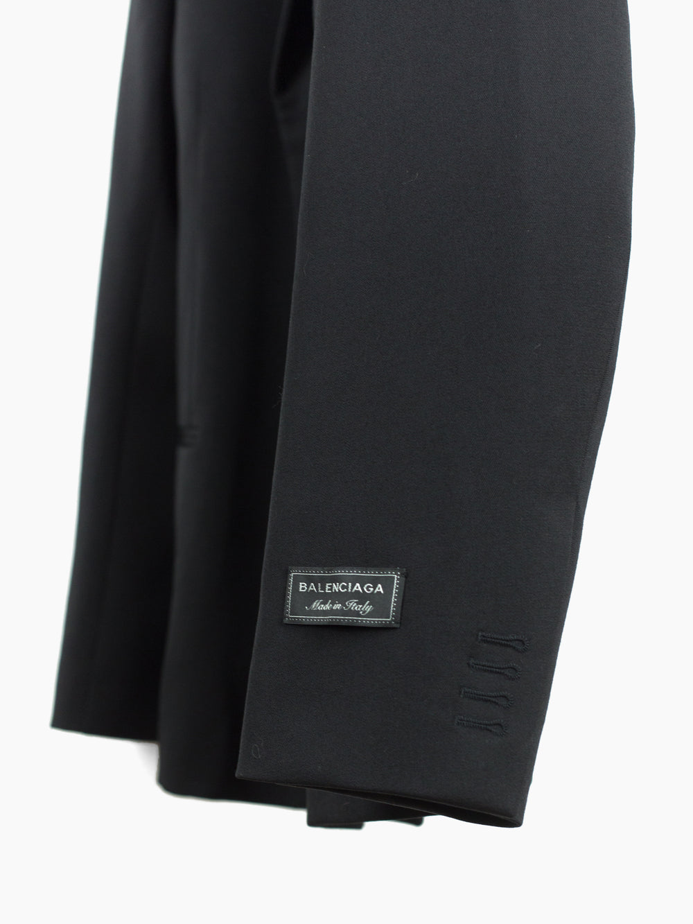 This blazer is from Pre-fall 2017 but is a new material iteration of the iconic “Shrunken” tailoring from Demna’s debut menswear season (SS17) at Balenciaga. Theseason centered around proportion, the wildly oversize and the wildly tiny. Press attributes this to an interrogation of “fit,” and establishing new standards and boundaries for what it could be—a Demna “irony” could definitely be read as what would be considered ill-fitting suiting by traditional standards bore the measurement cards of bespoke tailoring. Beyond this, we see these suits also as exploring fashion and clothing’s role in letting a wearer inhabit other personas, to don something that really brings you into another reality using the construction and resulting visual/sensorial quality of the clothing. How does it feel to be hugged and pulled inwards by a too-skinny suit jacket, how does it feel to take up the space you do with a dramatically square shoulder (see also: steroid tailoring from FW20 lending you the broad-shouldered, thick-armed physique of a bodybuilder).