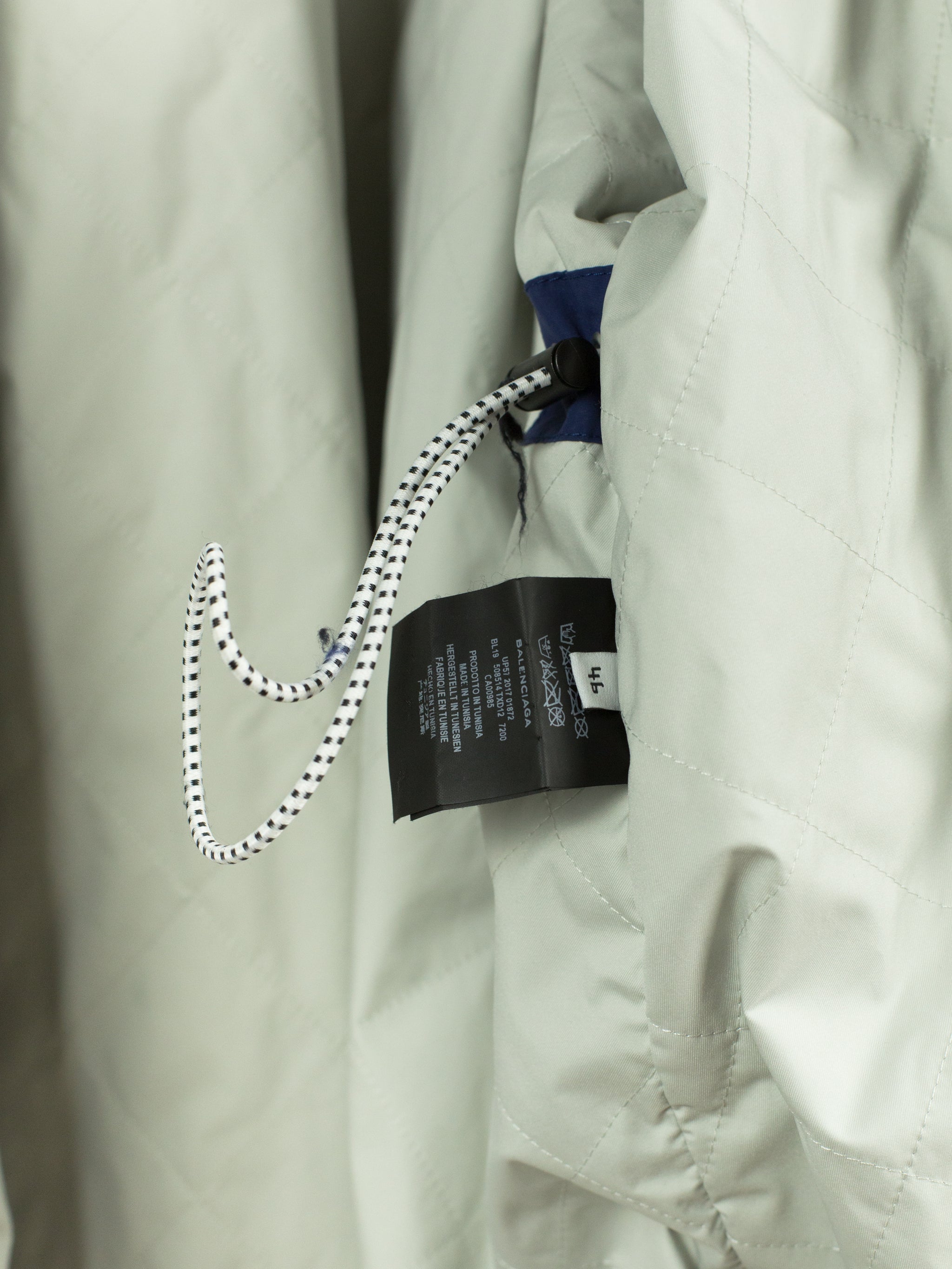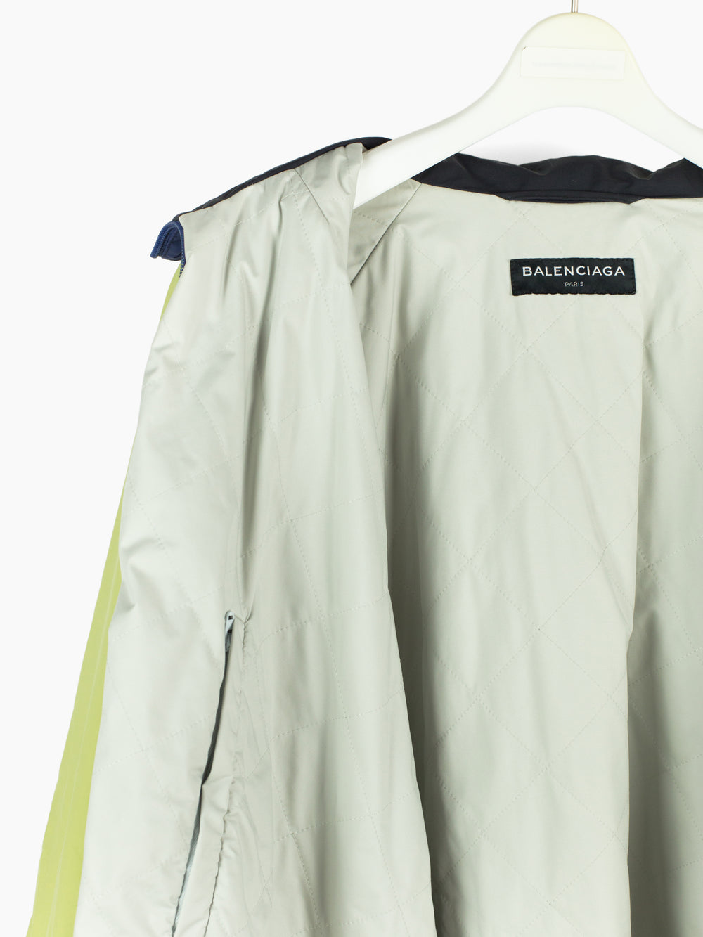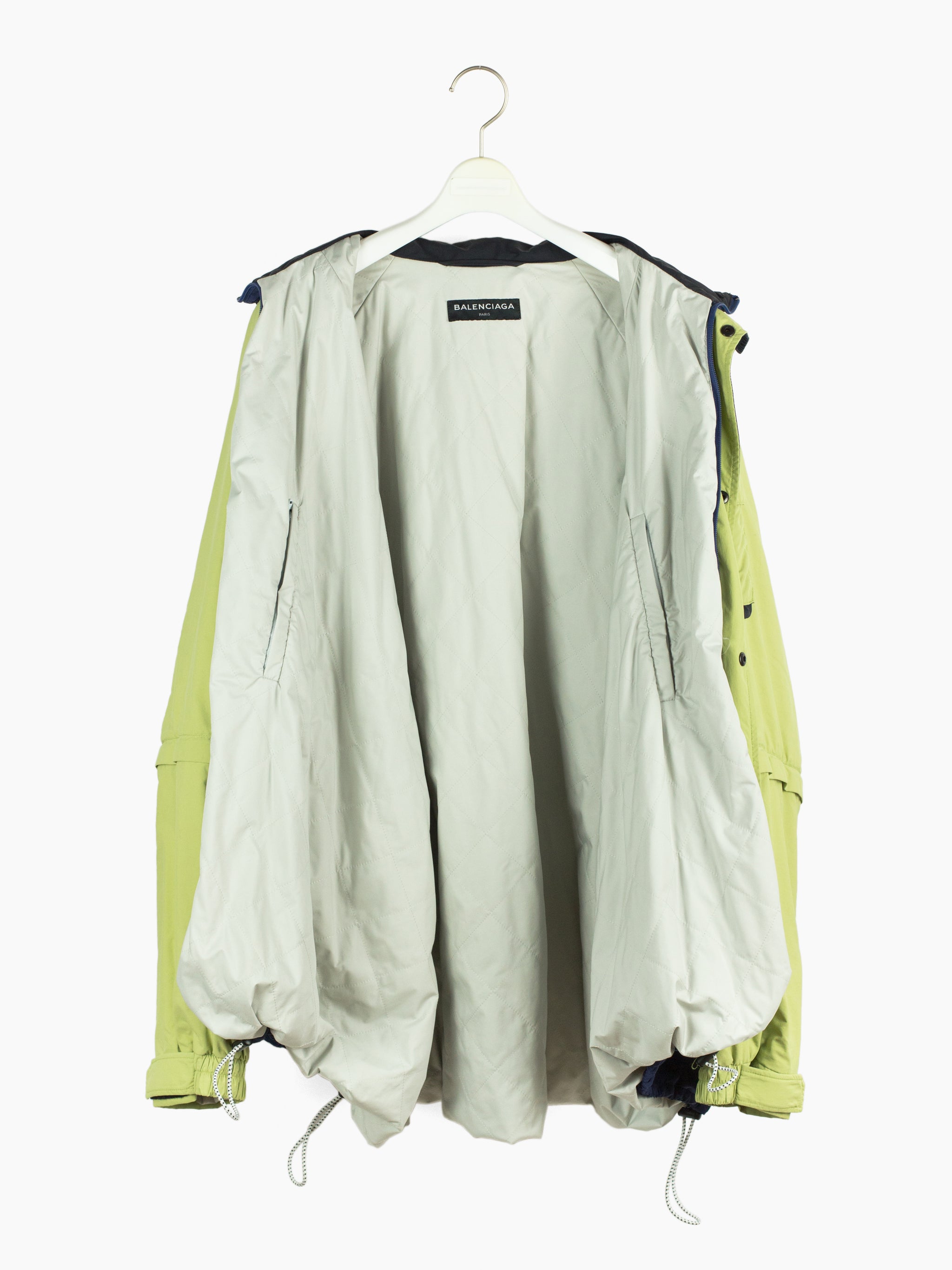 Ski jacket from Spring 2018, a collection centered around fatherhood/a "Dad's" wardrobe. This jacket is a Demna reinvention of an archetypical padded ski jacket that has gone through the paces of fatherhood. An oversized, bagged out quilted grey lining that peeks out at the hem and center front mimics the look of an improperly washed and shrunken garment. Dress weights at the front patch pockets weigh the front down and create a draped/'sagged' worn in shape throughout. Sleeves zip off. Finished with shockcord cinches at reflective 3M waistline and hem, packable reflective branded Balenciaga hood, and multiple pockets throughout.
