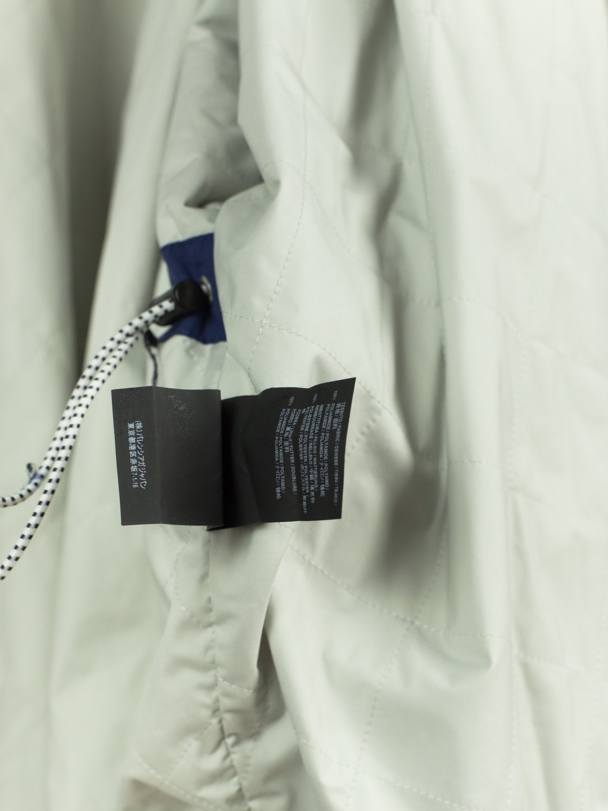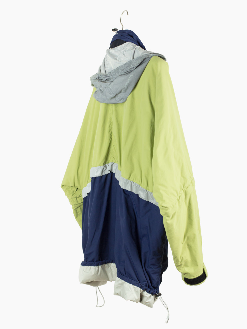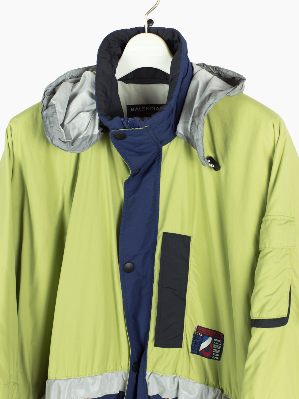 Ski jacket from Spring 2018, a collection centered around fatherhood/a "Dad's" wardrobe. This jacket is a Demna reinvention of an archetypical padded ski jacket that has gone through the paces of fatherhood. An oversized, bagged out quilted grey lining that peeks out at the hem and center front mimics the look of an improperly washed and shrunken garment. Dress weights at the front patch pockets weigh the front down and create a draped/'sagged' worn in shape throughout. Sleeves zip off. Finished with shockcord cinches at reflective 3M waistline and hem, packable reflective branded Balenciaga hood, and multiple pockets throughout.