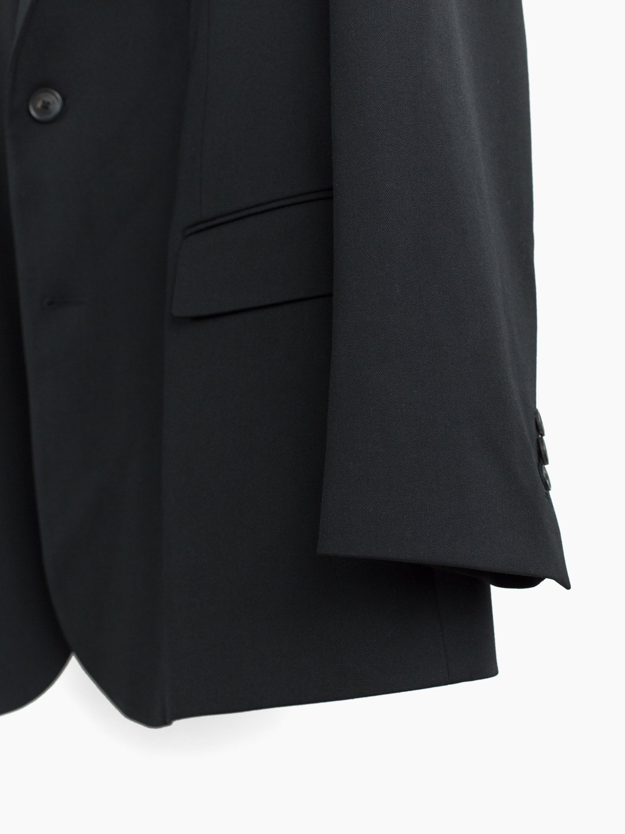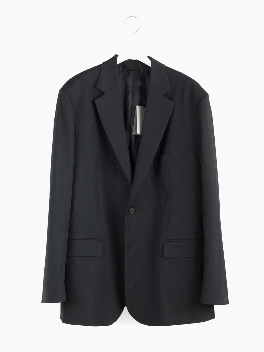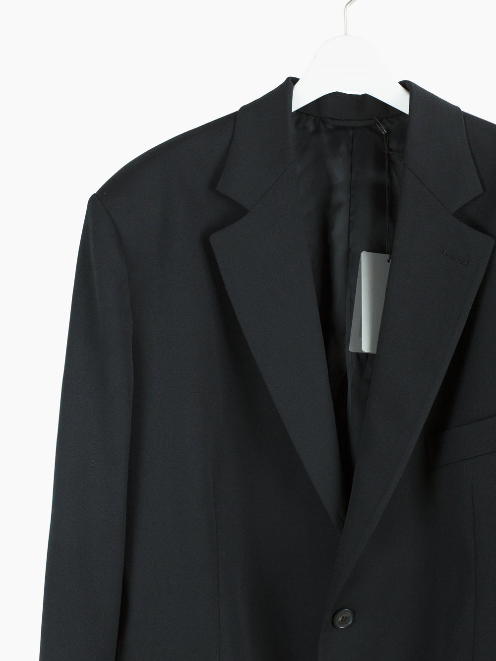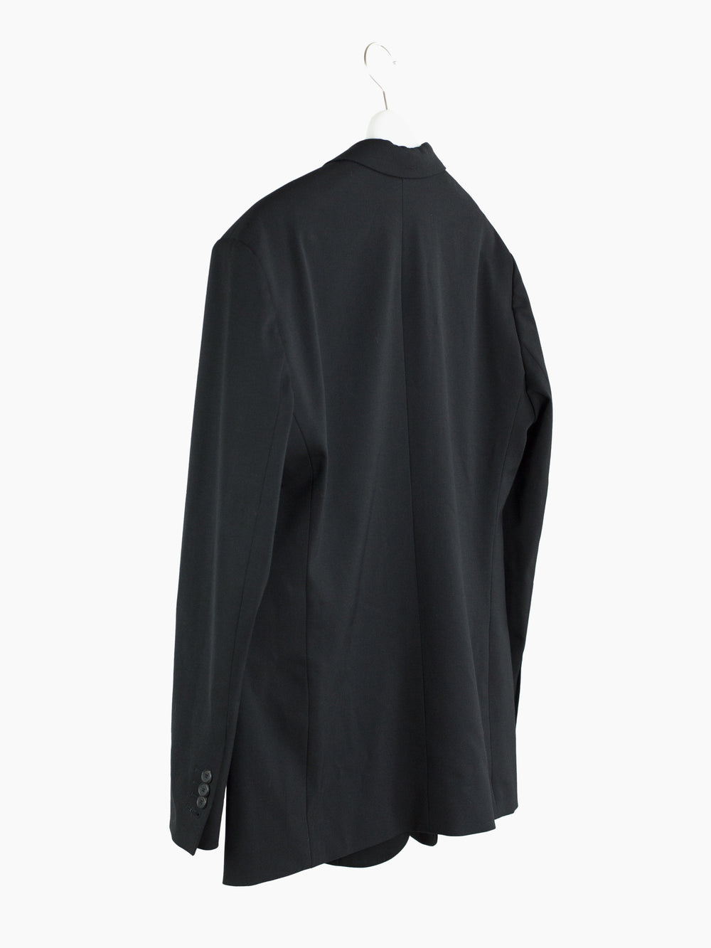 Staff uniform blazer from 2019, rendered in a beautiful technical stretch twill wool blend fabric. This blazer is cut with a beautifully tailored body and armscyes that tilt away from the body in the front, creating an oversize silhouette from the front without bulk in the back. Incredibly sharp with slightly padded shoulders.
