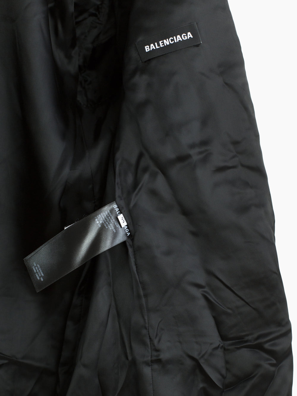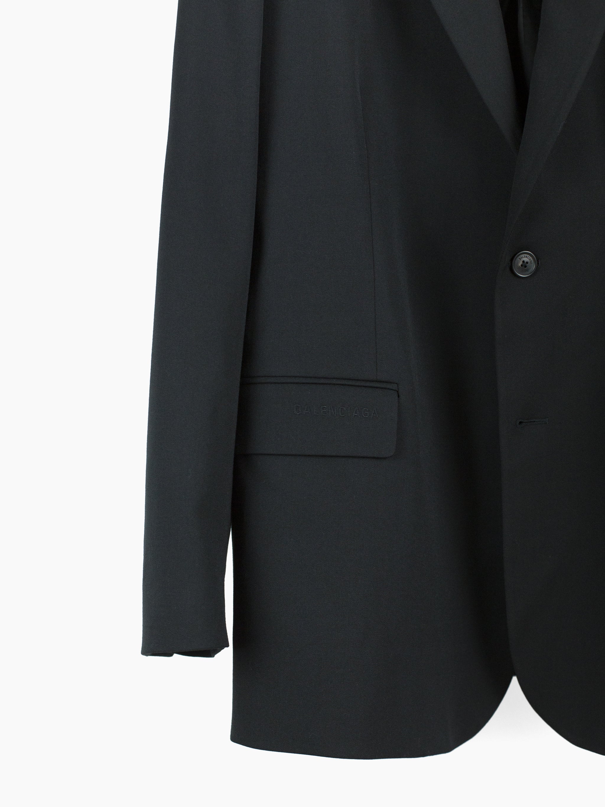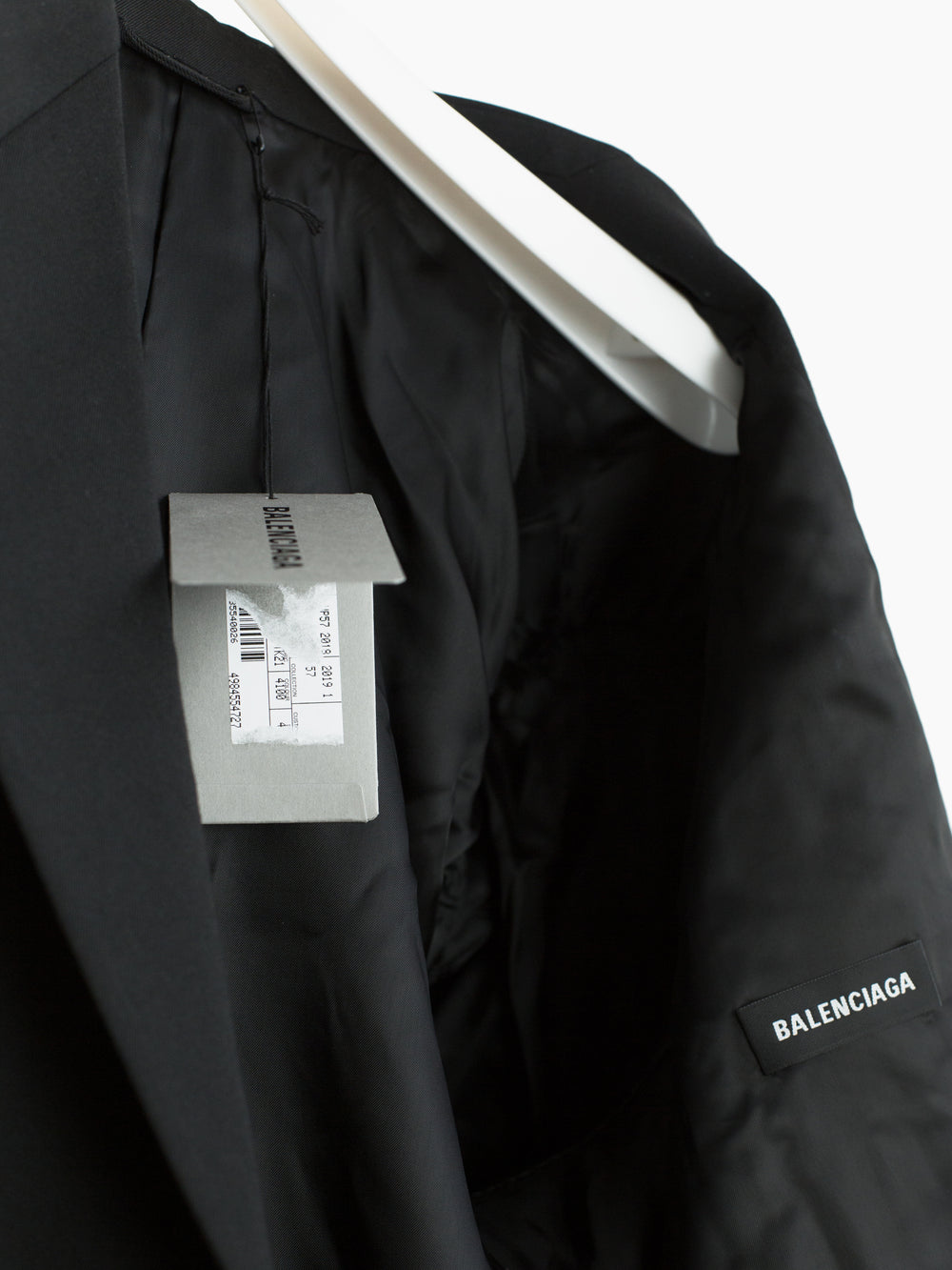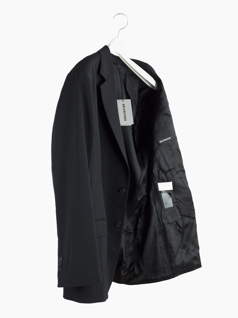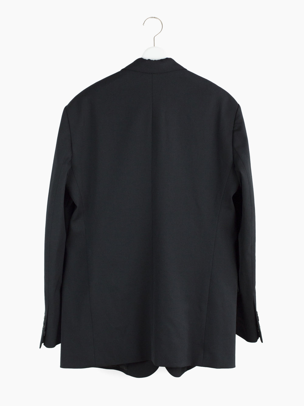 Staff uniform blazer from 2019, rendered in a beautiful technical stretch twill wool blend fabric. This blazer is cut with a beautifully tailored body and armscyes that tilt away from the body in the front, creating an oversize silhouette from the front without bulk in the back. Incredibly sharp with slightly padded shoulders.