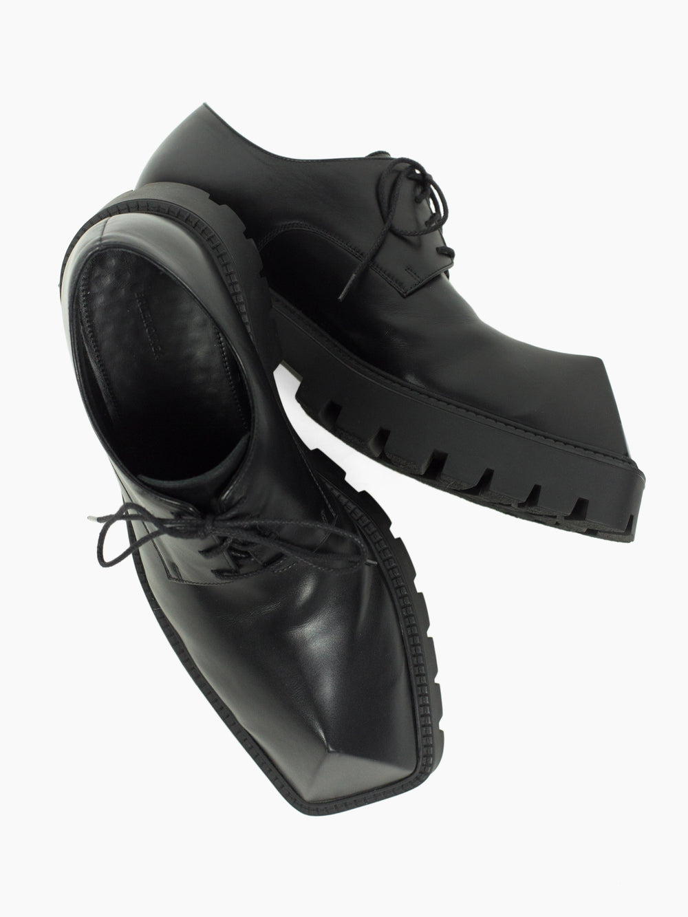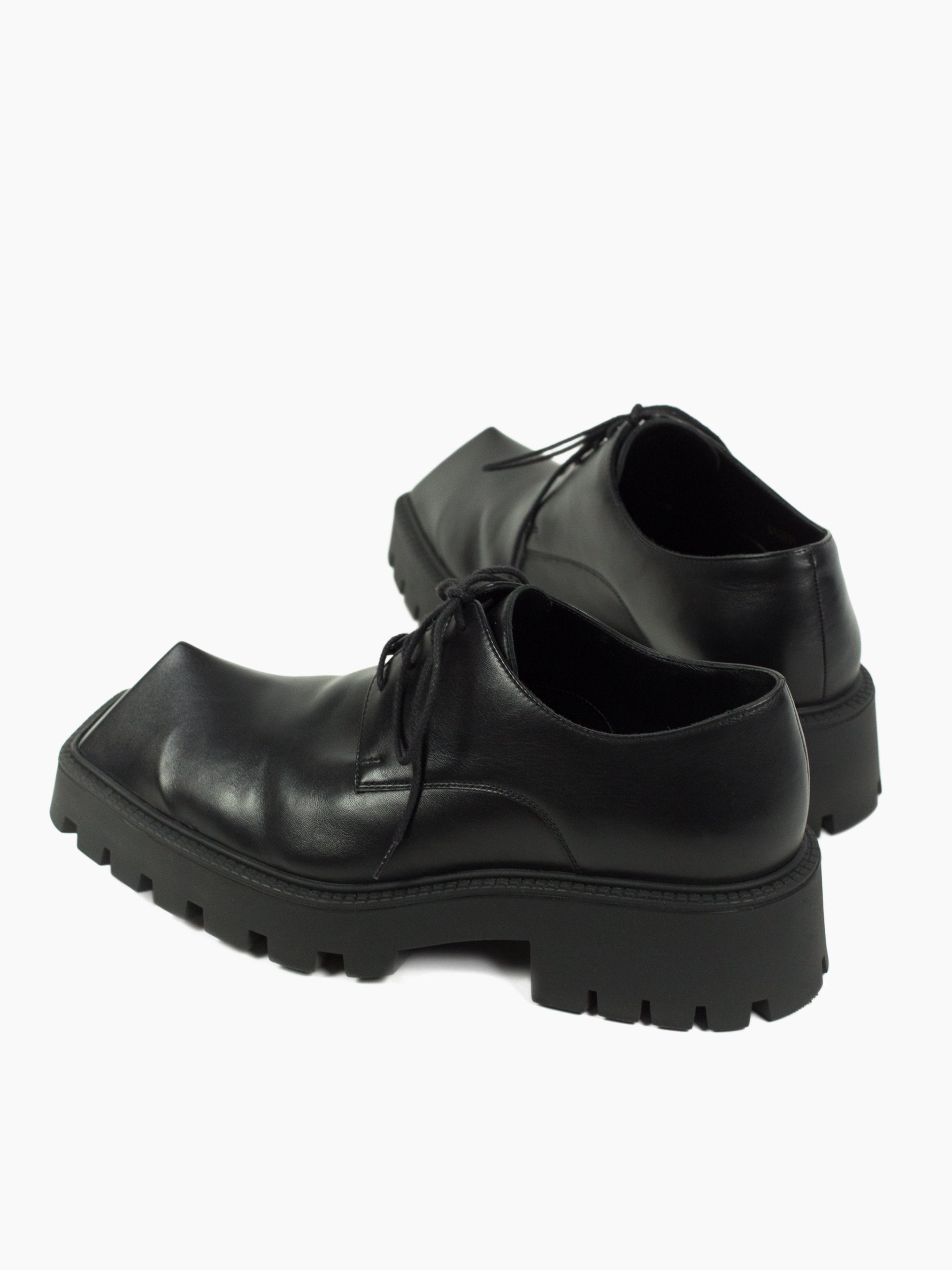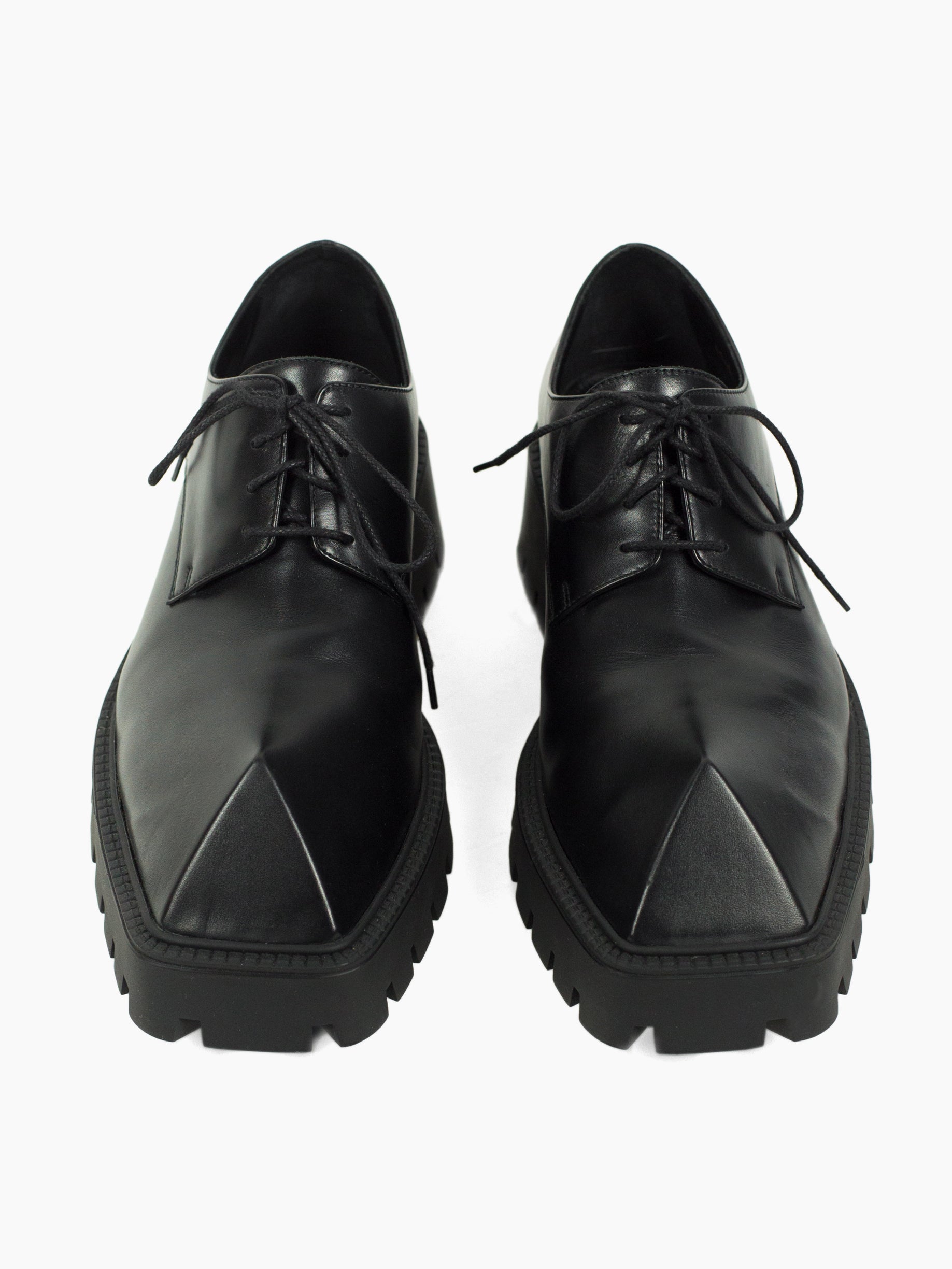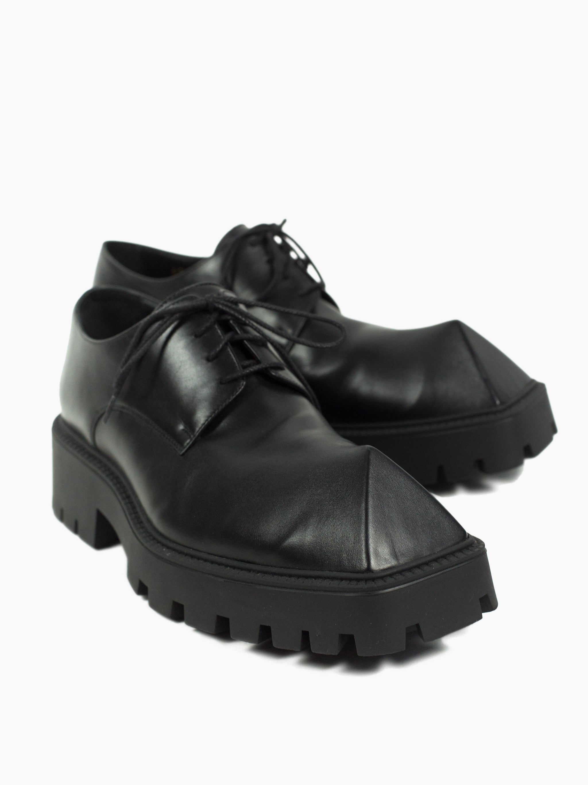 Iconic pyramidal toe derbies from Balenciaga Summer 2021, nicknamed the 'Rhino' derby for its horn-like shape. Subversive and aggressive take on a traditional dress shoe with platform lug sole and the iconic toe design that gives it an iconoclastic energy.