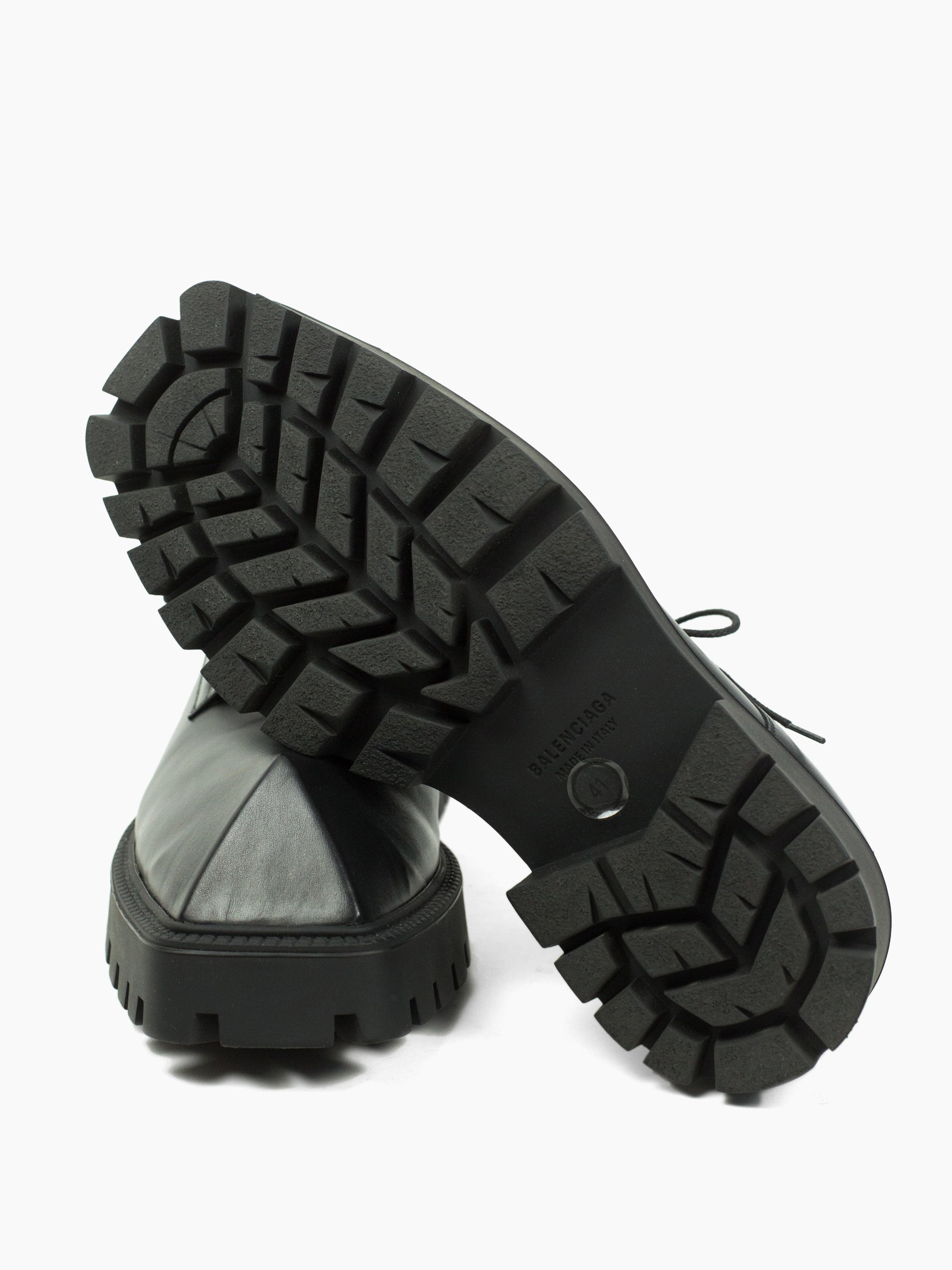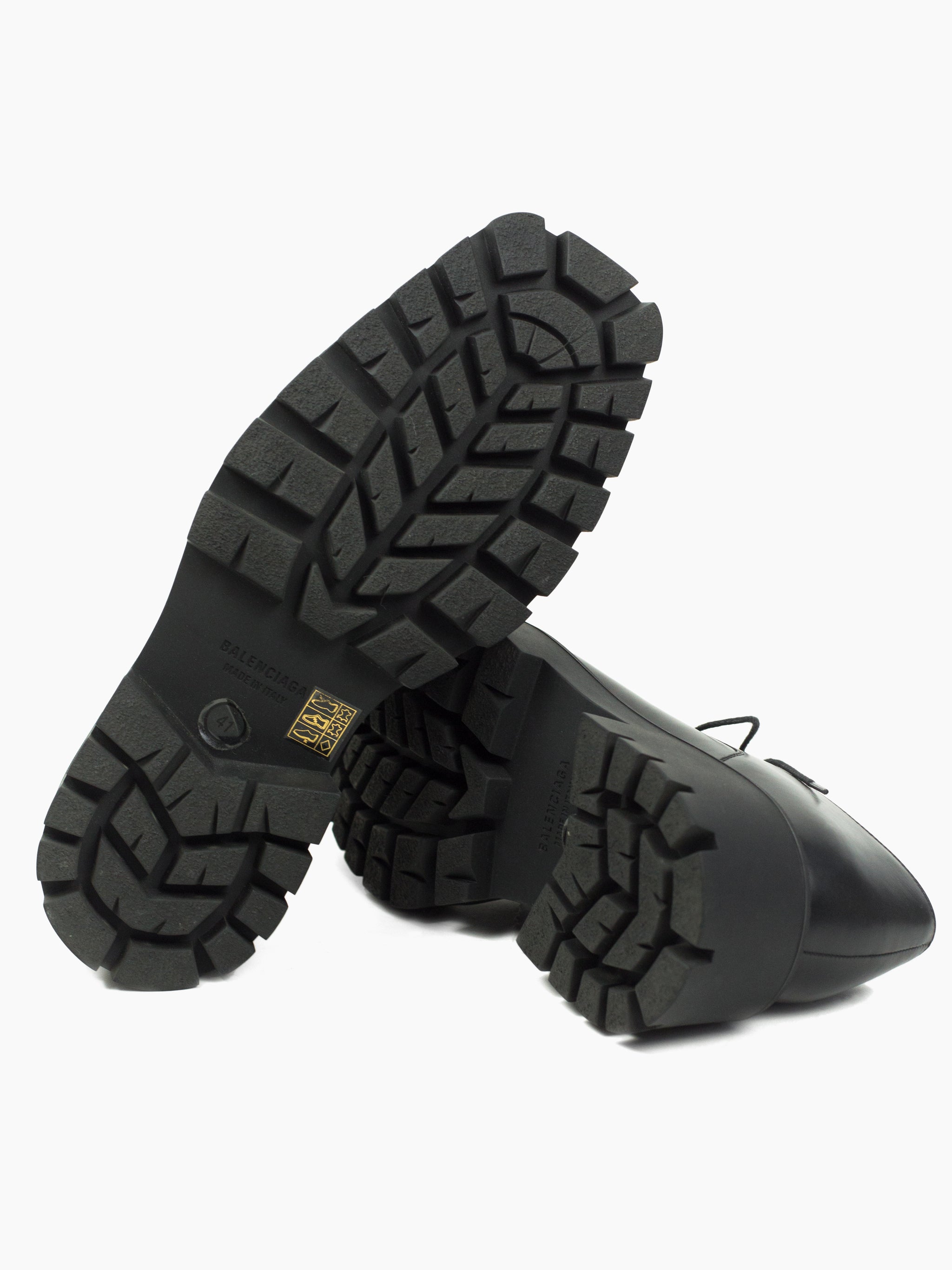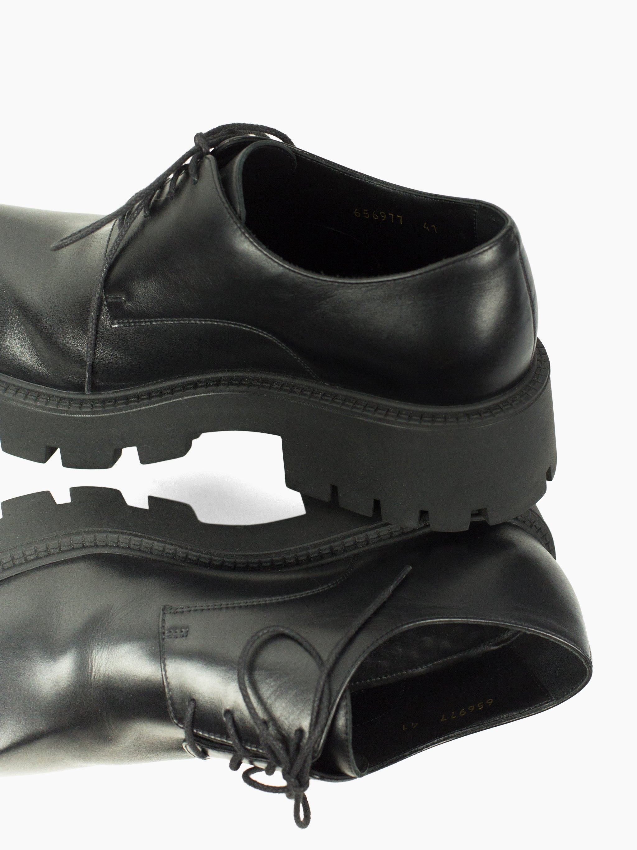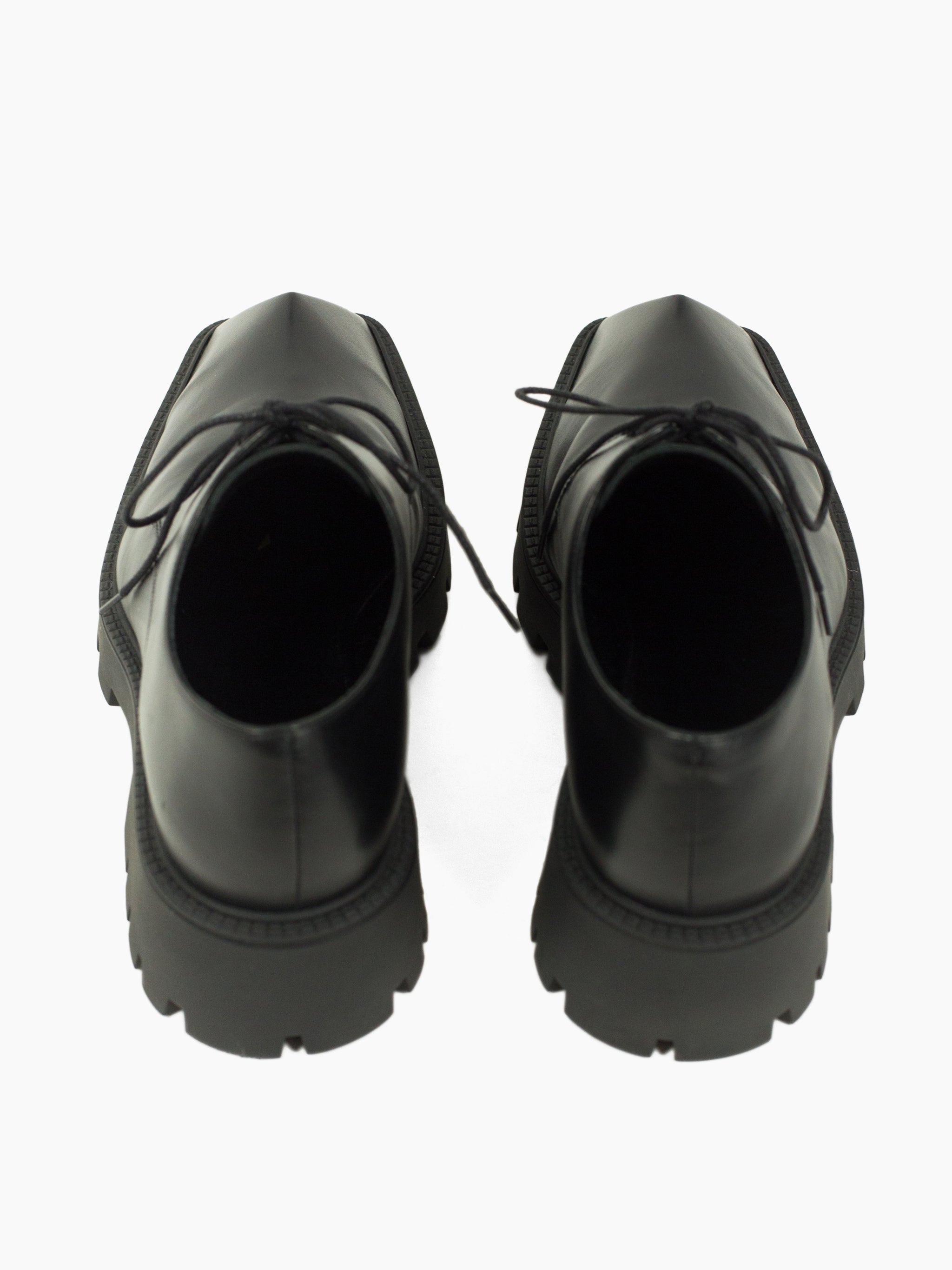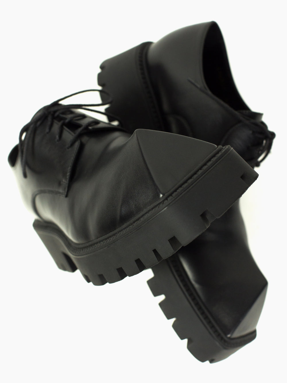 Iconic pyramidal toe derbies from Balenciaga Summer 2021, nicknamed the 'Rhino' derby for its horn-like shape. Subversive and aggressive take on a traditional dress shoe with platform lug sole and the iconic toe design that gives it an iconoclastic energy.