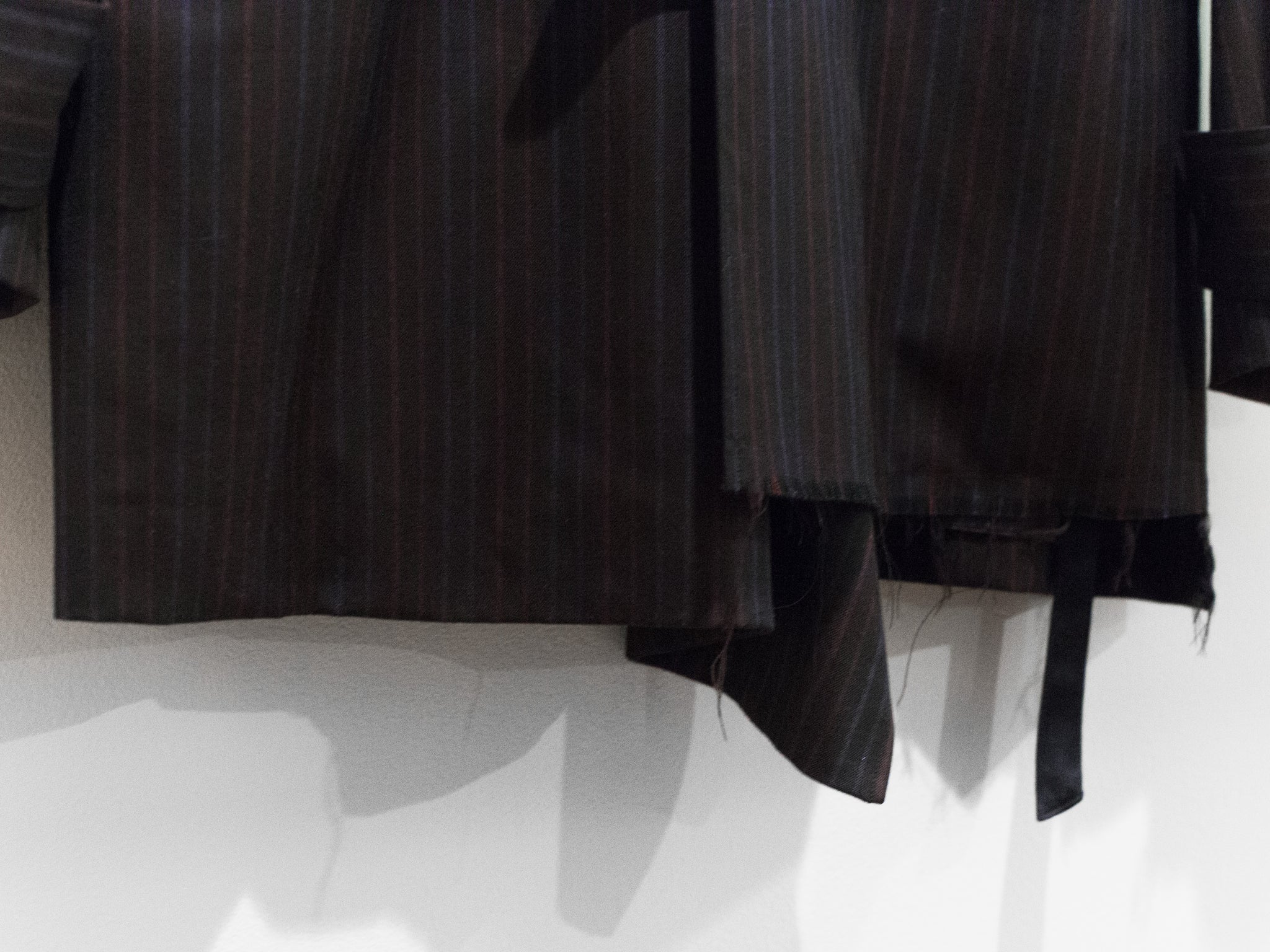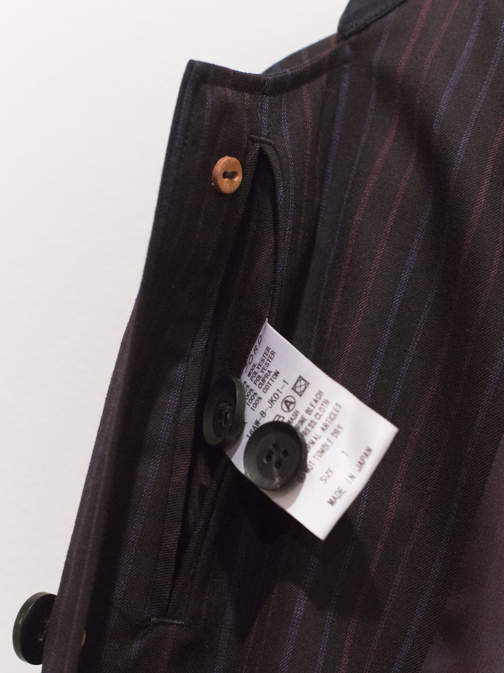 -Red and Blue stripes along a black fabric make the piece read as a muted burgundy/purple from a distance