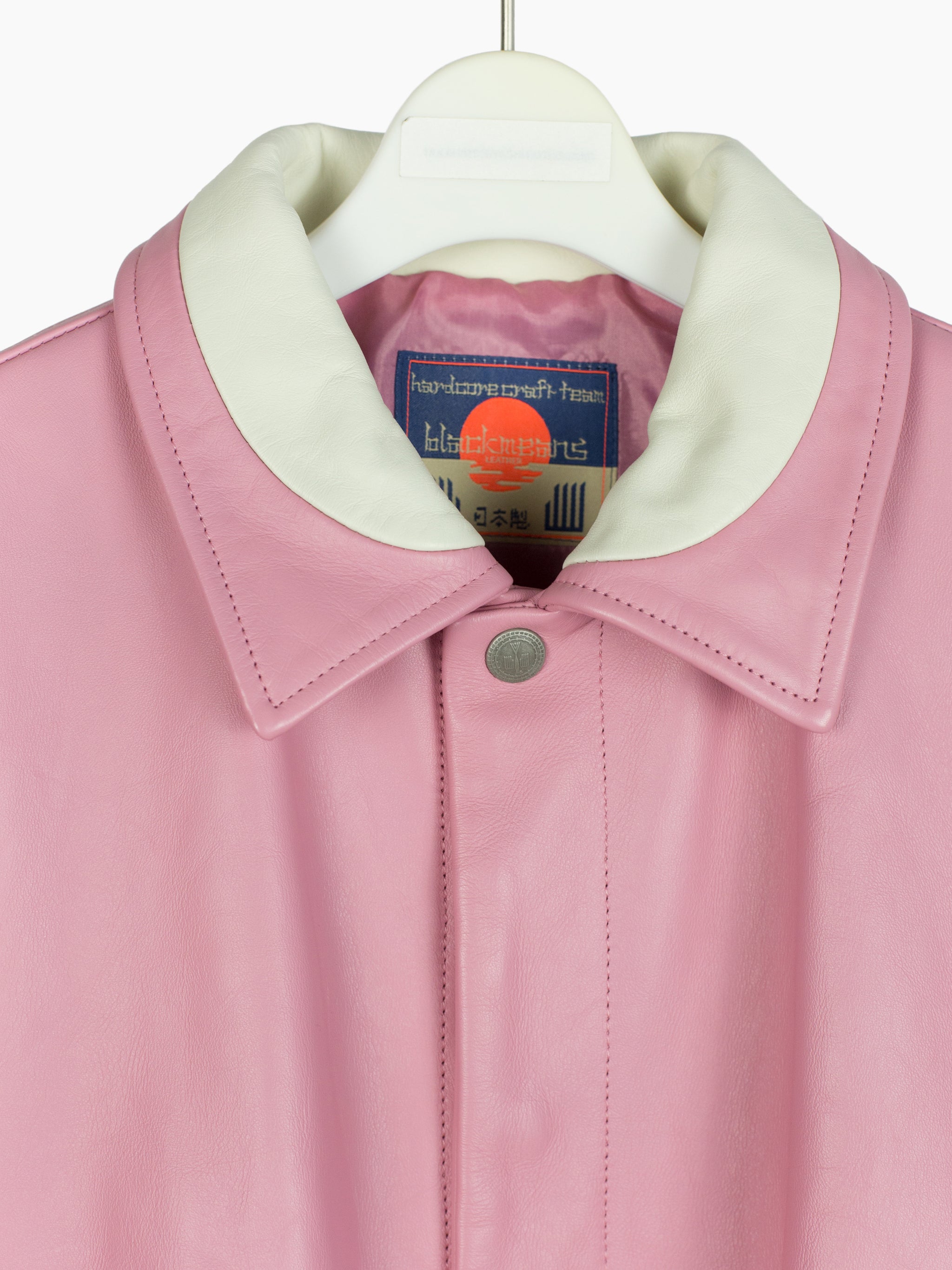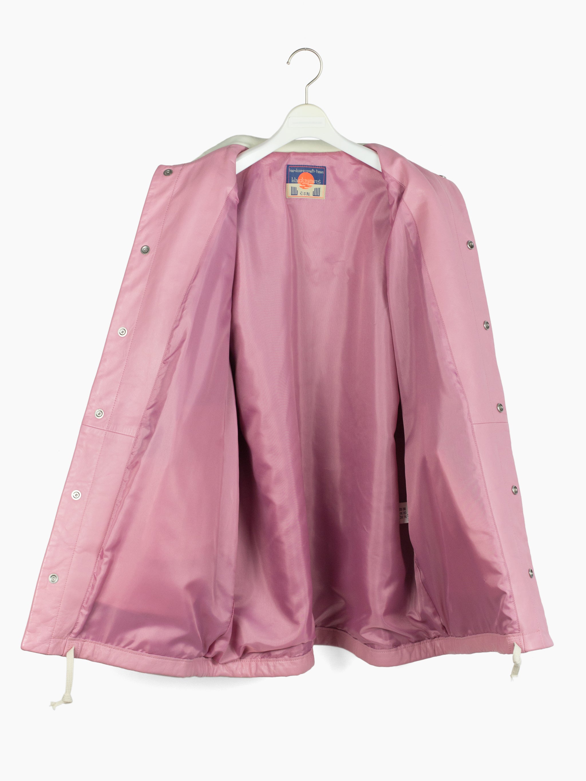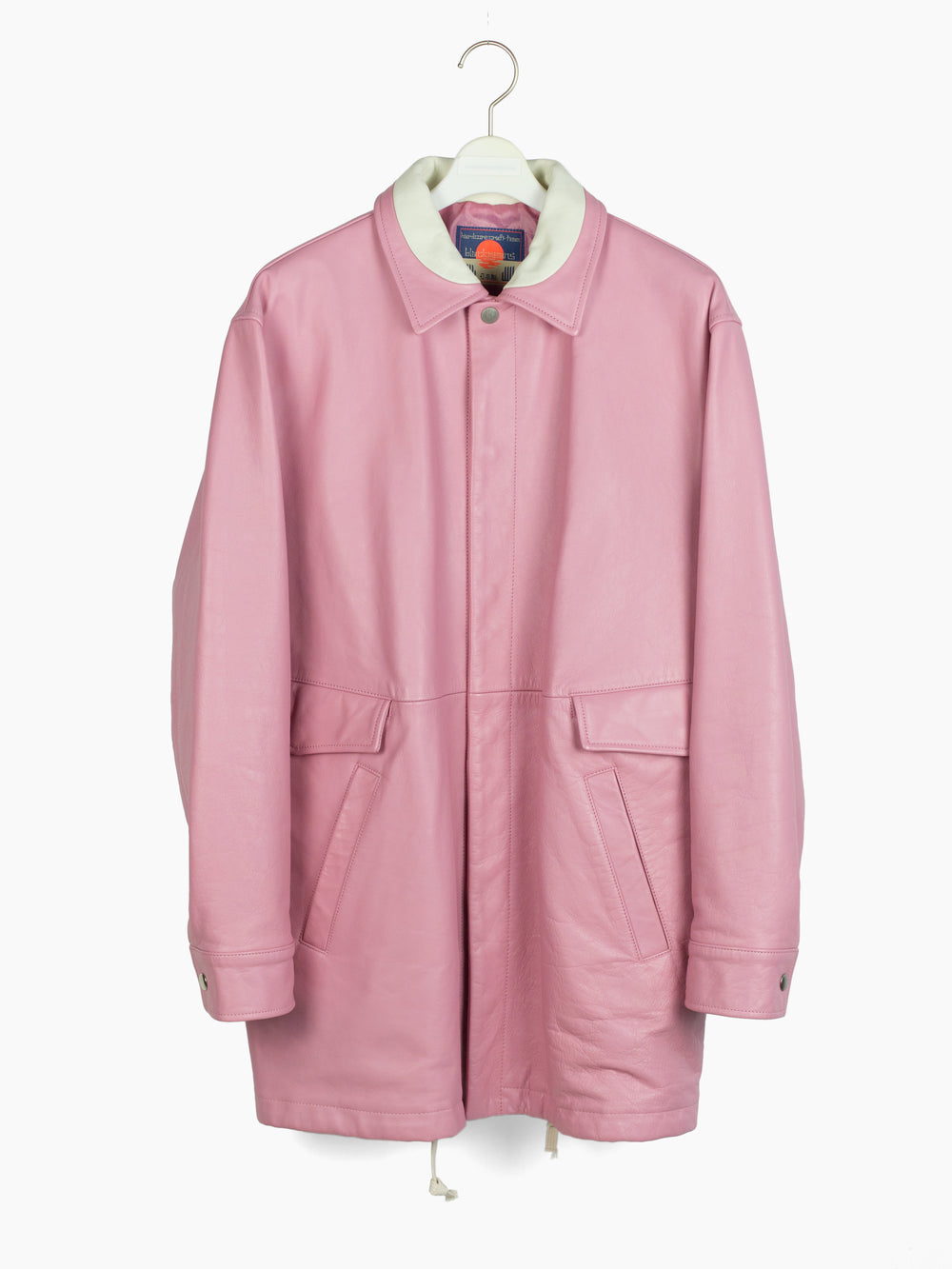 Extended Coach's jacket style coat from Japanese leather artisan collective Blackmeans. Features statement pink cowhide with covered snap front closure for an incredibly clean flush look when done up as well as an array of top entry flap-closed and side entry welt pockets that break the piece up visually at the waist. Rounded contrast cream collar panel brings an unexpected graphic pop.