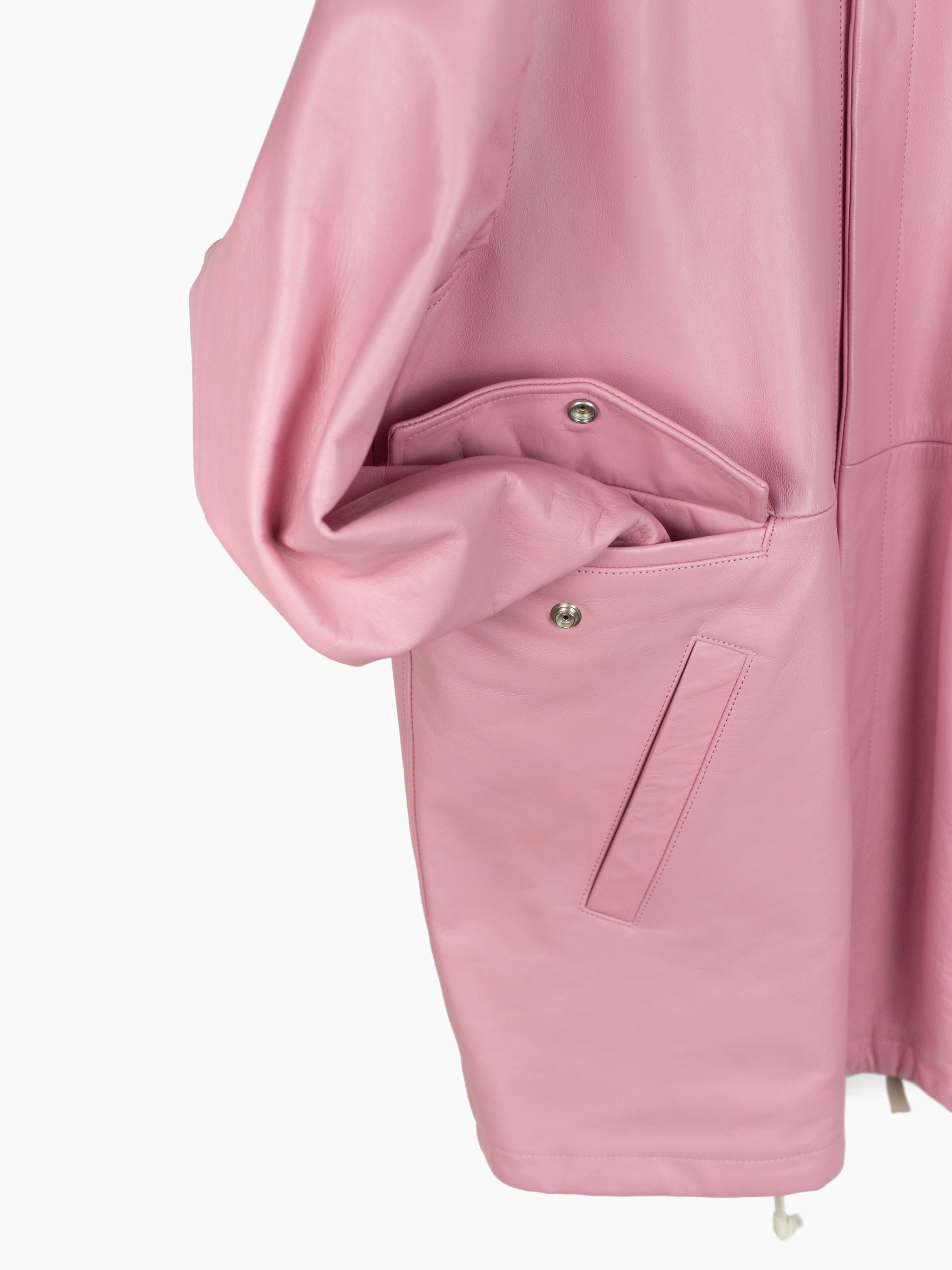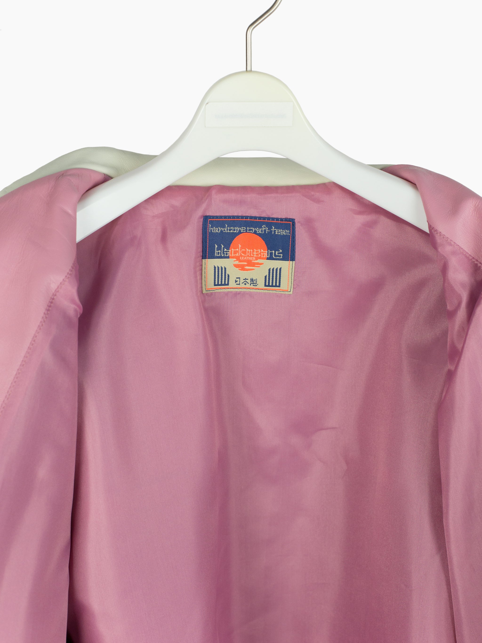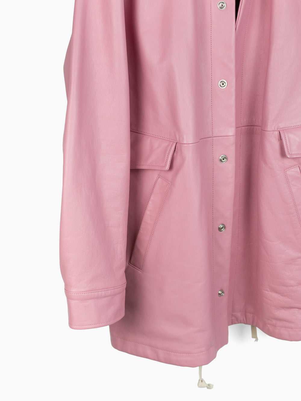Extended Coach's jacket style coat from Japanese leather artisan collective Blackmeans. Features statement pink cowhide with covered snap front closure for an incredibly clean flush look when done up as well as an array of top entry flap-closed and side entry welt pockets that break the piece up visually at the waist. Rounded contrast cream collar panel brings an unexpected graphic pop.