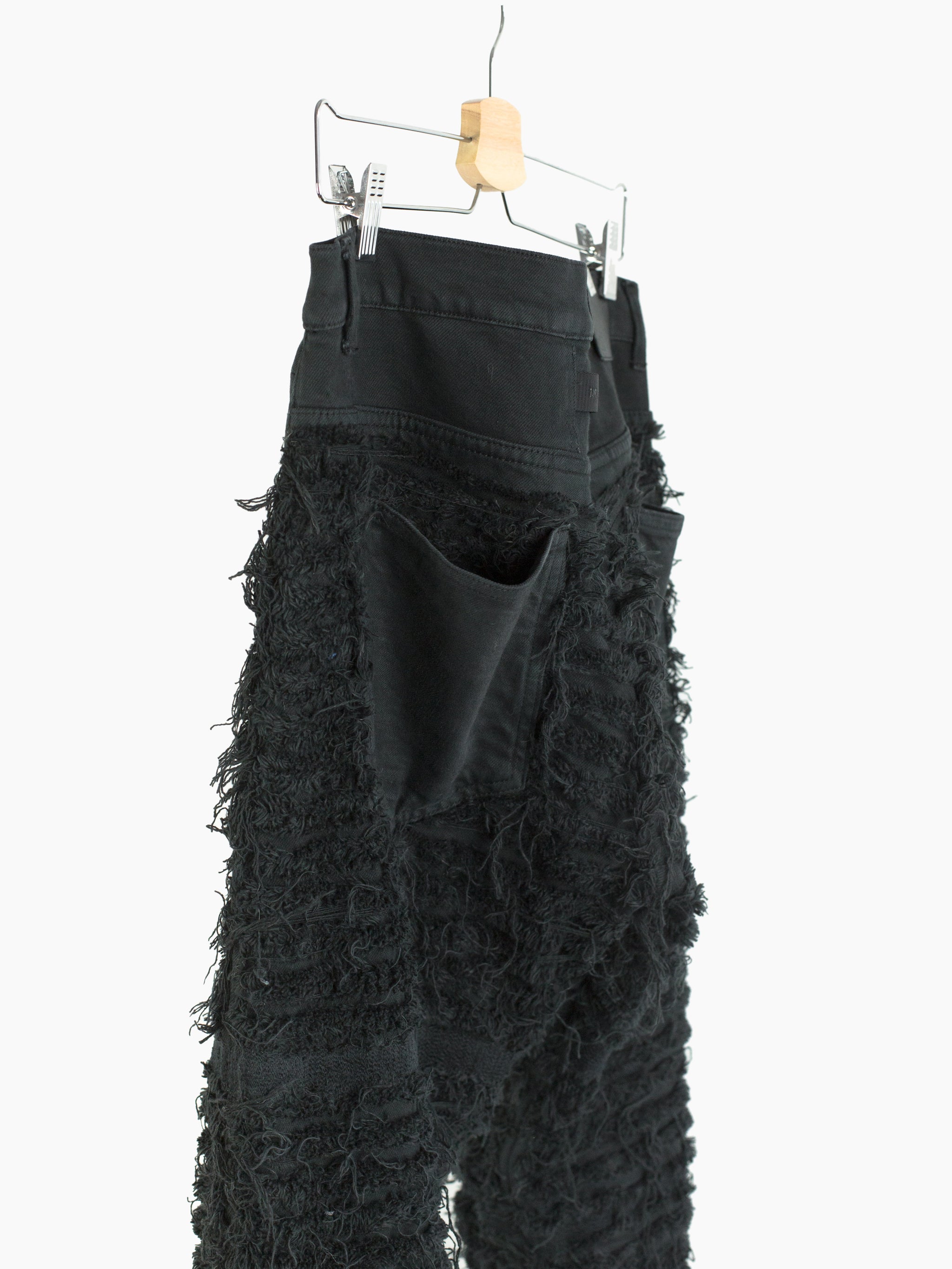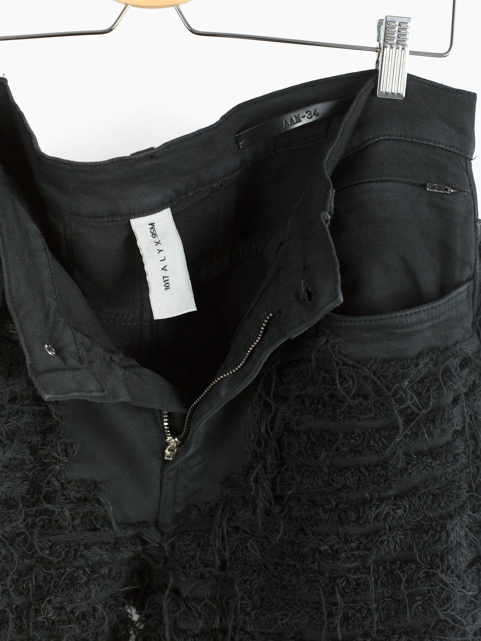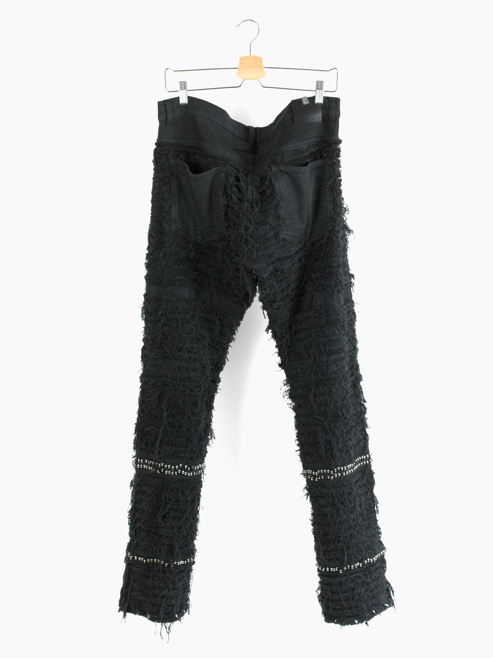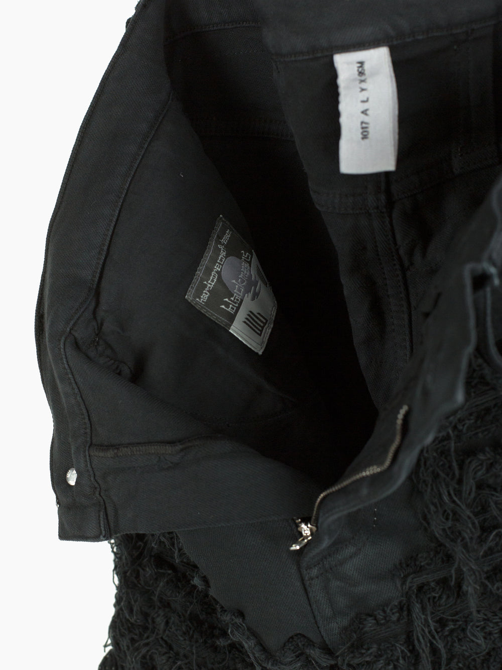 The fruit of a collaboration between Alyx and Japanese DIY experts Blackmeans, these 'destroyed' jeans achieve the look in a painstakingly constructed way that ensures the structural integrity of the garment. Instead of distressing or slashing open a pair of black denim, individual raw-edged strips of fabric are stitched horizontally onto the base pant which is what creates the frayed, stringy, destroyed texture. Tiered down the legs are an assortment of different fabrications--densely stitched darned strips and hand-set metal studs. All of these different extensively detailed elements coalesce into a pant that reads at once both DIY punk and artisan handcrafted.