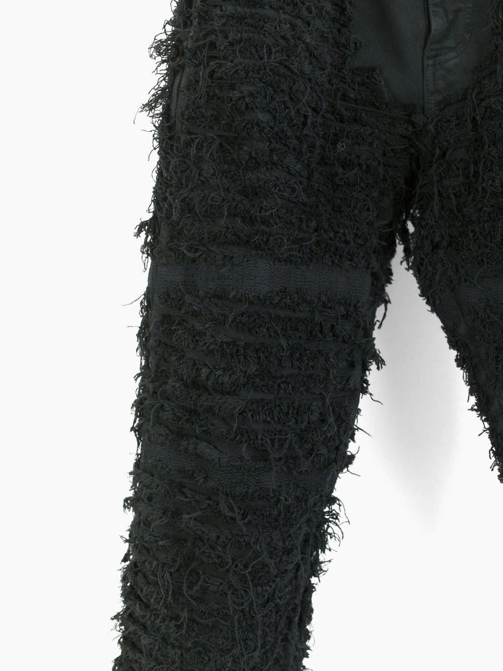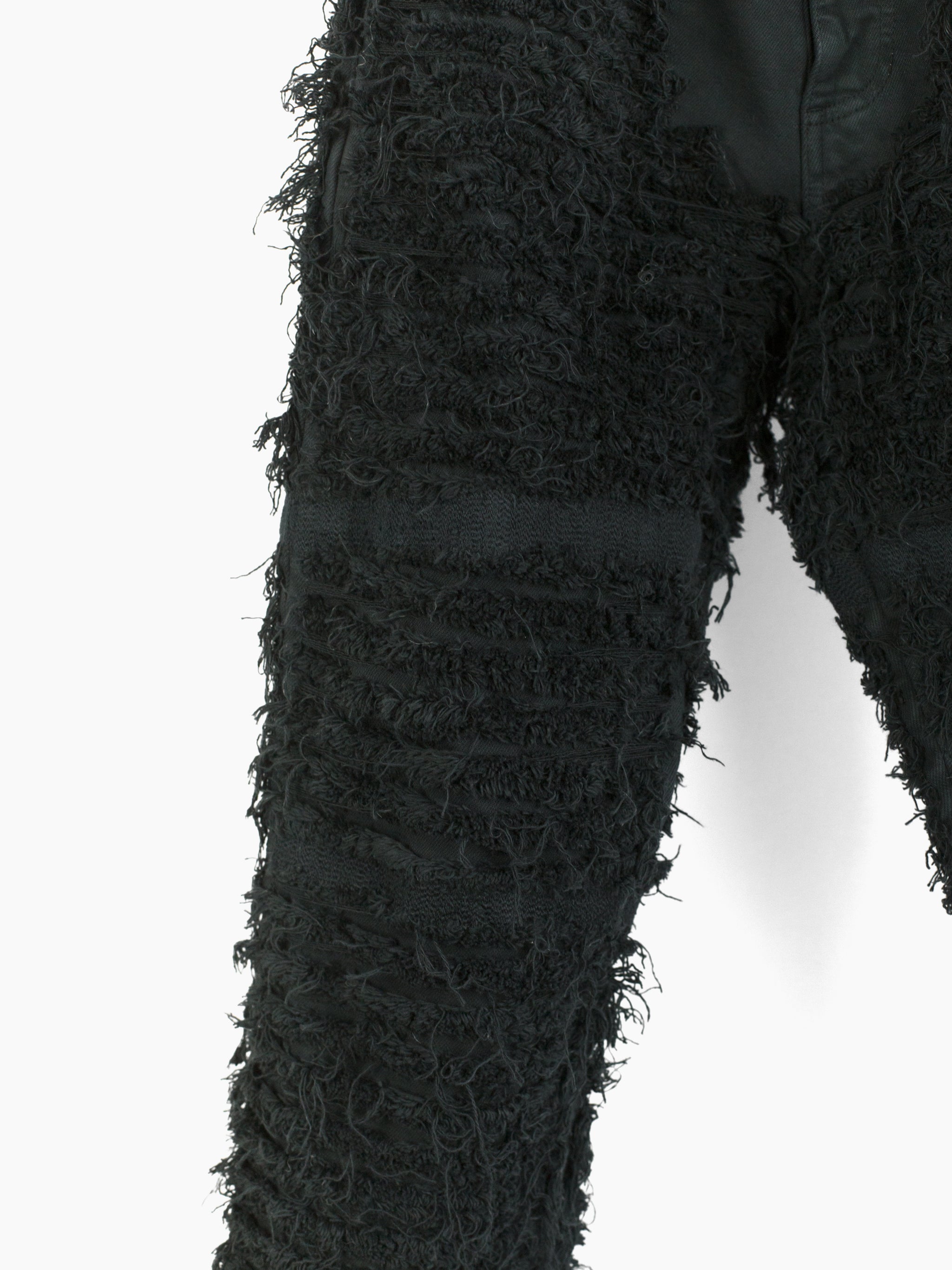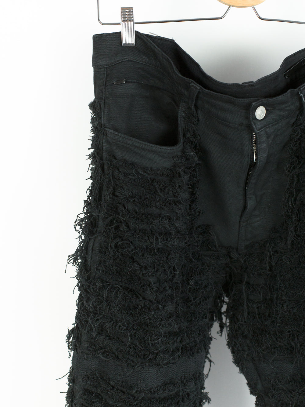 The fruit of a collaboration between Alyx and Japanese DIY experts Blackmeans, these 'destroyed' jeans achieve the look in a painstakingly constructed way that ensures the structural integrity of the garment. Instead of distressing or slashing open a pair of black denim, individual raw-edged strips of fabric are stitched horizontally onto the base pant which is what creates the frayed, stringy, destroyed texture. Tiered down the legs are an assortment of different fabrications--densely stitched darned strips and hand-set metal studs. All of these different extensively detailed elements coalesce into a pant that reads at once both DIY punk and artisan handcrafted.