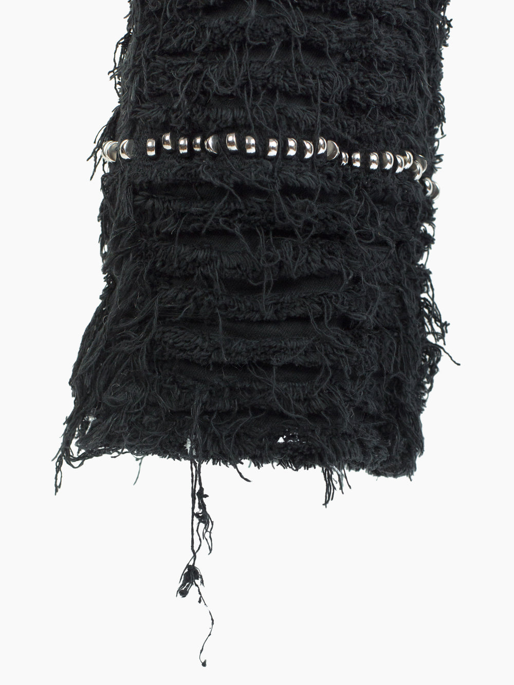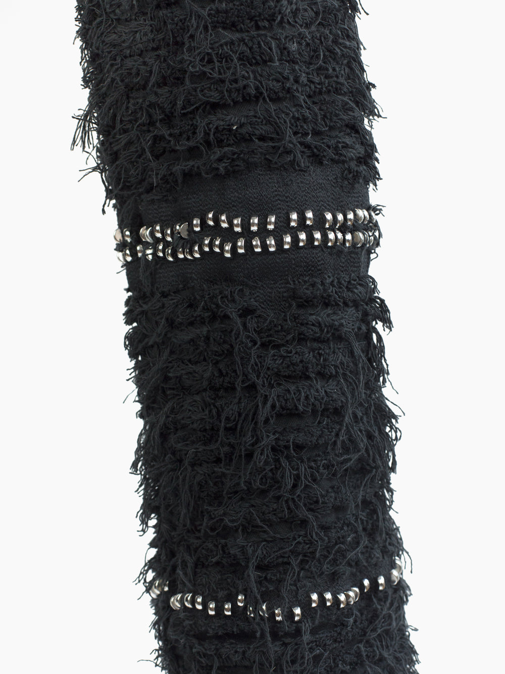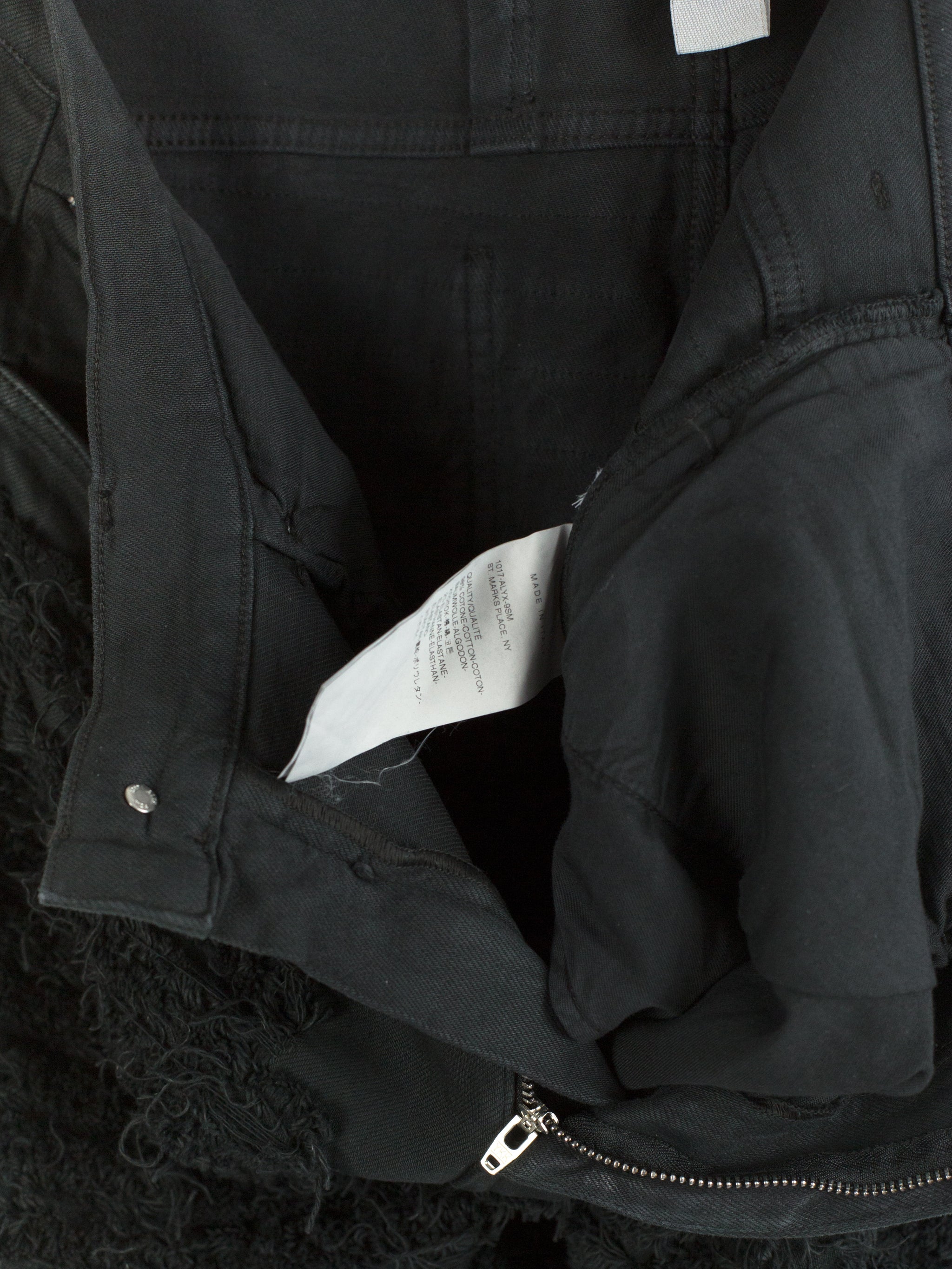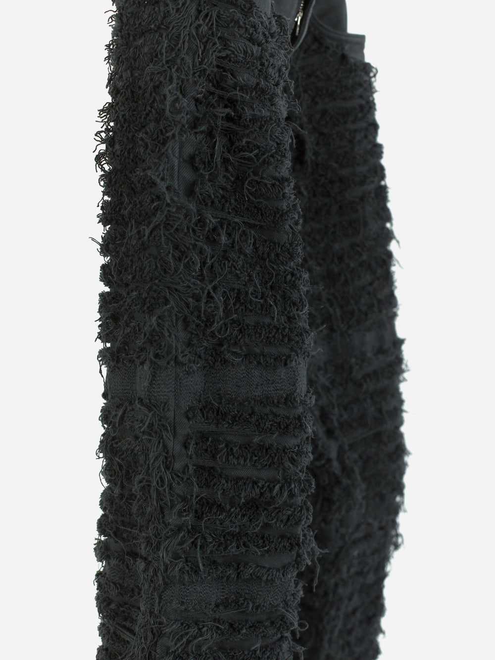 The fruit of a collaboration between Alyx and Japanese DIY experts Blackmeans, these 'destroyed' jeans achieve the look in a painstakingly constructed way that ensures the structural integrity of the garment. Instead of distressing or slashing open a pair of black denim, individual raw-edged strips of fabric are stitched horizontally onto the base pant which is what creates the frayed, stringy, destroyed texture. Tiered down the legs are an assortment of different fabrications--densely stitched darned strips and hand-set metal studs. All of these different extensively detailed elements coalesce into a pant that reads at once both DIY punk and artisan handcrafted.