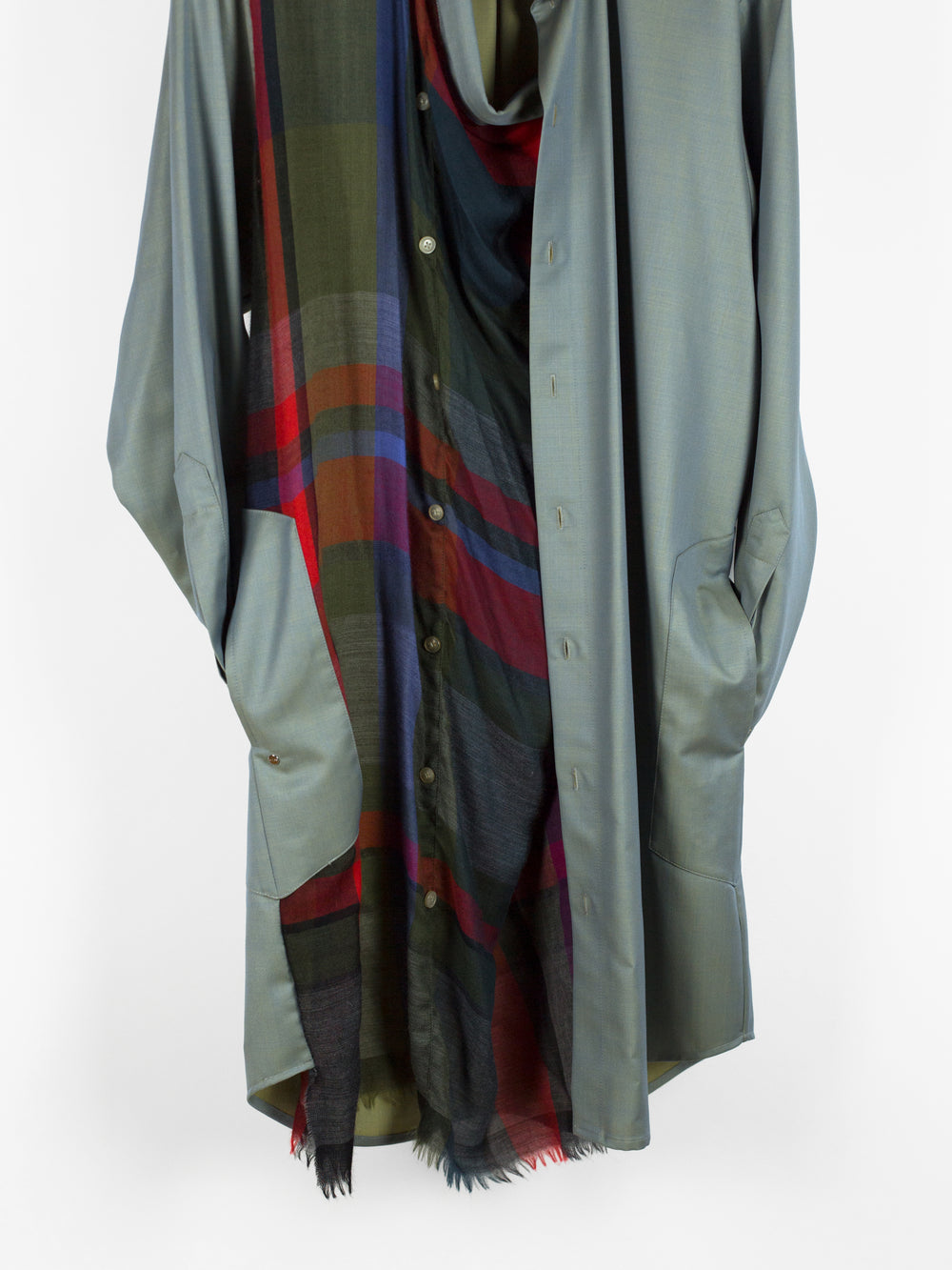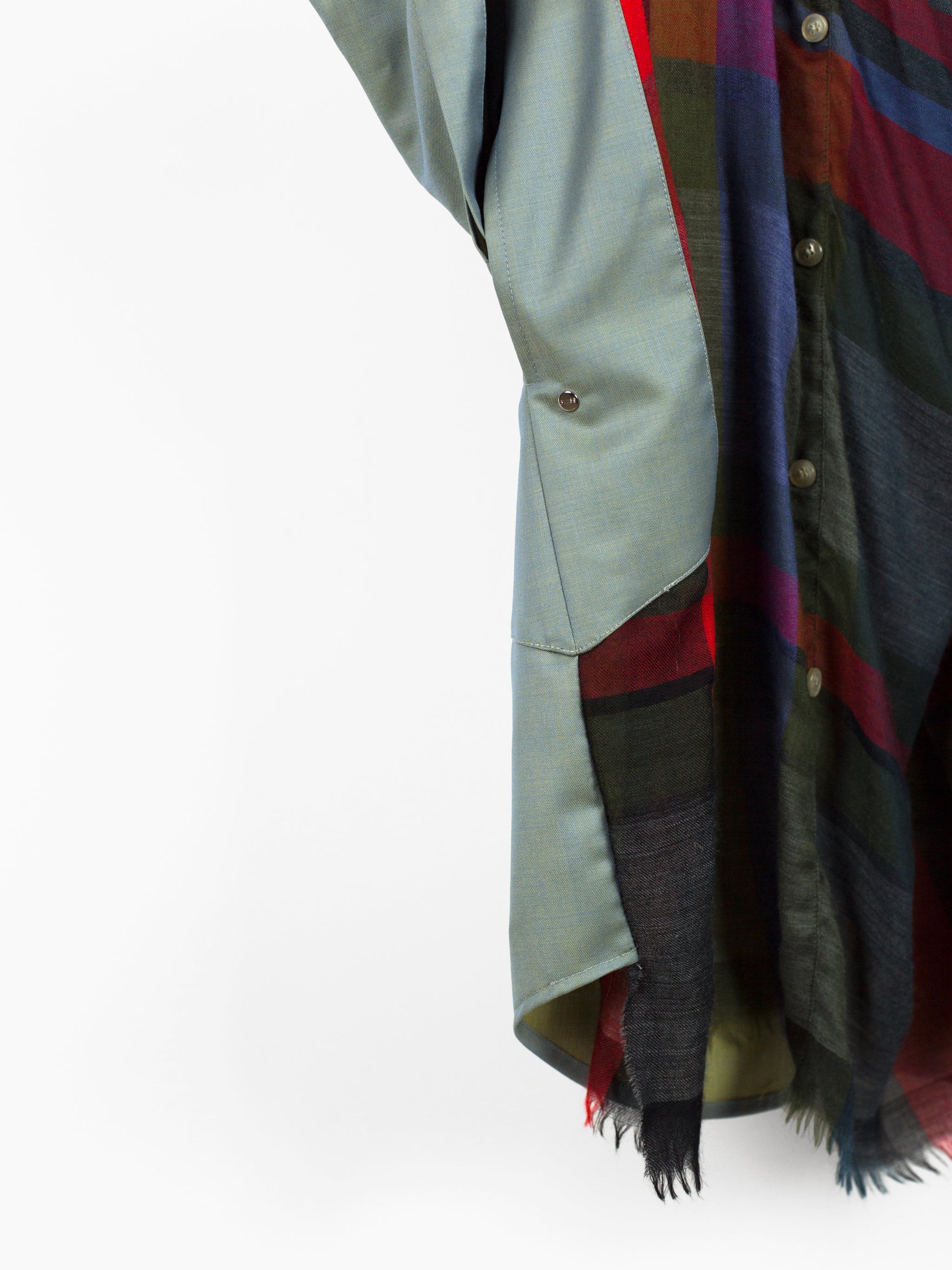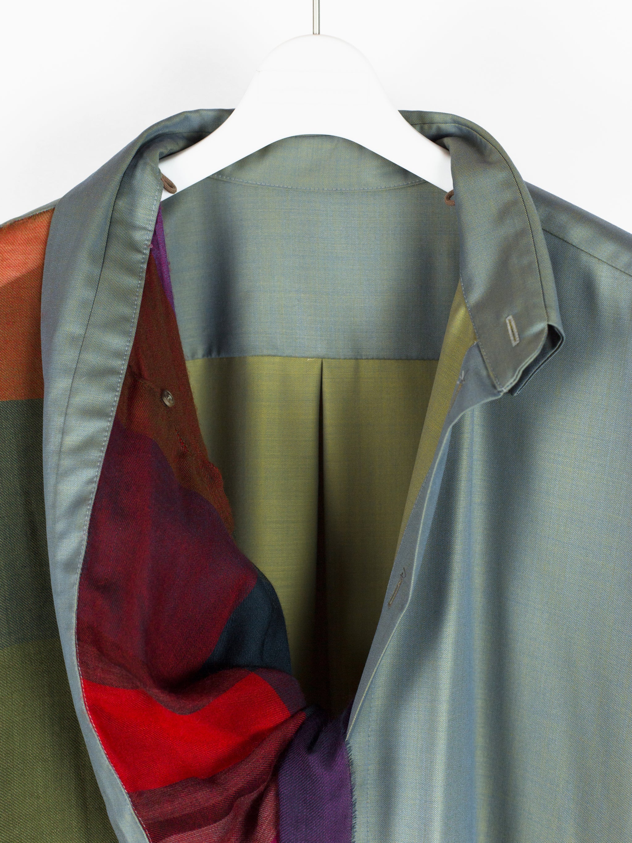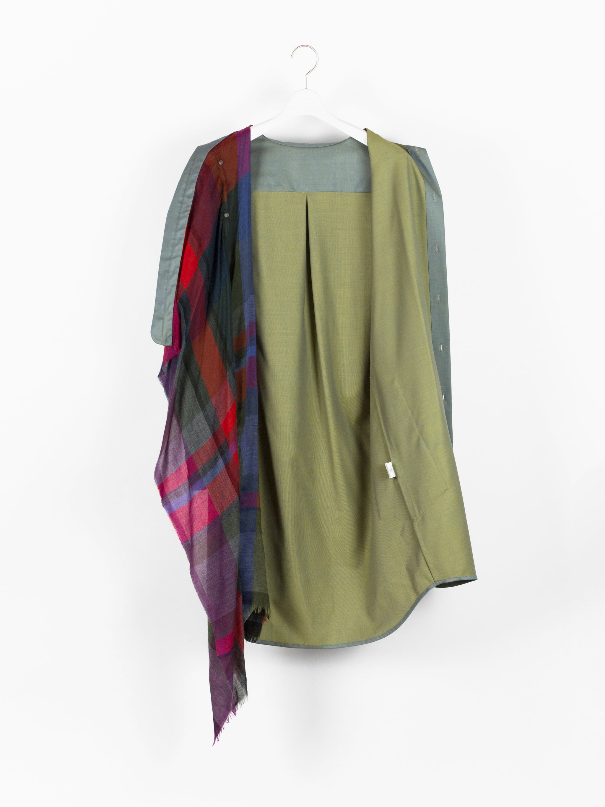 This hybrid scarf-shirt-dress is cut in a robust virgin wool that mixes blue and yellow yarns. The slight sheen and iridescence of contrasting yarns means the color and texture are dynamic and constantly shifting while in motion. An elongated semi-sheer cashmere scarf is inserted in place of the right front panel with multiple ways of fastening, allowing for expressive styling by the wearer. The scarf is sewn into an extended band collar at the top that can be buttoned to two interior loops at the sides of the neck or the center buttonhole of the left side collar. The bottom is left fringed. Unisex, versatile, and expressive, this shirtdress/tunic can easily be worn layered over or under other garments as a visual accent.