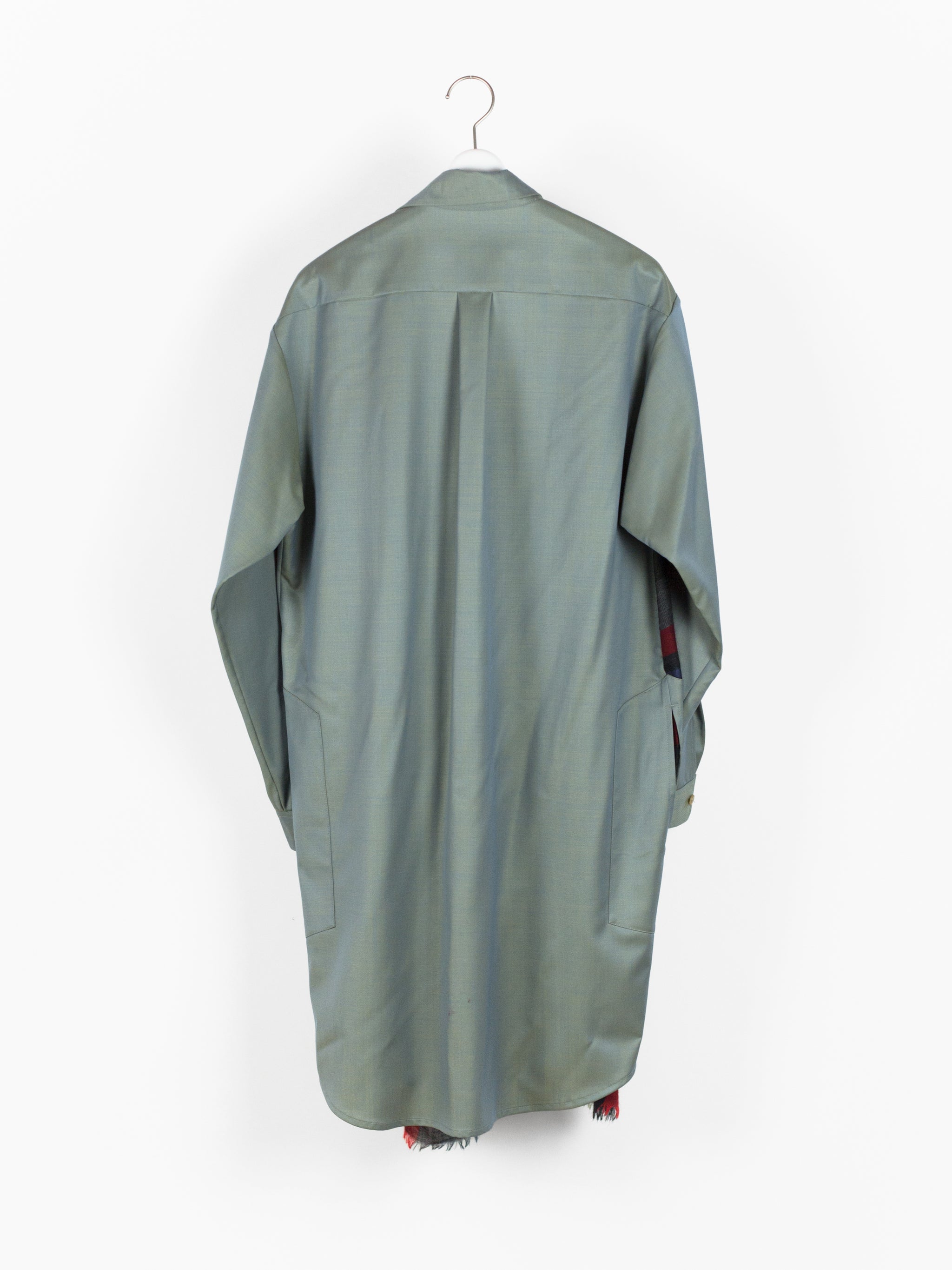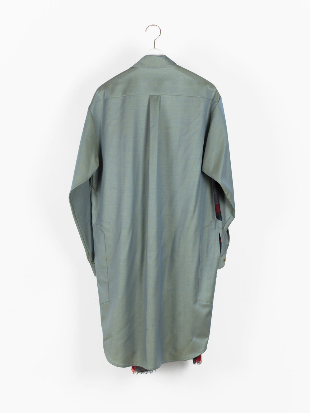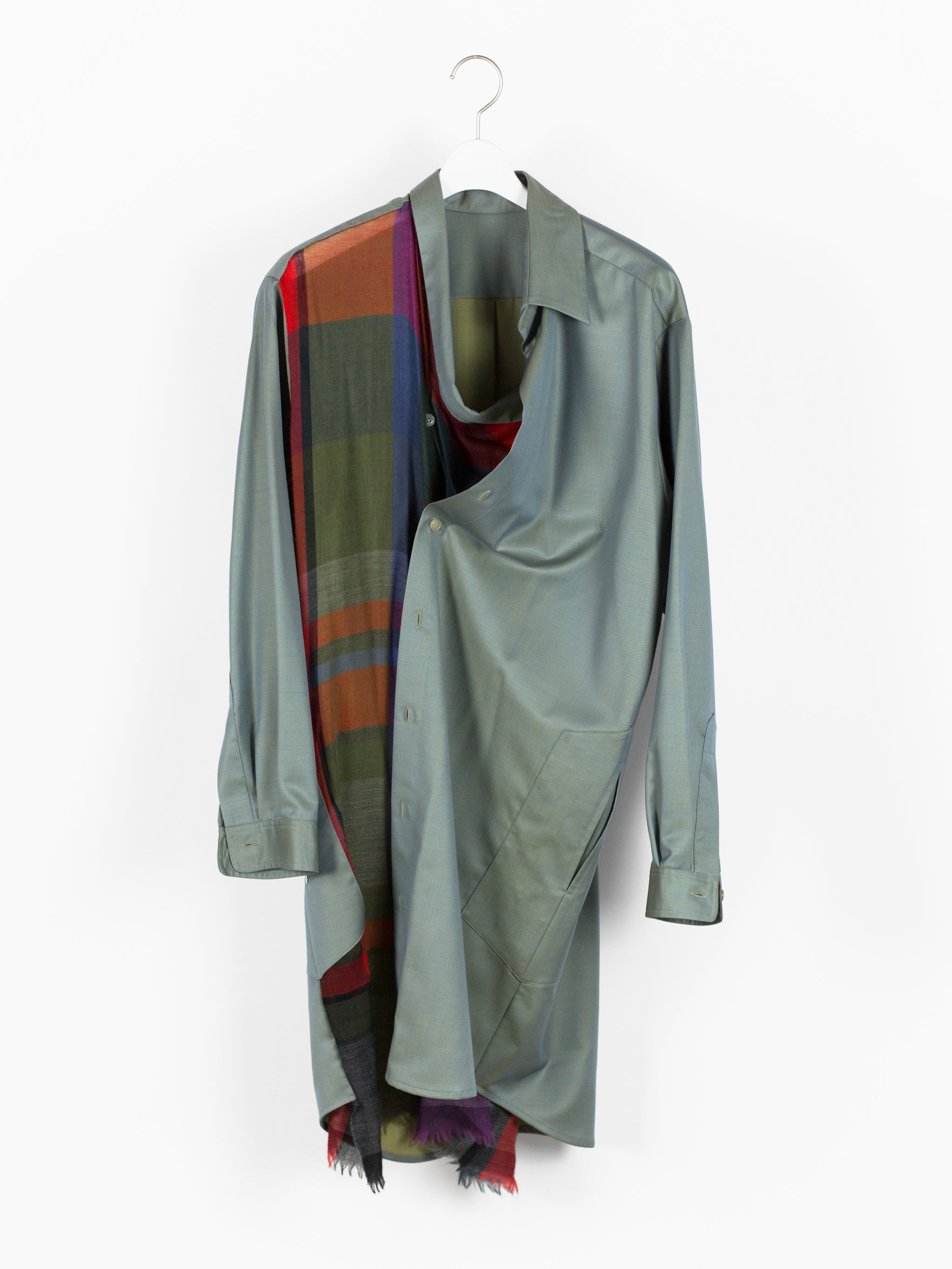This hybrid scarf-shirt-dress is cut in a robust virgin wool that mixes blue and yellow yarns. The slight sheen and iridescence of contrasting yarns means the color and texture are dynamic and constantly shifting while in motion. An elongated semi-sheer cashmere scarf is inserted in place of the right front panel with multiple ways of fastening, allowing for expressive styling by the wearer. The scarf is sewn into an extended band collar at the top that can be buttoned to two interior loops at the sides of the neck or the center buttonhole of the left side collar. The bottom is left fringed. Unisex, versatile, and expressive, this shirtdress/tunic can easily be worn layered over or under other garments as a visual accent.