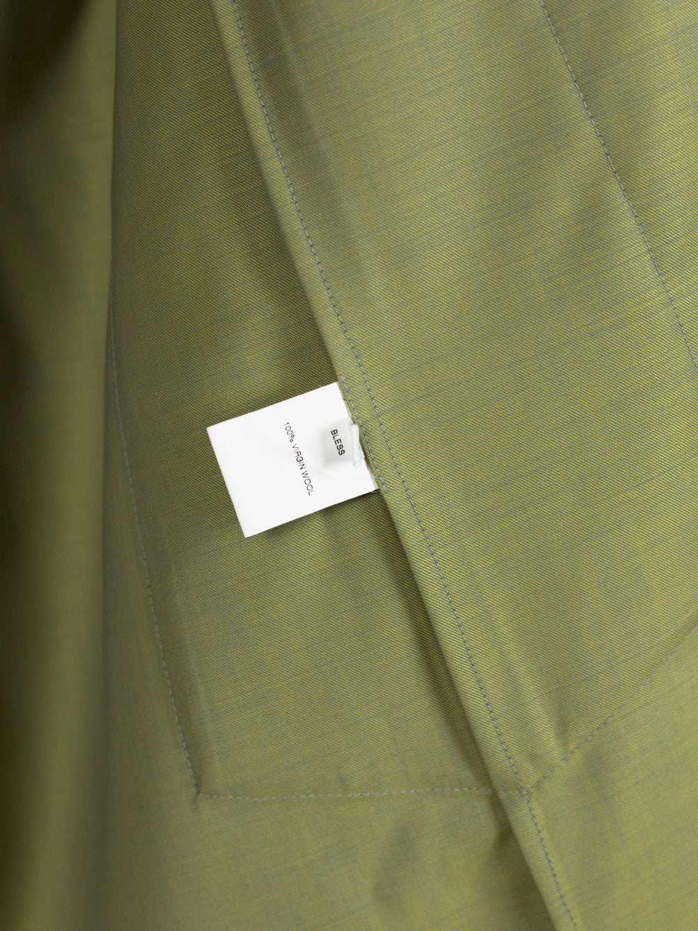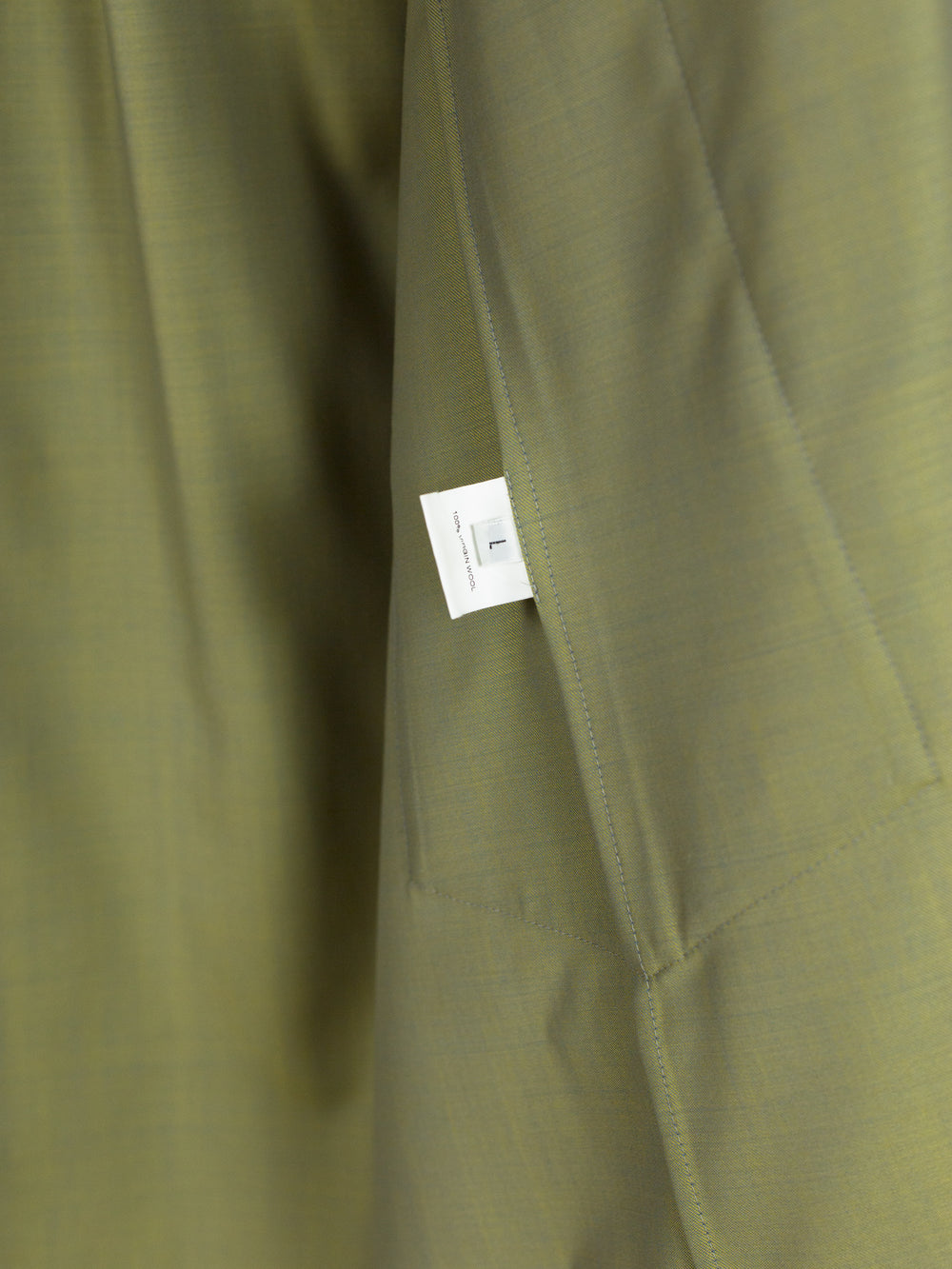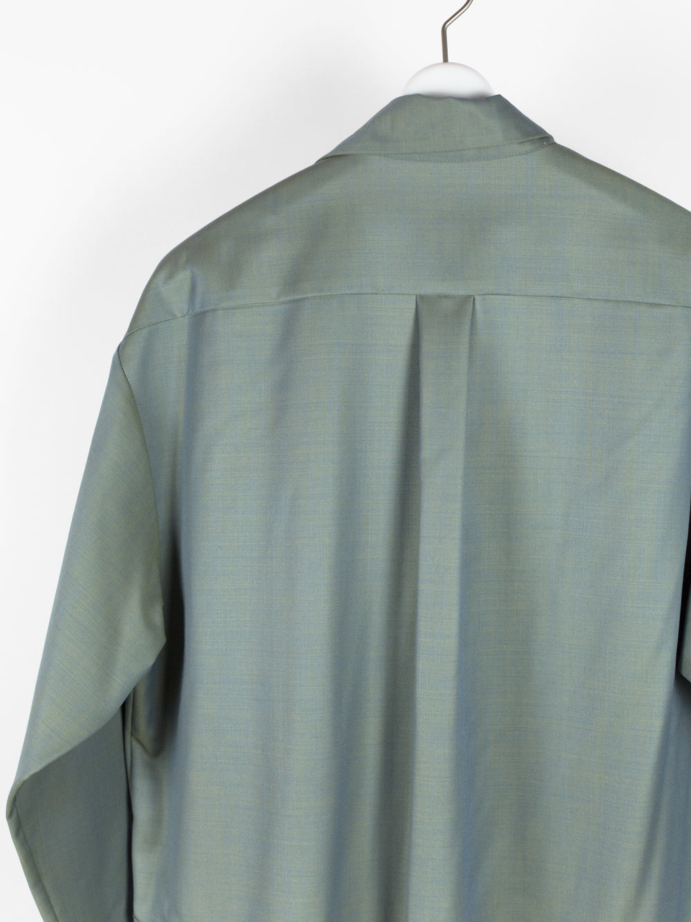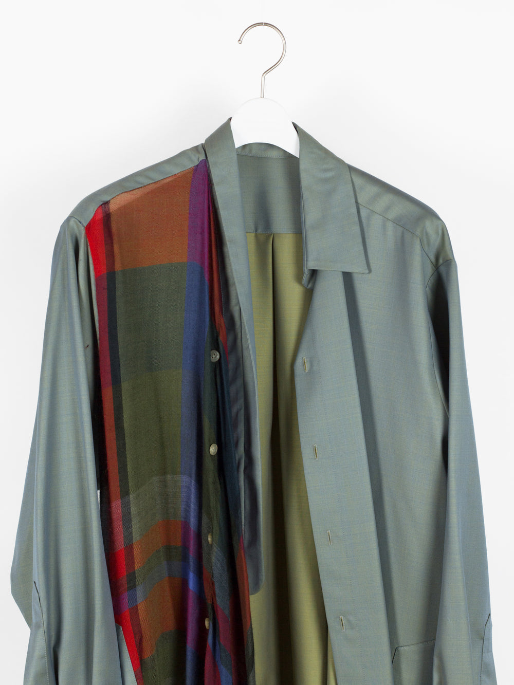 This hybrid scarf-shirt-dress is cut in a robust virgin wool that mixes blue and yellow yarns. The slight sheen and iridescence of contrasting yarns means the color and texture are dynamic and constantly shifting while in motion. An elongated semi-sheer cashmere scarf is inserted in place of the right front panel with multiple ways of fastening, allowing for expressive styling by the wearer. The scarf is sewn into an extended band collar at the top that can be buttoned to two interior loops at the sides of the neck or the center buttonhole of the left side collar. The bottom is left fringed. Unisex, versatile, and expressive, this shirtdress/tunic can easily be worn layered over or under other garments as a visual accent.