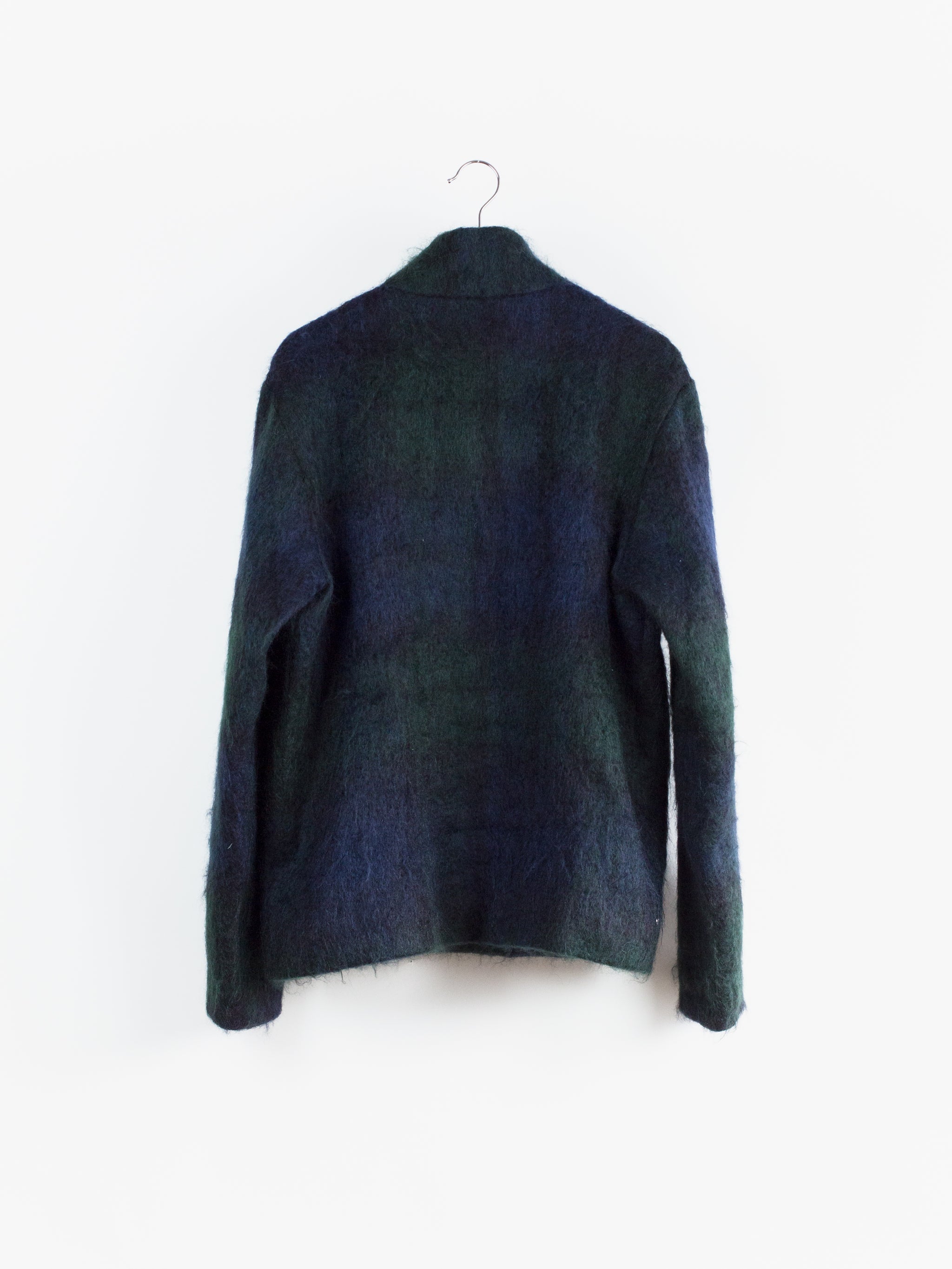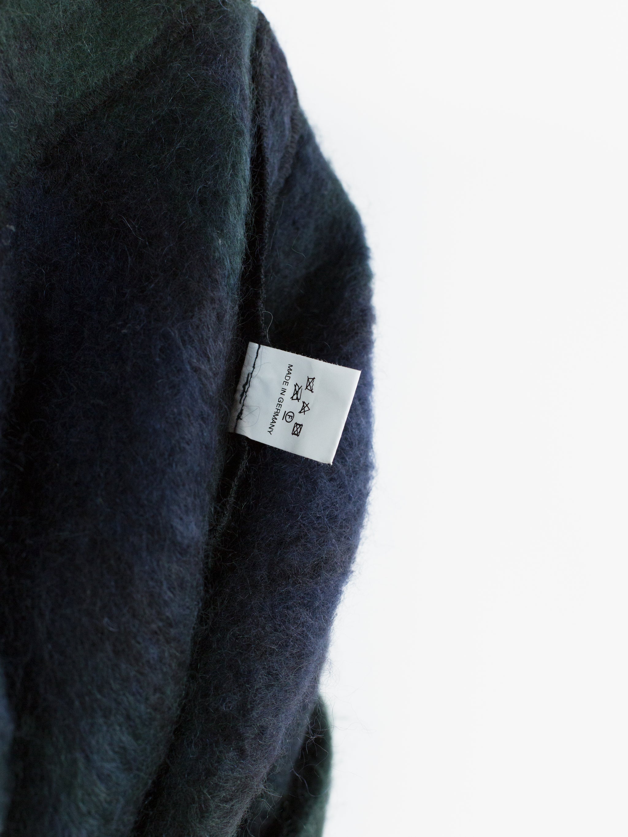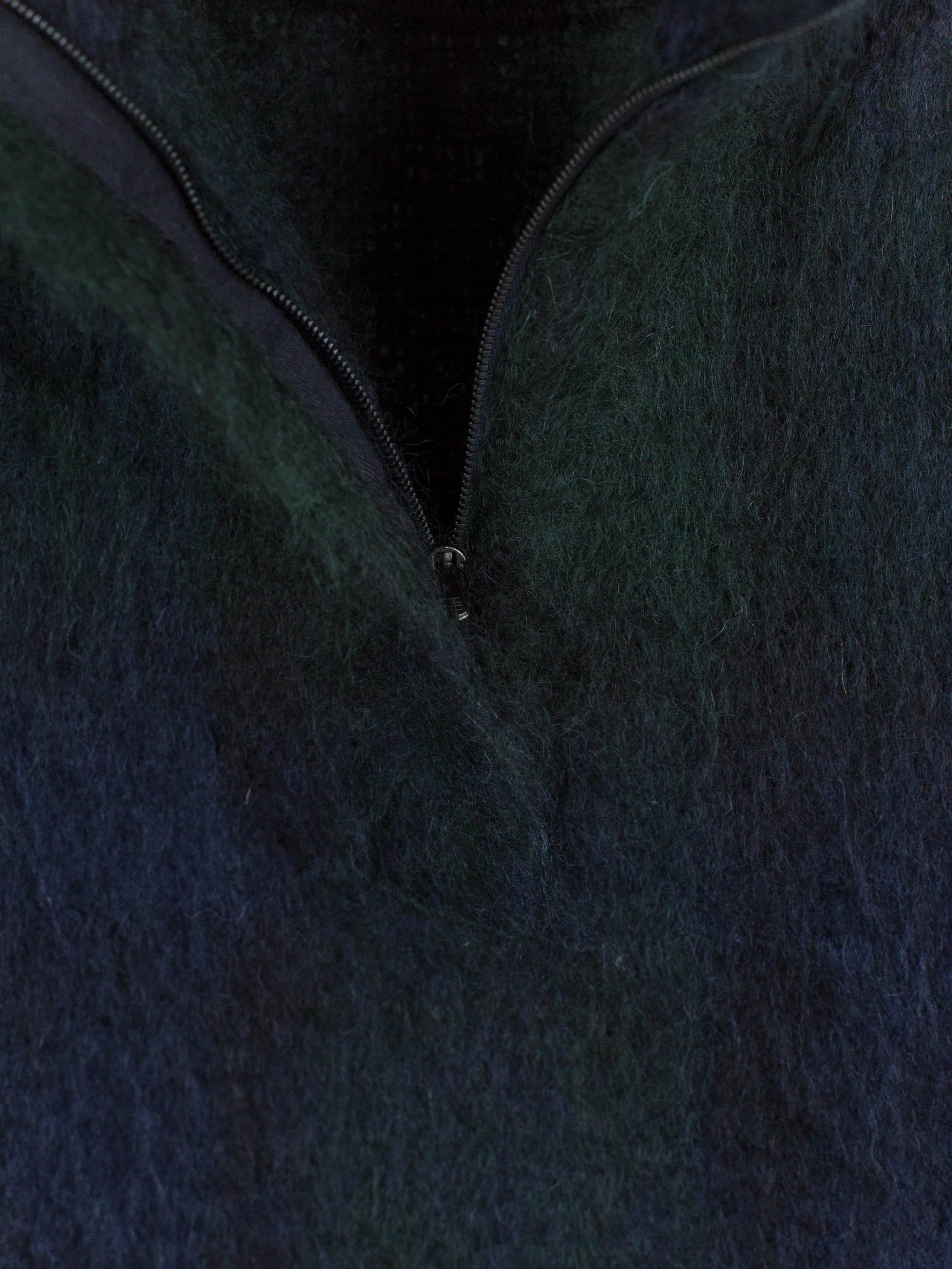 Quarter-zip pullover jacket cut from luxurious mohair with a subtle blackwatch blue-green check that's obfuscated and blurred by the bloom of the yarn. The set in shoulders, plain hem, and stand collar give what would usually be a sweater the shape and feel of a true piece of outerwear. The piece highlights Bless's expertise when it comes to knitwear and their playfulness when it comes to hybrid design. Wear it as outerwear or as a midlayer, either way it'll provide a welcome injection of subdued color and textural interest.