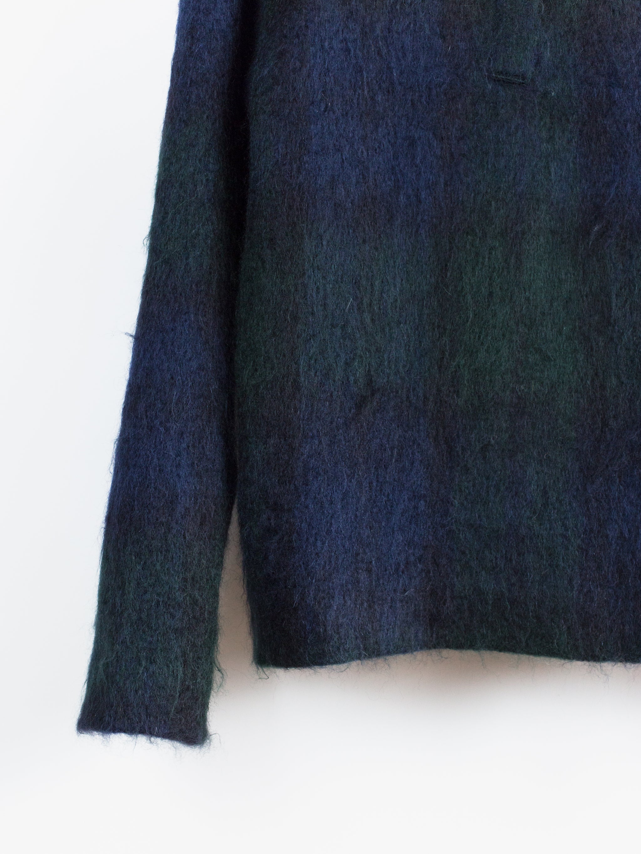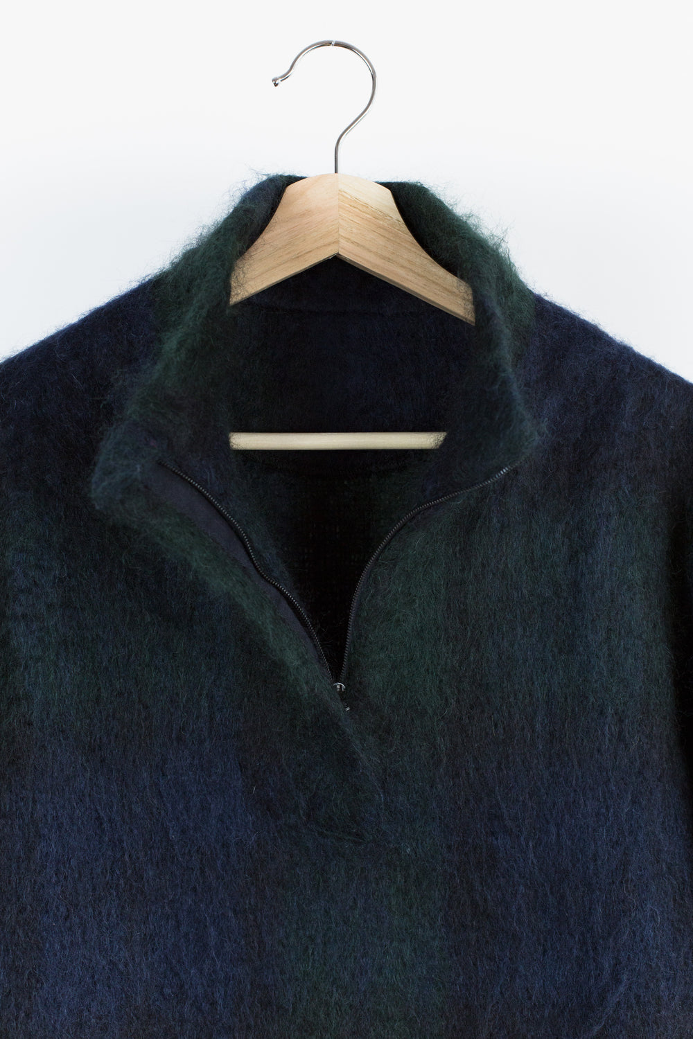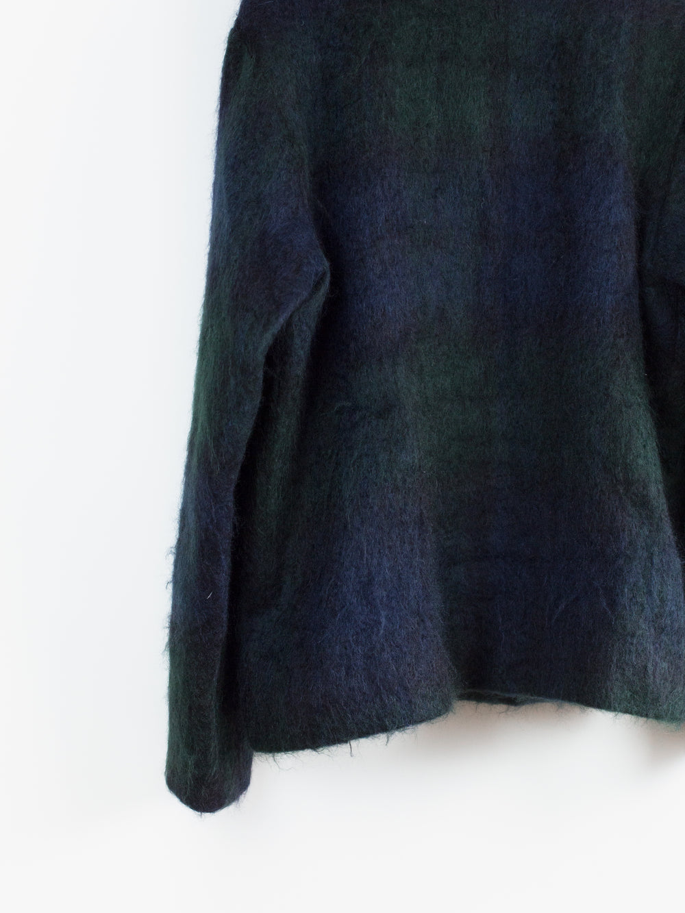 Quarter-zip pullover jacket cut from luxurious mohair with a subtle blackwatch blue-green check that's obfuscated and blurred by the bloom of the yarn. The set in shoulders, plain hem, and stand collar give what would usually be a sweater the shape and feel of a true piece of outerwear. The piece highlights Bless's expertise when it comes to knitwear and their playfulness when it comes to hybrid design. Wear it as outerwear or as a midlayer, either way it'll provide a welcome injection of subdued color and textural interest.