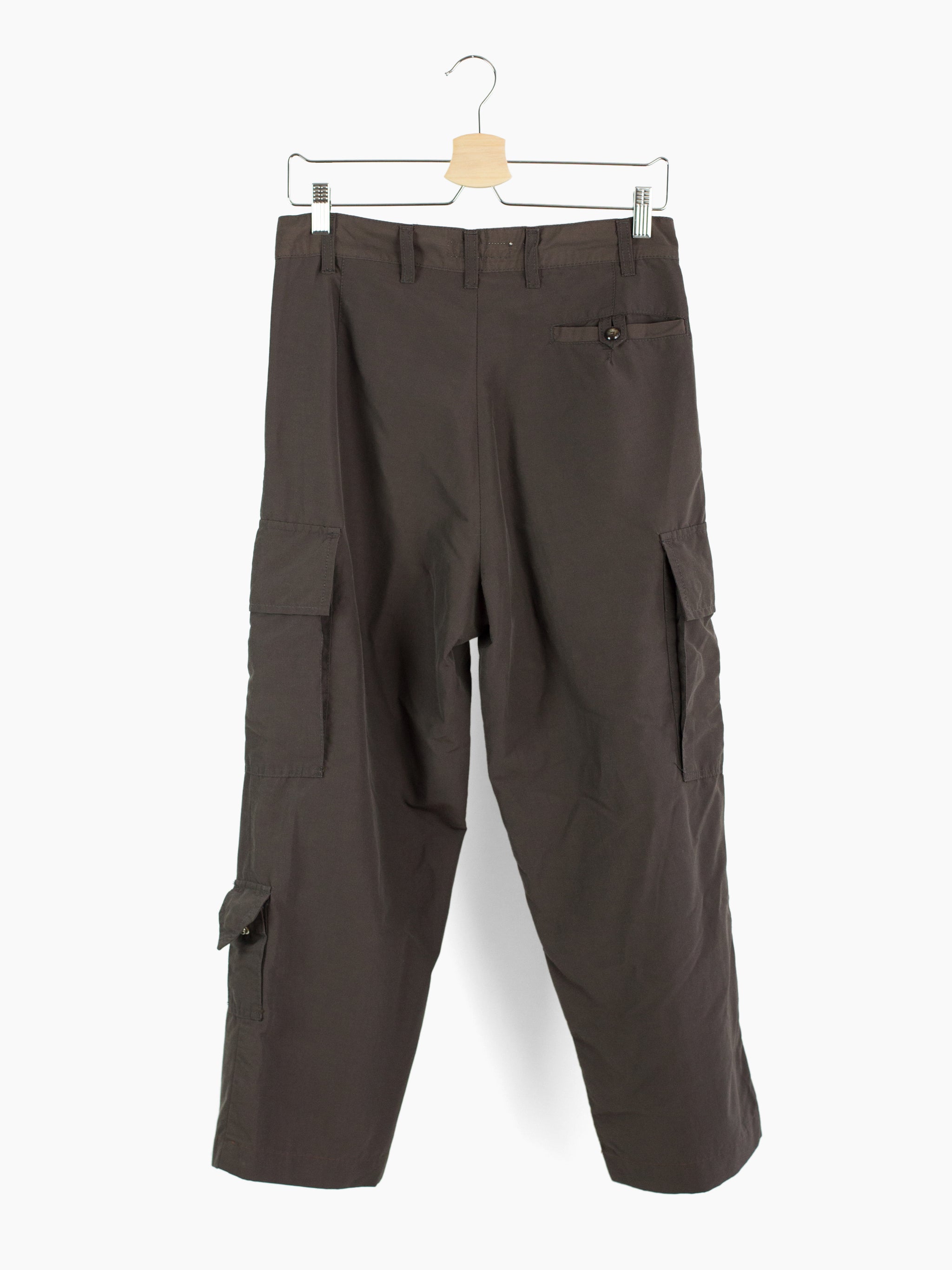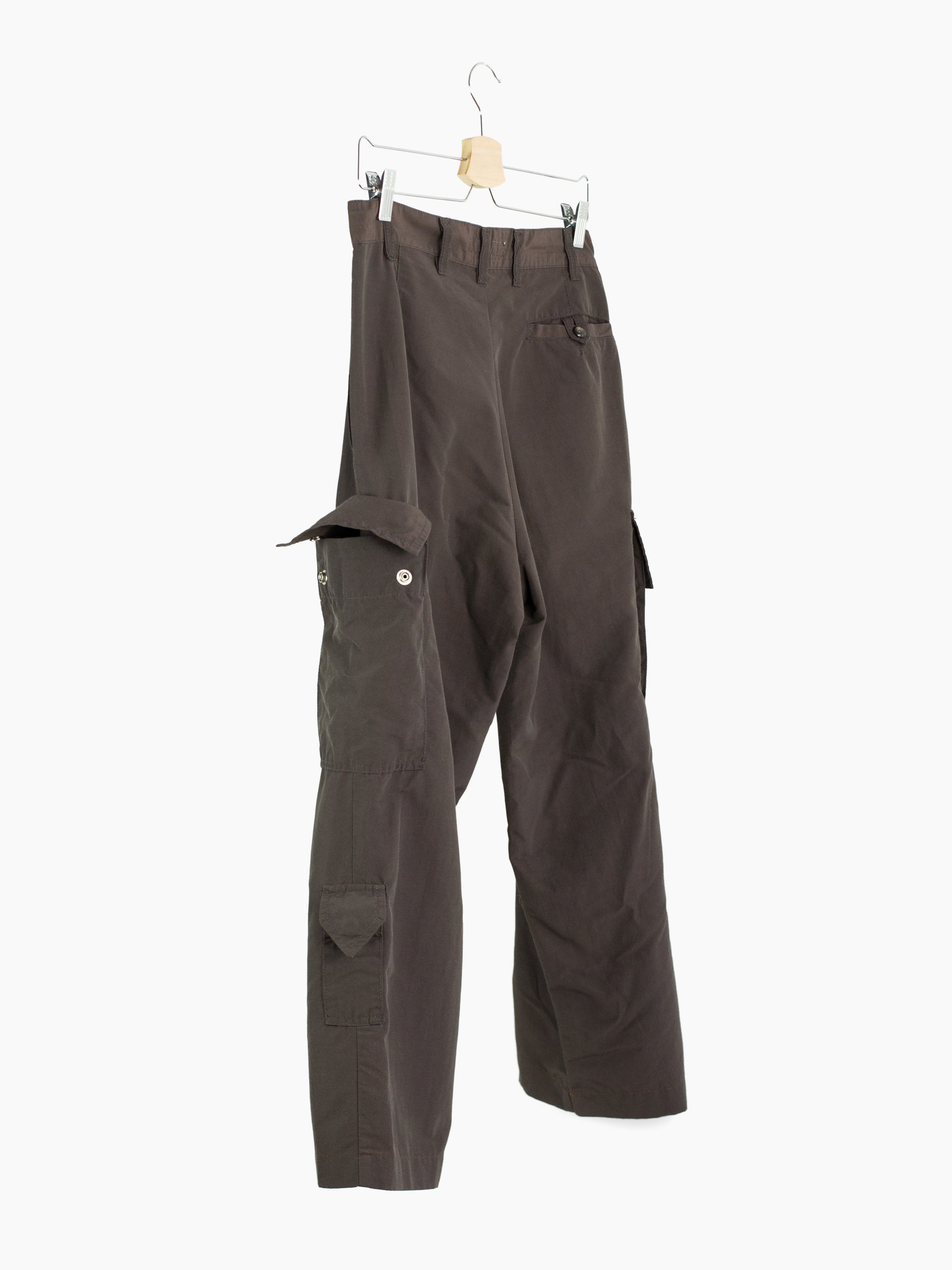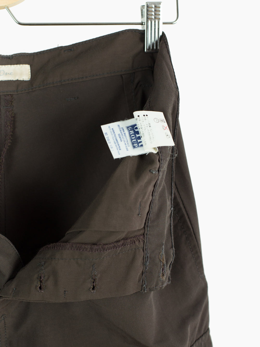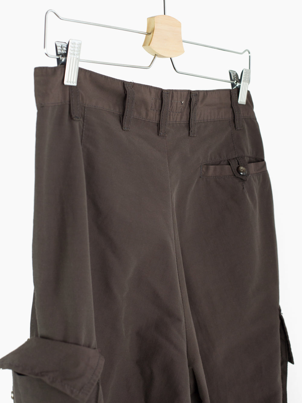 90s Trousers from Italian brand 'Blue One,' produced at the same GTR factories as 90s/00s Helmut Lang. Not surprisingly, they carry the same air of minimalist elegance. This pair is cut in a 70% Polyester 30% cotton blend technical plainweave in an earthy sepia brown. It features two spacious snap-closed cargo pockets on the thigh and a single mini cartridge pocket at wearer's left calf. Two slash waist pockets are set right on the outseam, and a single drop coin pocket right below the waistband. In lieu of pleats are a unique set of front darts that achieve the same effect but with more visual precision.