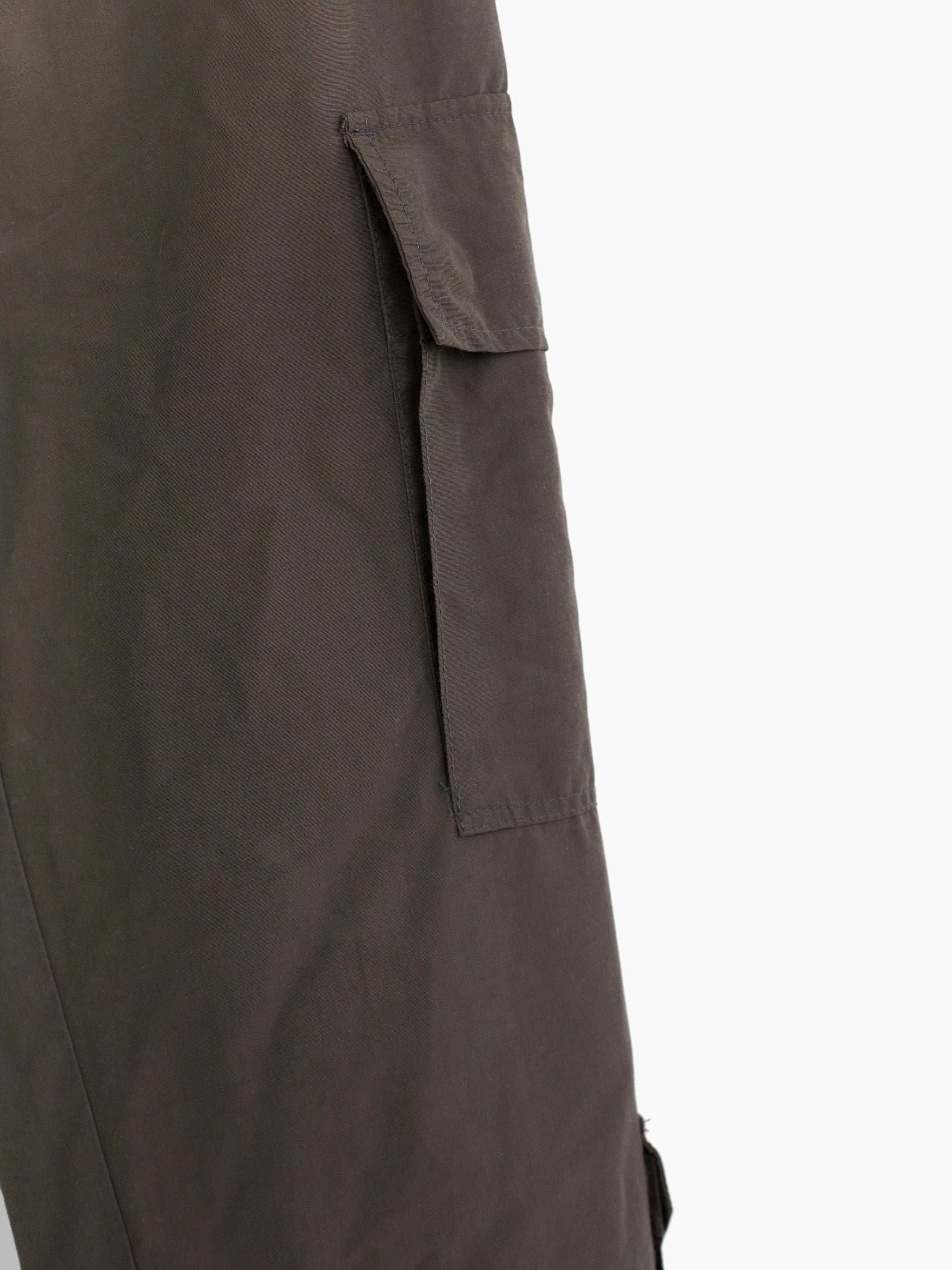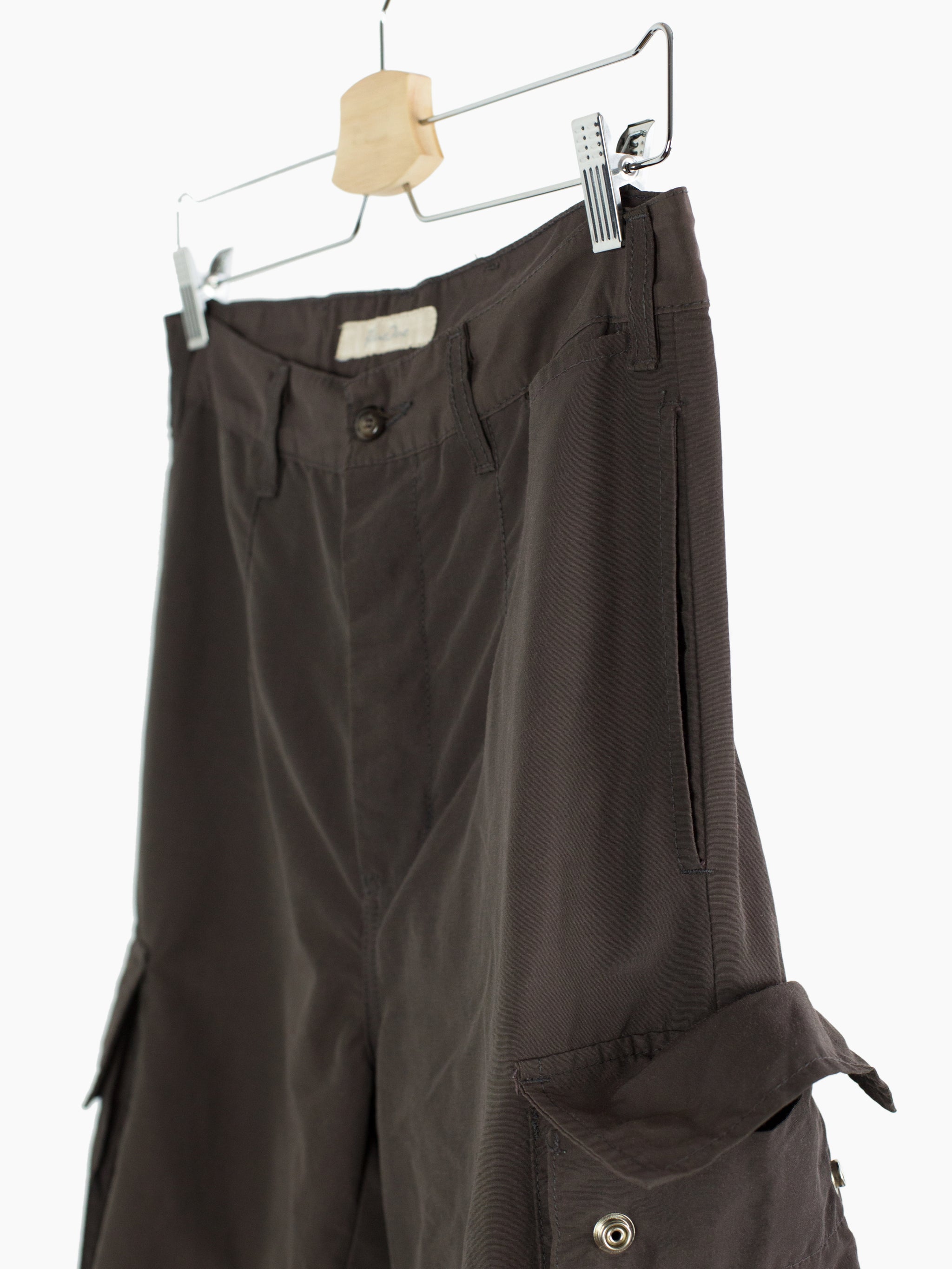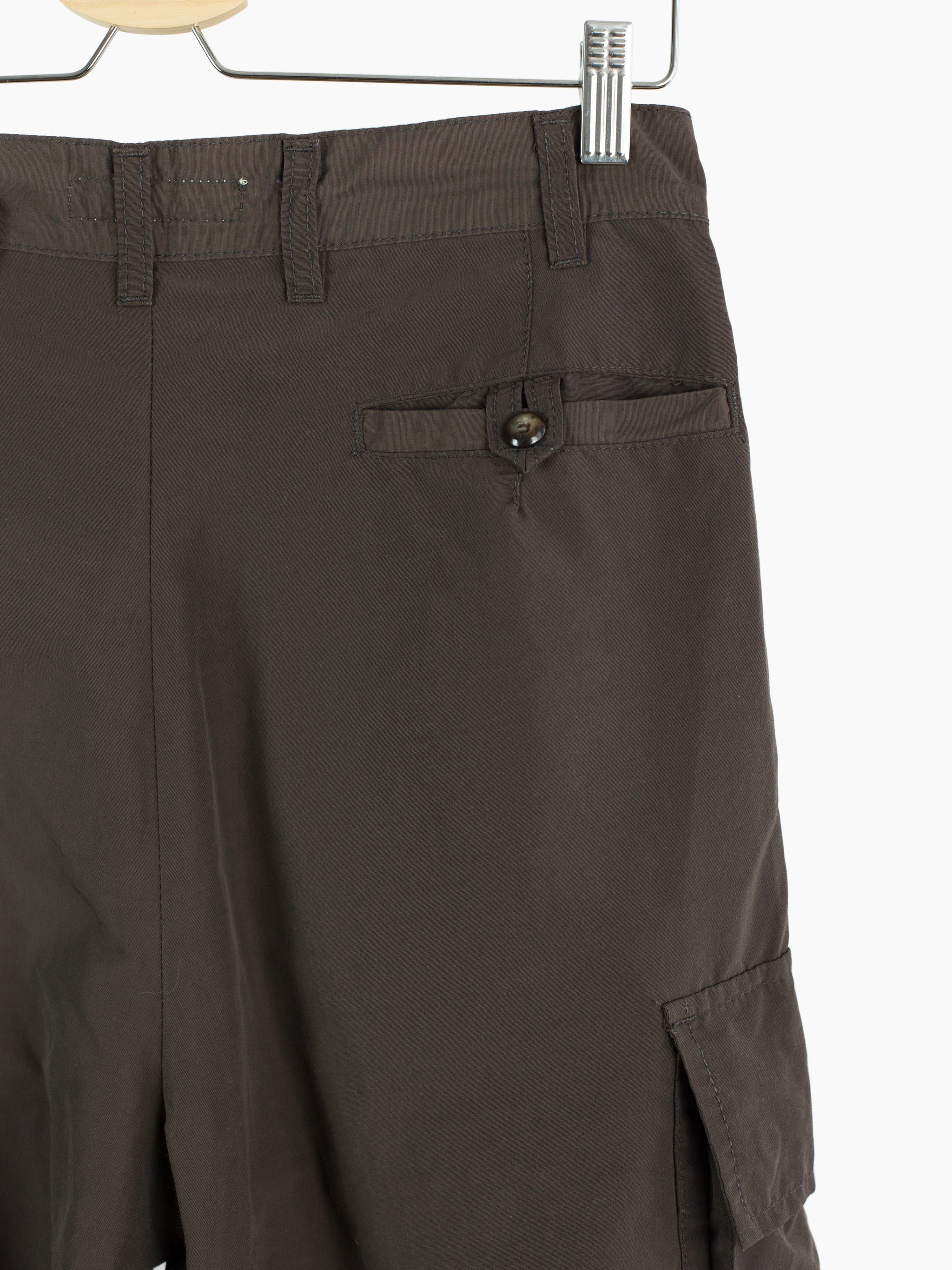 90s Trousers from Italian brand 'Blue One,' produced at the same GTR factories as 90s/00s Helmut Lang. Not surprisingly, they carry the same air of minimalist elegance. This pair is cut in a 70% Polyester 30% cotton blend technical plainweave in an earthy sepia brown. It features two spacious snap-closed cargo pockets on the thigh and a single mini cartridge pocket at wearer's left calf. Two slash waist pockets are set right on the outseam, and a single drop coin pocket right below the waistband. In lieu of pleats are a unique set of front darts that achieve the same effect but with more visual precision.