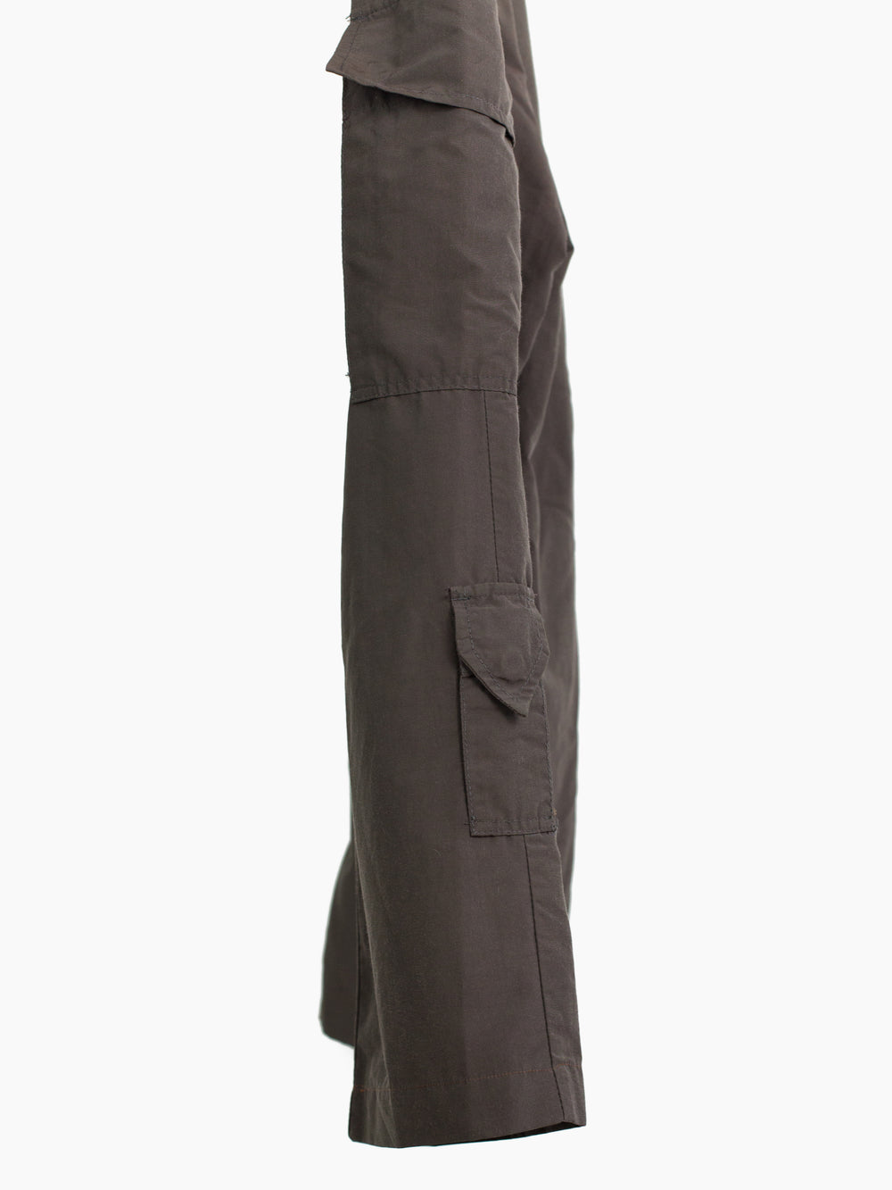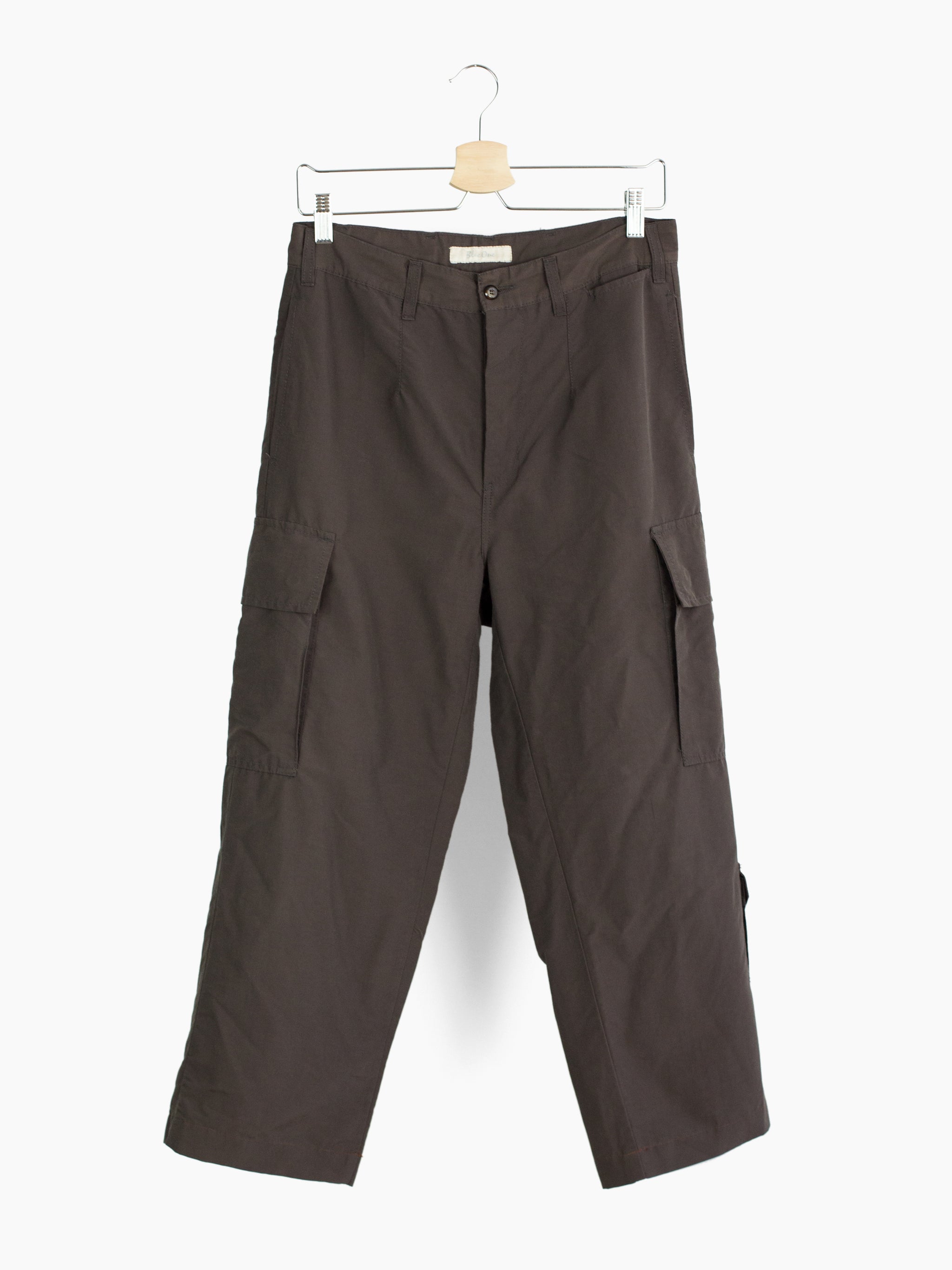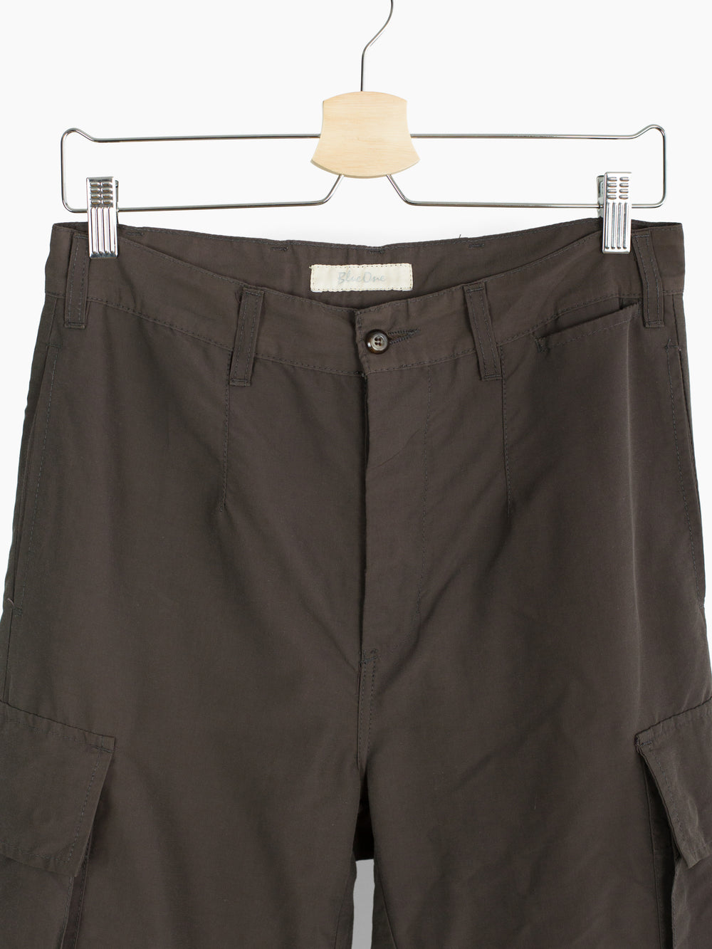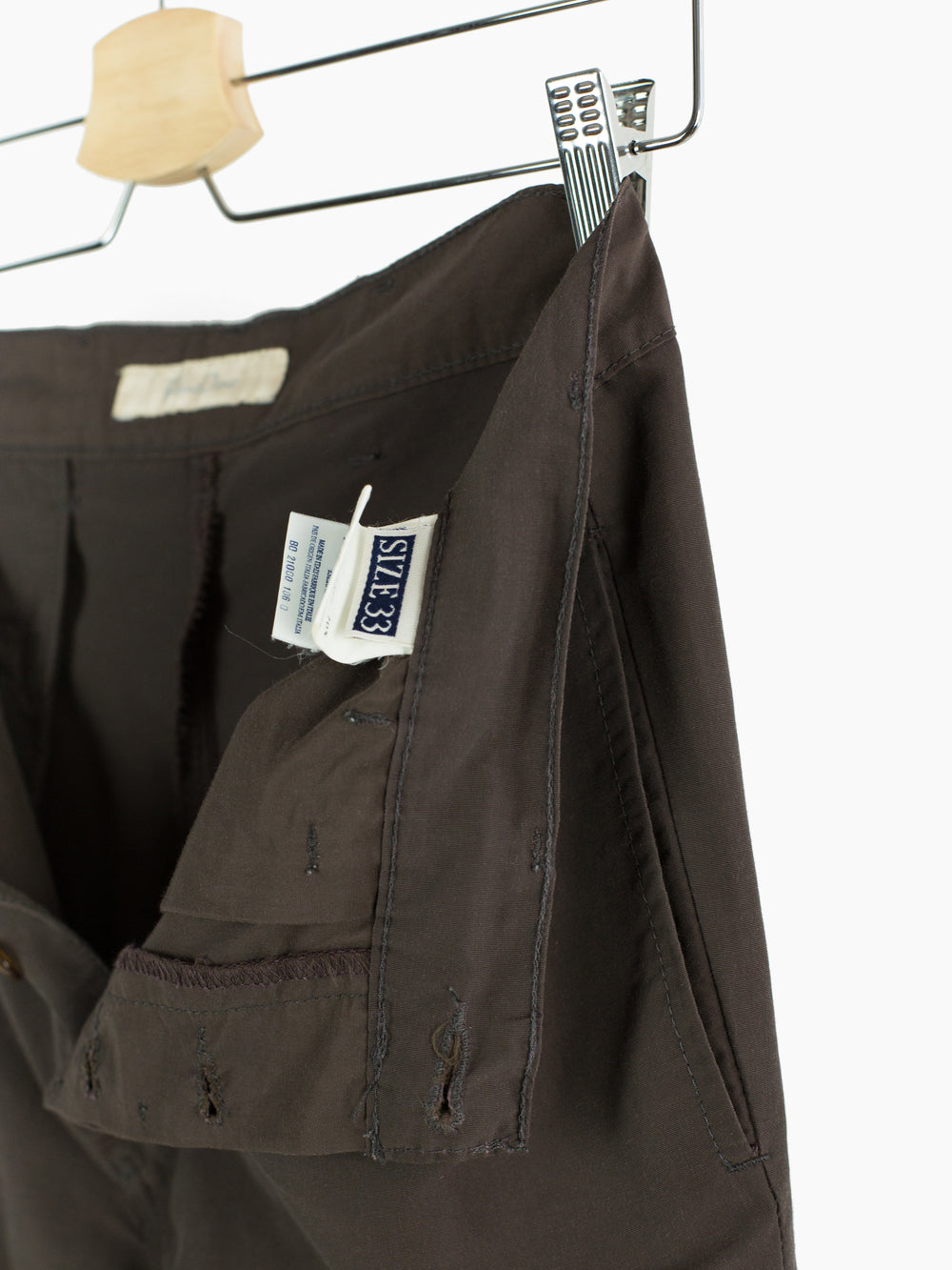 90s Trousers from Italian brand 'Blue One,' produced at the same GTR factories as 90s/00s Helmut Lang. Not surprisingly, they carry the same air of minimalist elegance. This pair is cut in a 70% Polyester 30% cotton blend technical plainweave in an earthy sepia brown. It features two spacious snap-closed cargo pockets on the thigh and a single mini cartridge pocket at wearer's left calf. Two slash waist pockets are set right on the outseam, and a single drop coin pocket right below the waistband. In lieu of pleats are a unique set of front darts that achieve the same effect but with more visual precision.