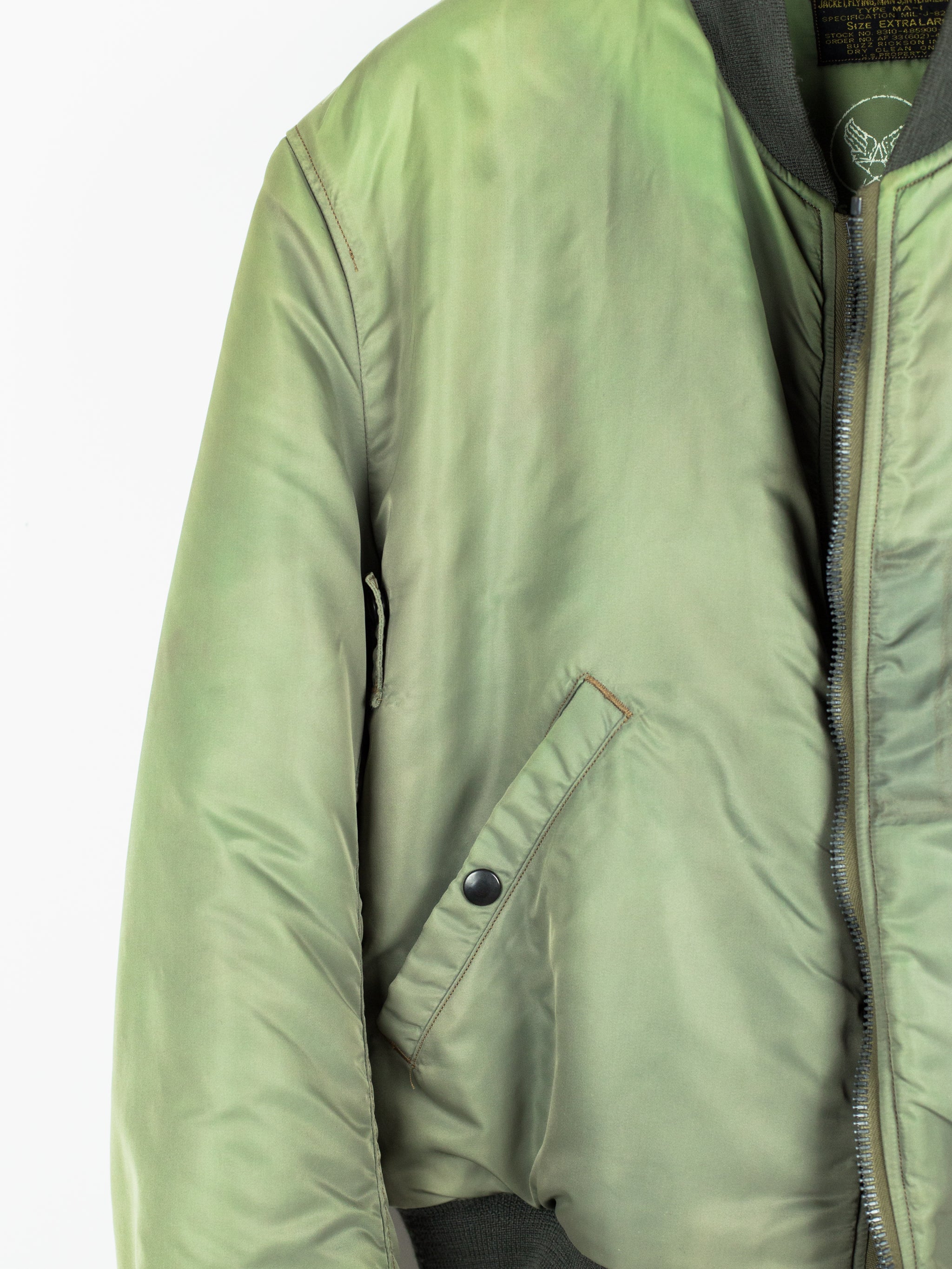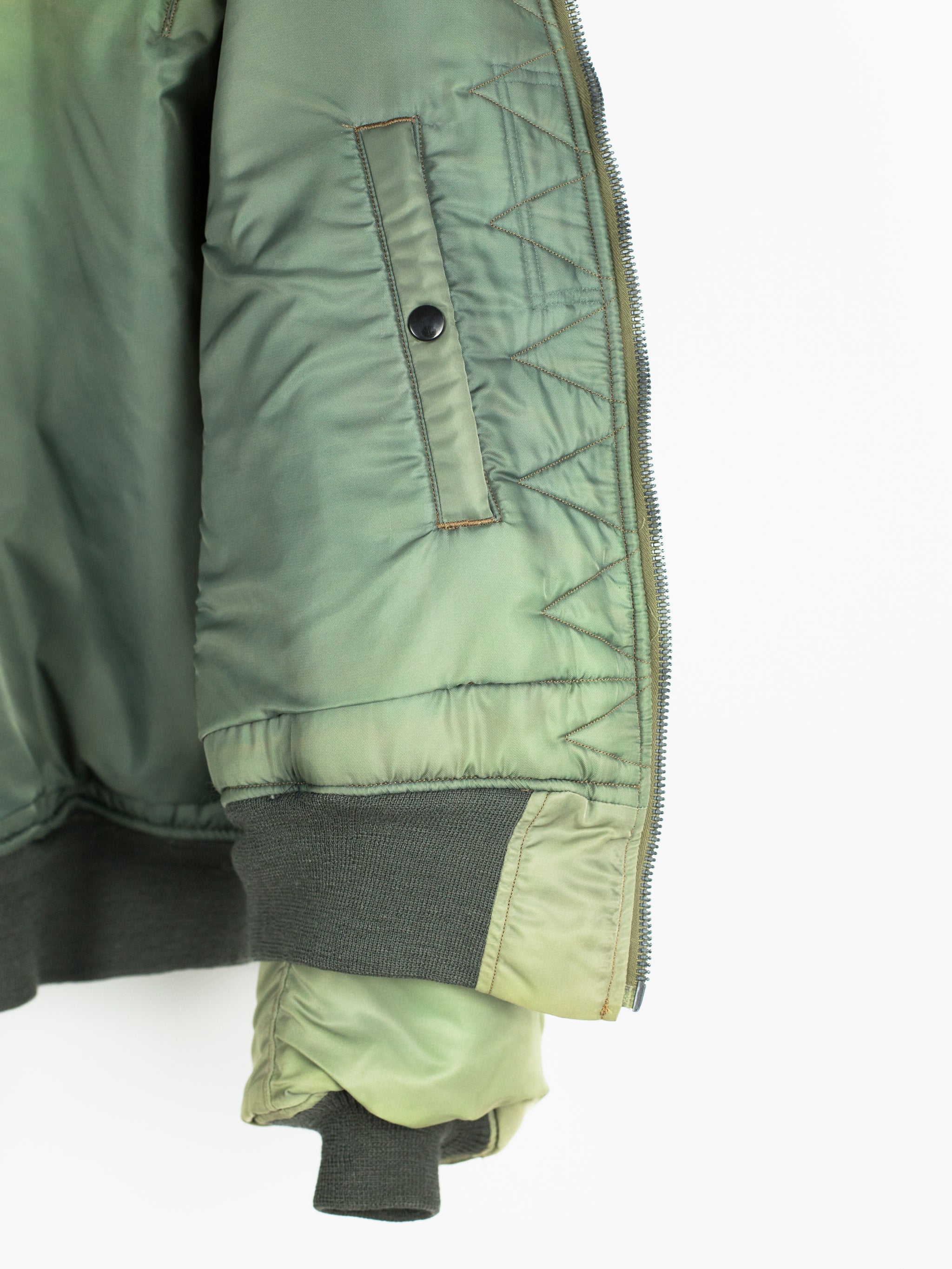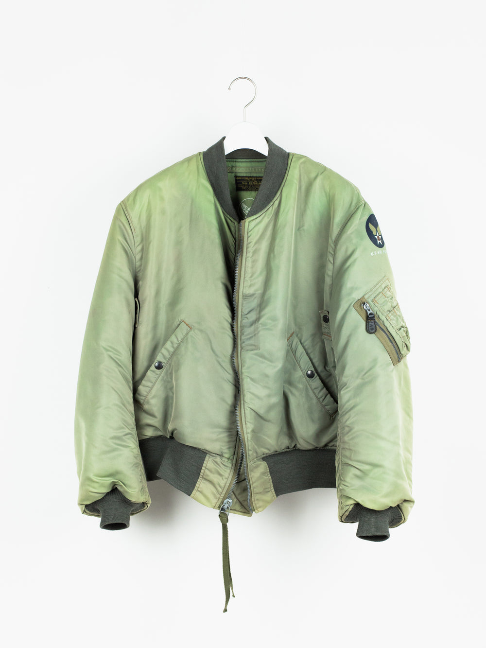 The iconic Ma-1 from Buzz Rickson's, a Japanese brand founded in 1994 whose focus is stitch-by-stitch reproductions of vintage military garments. Everything from the fabric (heavy nylon twill that is woven on vintage looms) to the zipper tape (100% Cotton Herringbone Twill) is faithfully recreated following the USAF specifications of the Modified B15-D ('First pattern' Ma-1) flight jackets. A marked difference between these earlier Ma-1's is the thick, dense, wool/cotton blend insulation used which gives the jacket a significant amount of heft and structure. Compared to later polyester insulated bombers, the shoulder shape on these is more pronounced. This particular Buzz Rickson's Ma-1 was produced in the 90s when the brand was still only serving the Japanese market, evidenced by the 'M' prefix code number on the tag--as a result of its age, it has developed a beautiful sun-faded patina.