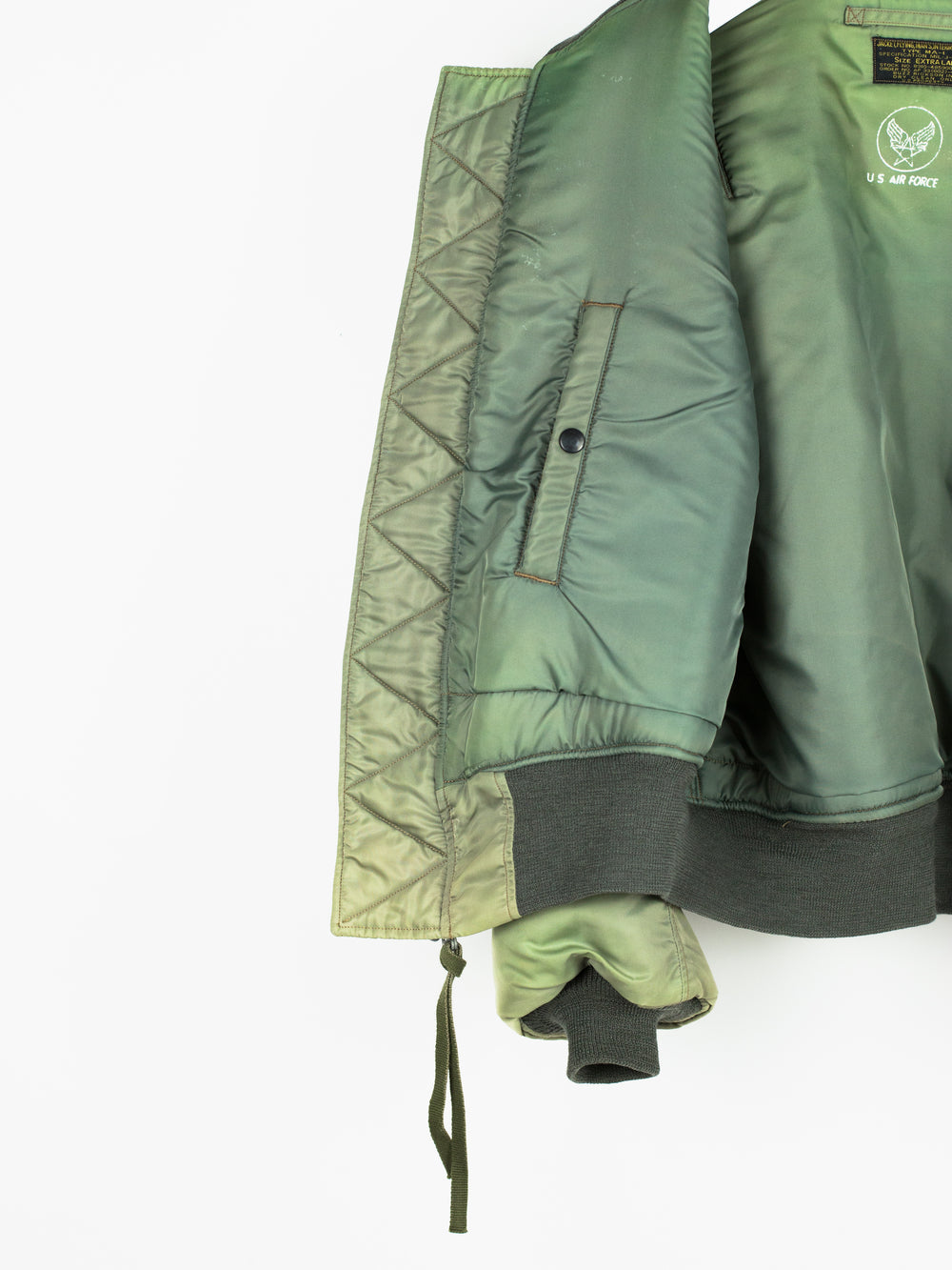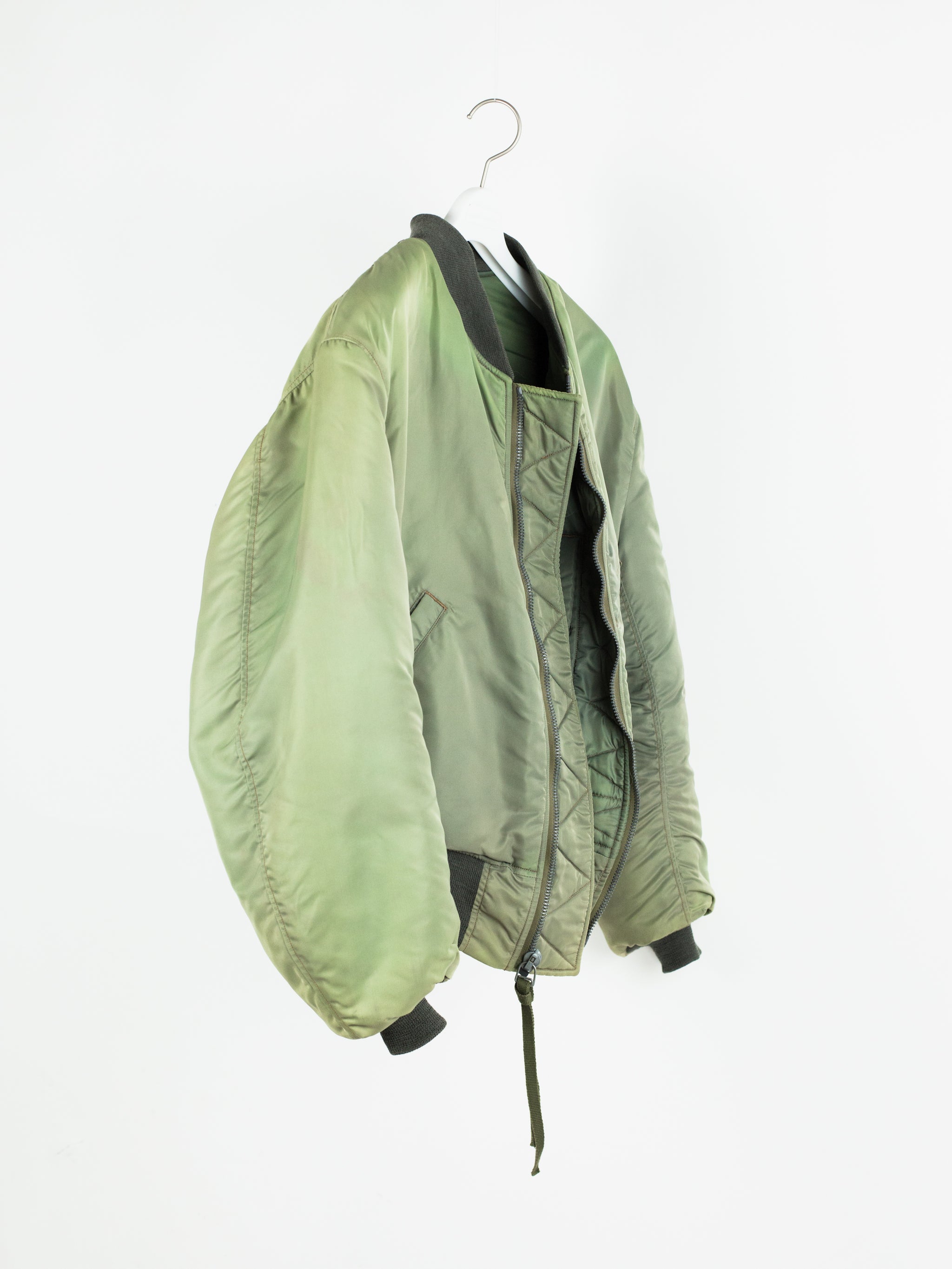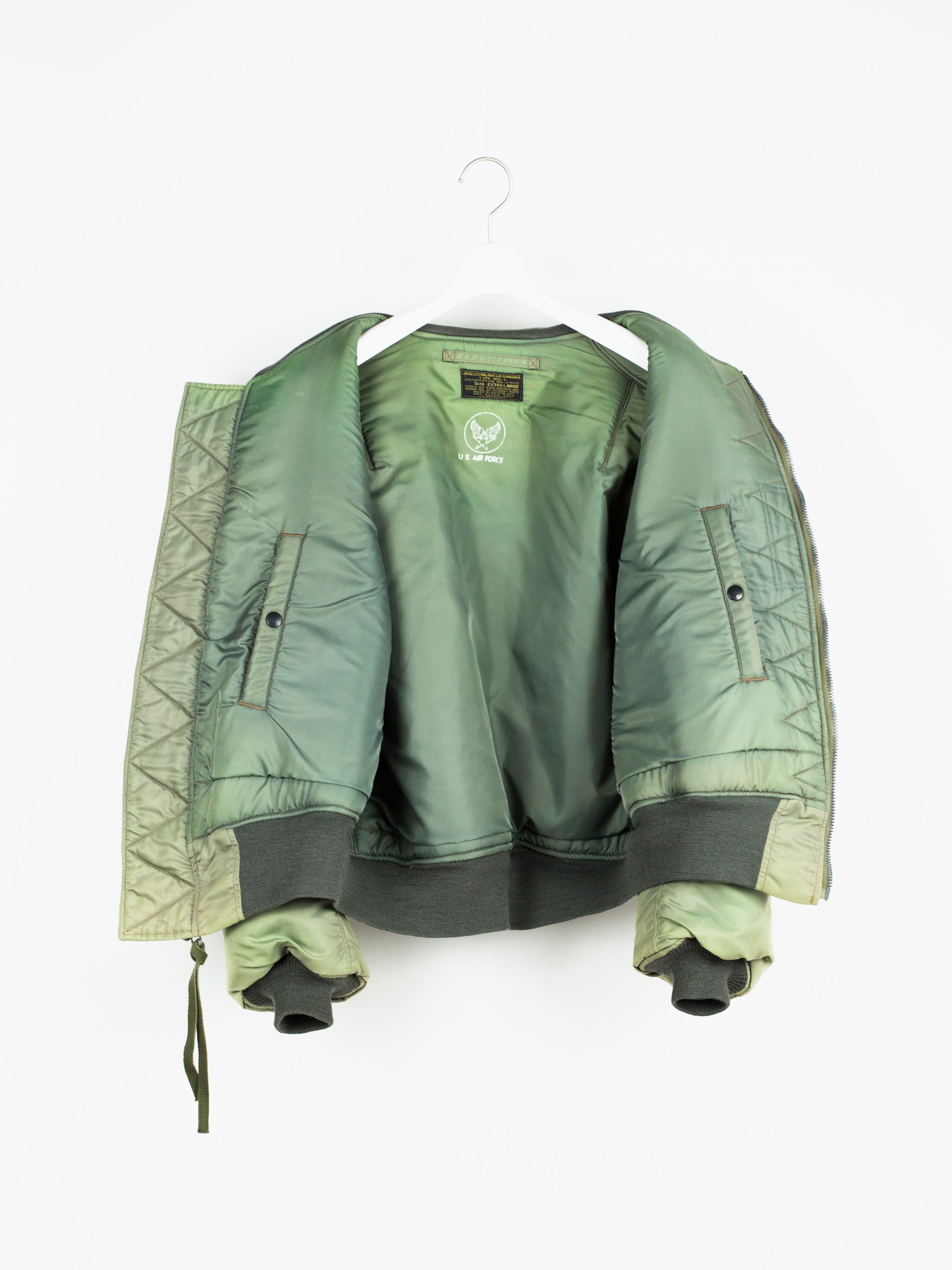 The iconic Ma-1 from Buzz Rickson's, a Japanese brand founded in 1994 whose focus is stitch-by-stitch reproductions of vintage military garments. Everything from the fabric (heavy nylon twill that is woven on vintage looms) to the zipper tape (100% Cotton Herringbone Twill) is faithfully recreated following the USAF specifications of the Modified B15-D ('First pattern' Ma-1) flight jackets. A marked difference between these earlier Ma-1's is the thick, dense, wool/cotton blend insulation used which gives the jacket a significant amount of heft and structure. Compared to later polyester insulated bombers, the shoulder shape on these is more pronounced. This particular Buzz Rickson's Ma-1 was produced in the 90s when the brand was still only serving the Japanese market, evidenced by the 'M' prefix code number on the tag--as a result of its age, it has developed a beautiful sun-faded patina.