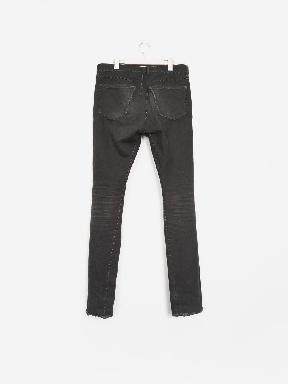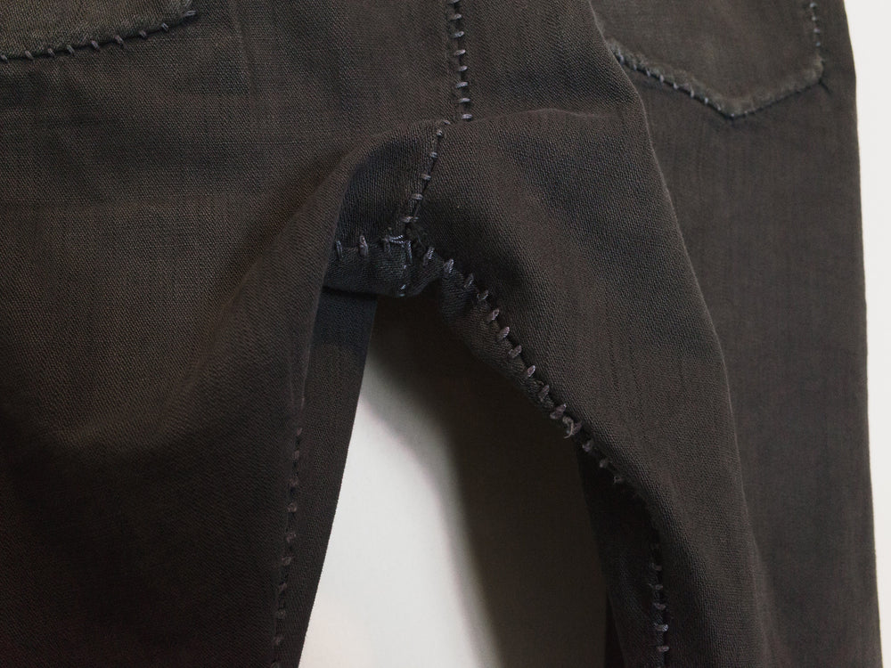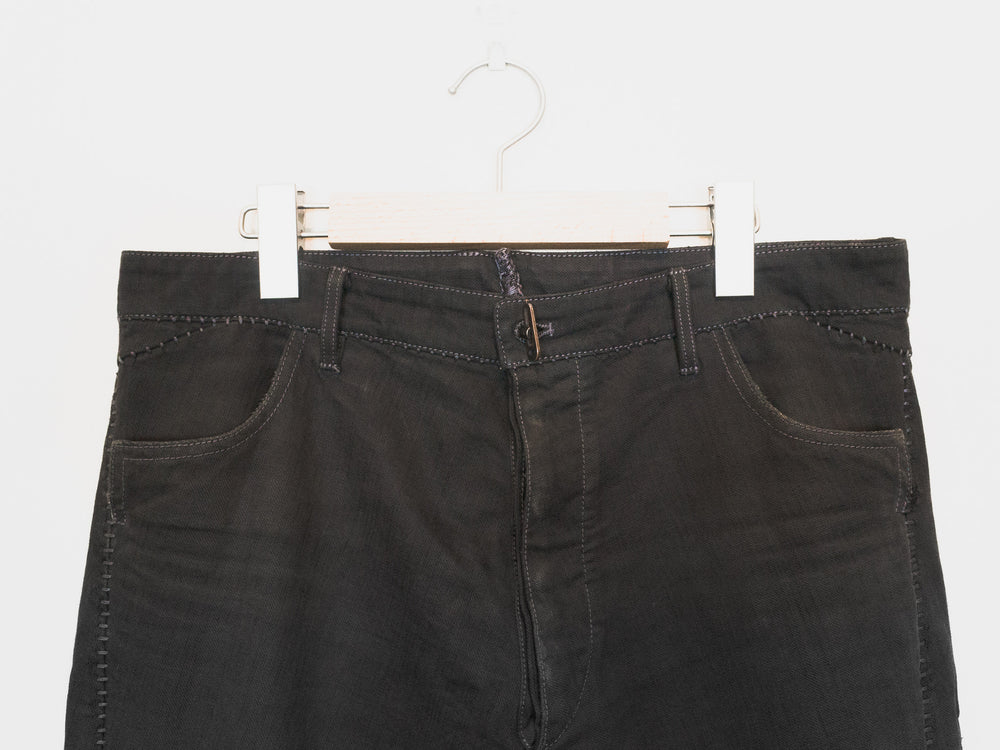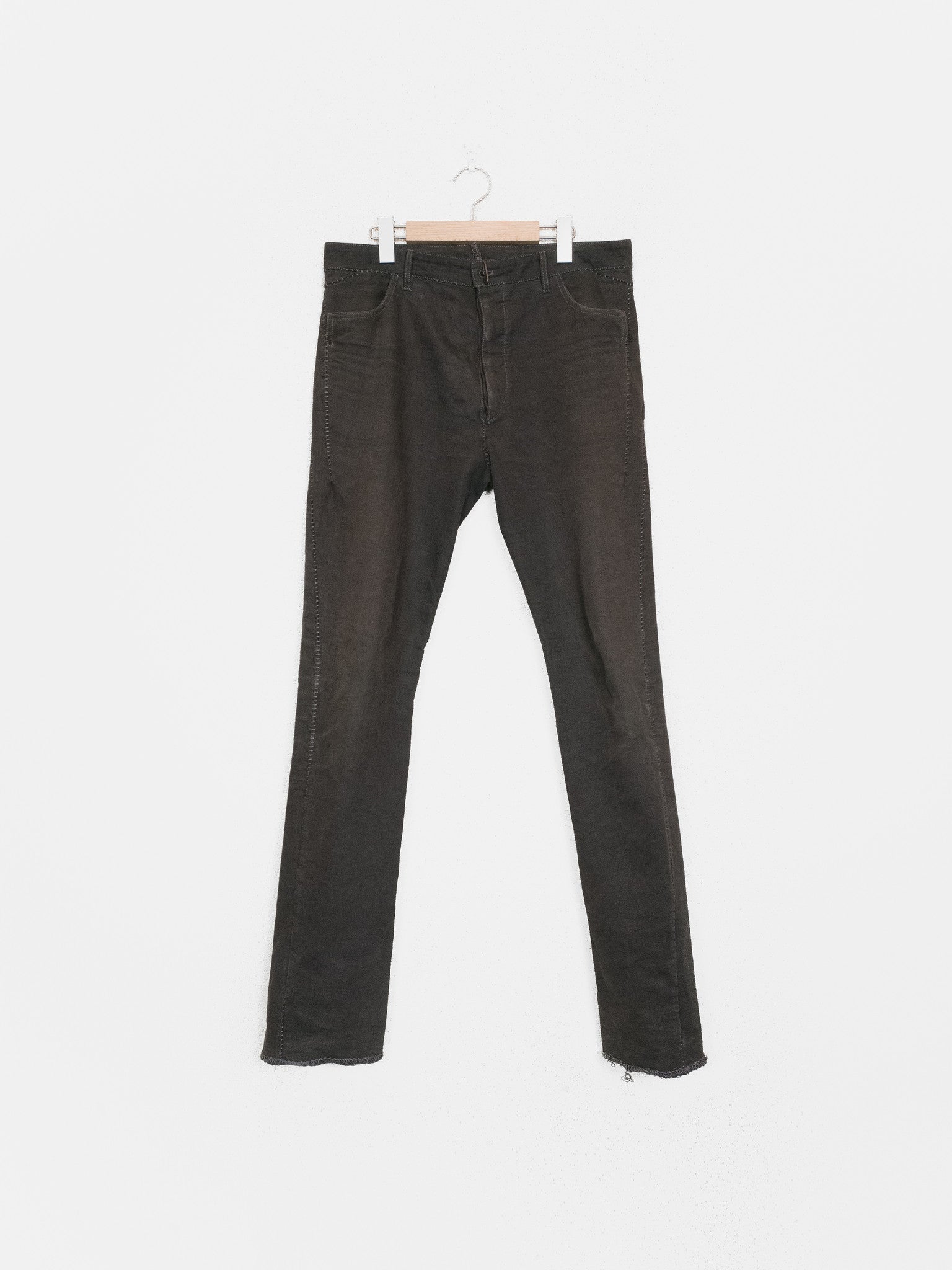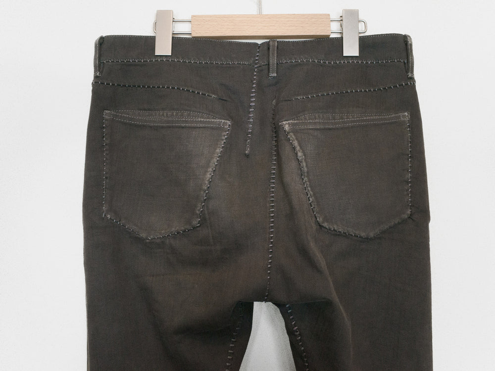 A staple pair of jeans from Carol Christian Poell's 2010 'MALE' collection featuring the elaborate 'dead-end' construction that splits the seams apart where in a conventional garment they would run straight. The result is a puzzling and compelling visual detail of the staggered seaming. Unraveling the connections in thought, one can imagine the artistry in how the pants were cut--one full piece that has been contorted and attached to itself to miraculously result in the conventional form we call 'jeans.' This pair is made from KIT-R, a dry sturdy cotton with an intricate weave, in a dirty brown color that pairs well with black, earth tones, and other distressed/overdyed colors and textures. Features overlock/suture stitching that is a tone darker than the fabric, a button-fly with a locking hinge-key-style top closure, levitating entry J-pockets, and overlock-finished hems.