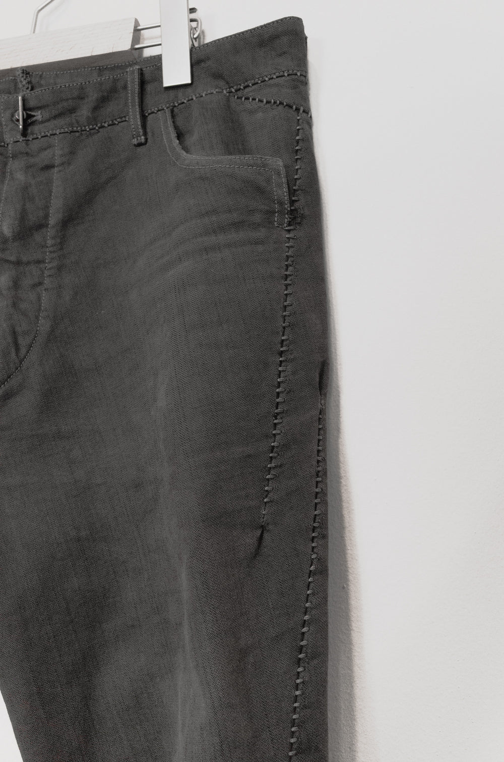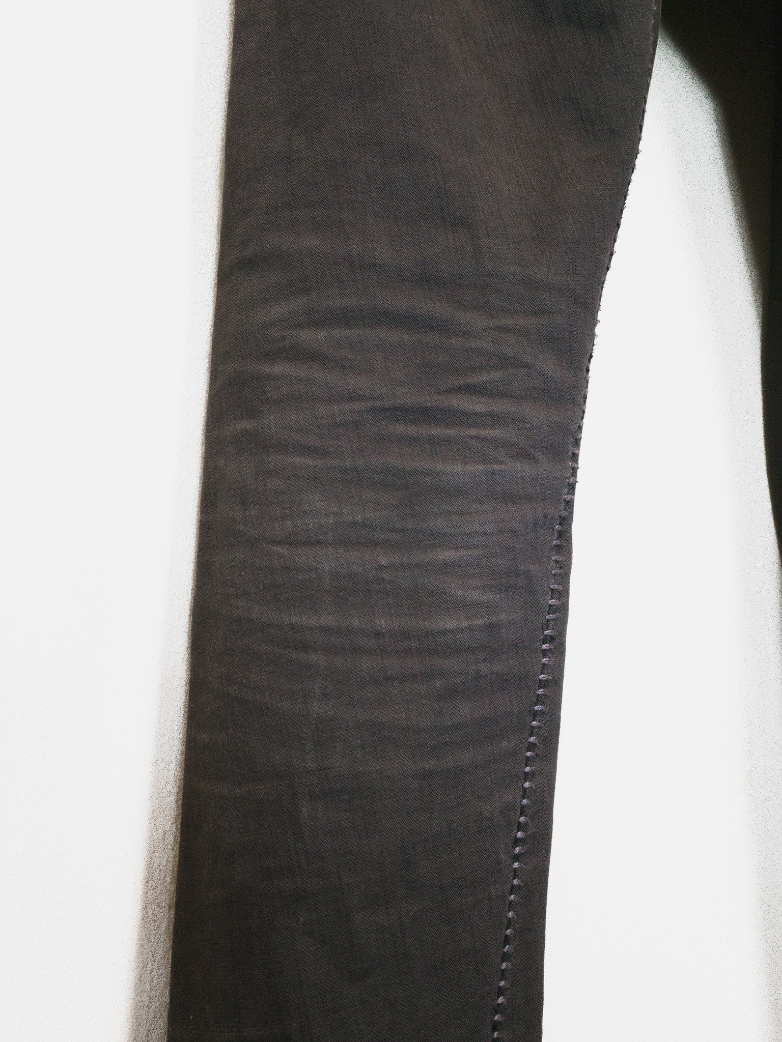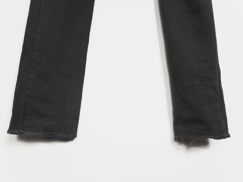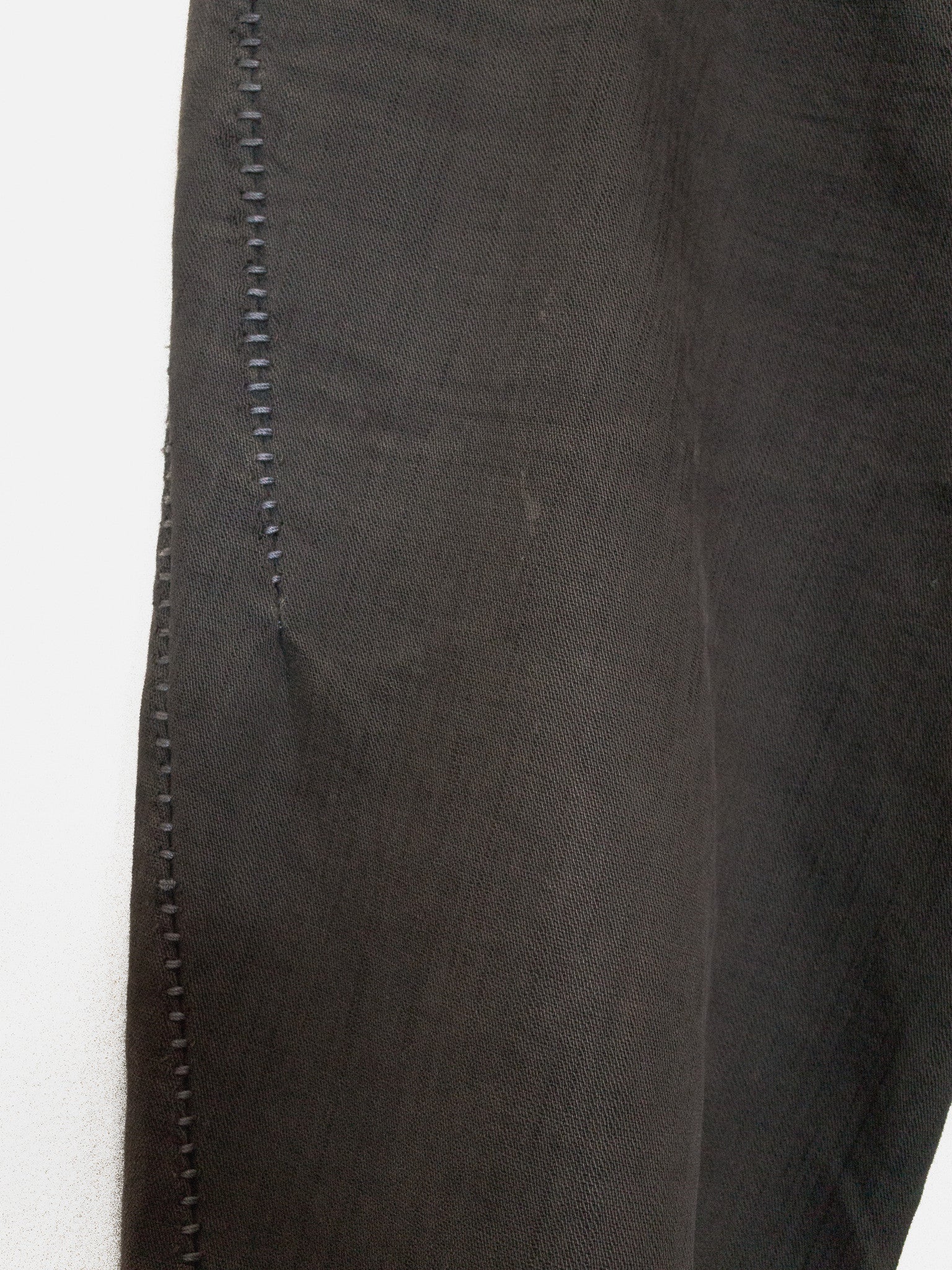 A staple pair of jeans from Carol Christian Poell's 2010 'MALE' collection featuring the elaborate 'dead-end' construction that splits the seams apart where in a conventional garment they would run straight. The result is a puzzling and compelling visual detail of the staggered seaming. Unraveling the connections in thought, one can imagine the artistry in how the pants were cut--one full piece that has been contorted and attached to itself to miraculously result in the conventional form we call 'jeans.' This pair is made from KIT-R, a dry sturdy cotton with an intricate weave, in a dirty brown color that pairs well with black, earth tones, and other distressed/overdyed colors and textures. Features overlock/suture stitching that is a tone darker than the fabric, a button-fly with a locking hinge-key-style top closure, levitating entry J-pockets, and overlock-finished hems.