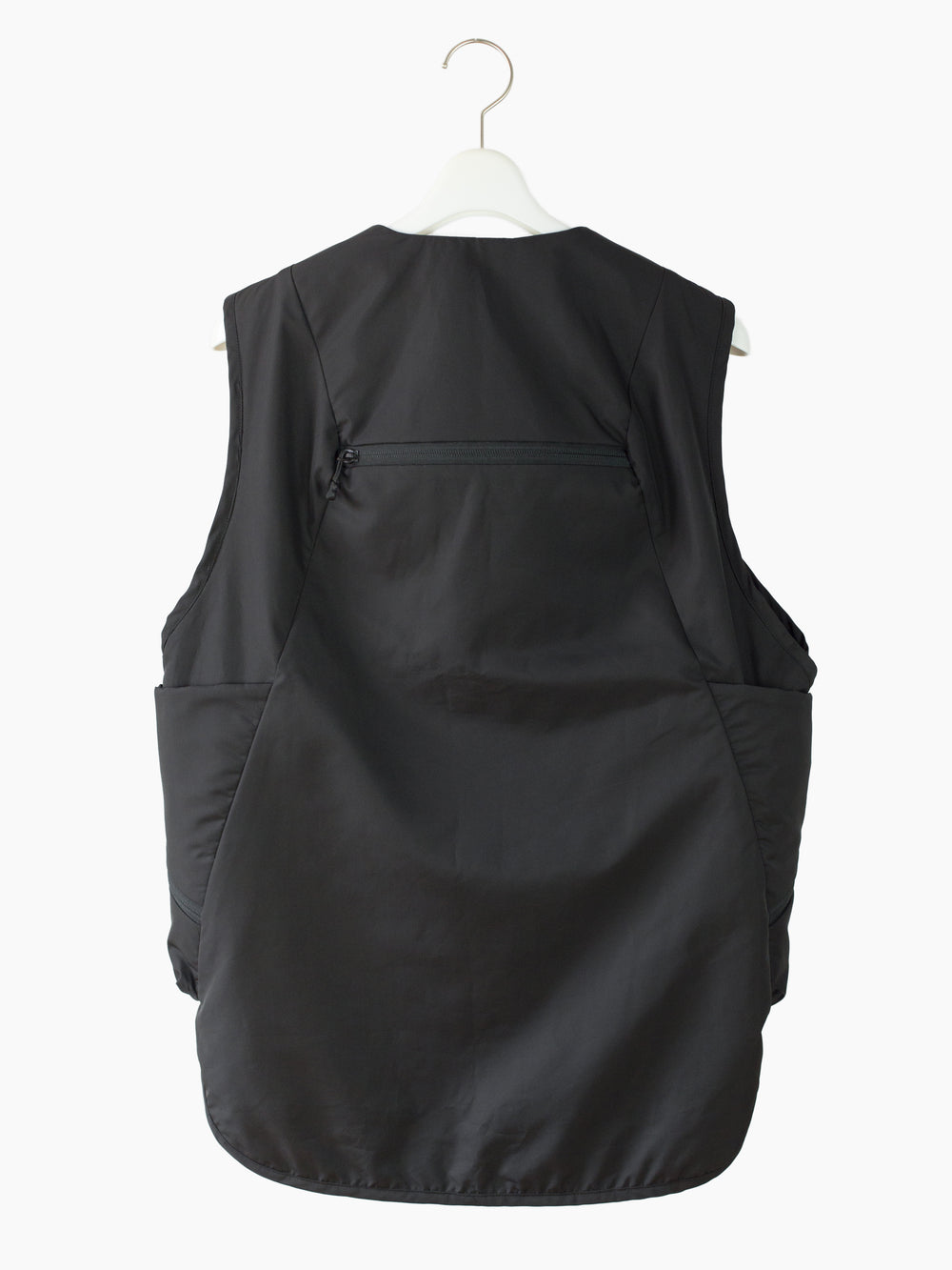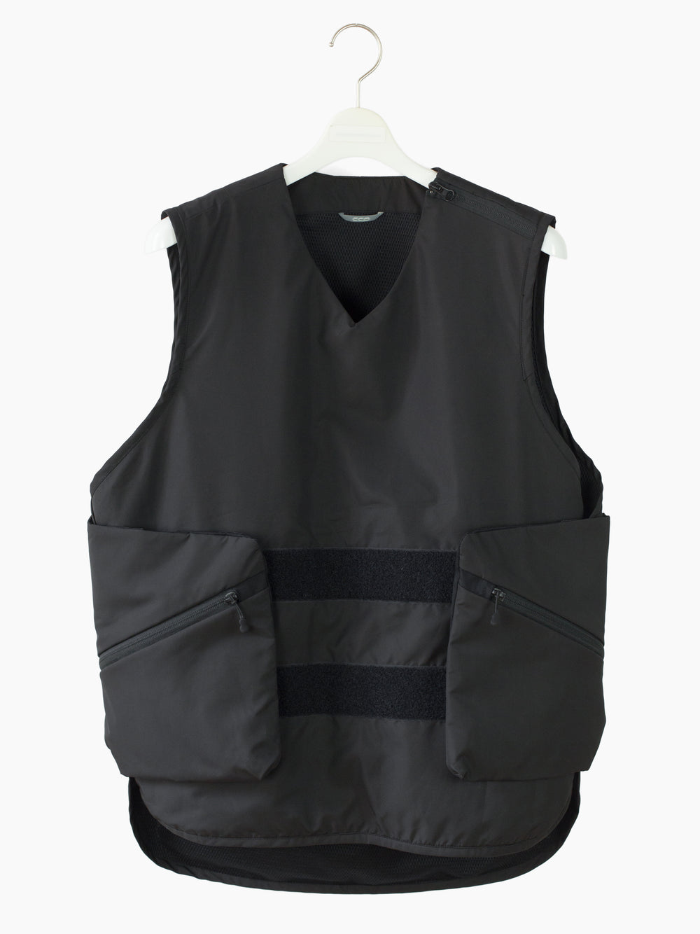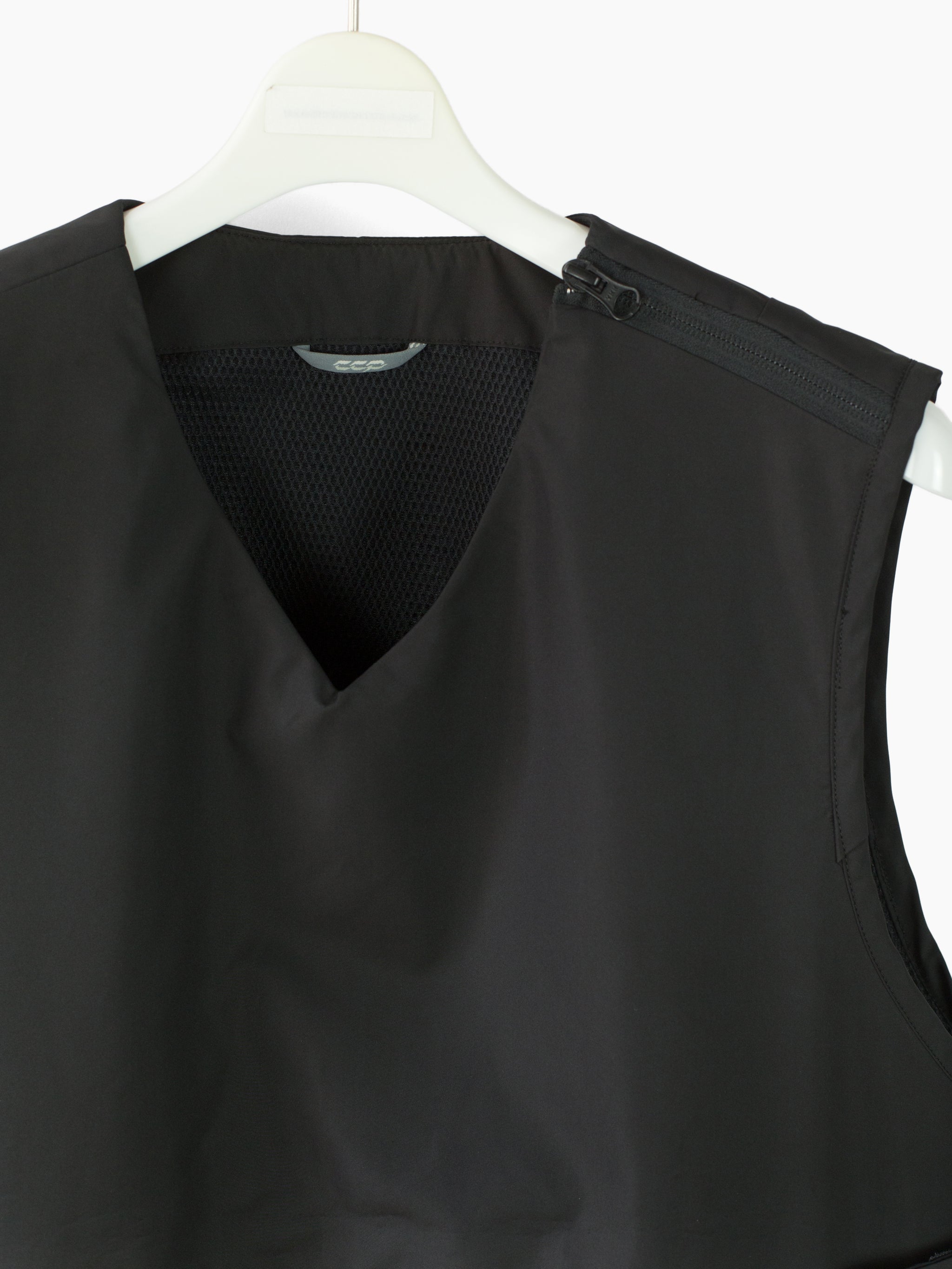 The whole vest is cut in a lightweight polyester face fabric with spacer mesh lining for comfort. Each side has four snaps to attach the back panel to the front, 'setting' the fit before each velcro holster pocket wraps over and attaches to the front. Finished with single aquaguard YKK zipper at wearer's left shoulder to open up the neckline. Dropped back hem and v neckline.