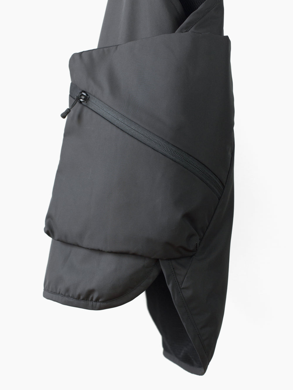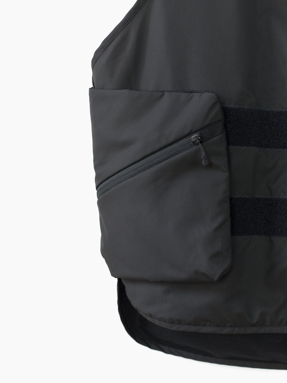 Cycling specialists CCP.FM's unique take on the oft-referenced bulletproof vest, with the original horizontally banded velcro front and open/adjustable sides. This one transforms the velcro side strap closure into large singular velcro pockets with angled zipper closure for holster style access at the lateral body. The panels themselves are cut with subtle shaping darts for volume and include additional interior gusseted pockets for organization. A dimensional back construction creates volume at the upper back to accommodate the contents store in a zippered, mesh-lined dump pocket.