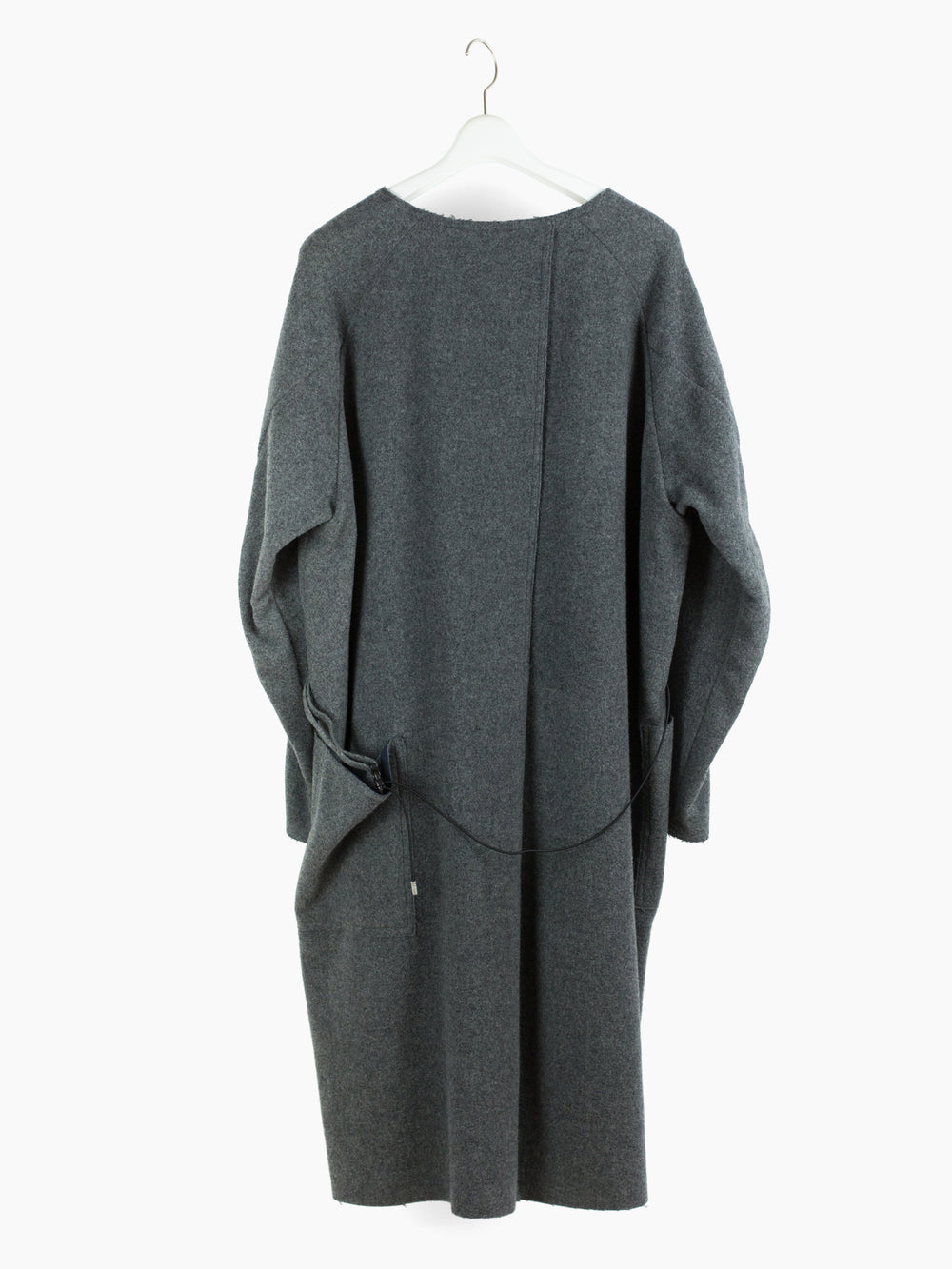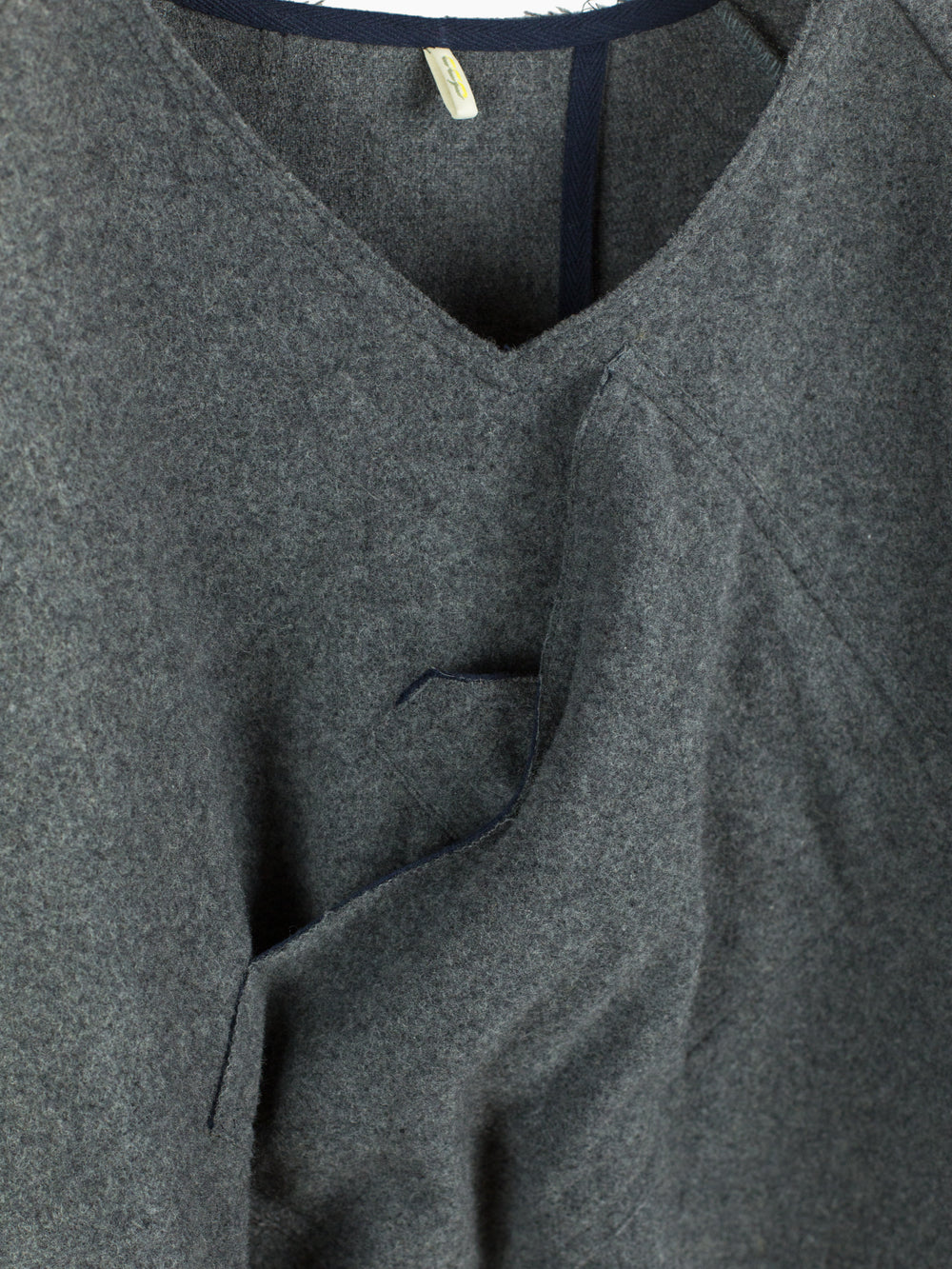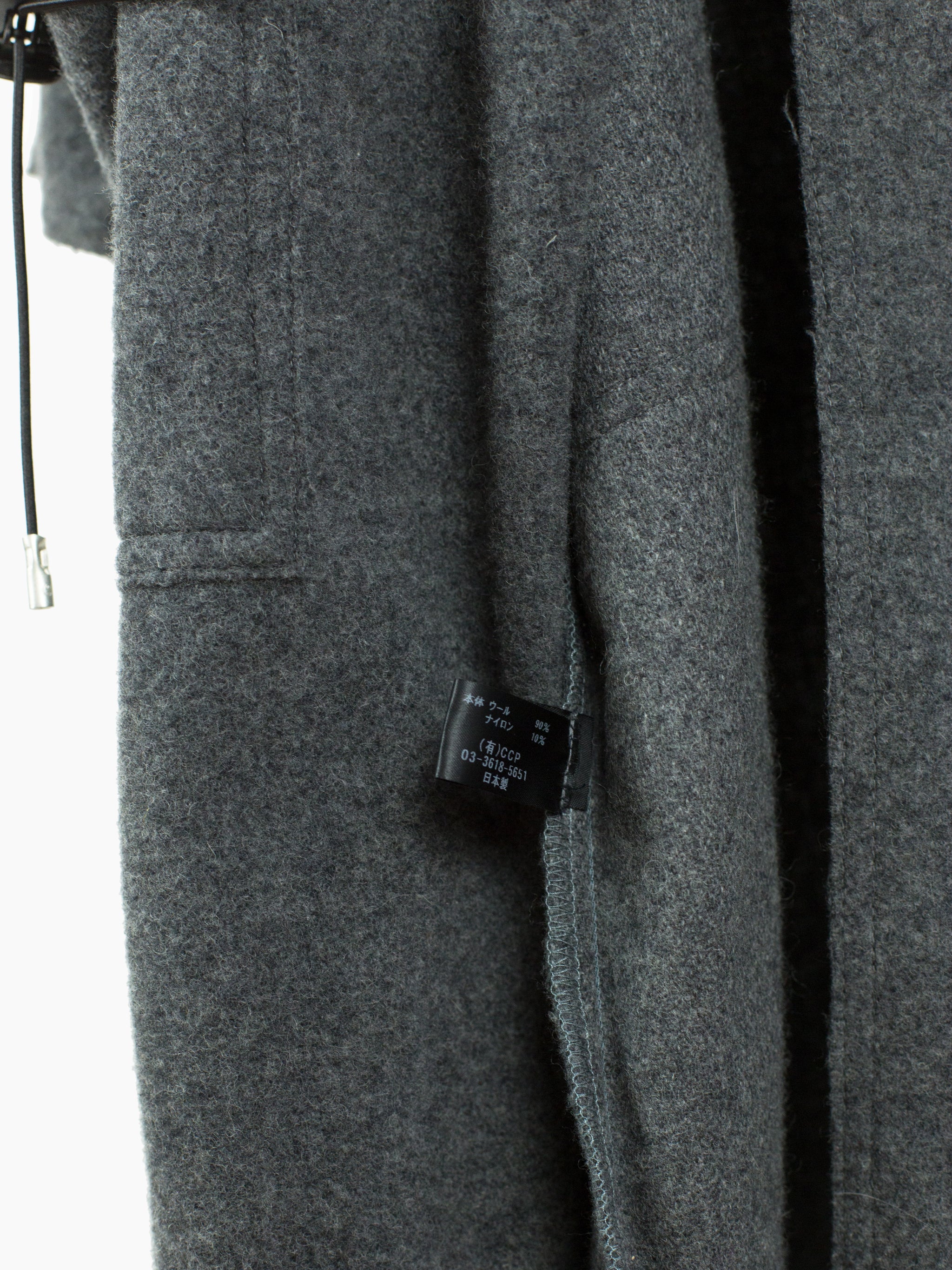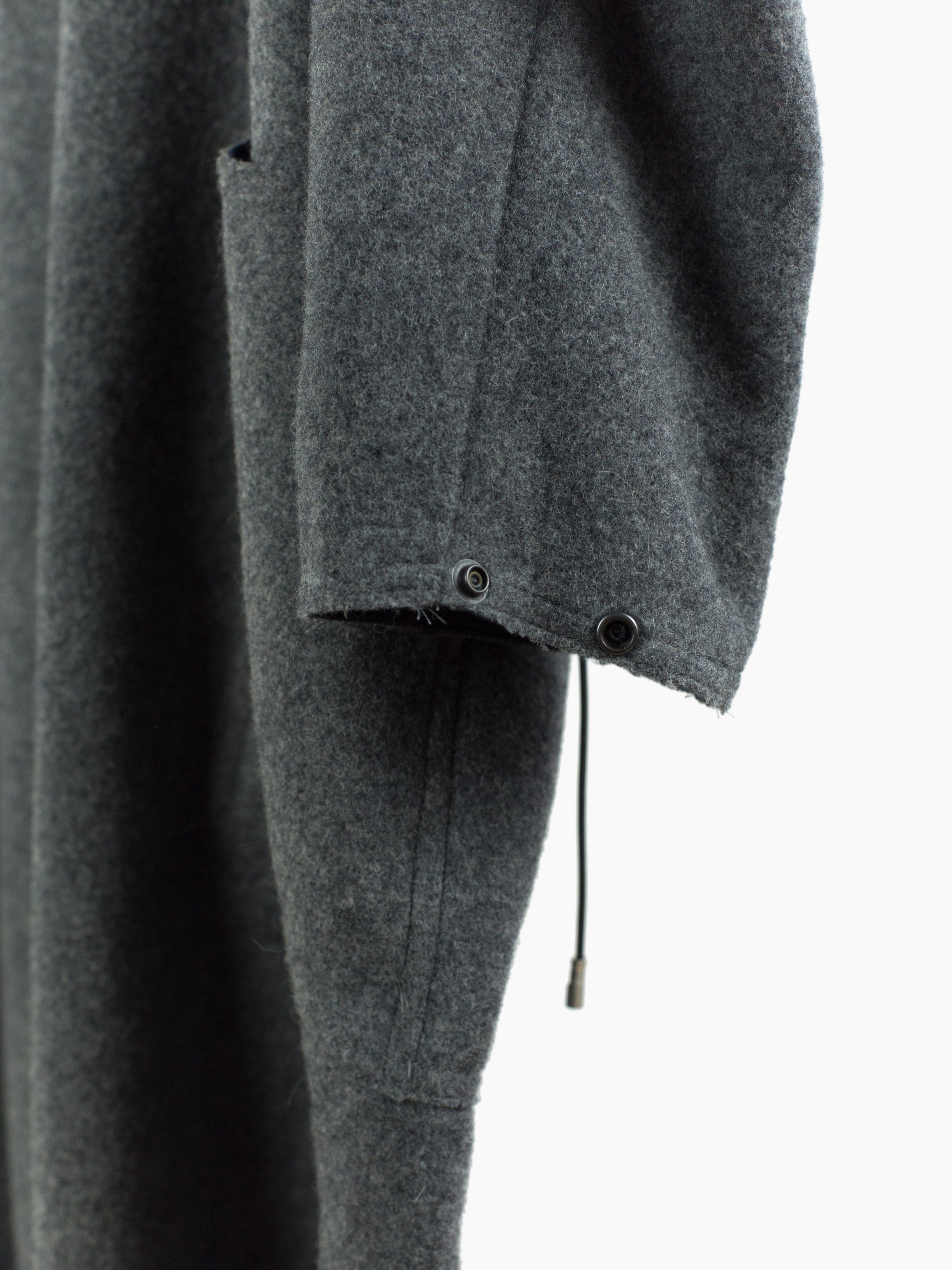 Pullover 'Apron'-style coat from Japanese cycling experts CCP.FM. This piece features a slashed overlapping back opening with shockcord/buckle closure along the back waist--it's able to be worn while riding with the back spread open and generally serves as an interesting layering piece either over or under other outerwear. One large central chest pocket is canted for optimal access, load distribution, and security, with an interior phone sleeve set within. Sleeves are snap-adjustable at the cuff, with double darted shaping at the elbows.