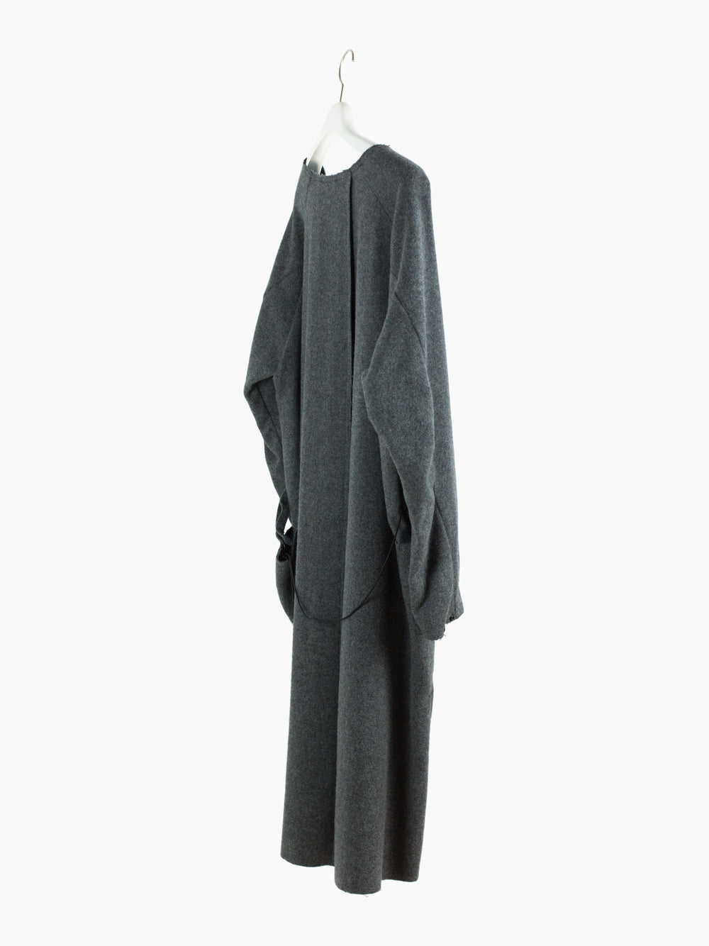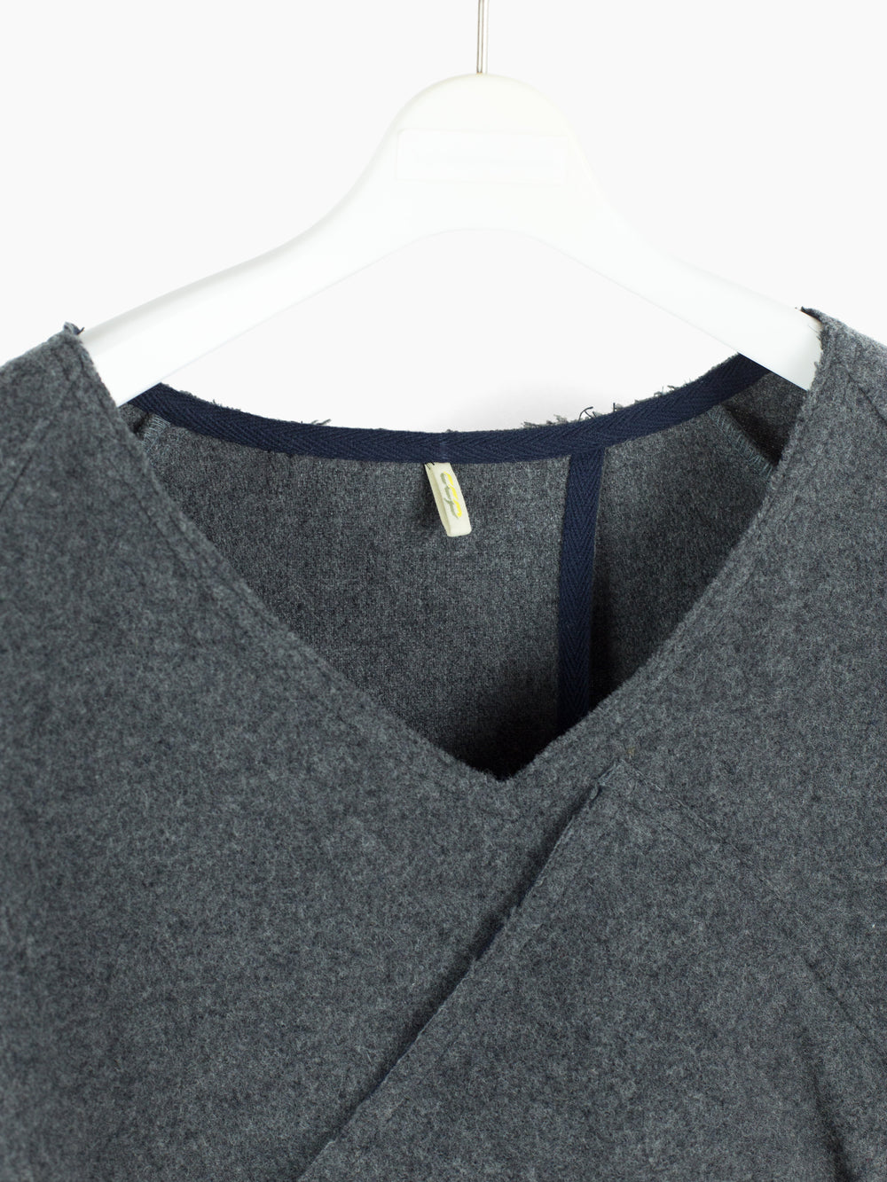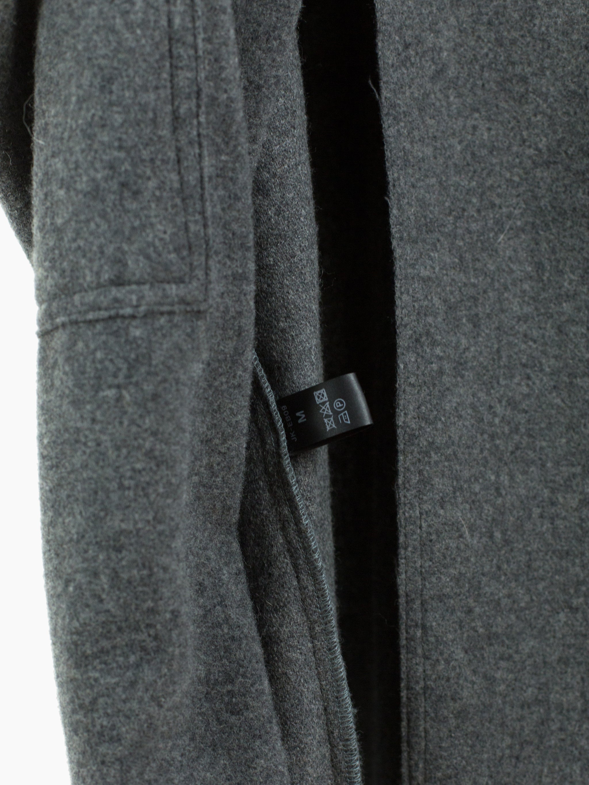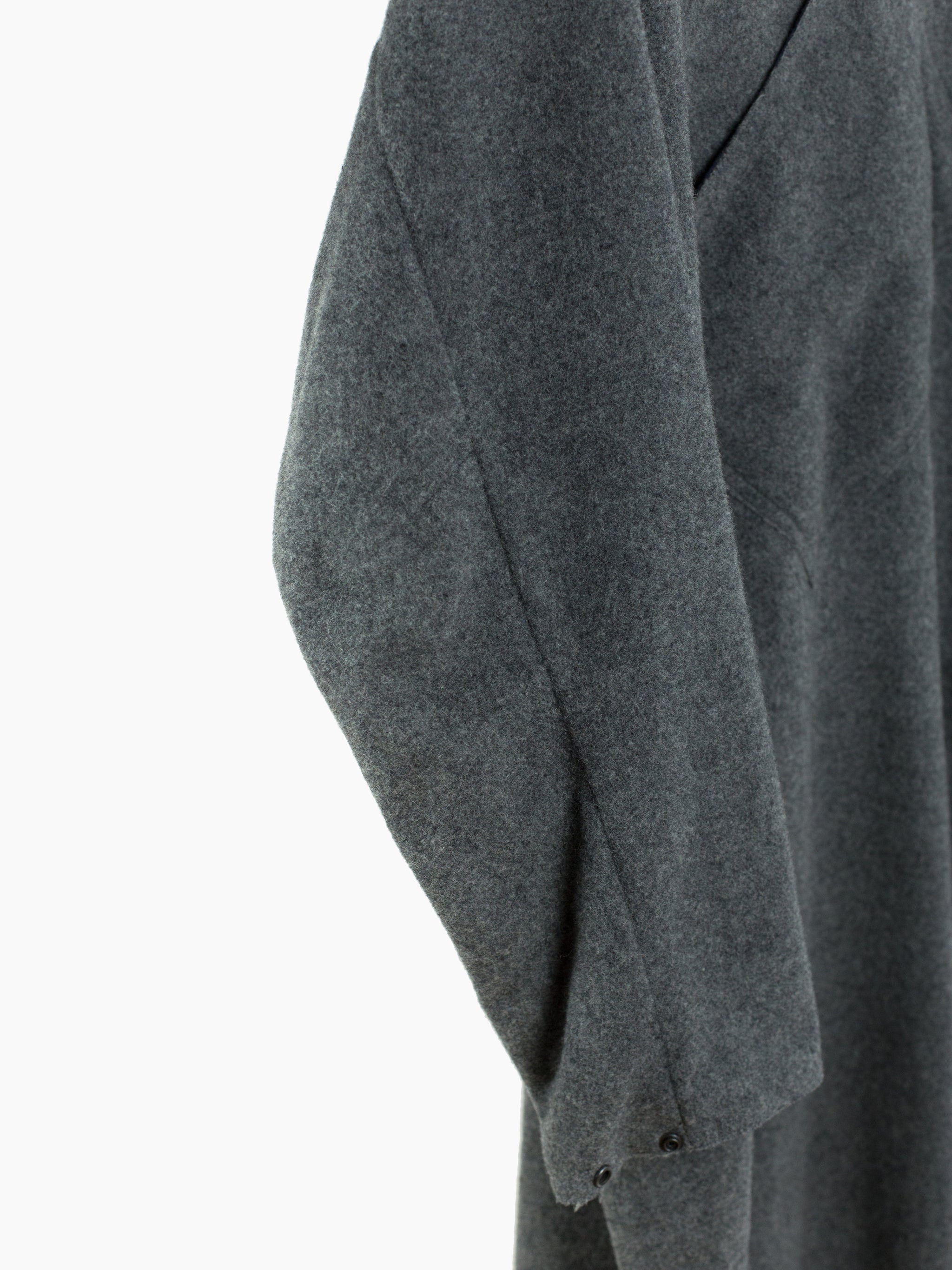 Pullover 'Apron'-style coat from Japanese cycling experts CCP.FM. This piece features a slashed overlapping back opening with shockcord/buckle closure along the back waist--it's able to be worn while riding with the back spread open and generally serves as an interesting layering piece either over or under other outerwear. One large central chest pocket is canted for optimal access, load distribution, and security, with an interior phone sleeve set within. Sleeves are snap-adjustable at the cuff, with double darted shaping at the elbows.