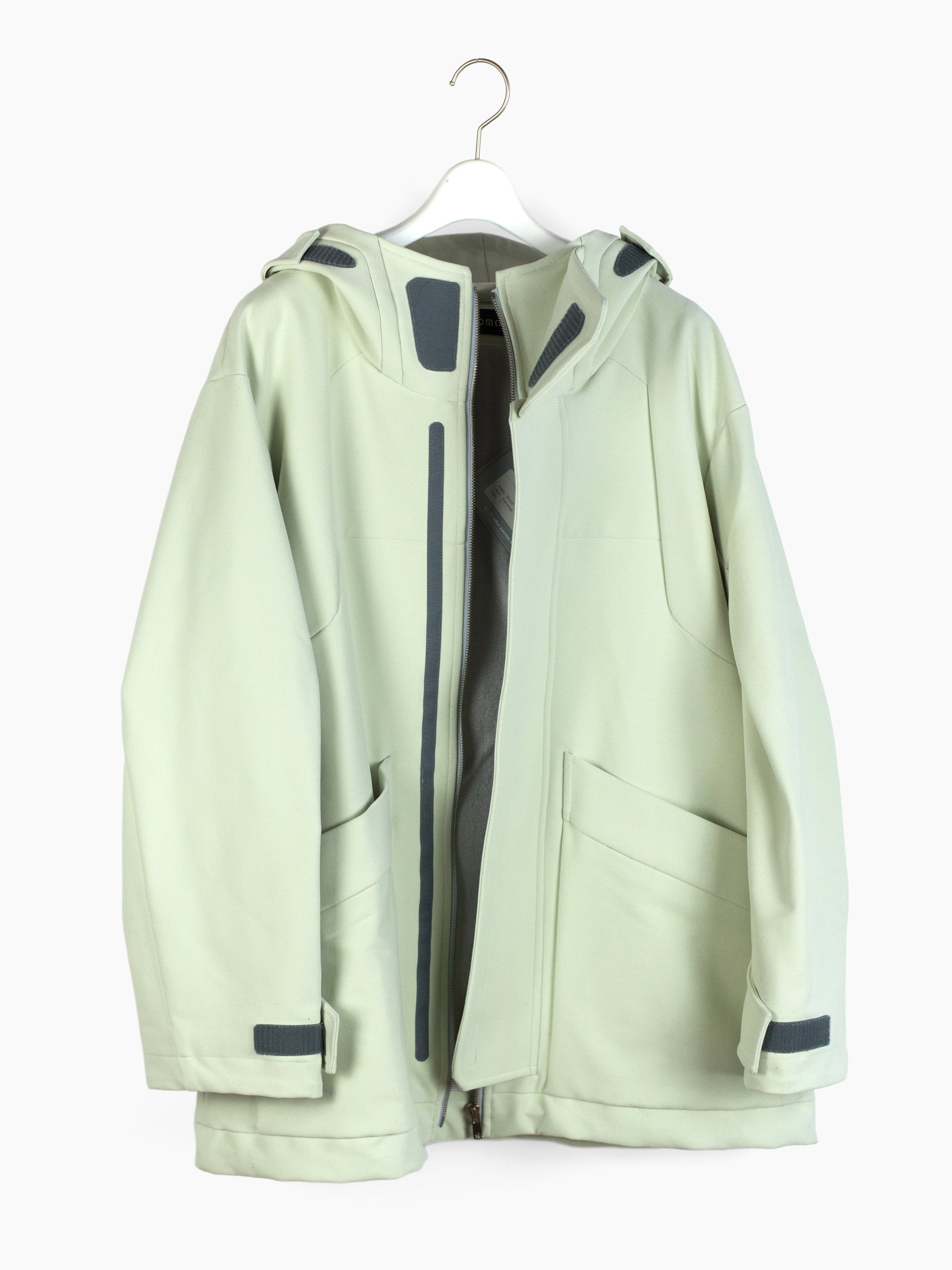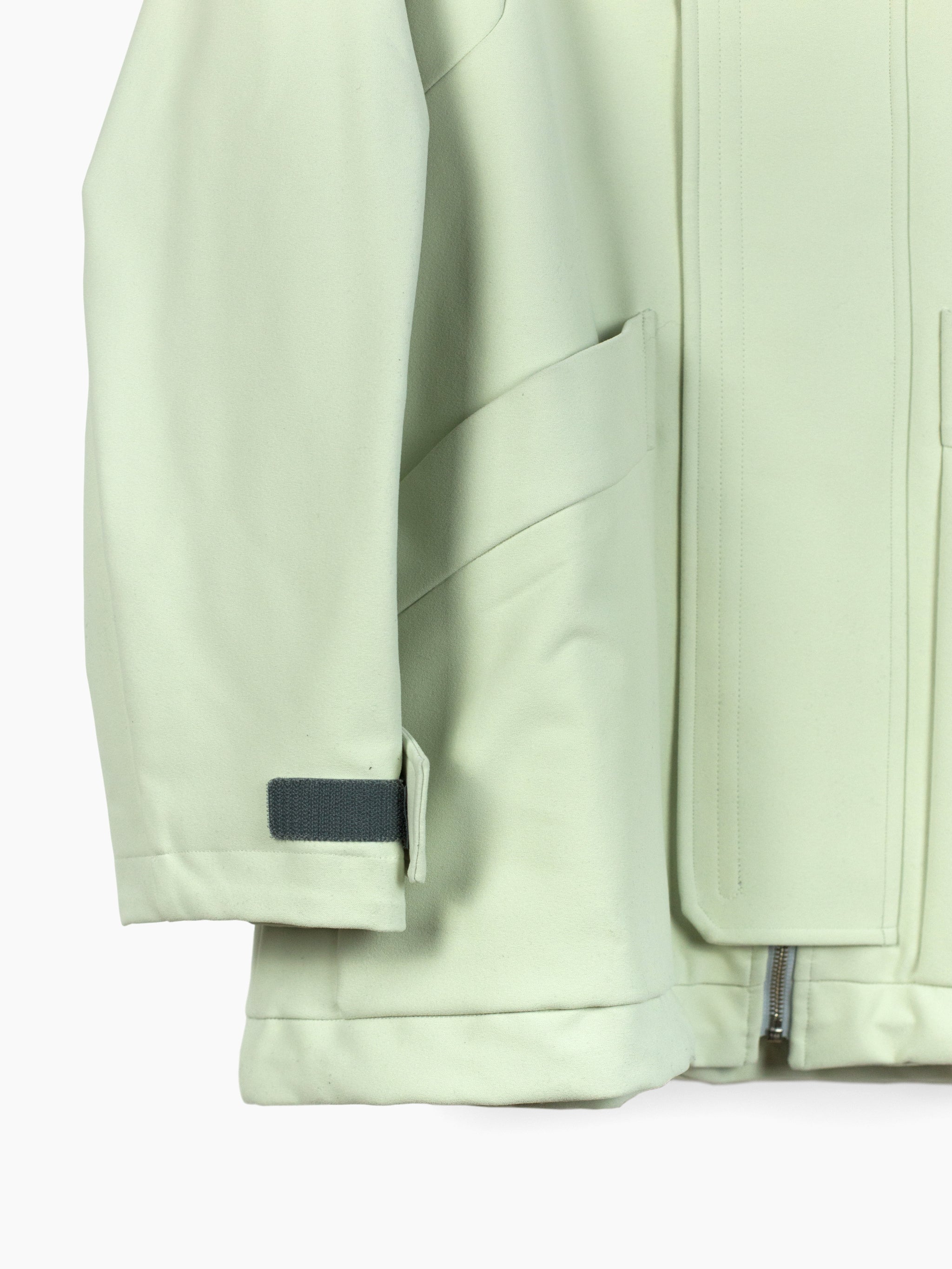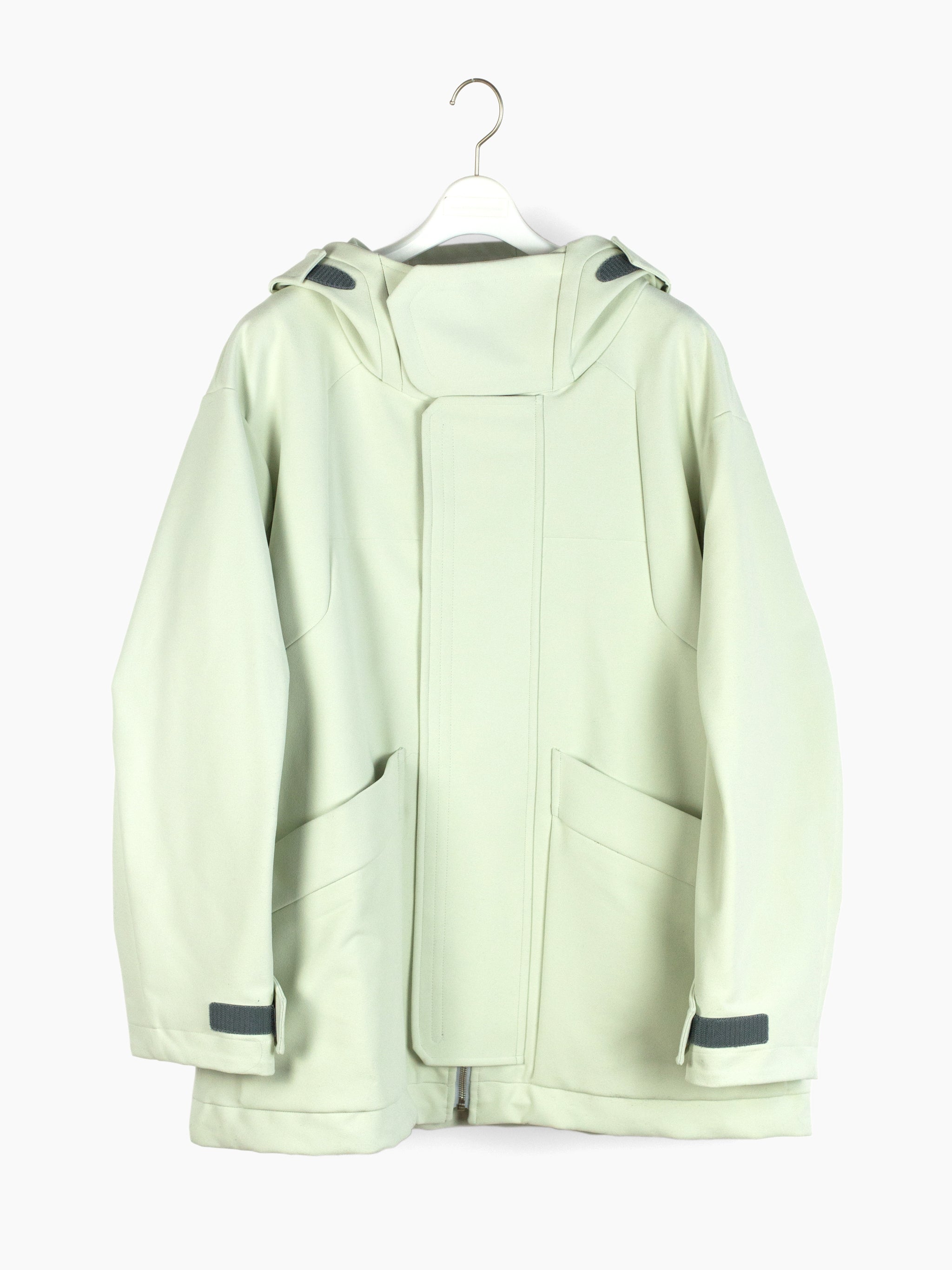 The Chloma Dystopia Coat takes inspiration from the US military ECWCS Gen I Parka in its proportions and shape, with subtle twists that abstract the utilitarian staple into a digitized, futuristic coat of armor. Style lines are all artistically rendered (at plackets, shoulderlines, hood panels, even the velcro patches) to create an alternative, futuristic impression. Sleeves feature statement downwards facing pleat at the inner bicep which creates a unique a-line impression and added dimension.