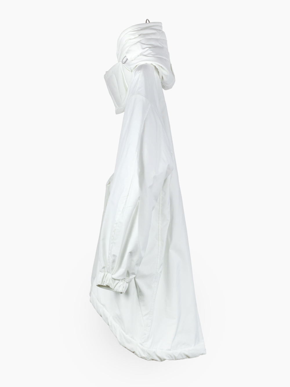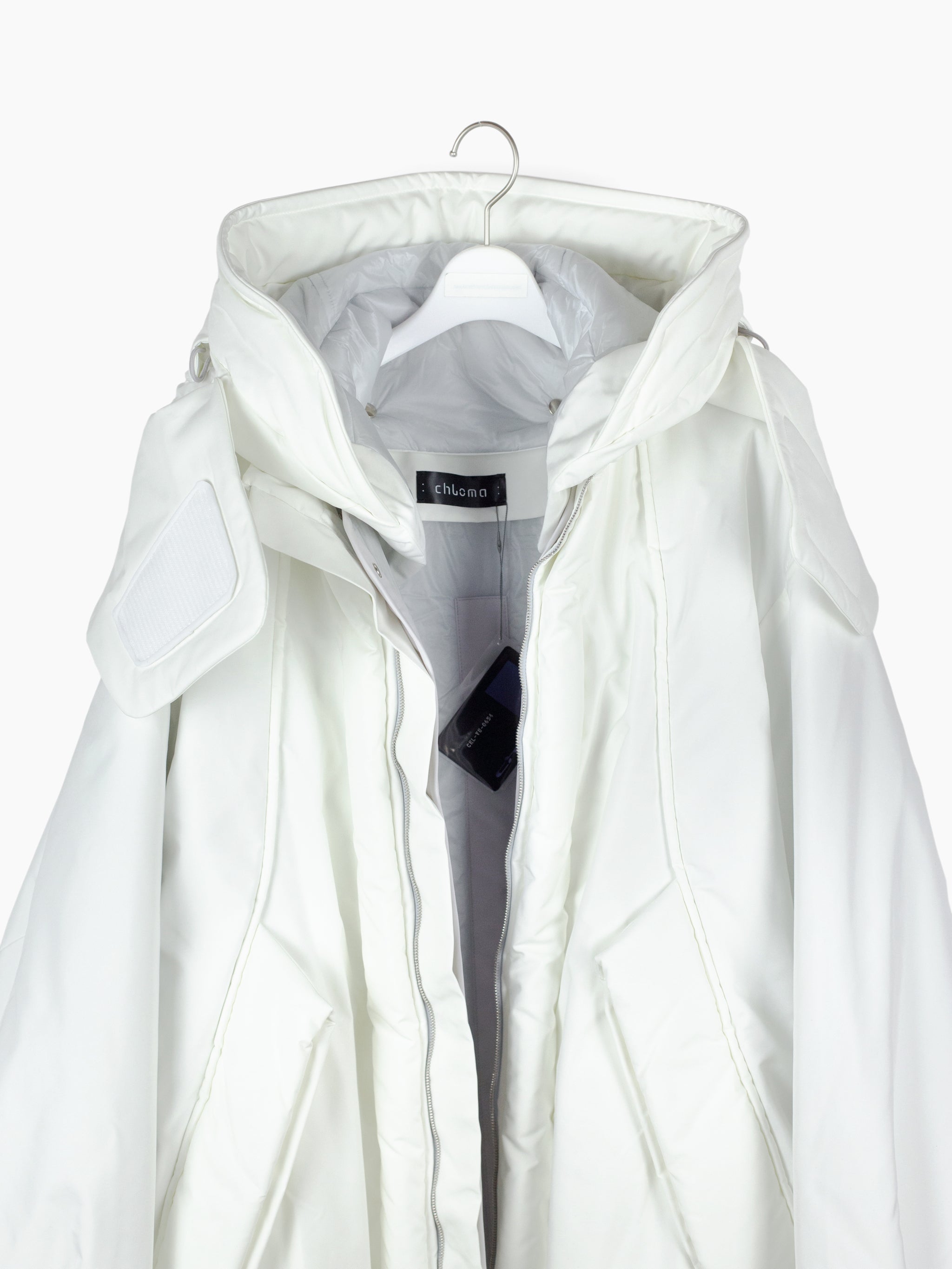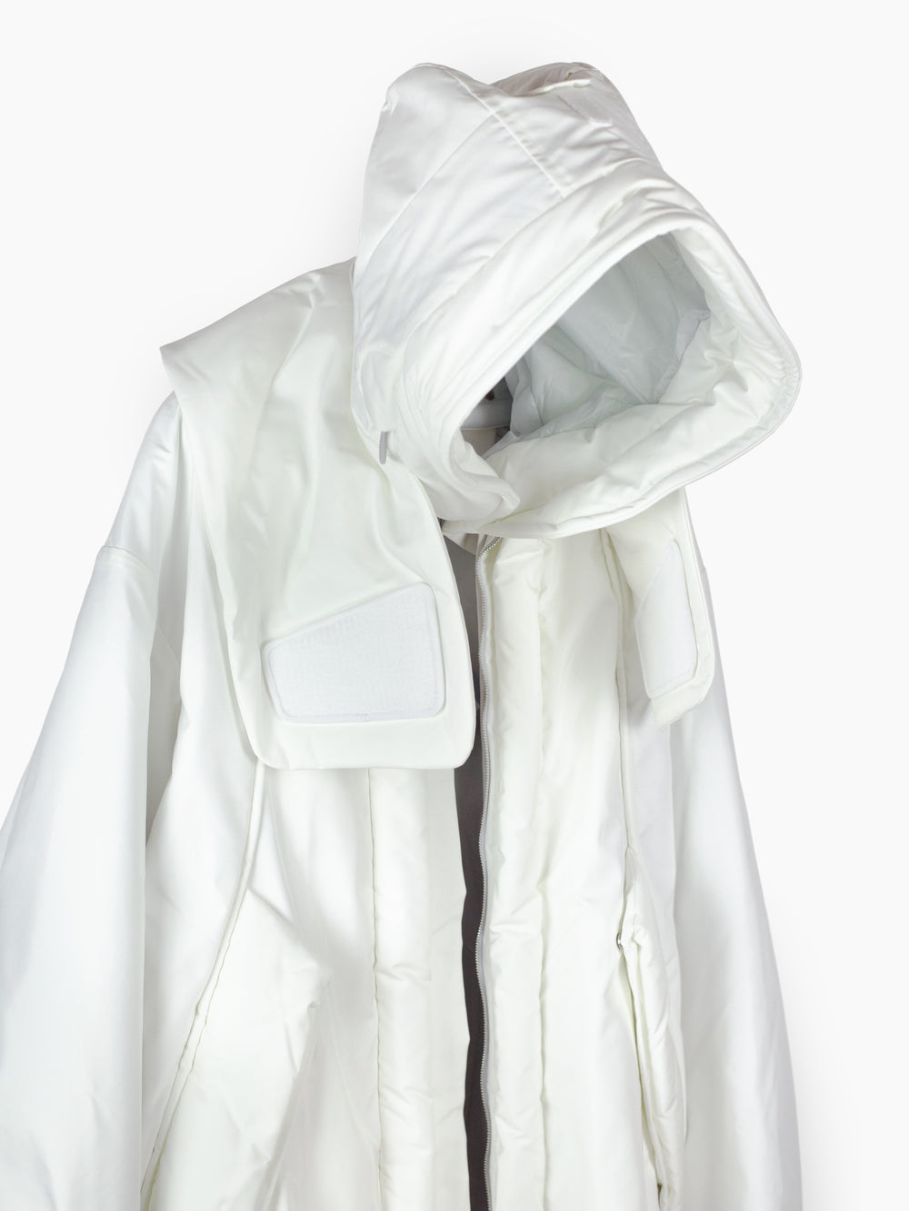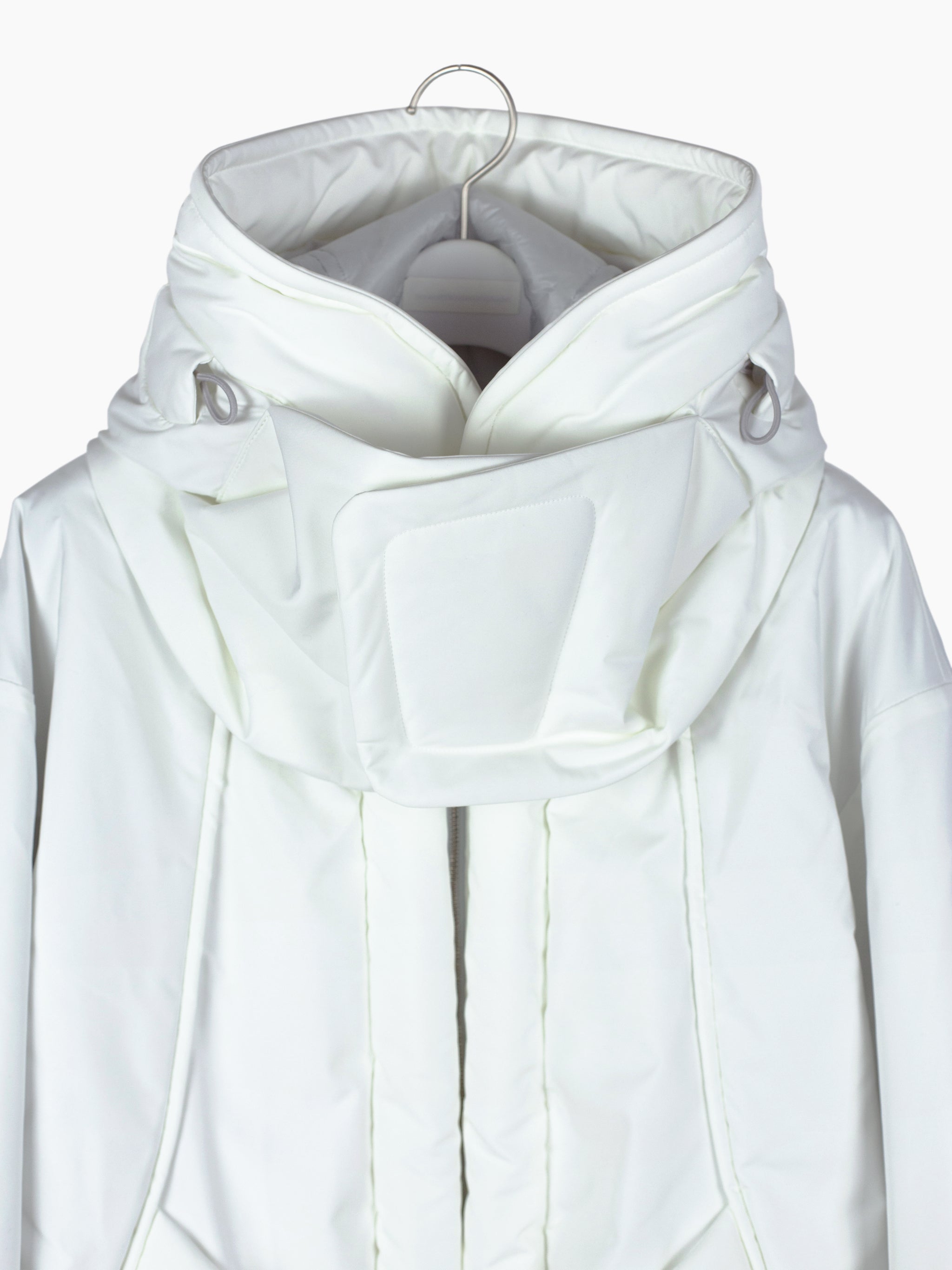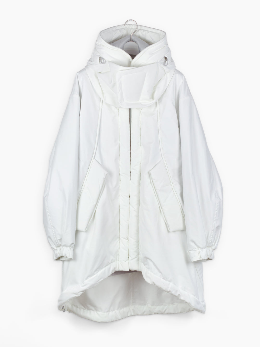The shelter coat takes inspiration from US Military M51 fishtail/'mod' parkas (with its dropped back hem, oversize removable hood, and voluminous sleeves), updating it with a novel set of details and materials that bring it into the ambiguously physical-digital Chloma universe. Pure white technical polyester shell with padded details around hem, plackets, and pocketflaps create a palpable sense of softness and comfort, a nod towards Margiela's Duvet coats and, in keeping with its namesake 'shelter,' the sensation of being enveloped in something soft yet protective. A perfect blend of soft tactility and sharp, aggressive, futuristic detailing for a garment that can function as a piece of armor. Translucent removable padded inner liner rounds out the icy synthetic/electronic aesthetic, further blurring the line between an avatar's inventory and a human's wardrobe.