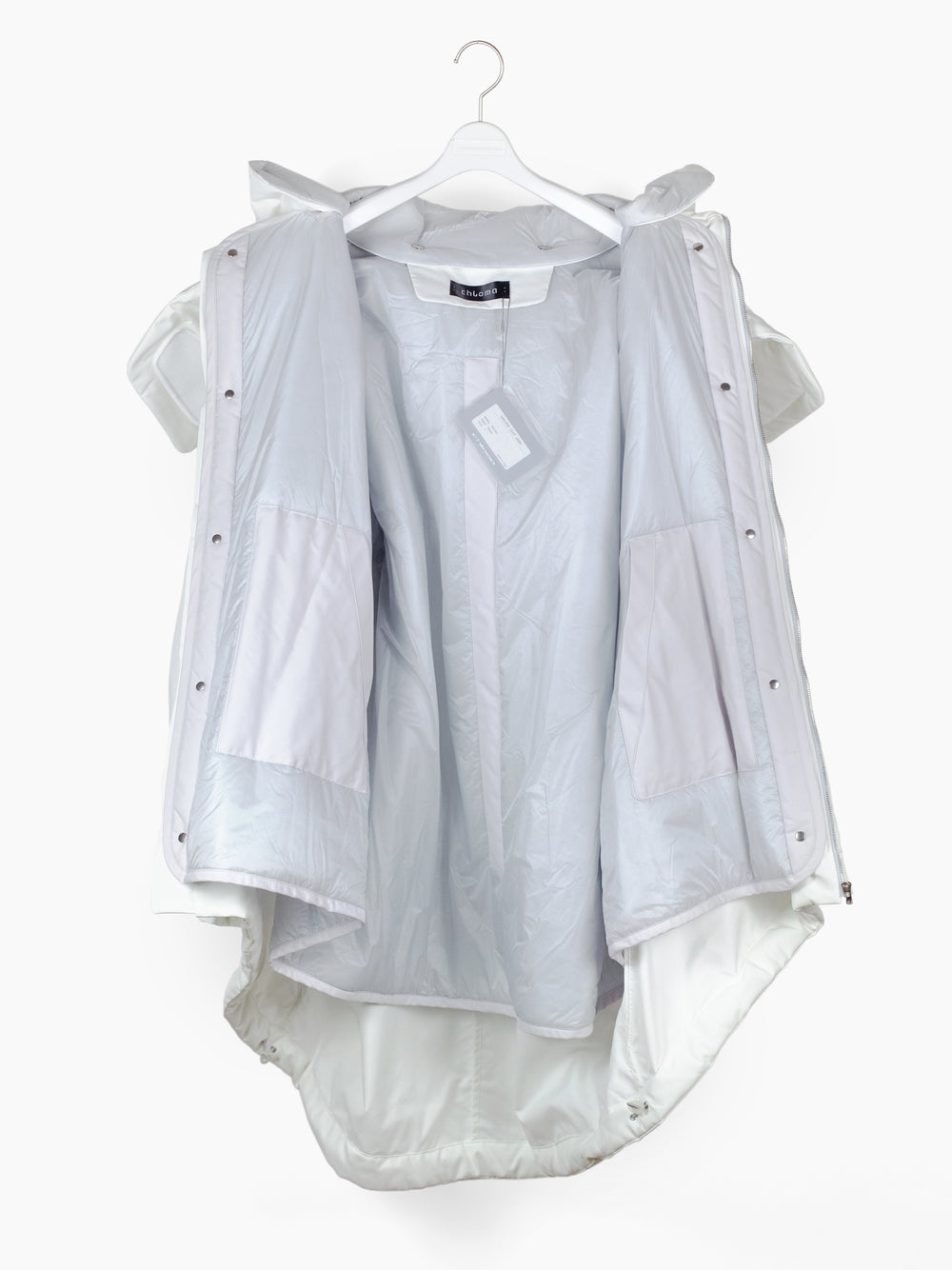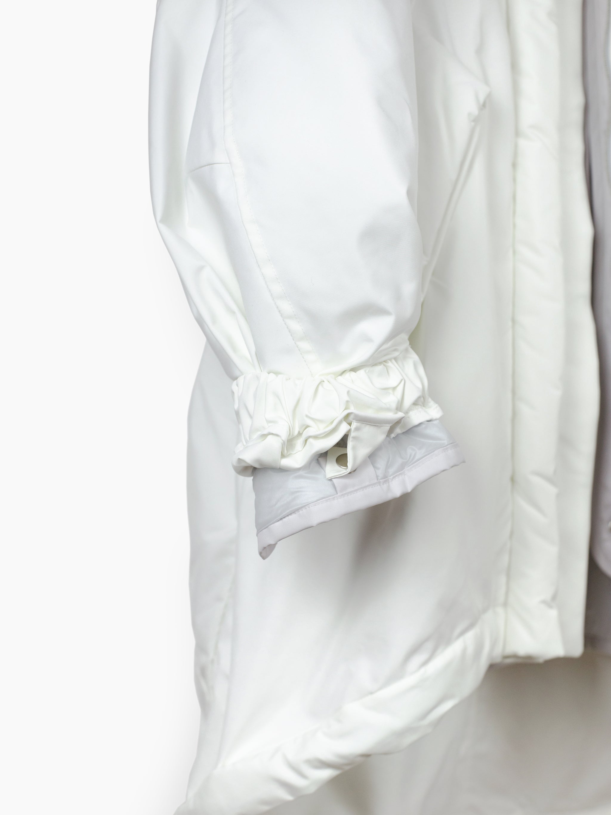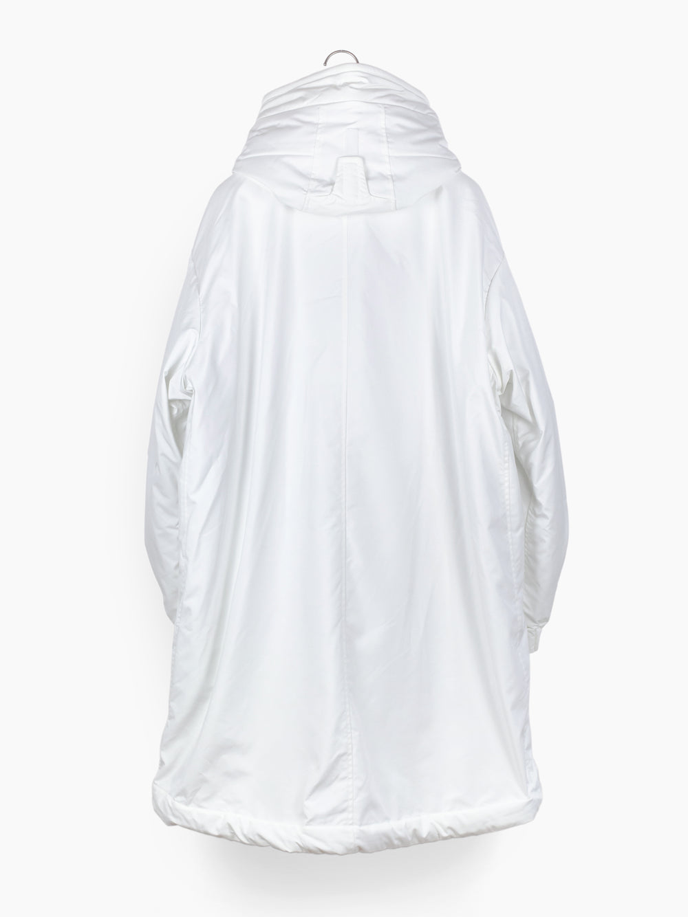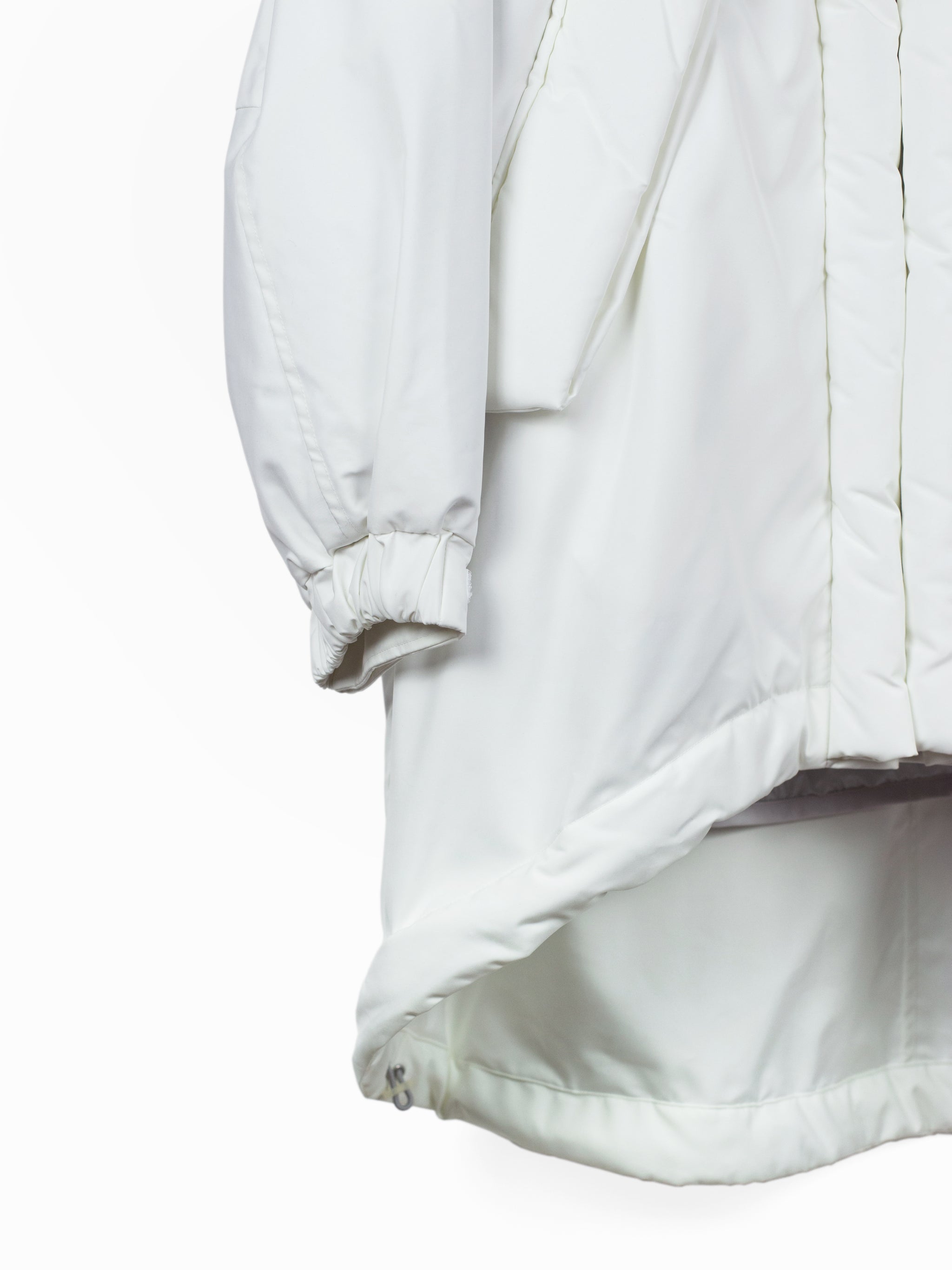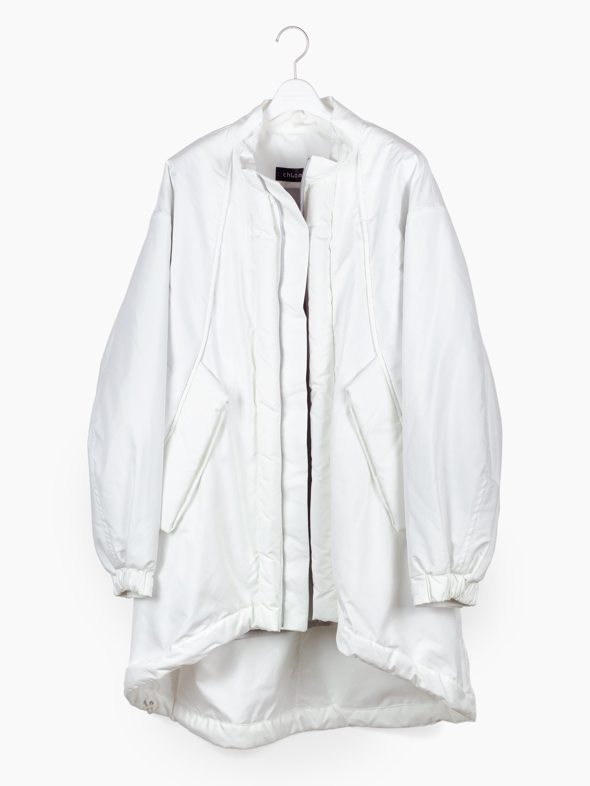 The shelter coat takes inspiration from US Military M51 fishtail/'mod' parkas (with its dropped back hem, oversize removable hood, and voluminous sleeves), updating it with a novel set of details and materials that bring it into the ambiguously physical-digital Chloma universe. Pure white technical polyester shell with padded details around hem, plackets, and pocketflaps create a palpable sense of softness and comfort, a nod towards Margiela's Duvet coats and, in keeping with its namesake 'shelter,' the sensation of being enveloped in something soft yet protective. A perfect blend of soft tactility and sharp, aggressive, futuristic detailing for a garment that can function as a piece of armor. Translucent removable padded inner liner rounds out the icy synthetic/electronic aesthetic, further blurring the line between an avatar's inventory and a human's wardrobe.