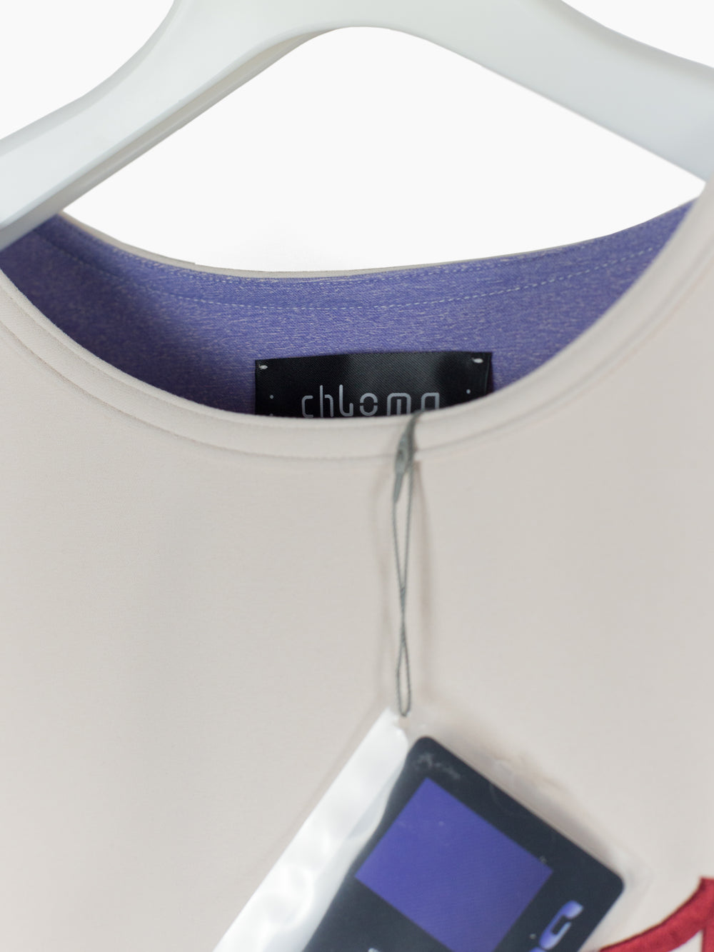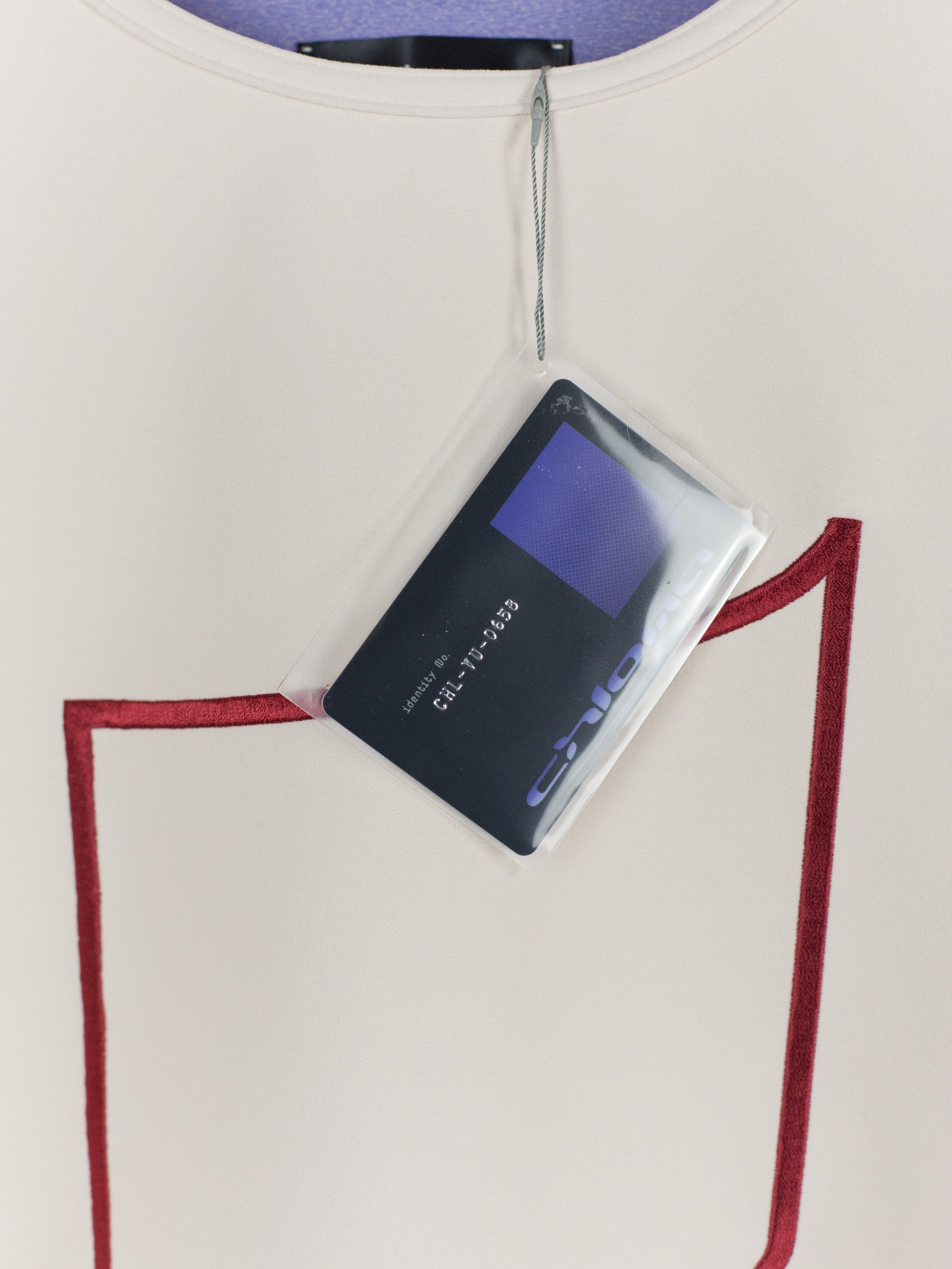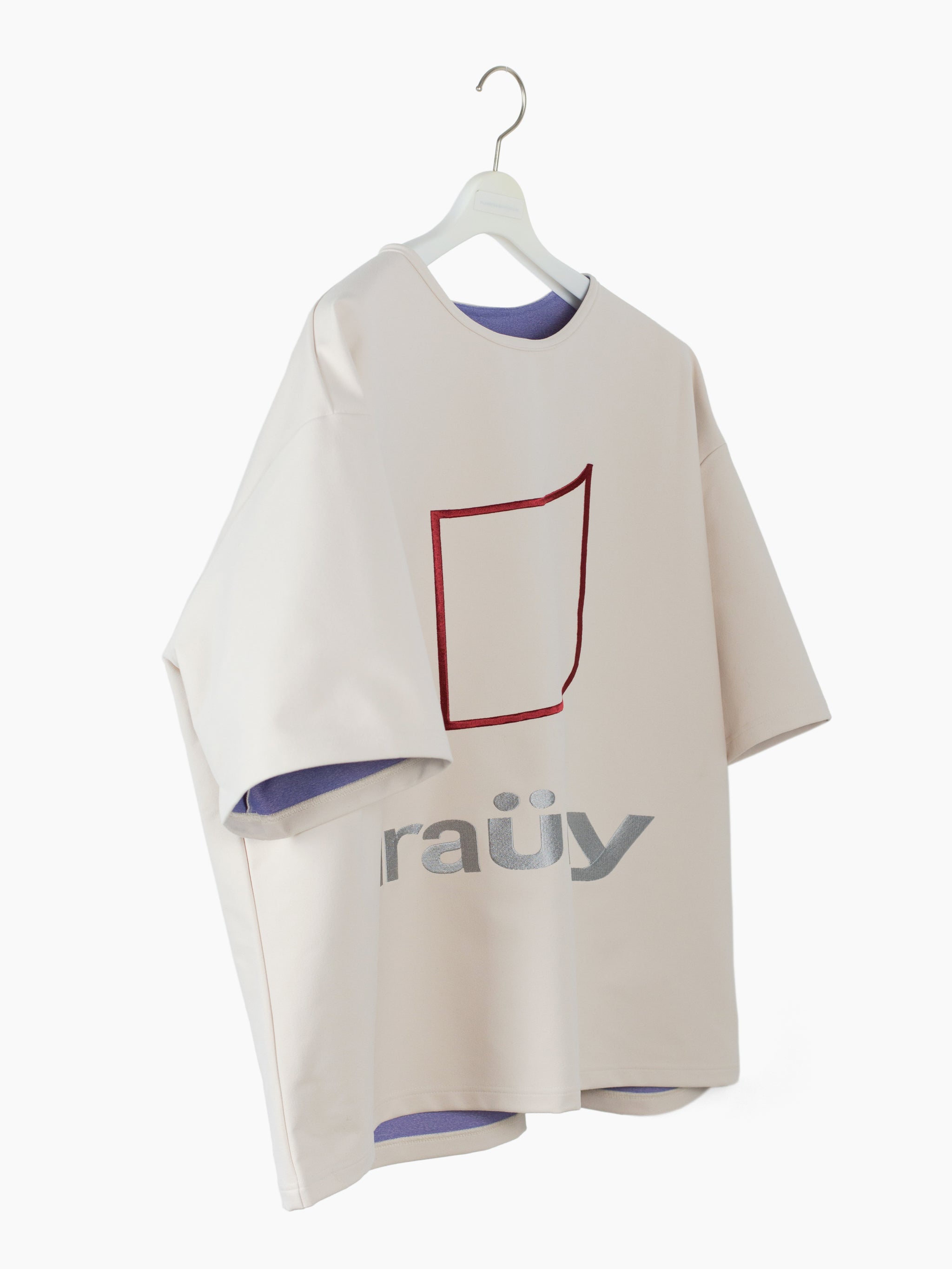 Fleshy pink tee cut with an oversize/extra boxy fit and cropped body. Doubleweave polyester with pink outer face and purple brushed jersey inner face for comfort. Has plenty of structure for an off-the-body silhouette. Statement seasonal 'Uraüny' graphic embroidered at center front, based on a fictional artificial intelligence entity.