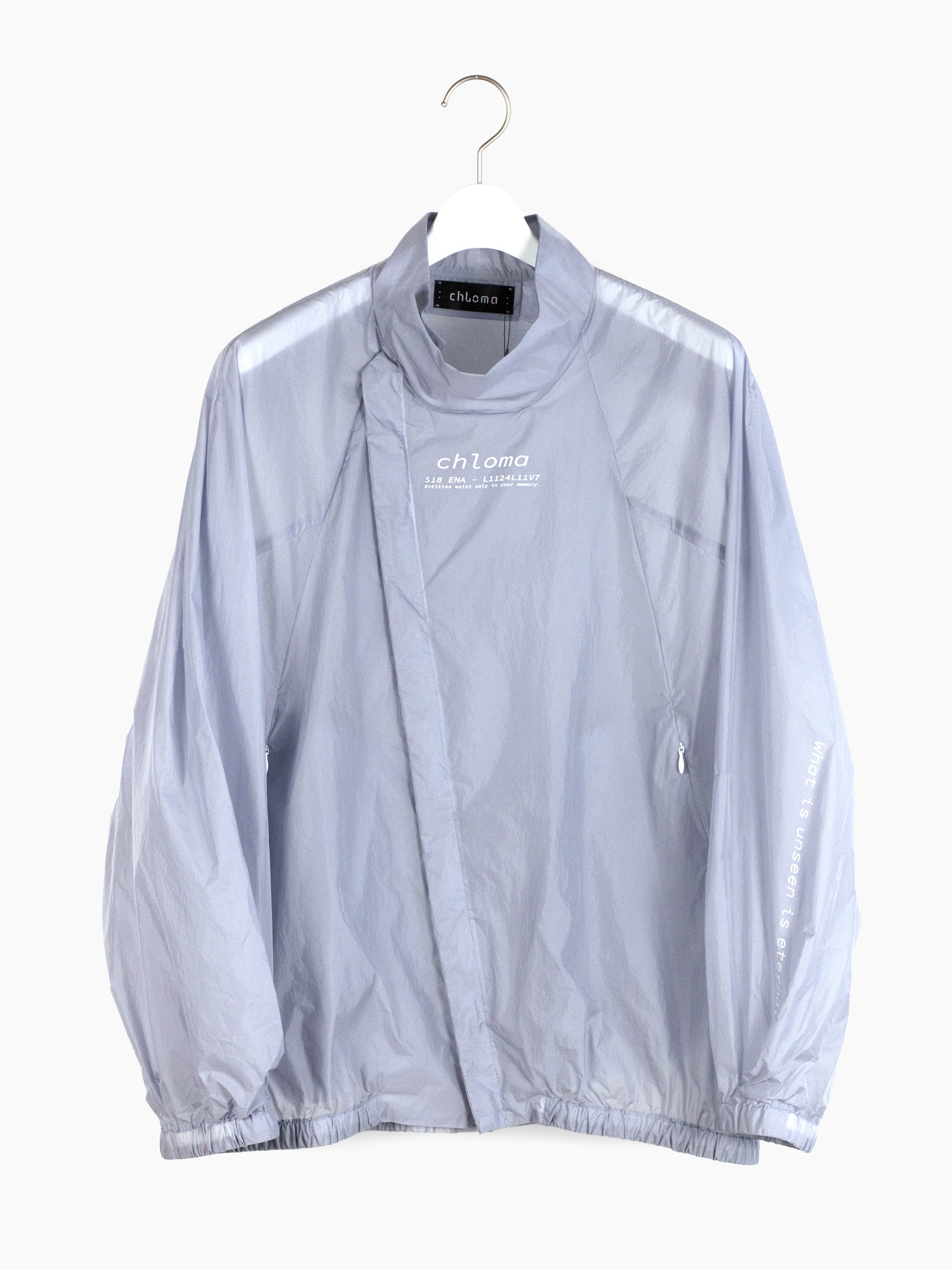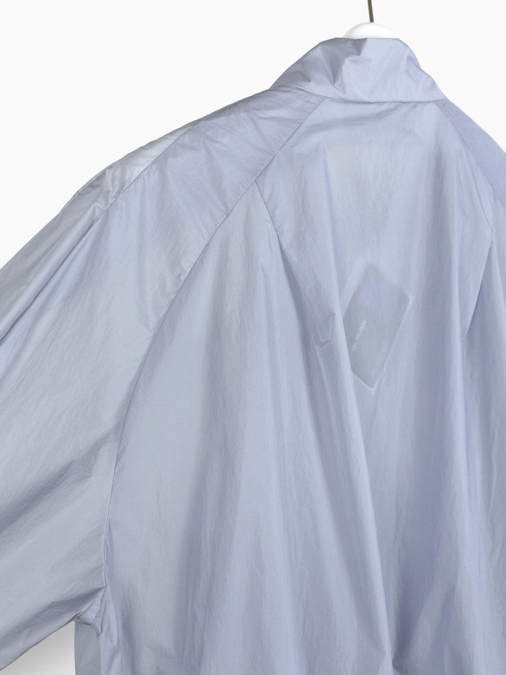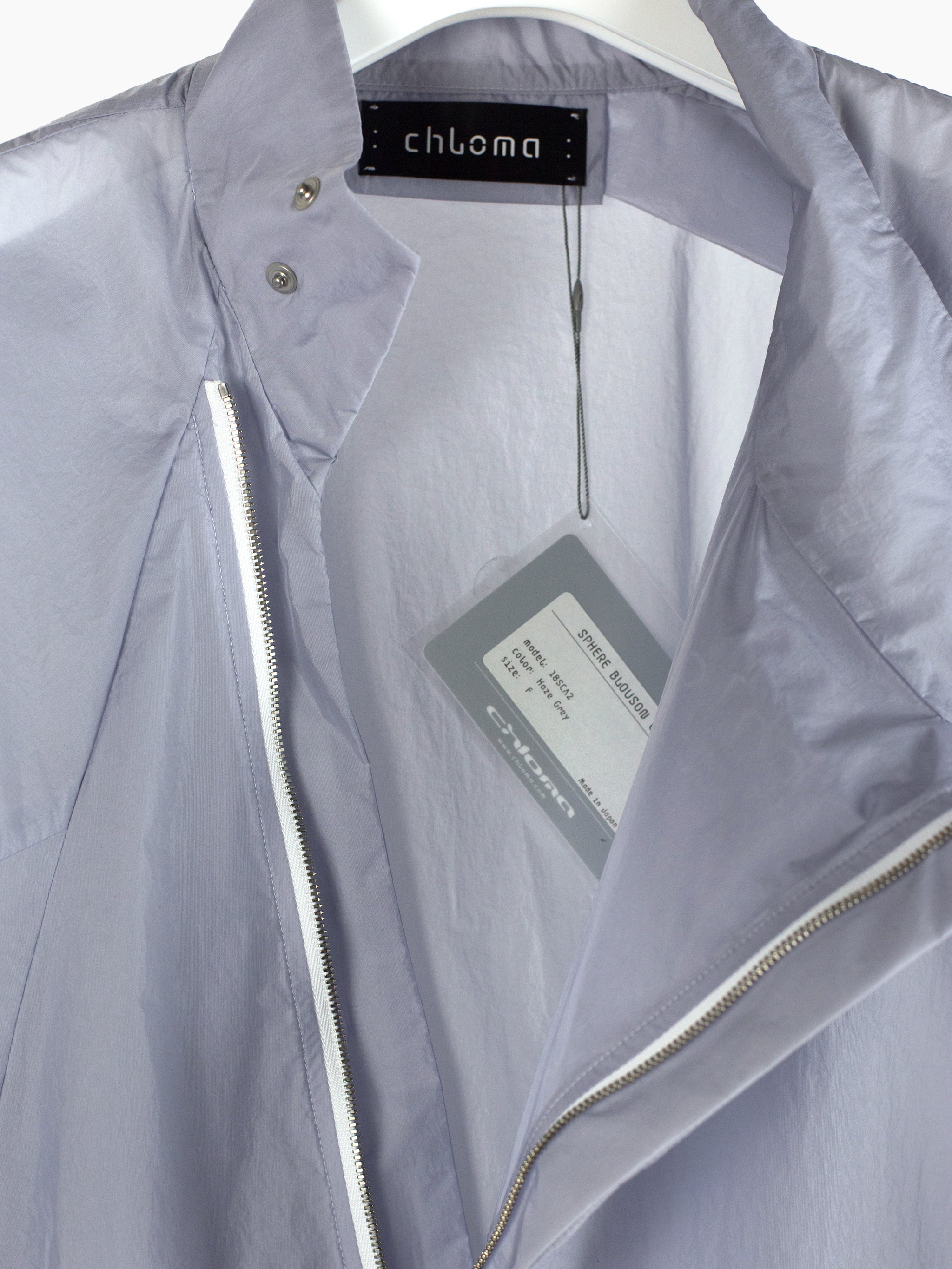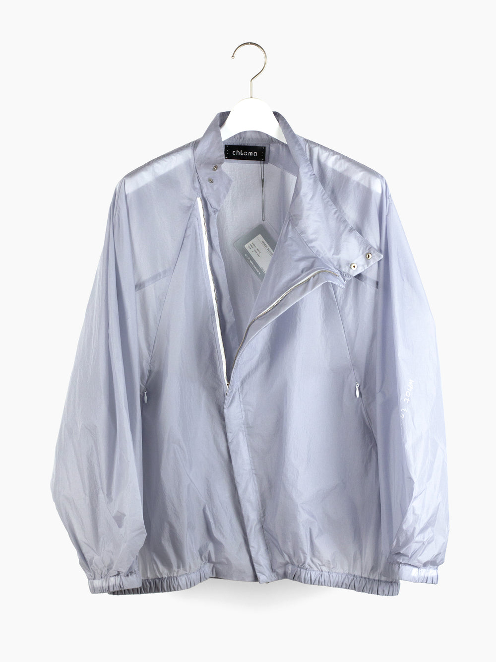 Blouson/track jacket hybrid with a sculpted spherical silhouette achieved through the use of carefully placed pleats and darts. Executed in a lightweight technical polyester with a translucency that creates the impression of a soft halo or shroud...but synthetic. Finished with angular pattern cutting throughout, asymmetrical front double zipper closure, two zippered waist pockets, snap-closed stand collar, and elasticated hem and cuffs.