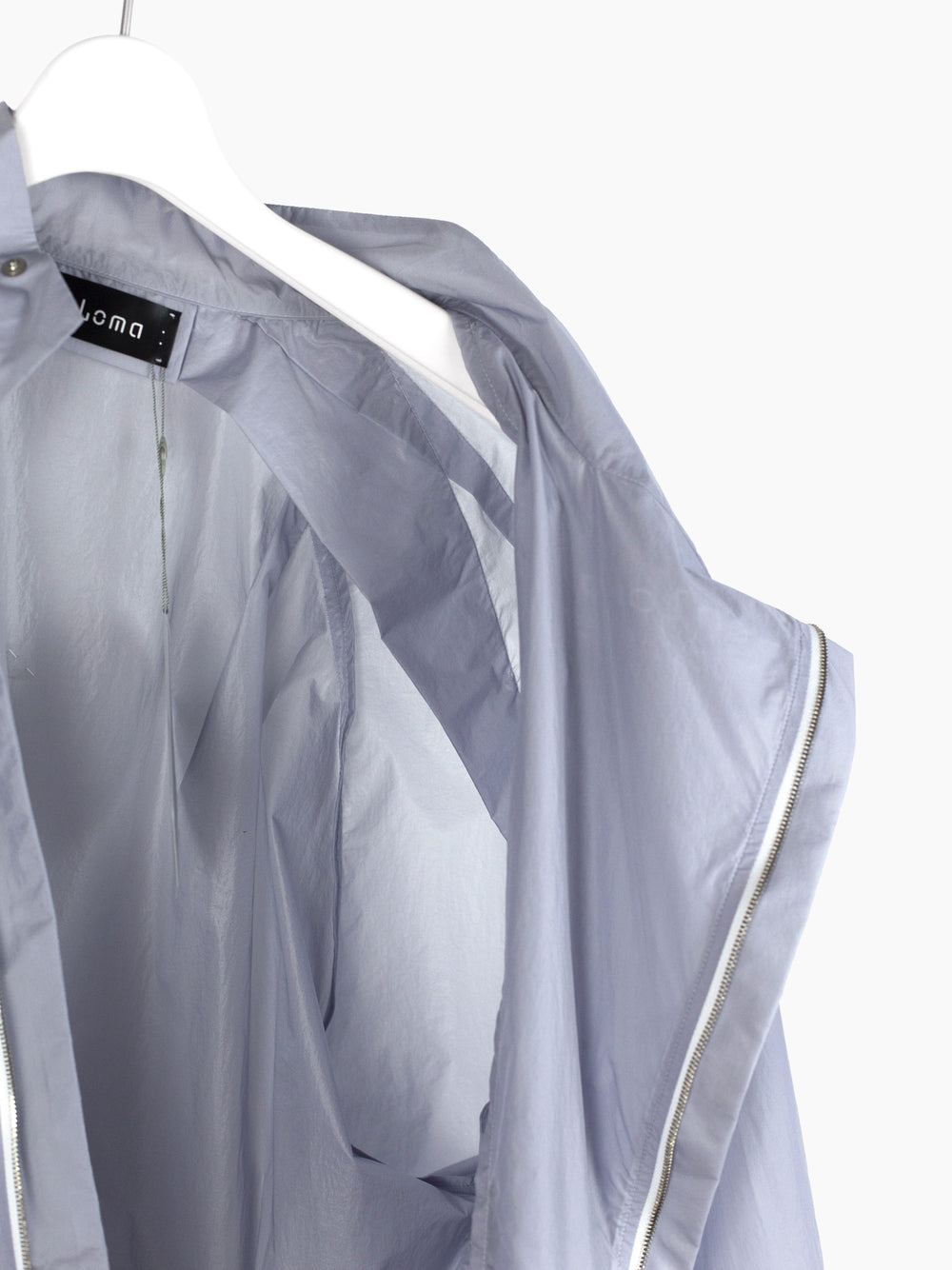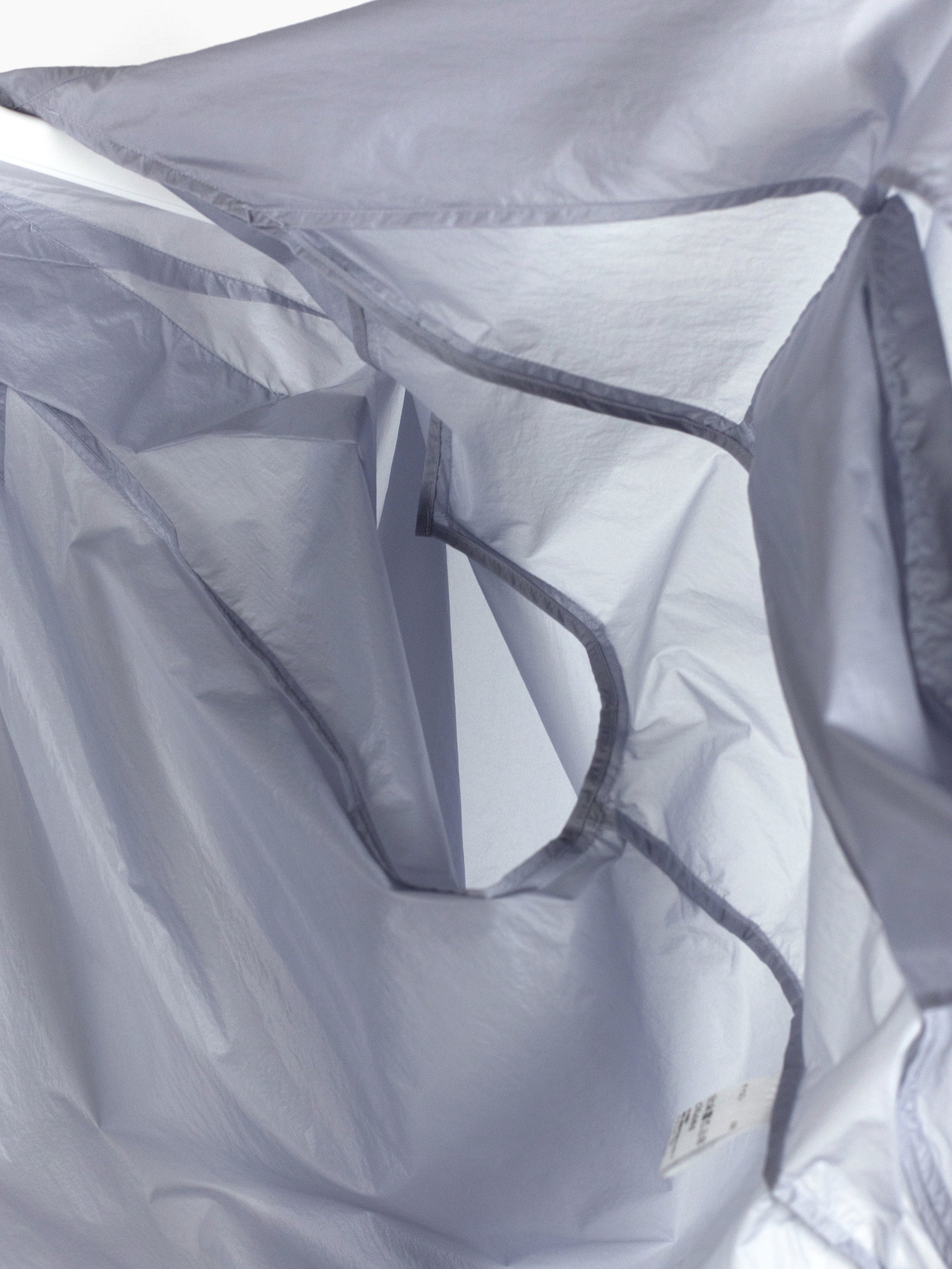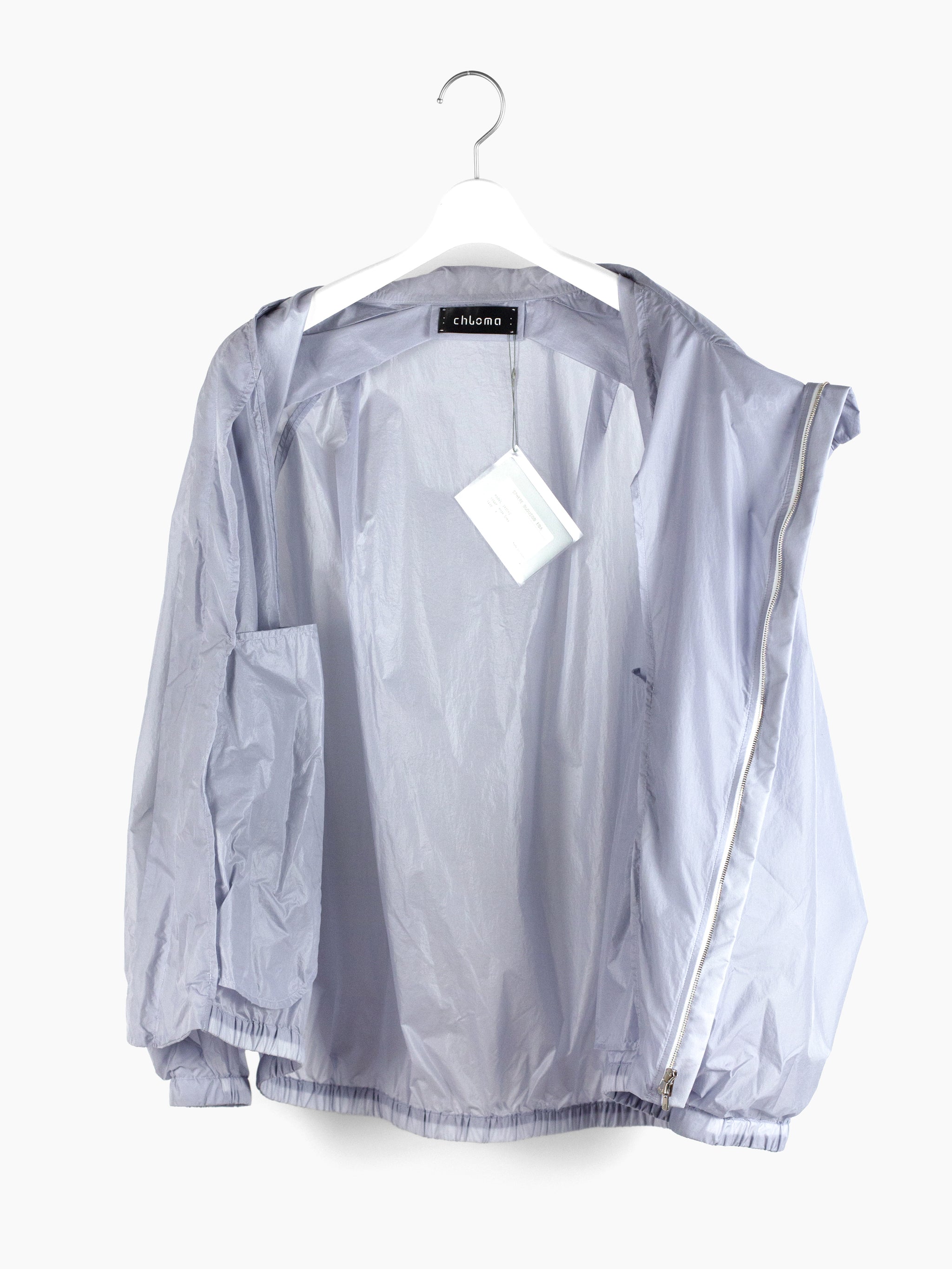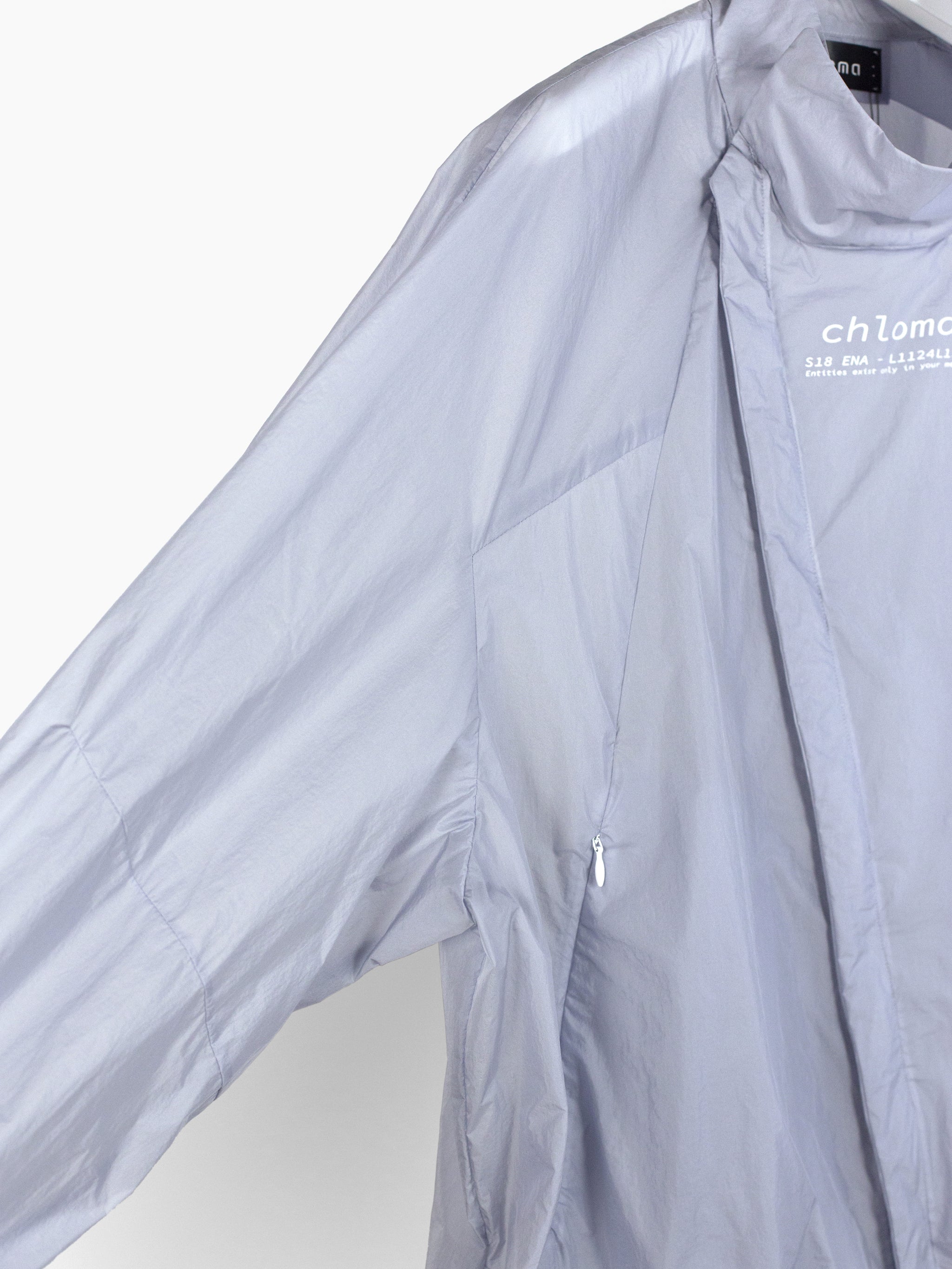 Blouson/track jacket hybrid with a sculpted spherical silhouette achieved through the use of carefully placed pleats and darts. Executed in a lightweight technical polyester with a translucency that creates the impression of a soft halo or shroud...but synthetic. Finished with angular pattern cutting throughout, asymmetrical front double zipper closure, two zippered waist pockets, snap-closed stand collar, and elasticated hem and cuffs.