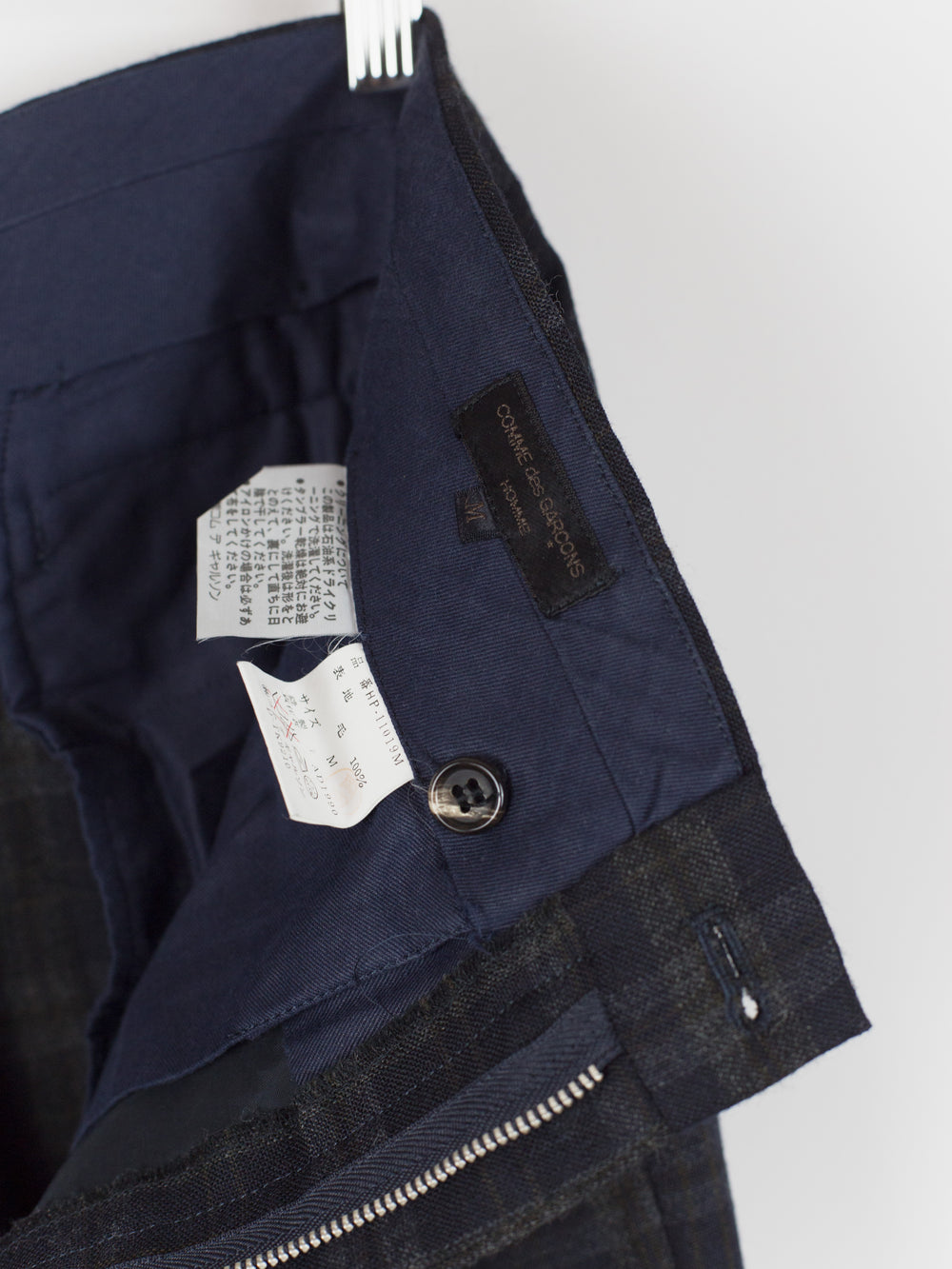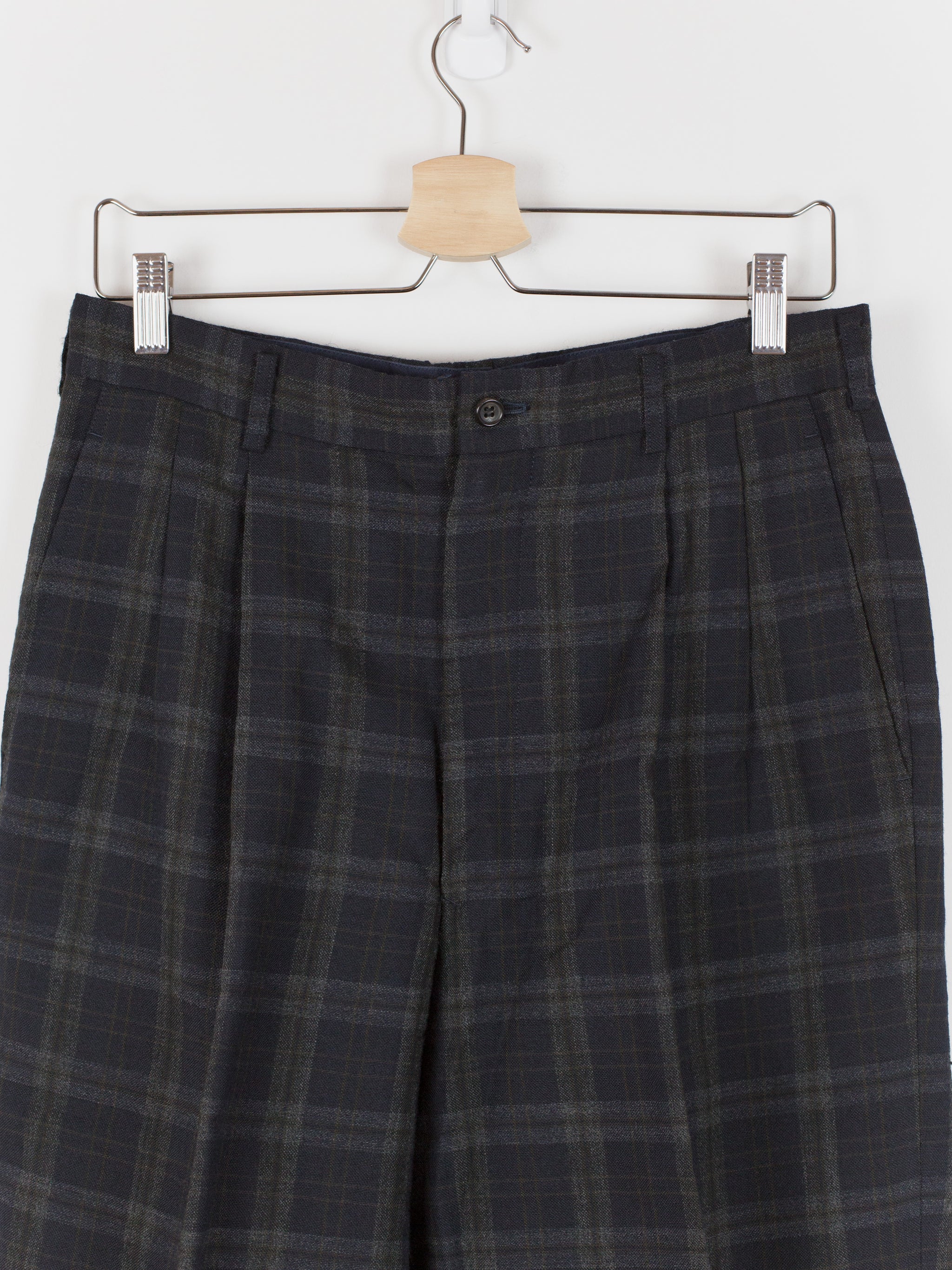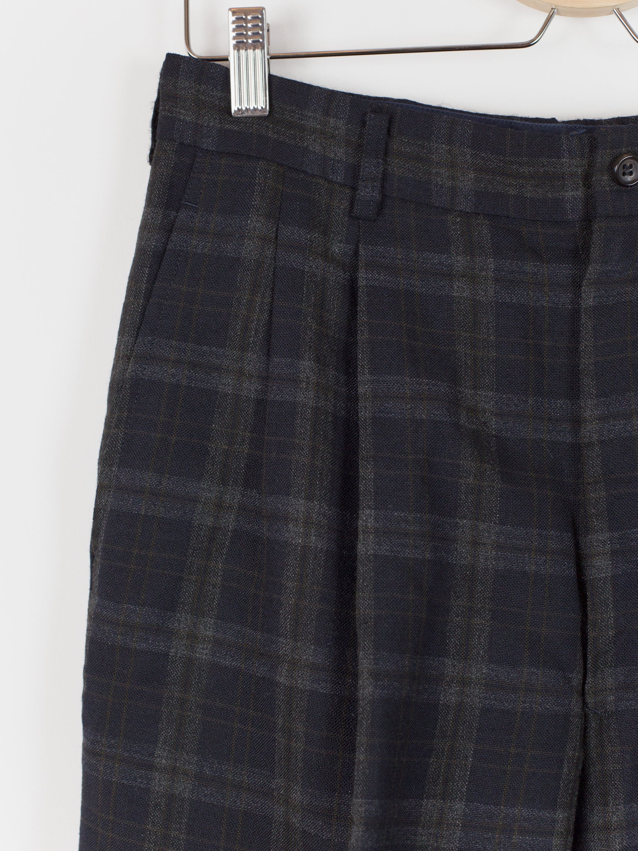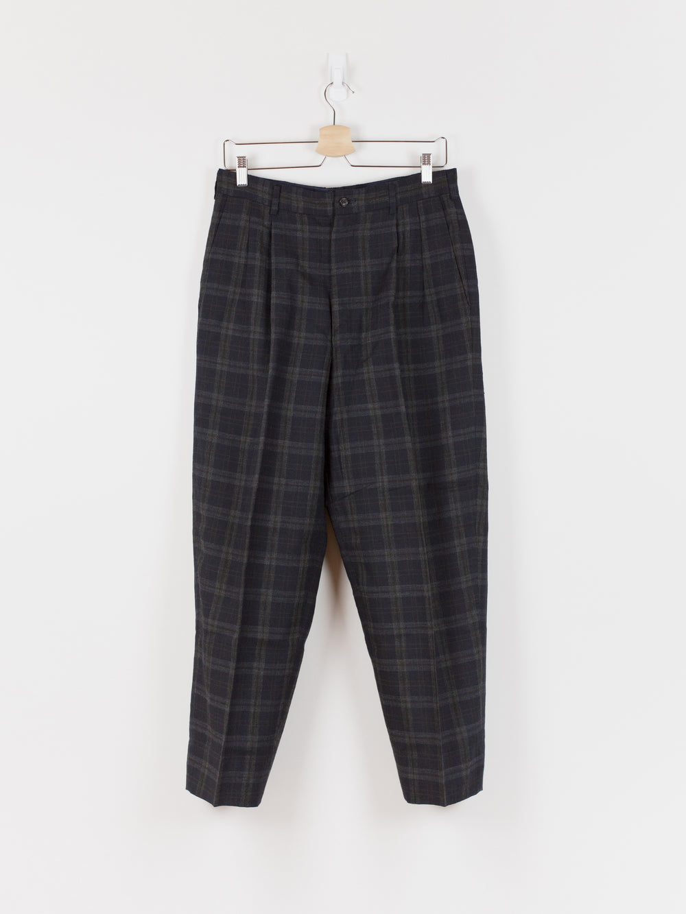 Menswear tailoring executed in the classic 90s Comme des Garcons silhouette. Wide voluminous leg that tapers to a slim hem opening. To be worn rolled for a round, cropped shape that was emblematic of the Comme uniform. Here seen in a muted, open weave wool check with navy and olive undertones that is perfect to add a subtle statement to an otherwise plain outfit.