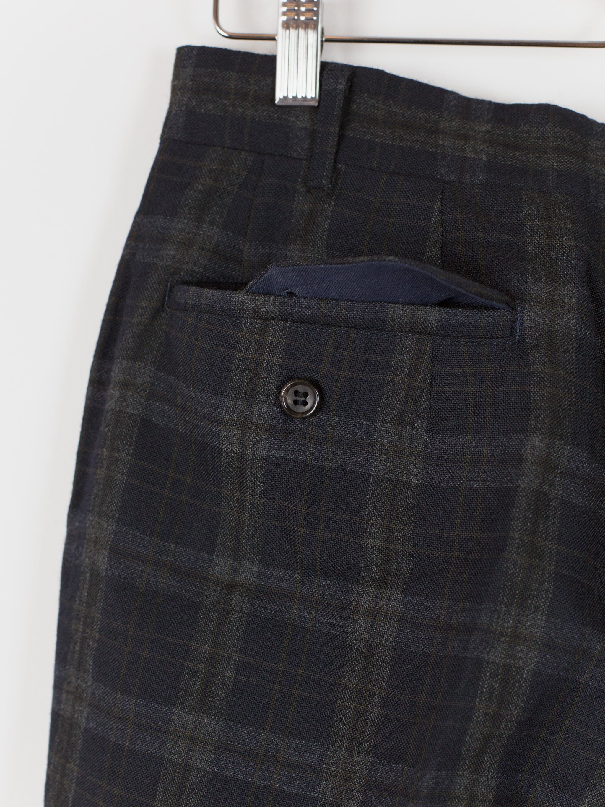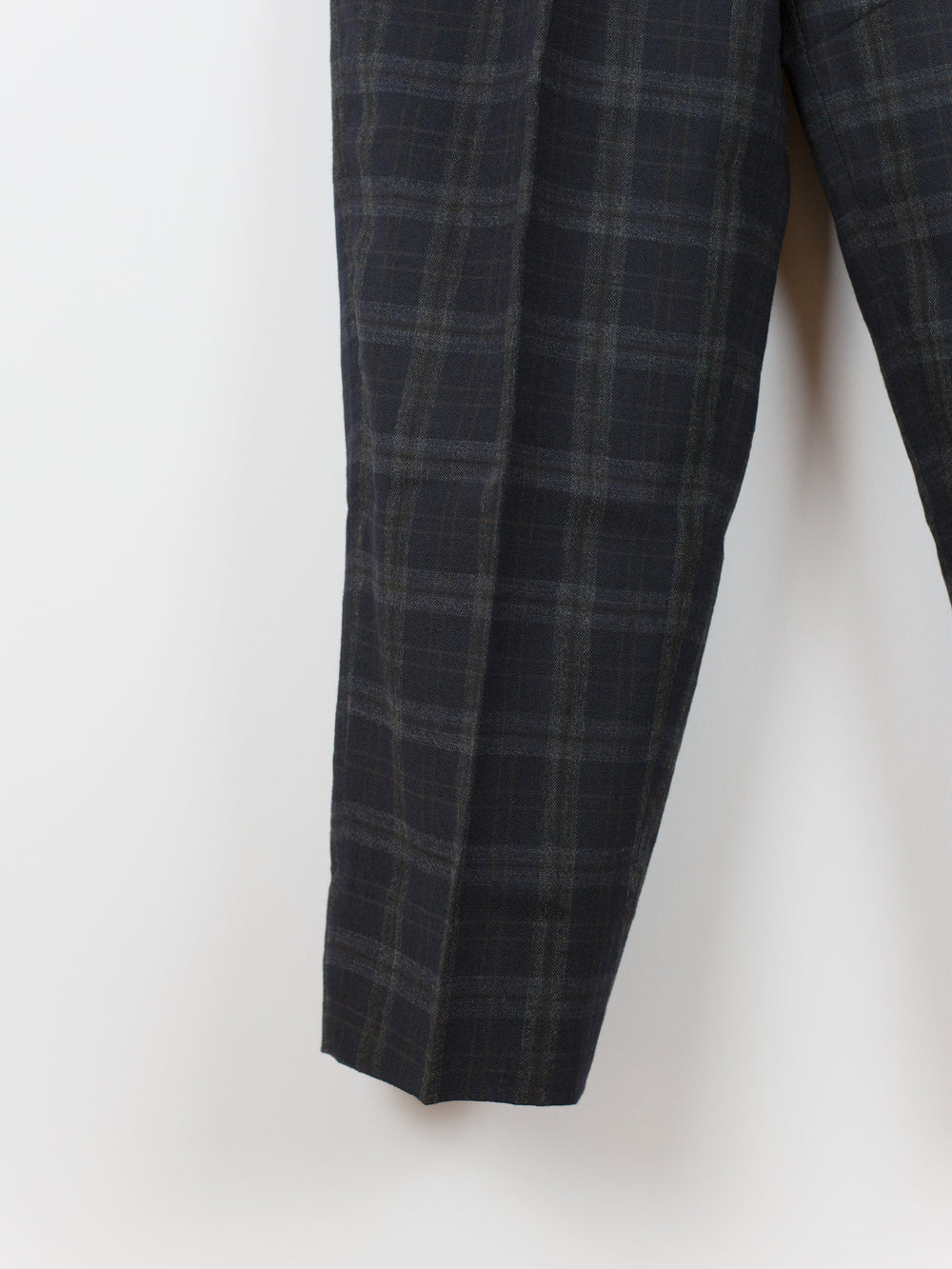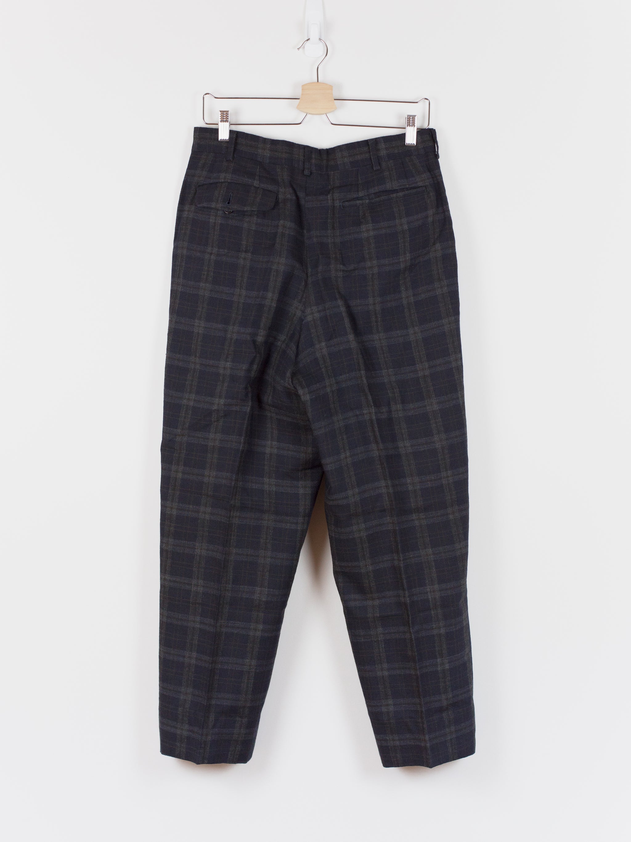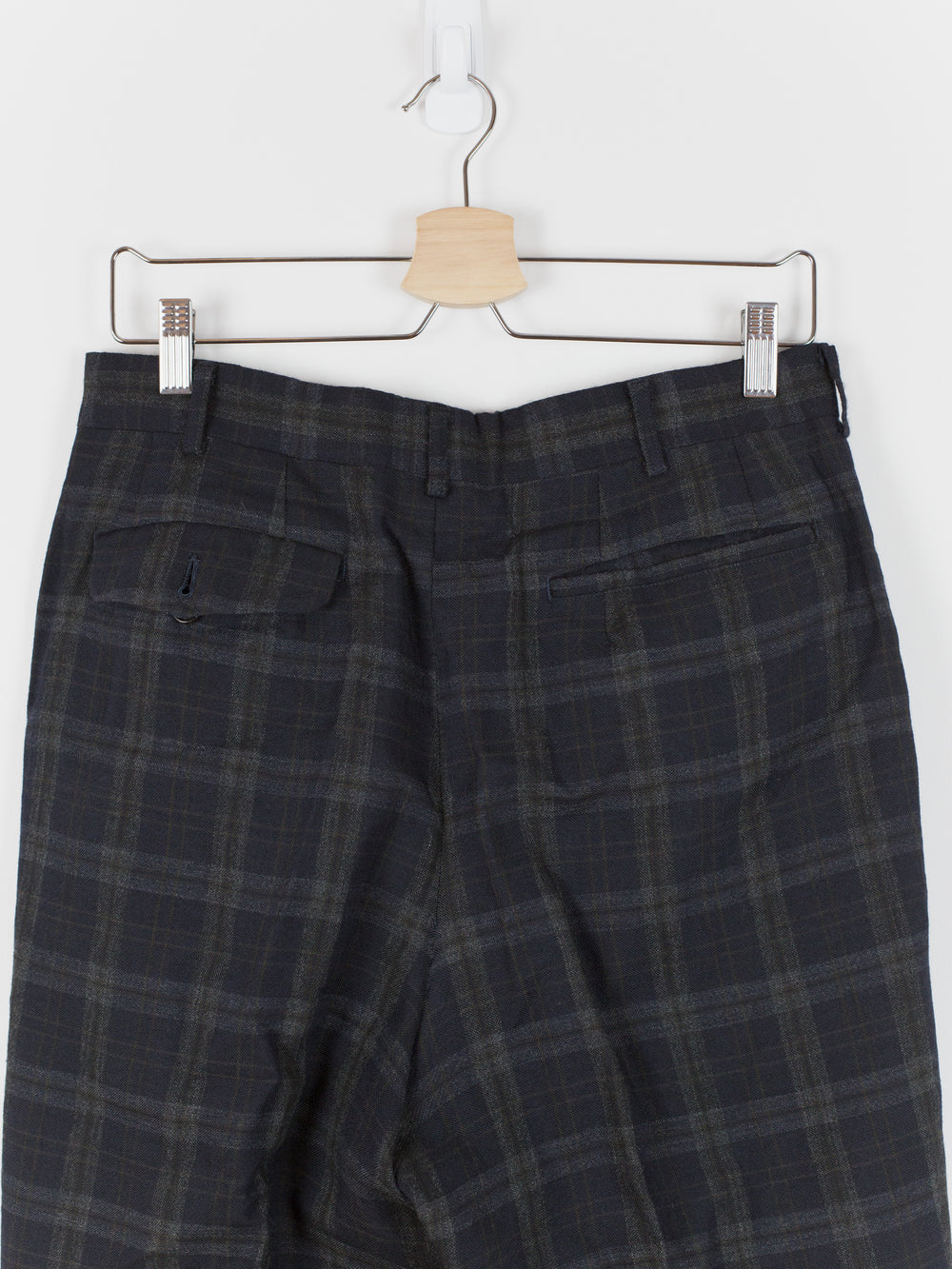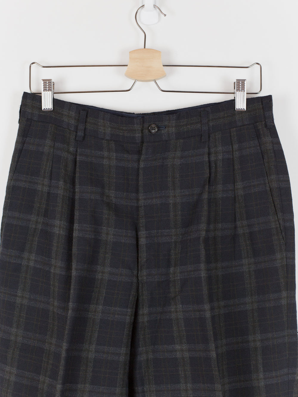 Menswear tailoring executed in the classic 90s Comme des Garcons silhouette. Wide voluminous leg that tapers to a slim hem opening. To be worn rolled for a round, cropped shape that was emblematic of the Comme uniform. Here seen in a muted, open weave wool check with navy and olive undertones that is perfect to add a subtle statement to an otherwise plain outfit.