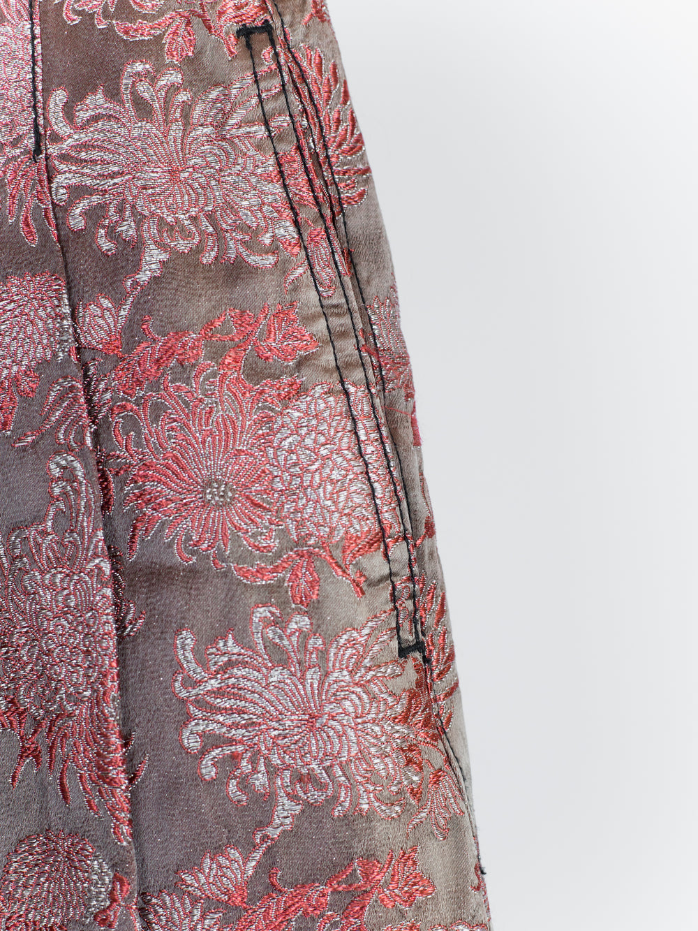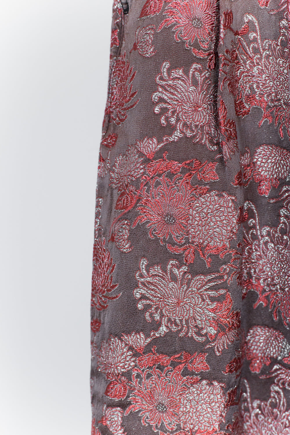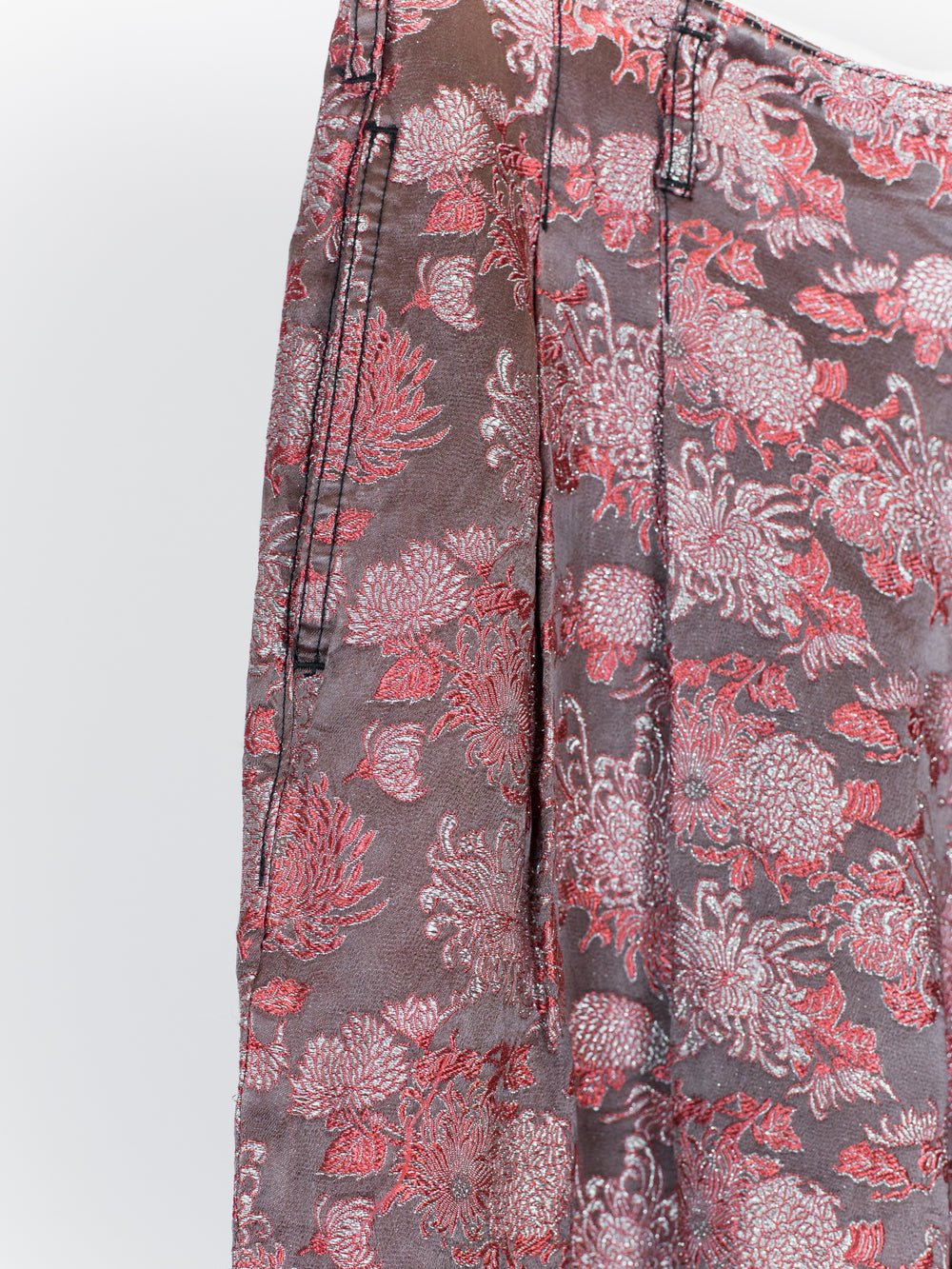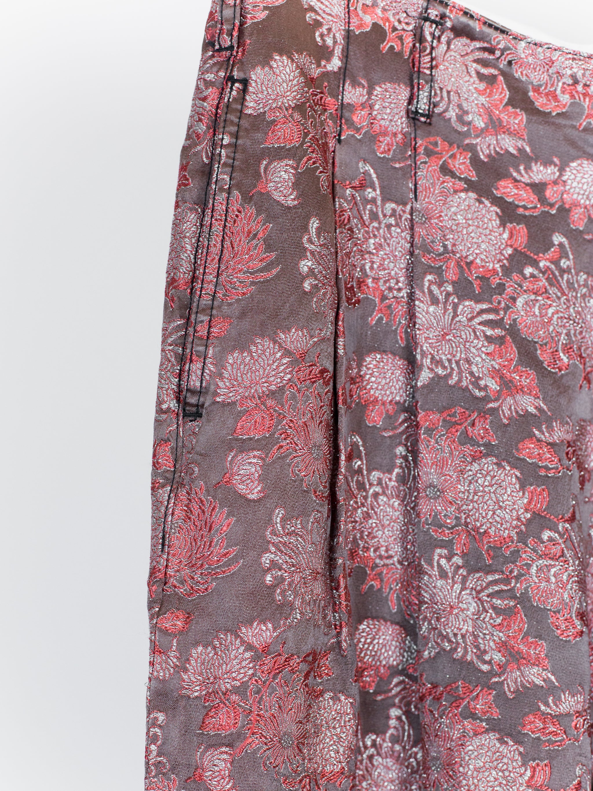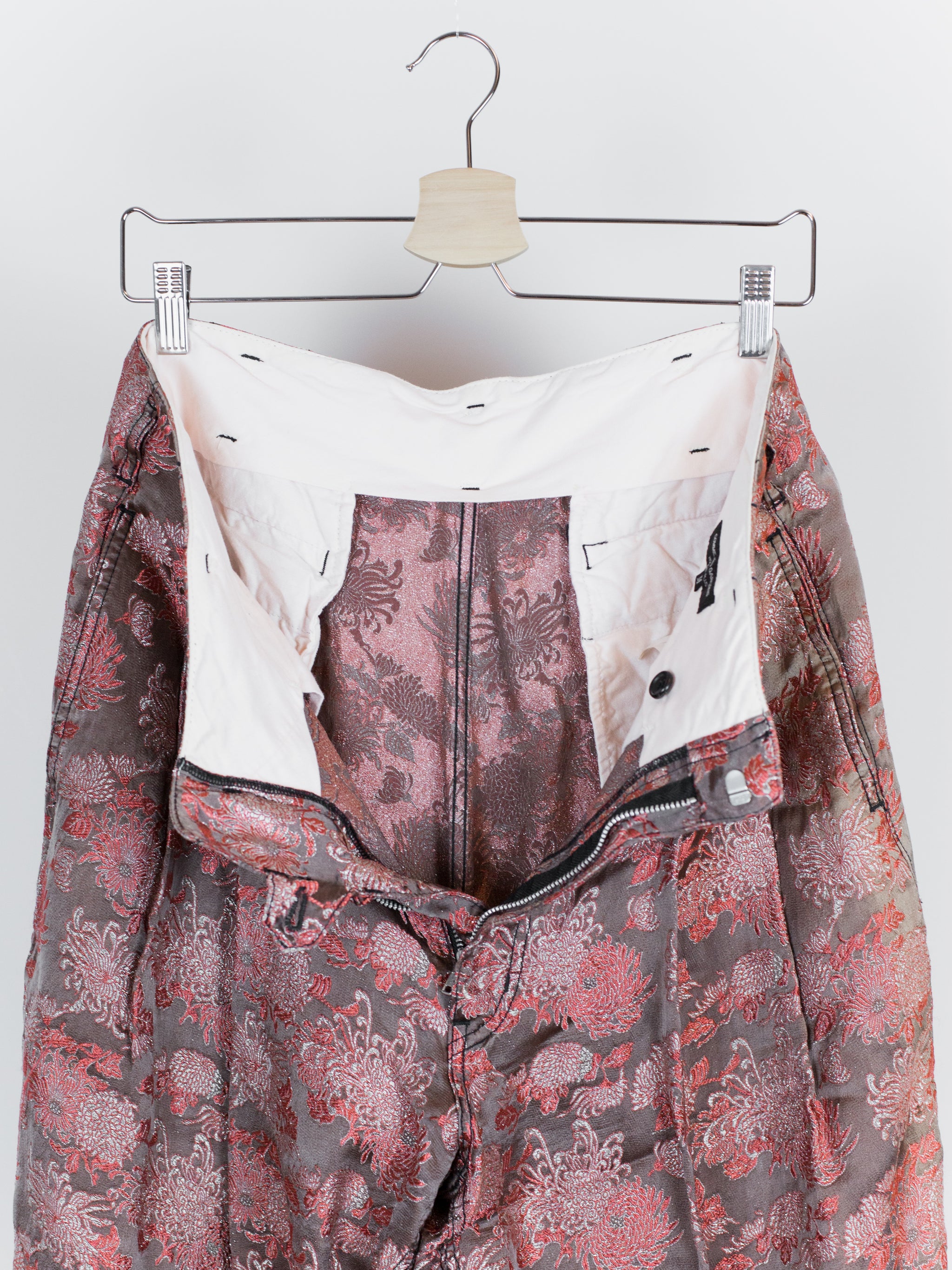 Here the trouser is cut with two massive inward facing front pleats that lend the wide leg a natural curvature and roundness to follow the body. It features the expert finish quality of any Comme trouser with slash side pockets, back welt pockets, and tailored waistband in an intricate and luxurious metallic brocade fabric. The mid-weight fabric has an incredibly soft and fluid drape that moves with the wearer and brings depth and dynamism to the shape.