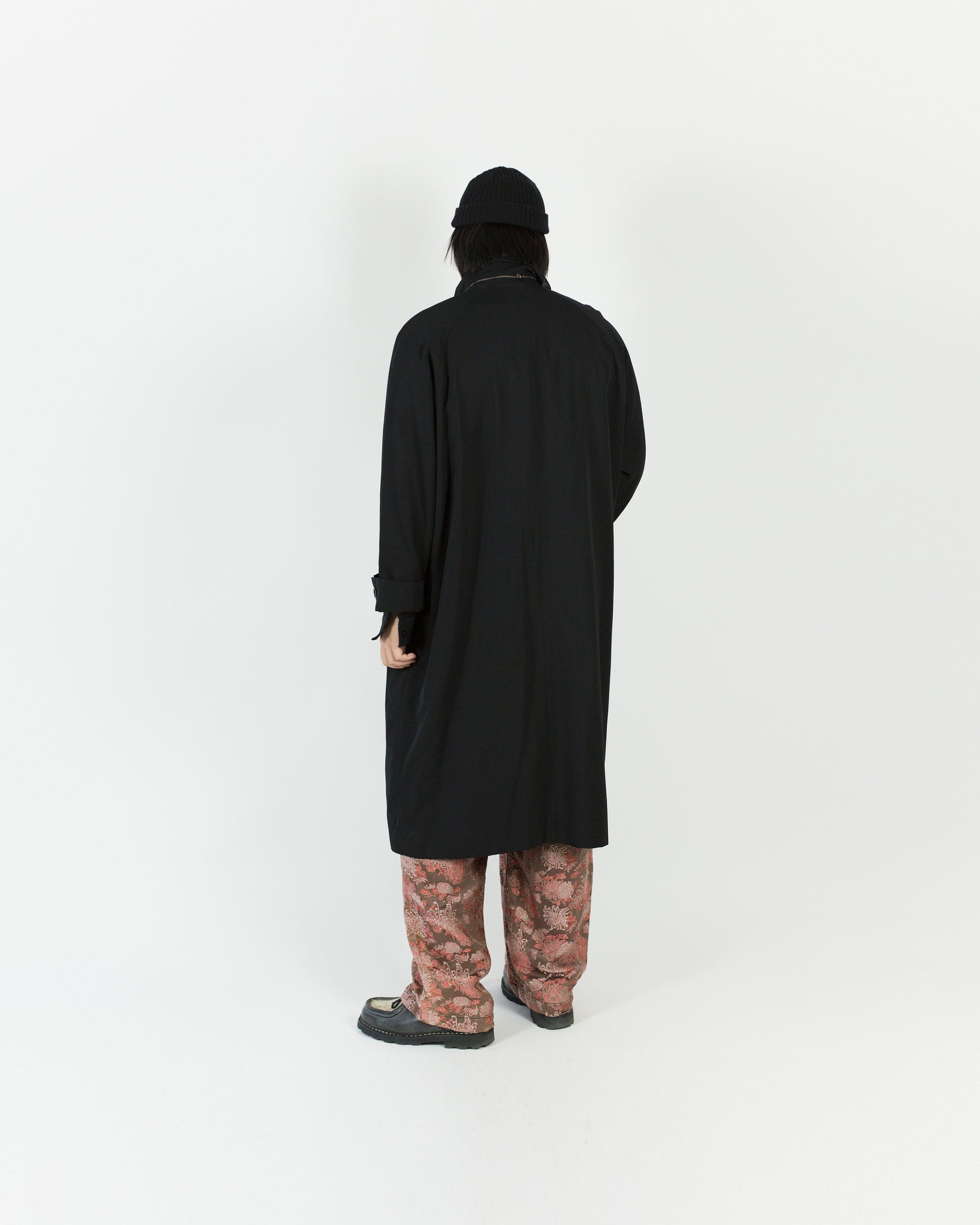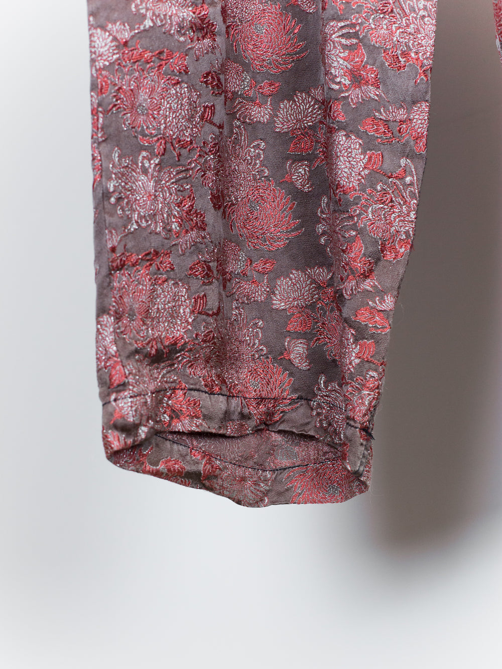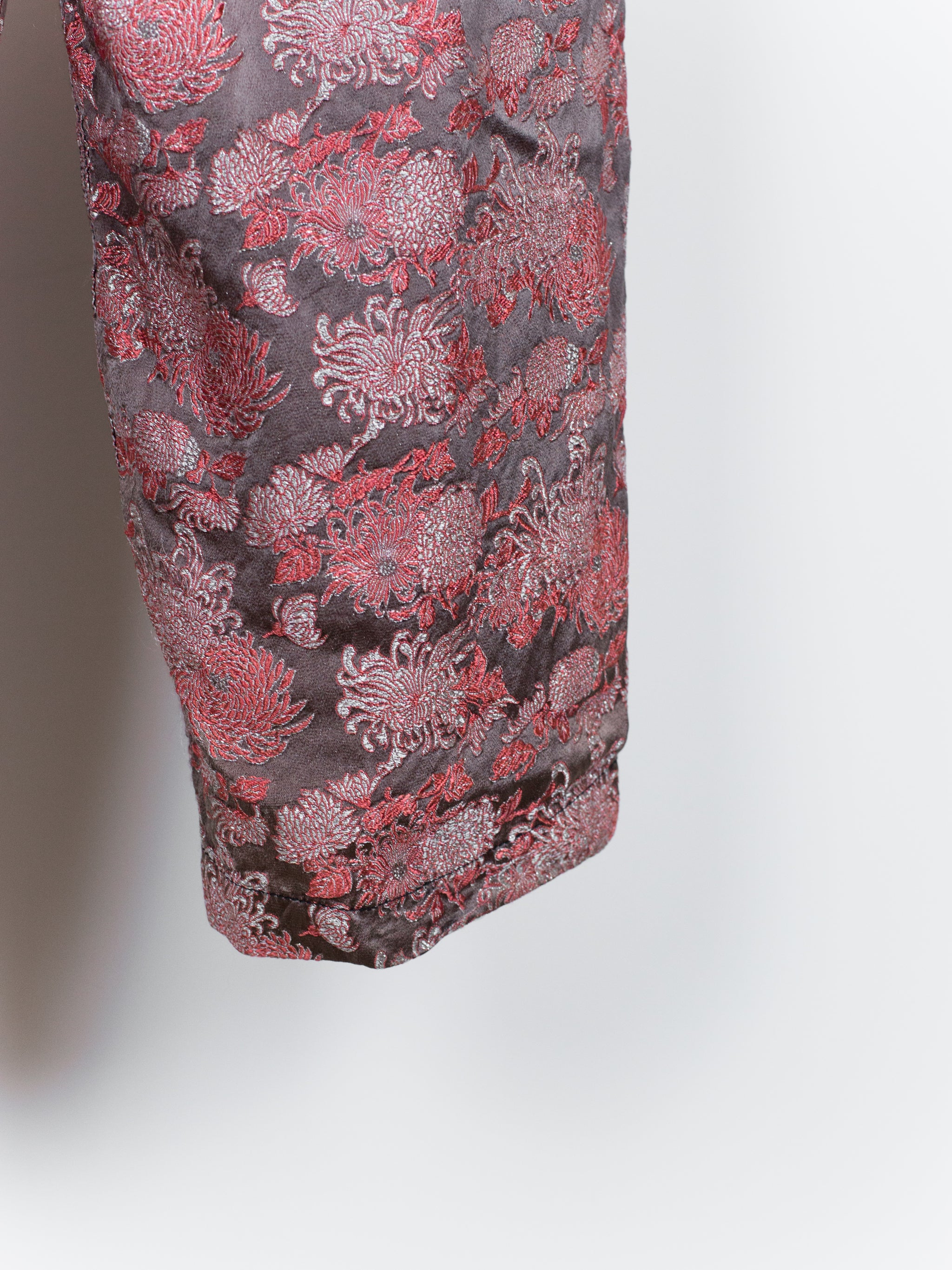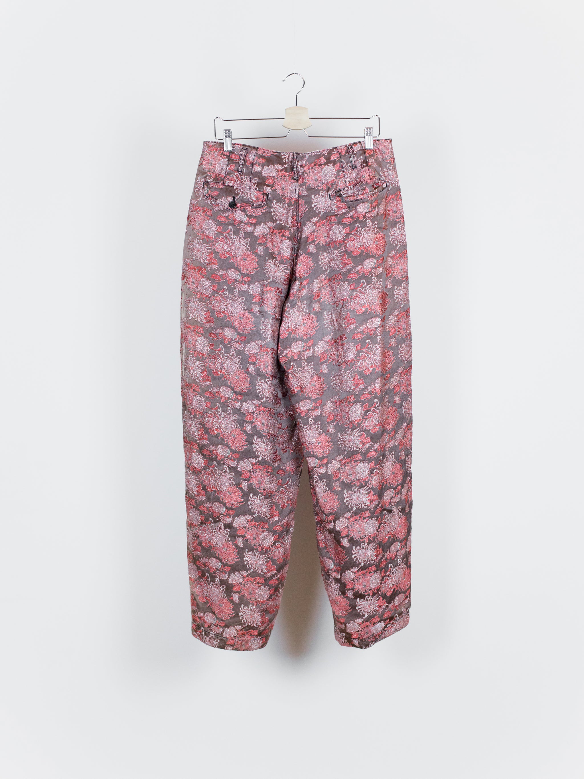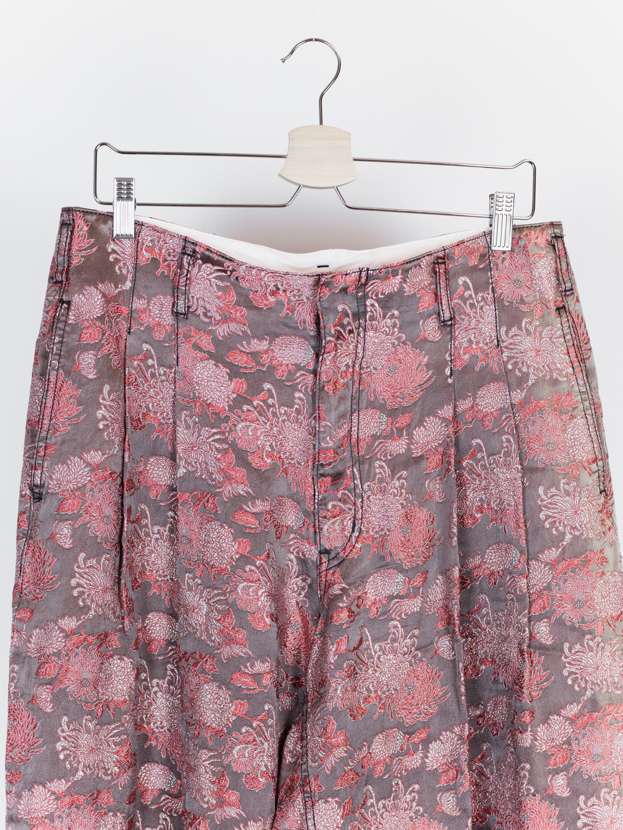 Here the trouser is cut with two massive inward facing front pleats that lend the wide leg a natural curvature and roundness to follow the body. It features the expert finish quality of any Comme trouser with slash side pockets, back welt pockets, and tailored waistband in an intricate and luxurious metallic brocade fabric. The mid-weight fabric has an incredibly soft and fluid drape that moves with the wearer and brings depth and dynamism to the shape.