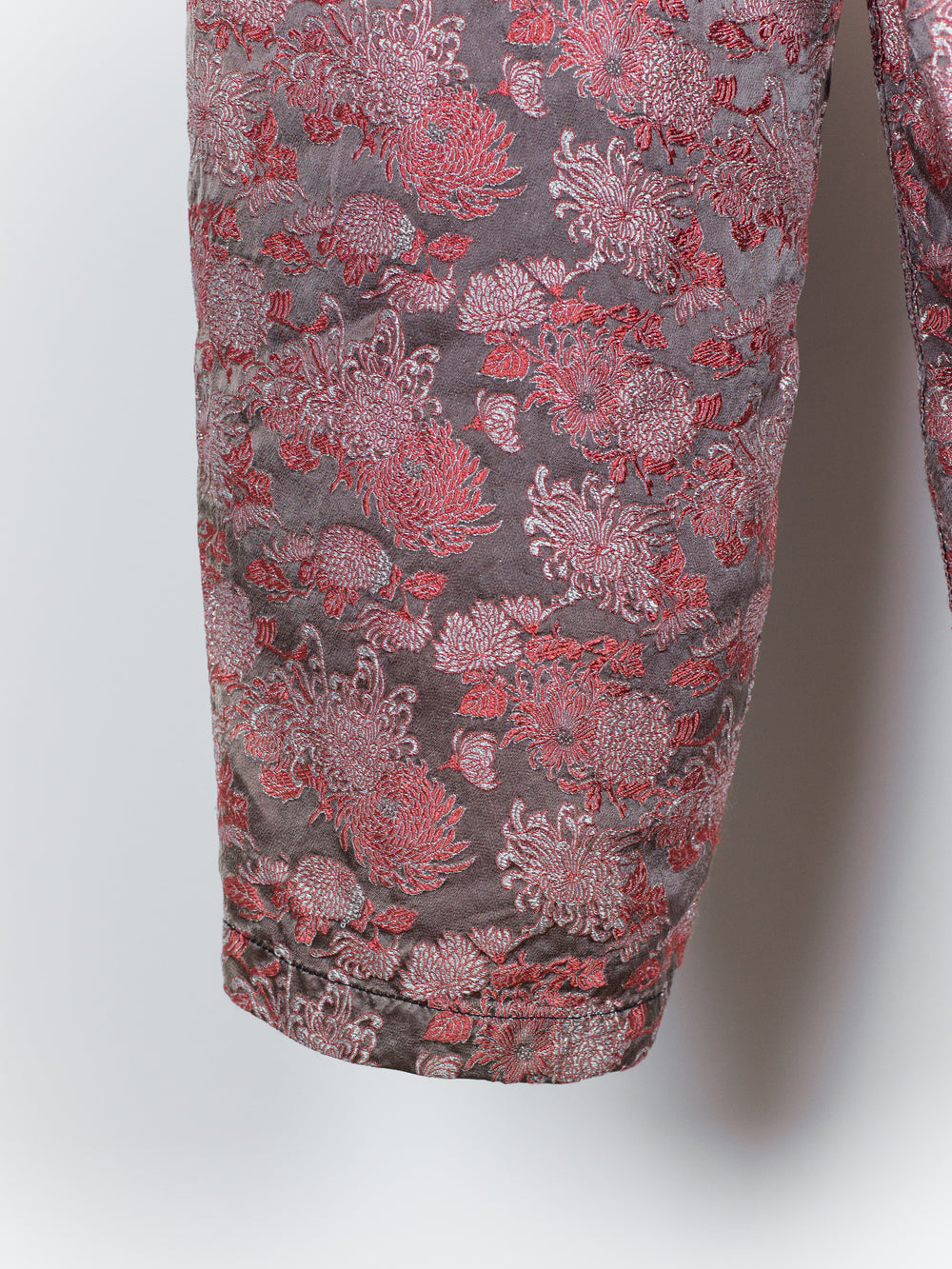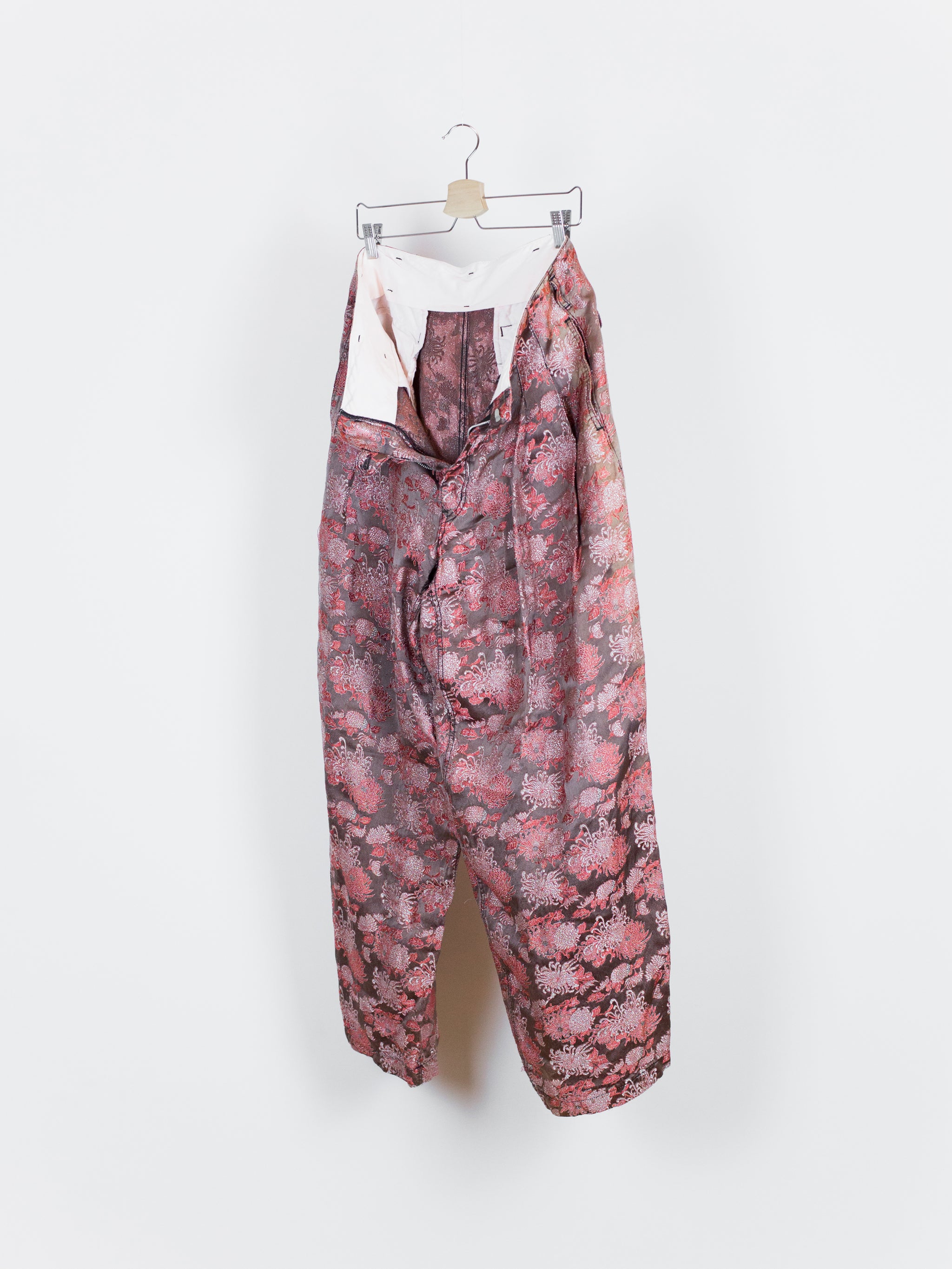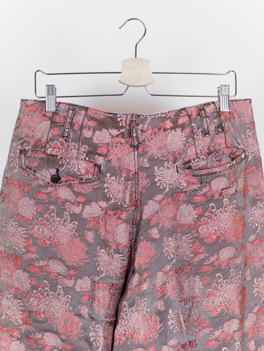 Seen here are a statement voluminous trouser from the iconic 'Decadence' collection by CdGH+ (Look 26). The season was an embodiment of exaggeration, extravagance, and overall a visual collage of luxury. Reworked silk patchwork shirting was cut long and peeked out under short suit jackets, dramatic shin-length long coats and robes draped and flowed over pooled trouser hems and under deconstructed jackets-turned-vests. A majority of the looks glowed with a noisy and lustrous sheen from the patterned satins, graphic silks, and metallic brocades (at the peak, all 3 were crashed into single looks), with the resulting visual saturation counterintuitively drawing even more attention to the silhouettes--after all, the cascading graphic patterns read so loud on cuts so voluminous they drown out the folds, creases, and curves of the body.