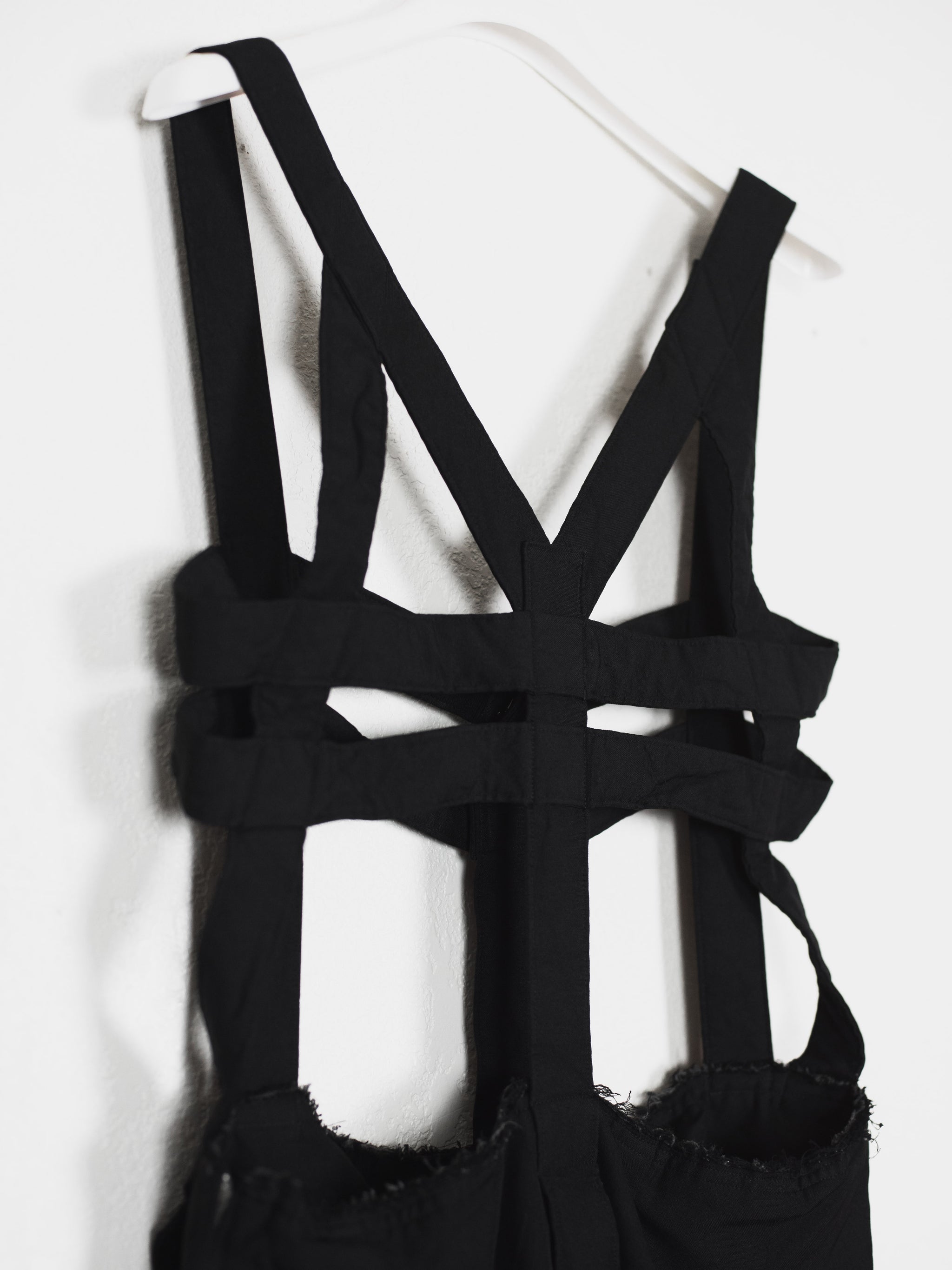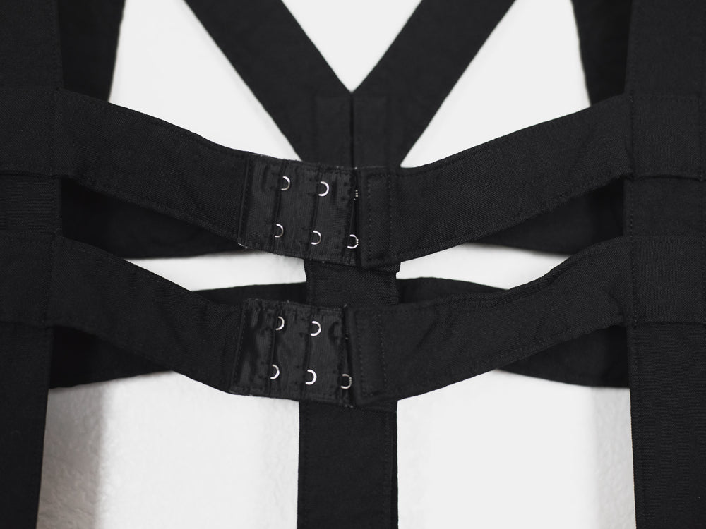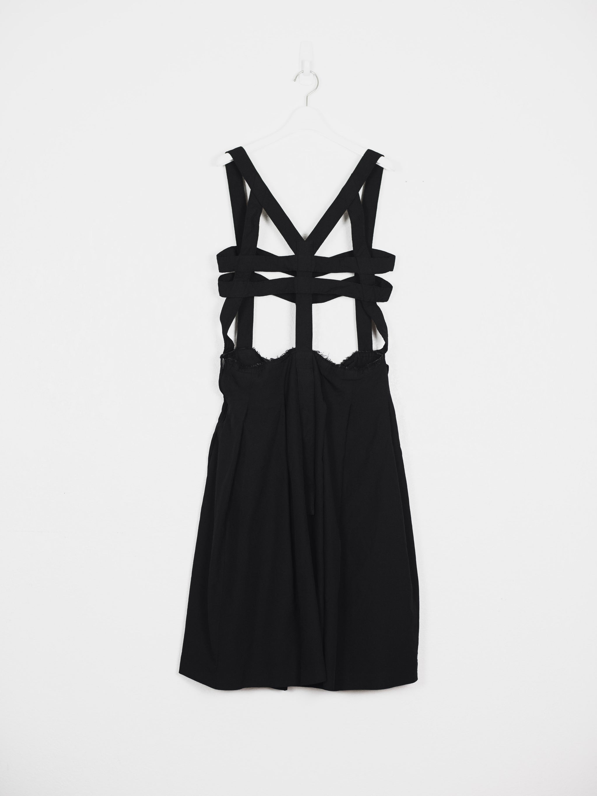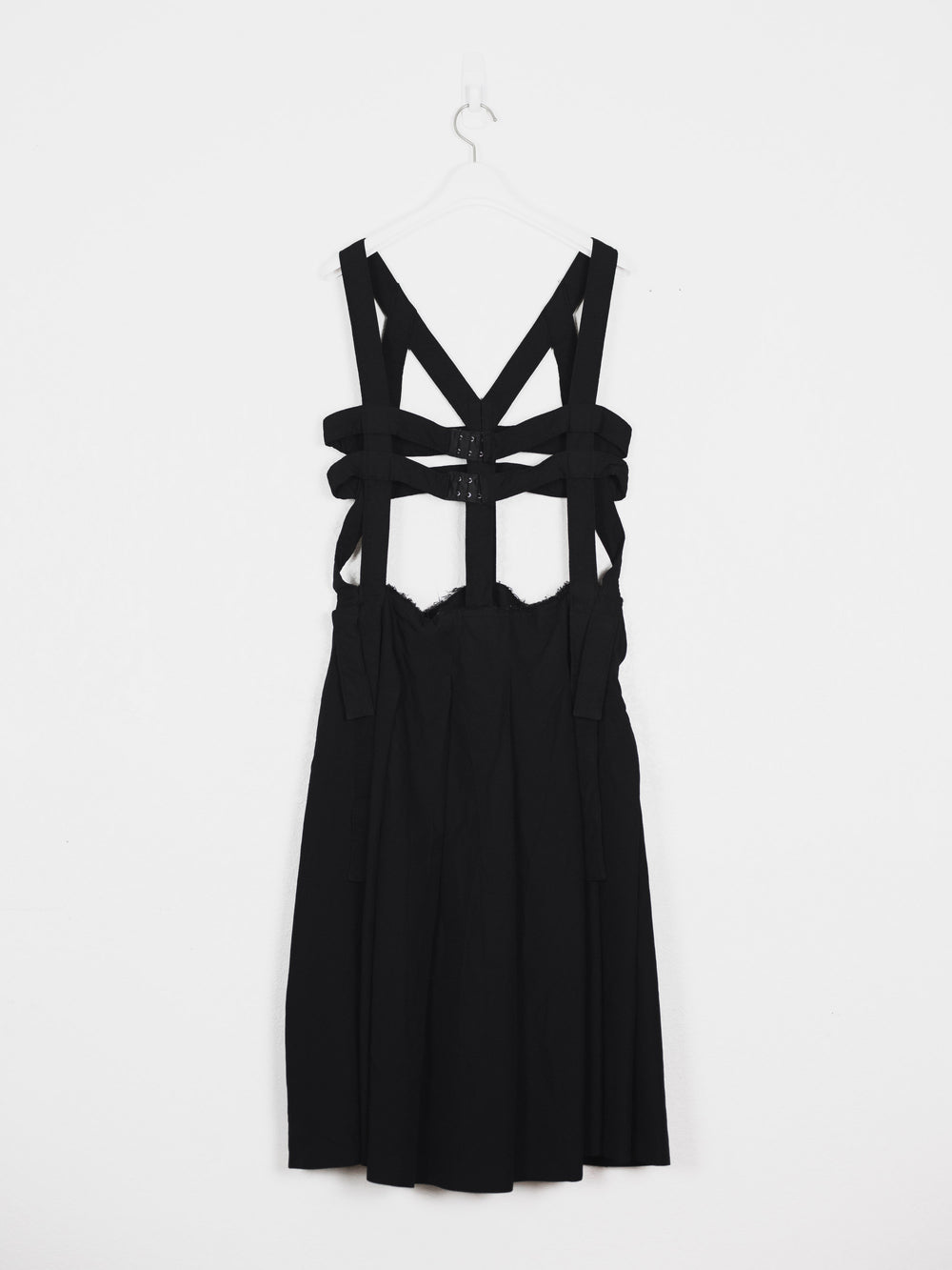 Highlight piece from SS14 elevating Comme des Garçons' popular jumper skirt with an anatomic harness giving off the appearance of a dress frame, deconstructed yet structural.