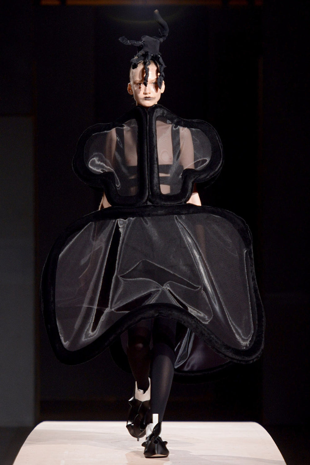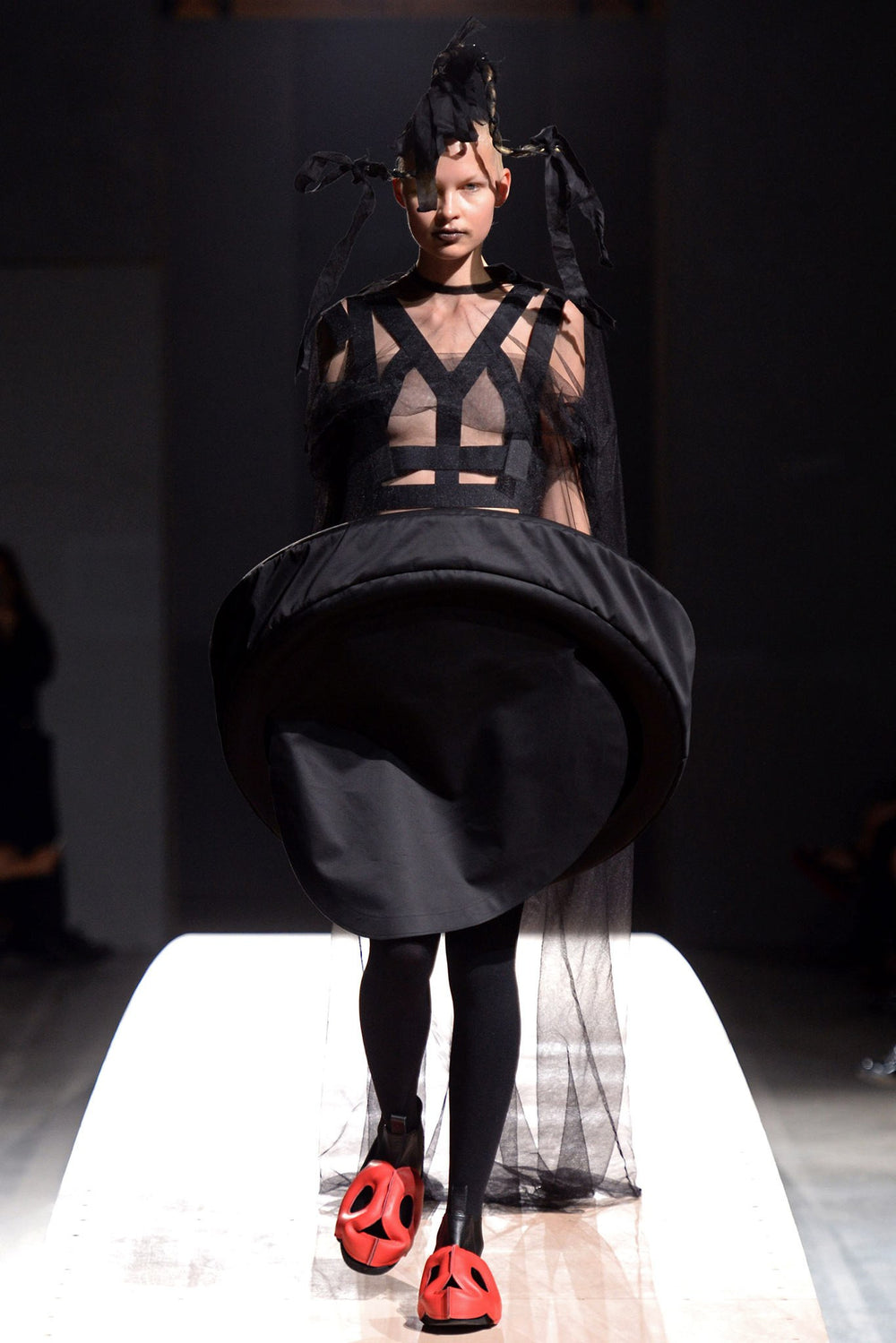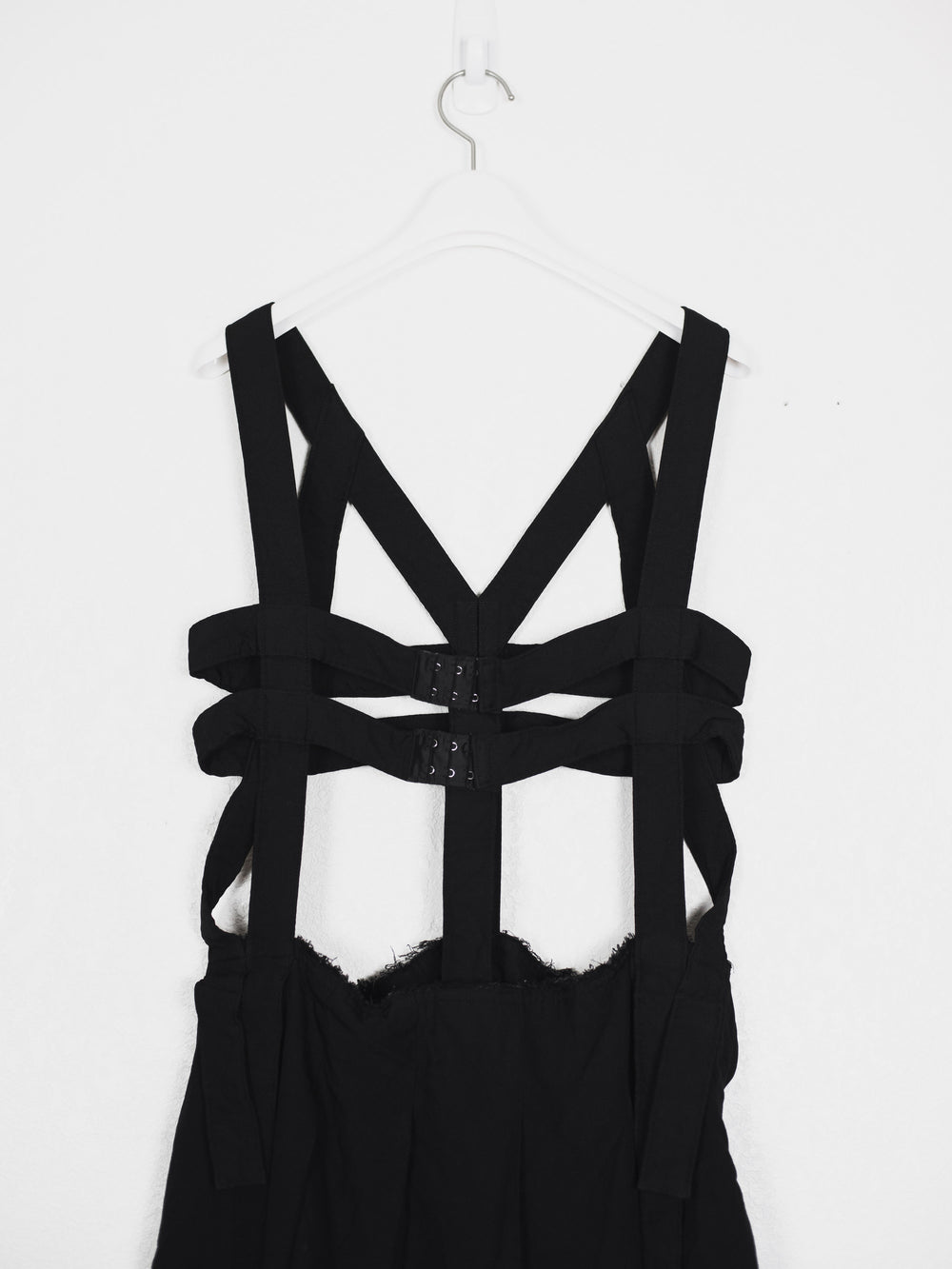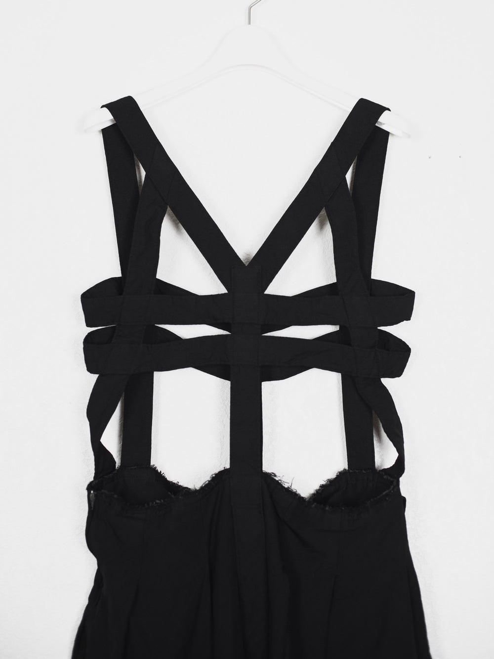 Highlight piece from SS14 elevating Comme des Garçons' popular jumper skirt with an anatomic harness giving off the appearance of a dress frame, deconstructed yet structural.