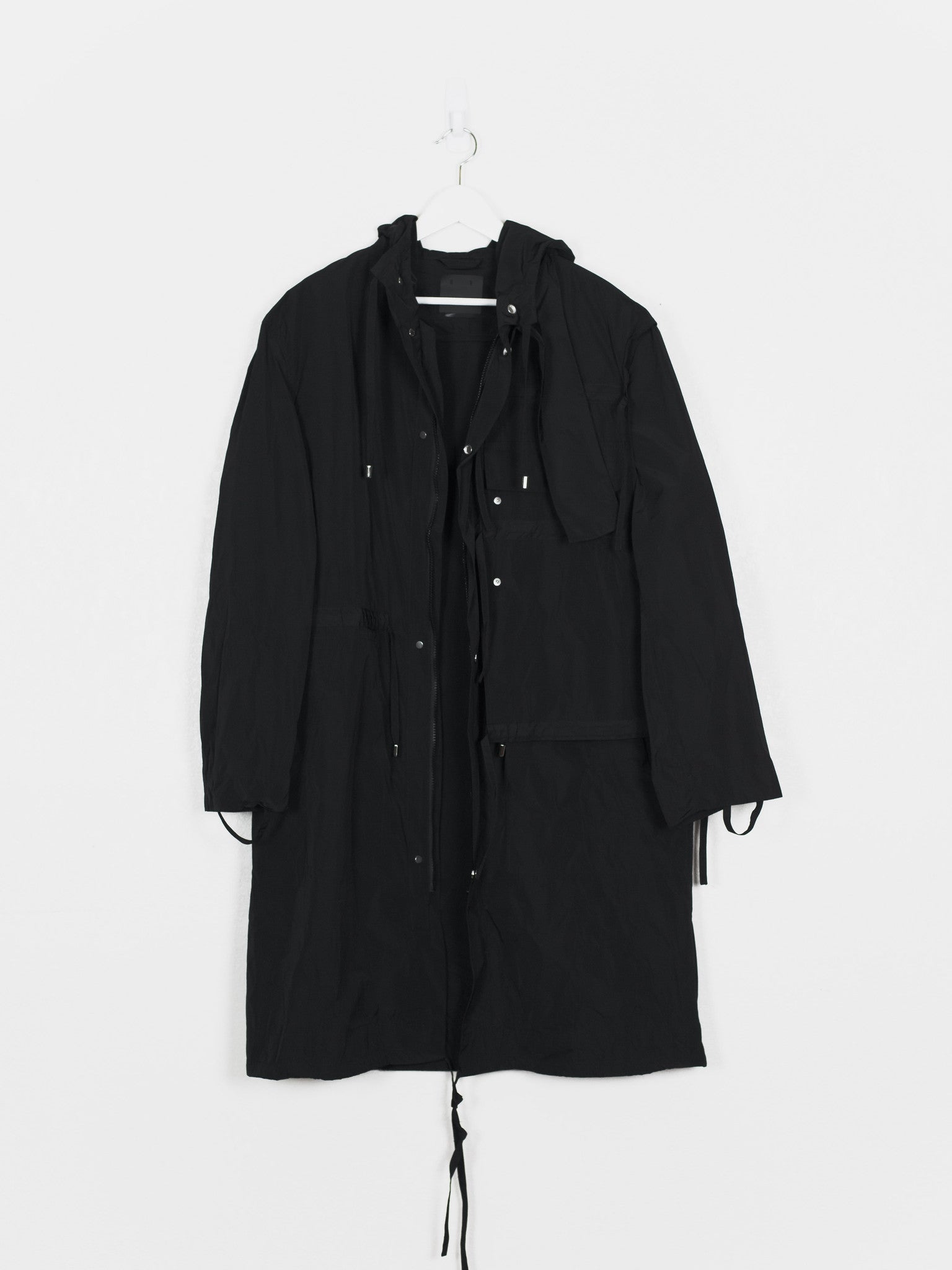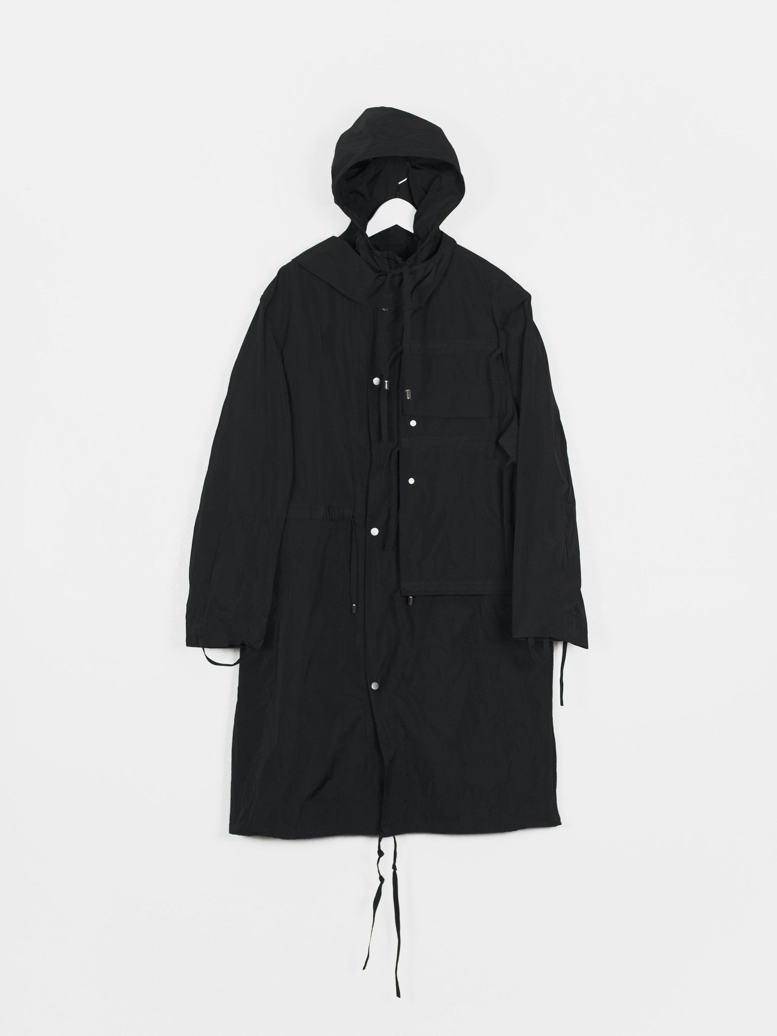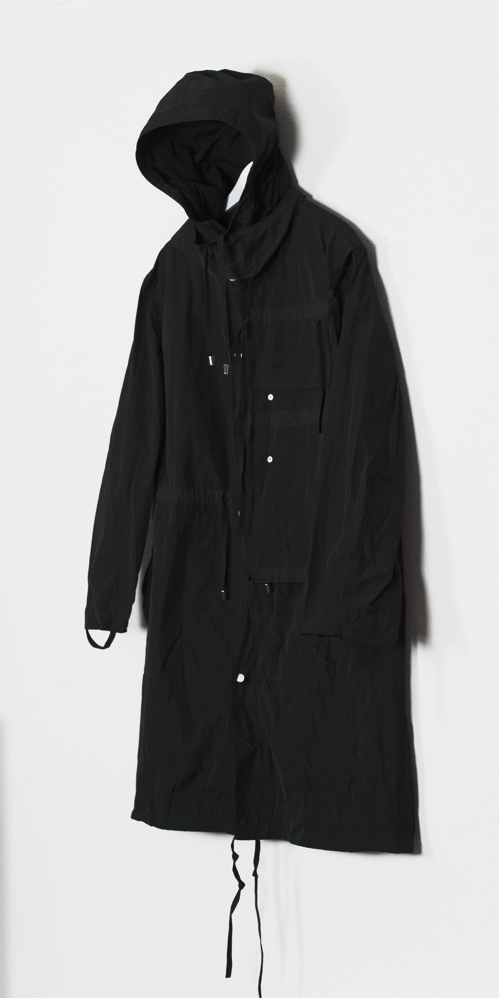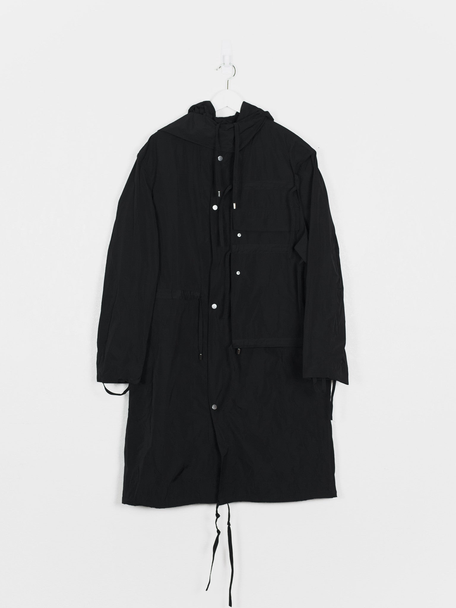A warm weather long coat from Craig Green in a crinkled and slightly shiny black 100% polyester that he titles 'Sport Black.' This one is cut below the knee and comes equipped with cuff straps, substantial silver hardware that breaks up the fully black coat, and a hood with a thick ribbon that wraps around and can be tied as a scarf. Built into the body on the left side is a levitating front panel that features an oversized zippered top-entry drop in pocket that can be scrunched and tied with Craig Green's signature strings that run through channels at the top and bottom.